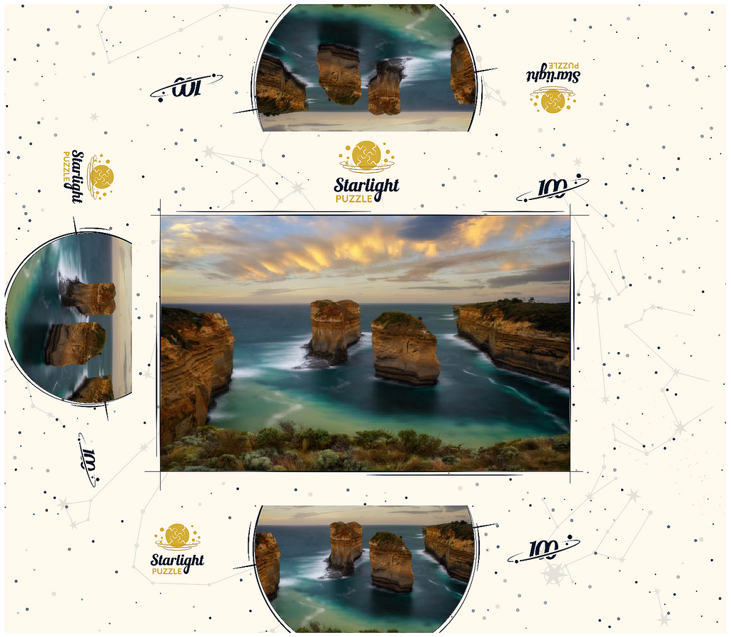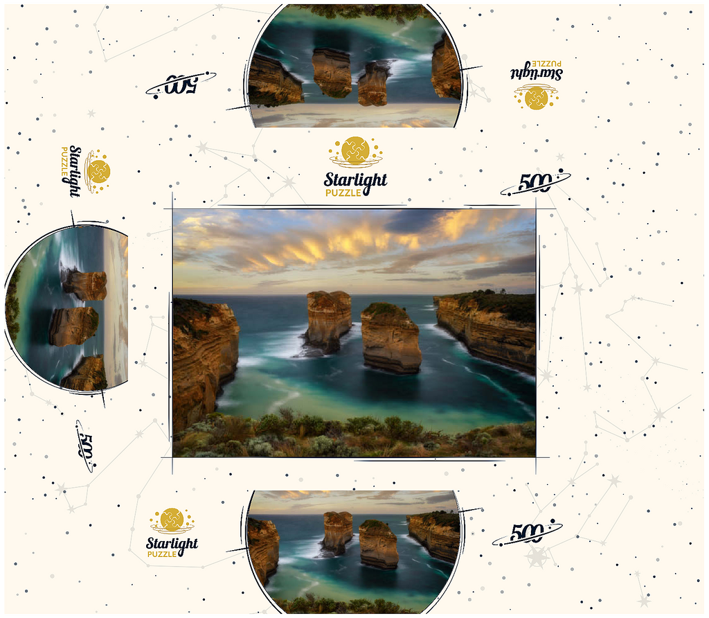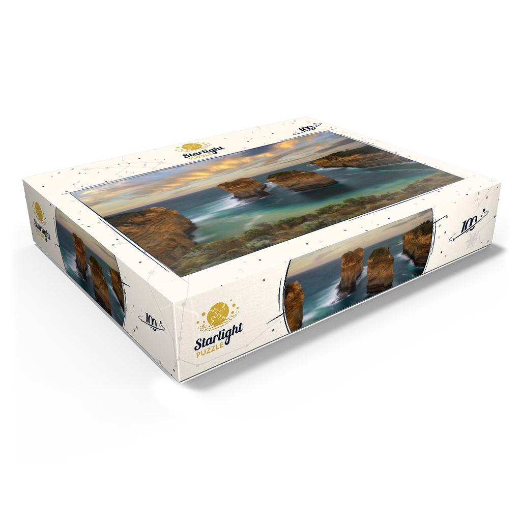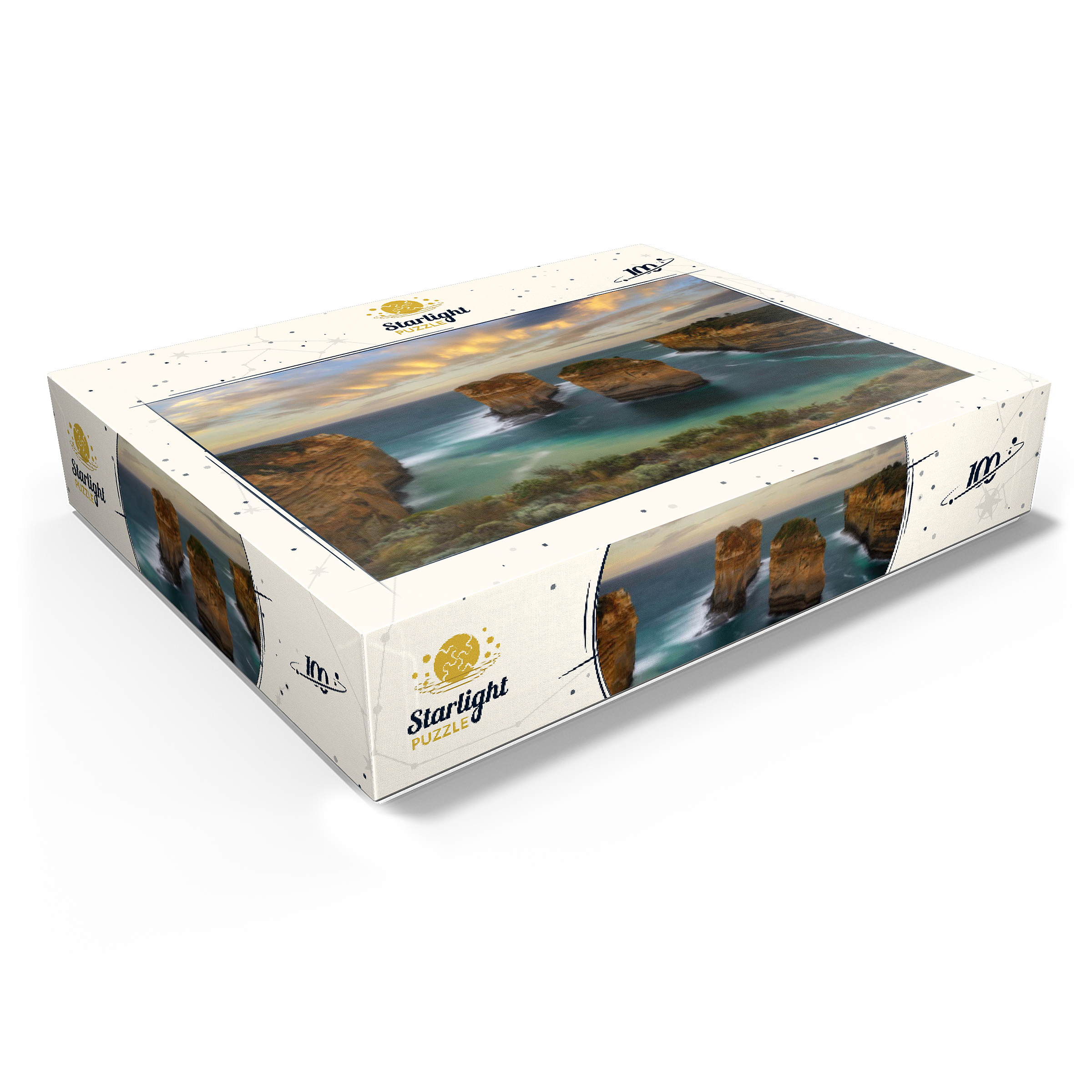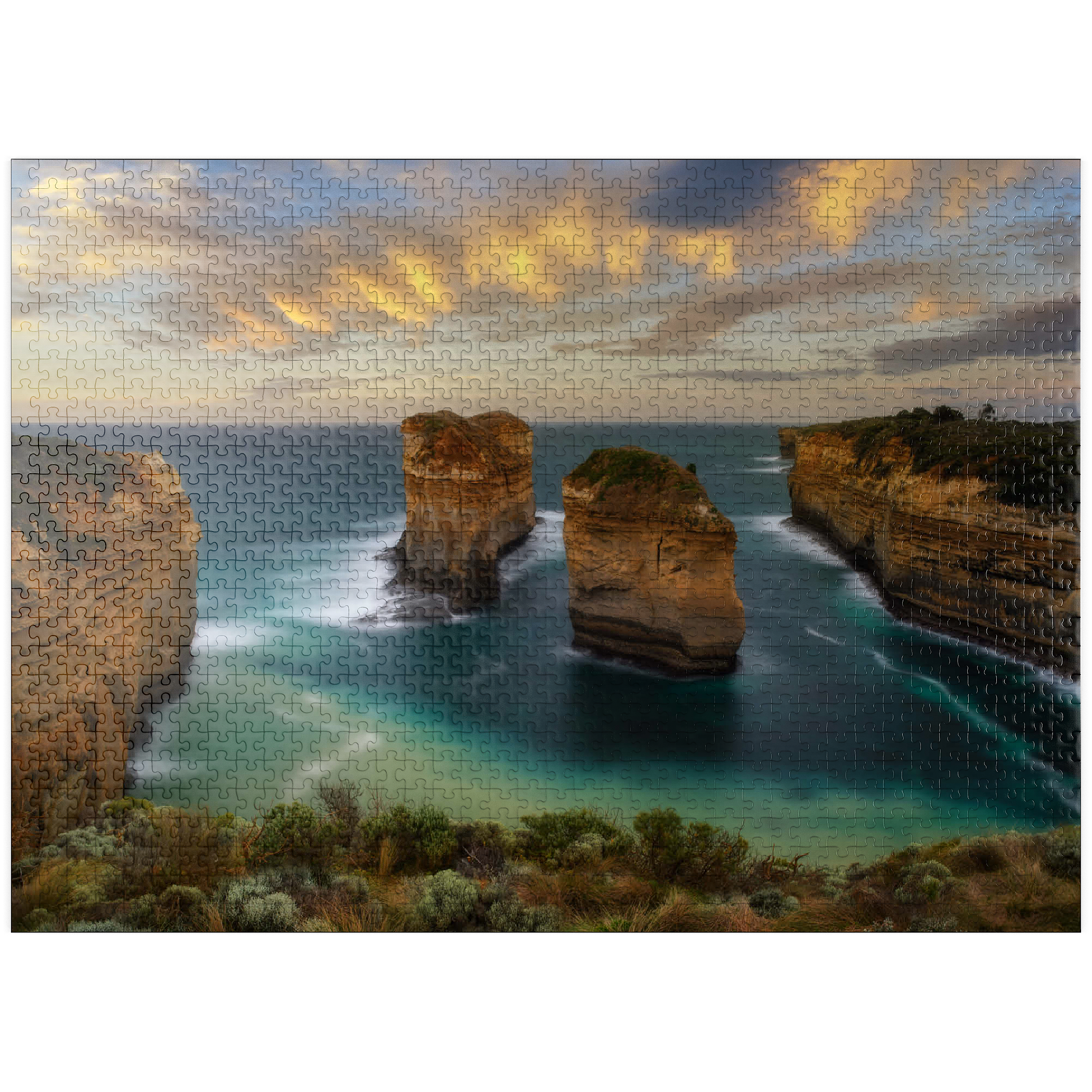 Loch Ard Gorge, part of Australia's Great Ocean Road, is a breathtaking coastal formation characterized by towering limestone cliffs and turquoise waters. Formed through years of erosion, the gorge is named after the shipwreck of the Loch Ard in 1878. The dramatic seascape, with rugged rock pillars standing amid the swirling sea, offers visitors a striking view of nature's raw beauty. At sunset, the golden sky reflects over the ocean, enhancing the stunning contrast between the cliffs and the water below.