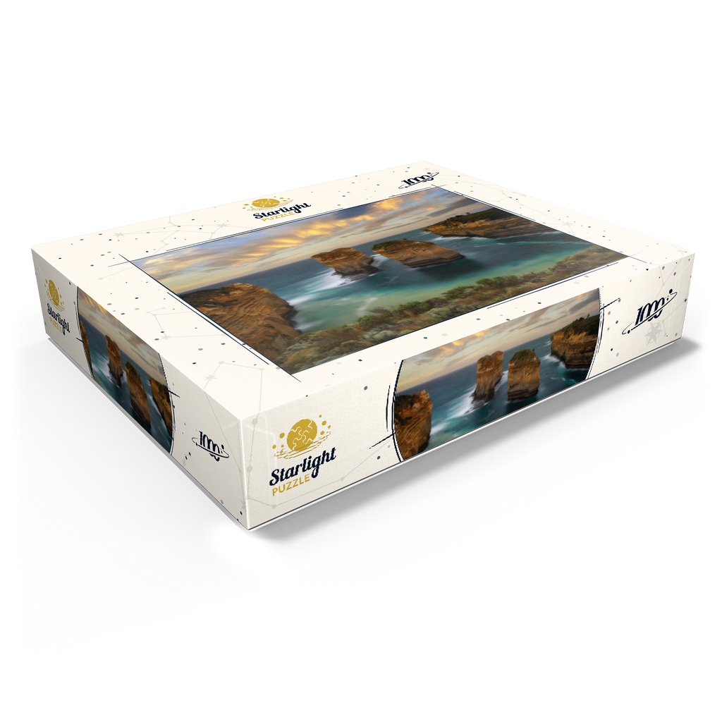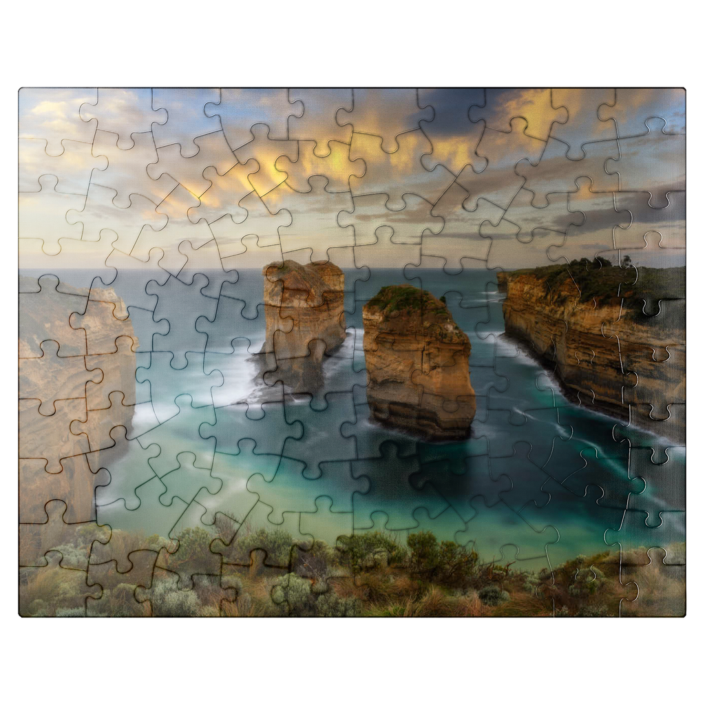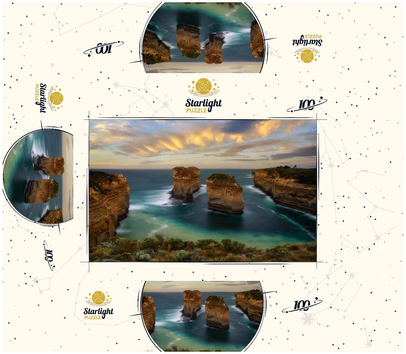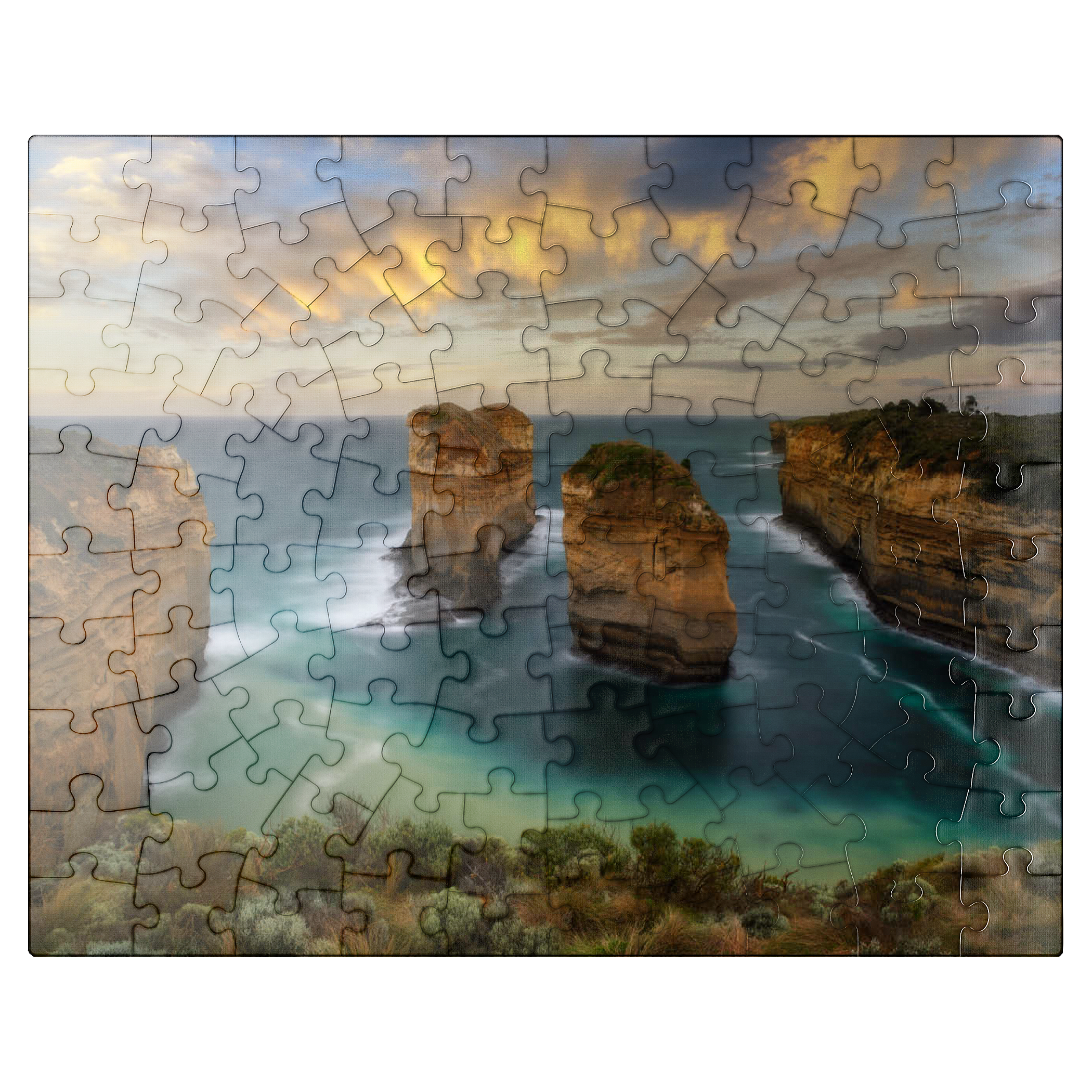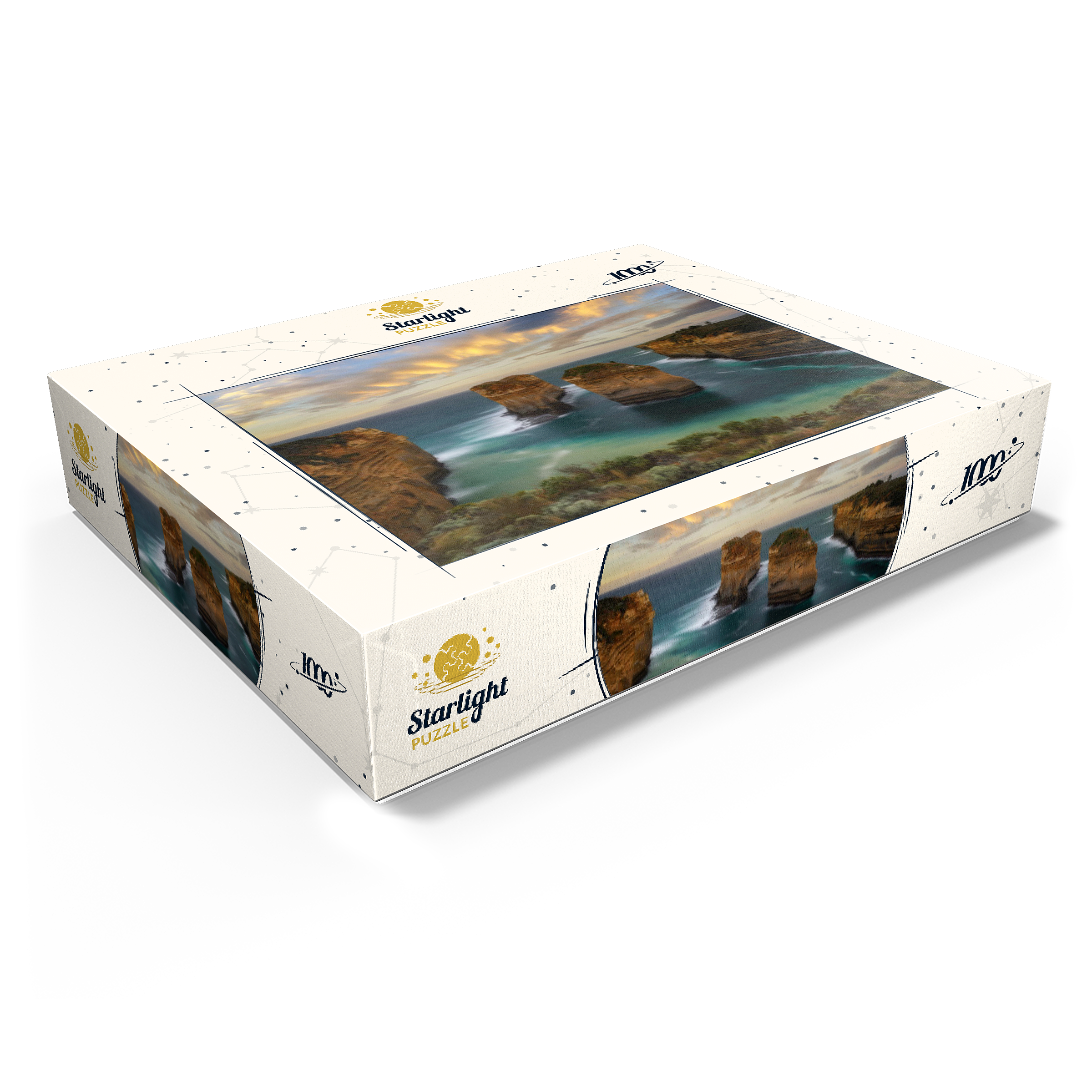Loch Ard Gorge, part of Australia's Great Ocean Road, is a breathtaking coastal formation characterized by towering limestone cliffs and turquoise waters. Formed through years of erosion, the gorge is named after the shipwreck of the Loch Ard in 1878. The dramatic seascape, with rugged rock pillars standing amid the swirling sea, offers visitors a striking view of nature's raw beauty. At sunset, the golden sky reflects over the ocean, enhancing the stunning contrast between the cliffs and the water below.