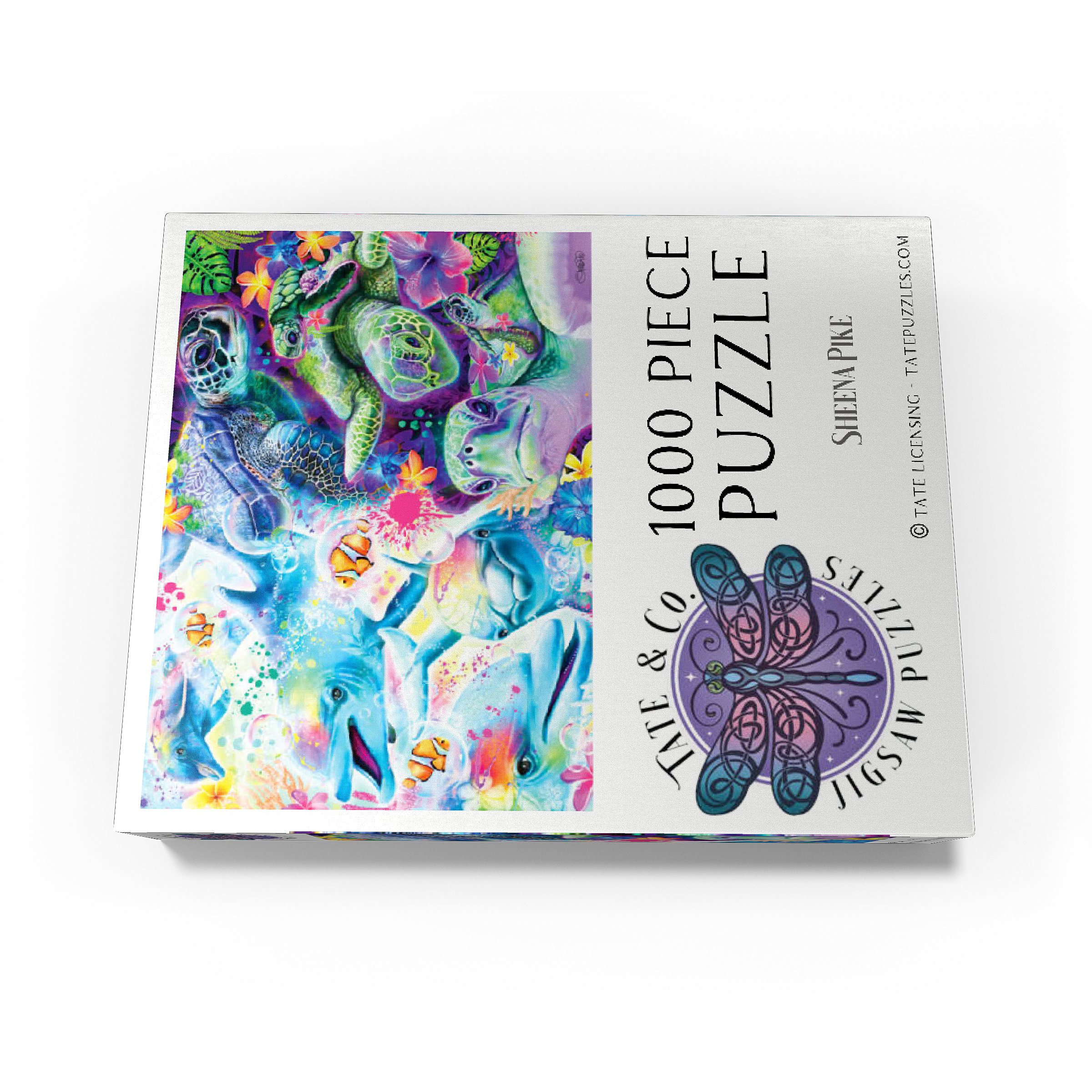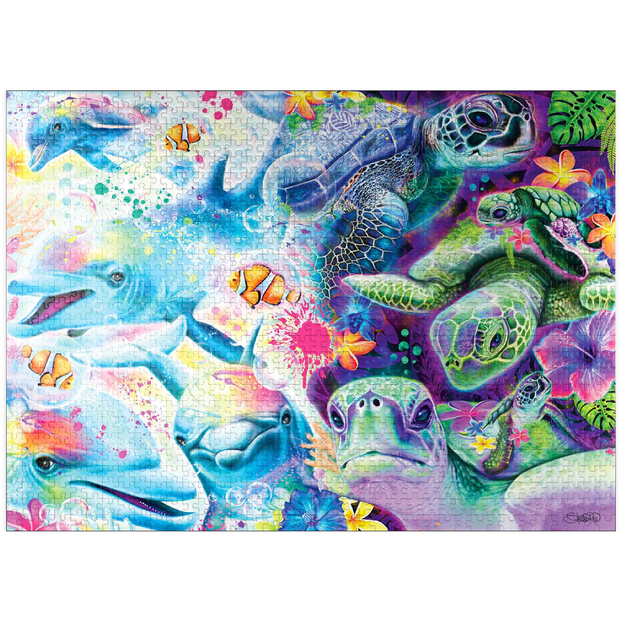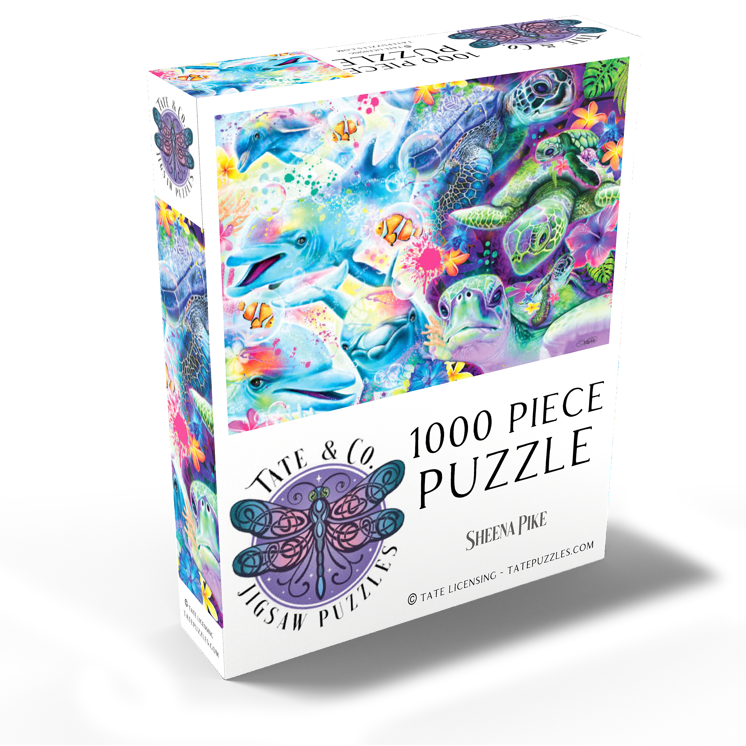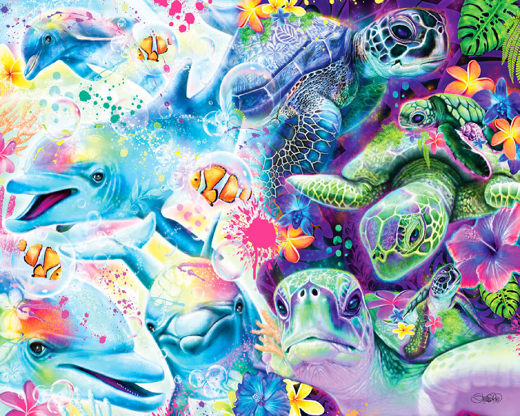 A vibrant and dynamic underwater scene rendered in a neon-infused aesthetic, reminiscent of the 1990s. Dolphins and sea turtles engage in playful interaction amidst a bustling ocean environment. The artwork, inspired by Sheena Pike, features whimsical elements such as clownfish, buoyant bubbles, and expressive splashes of color, creating a joyful and nostalgic visual experience.