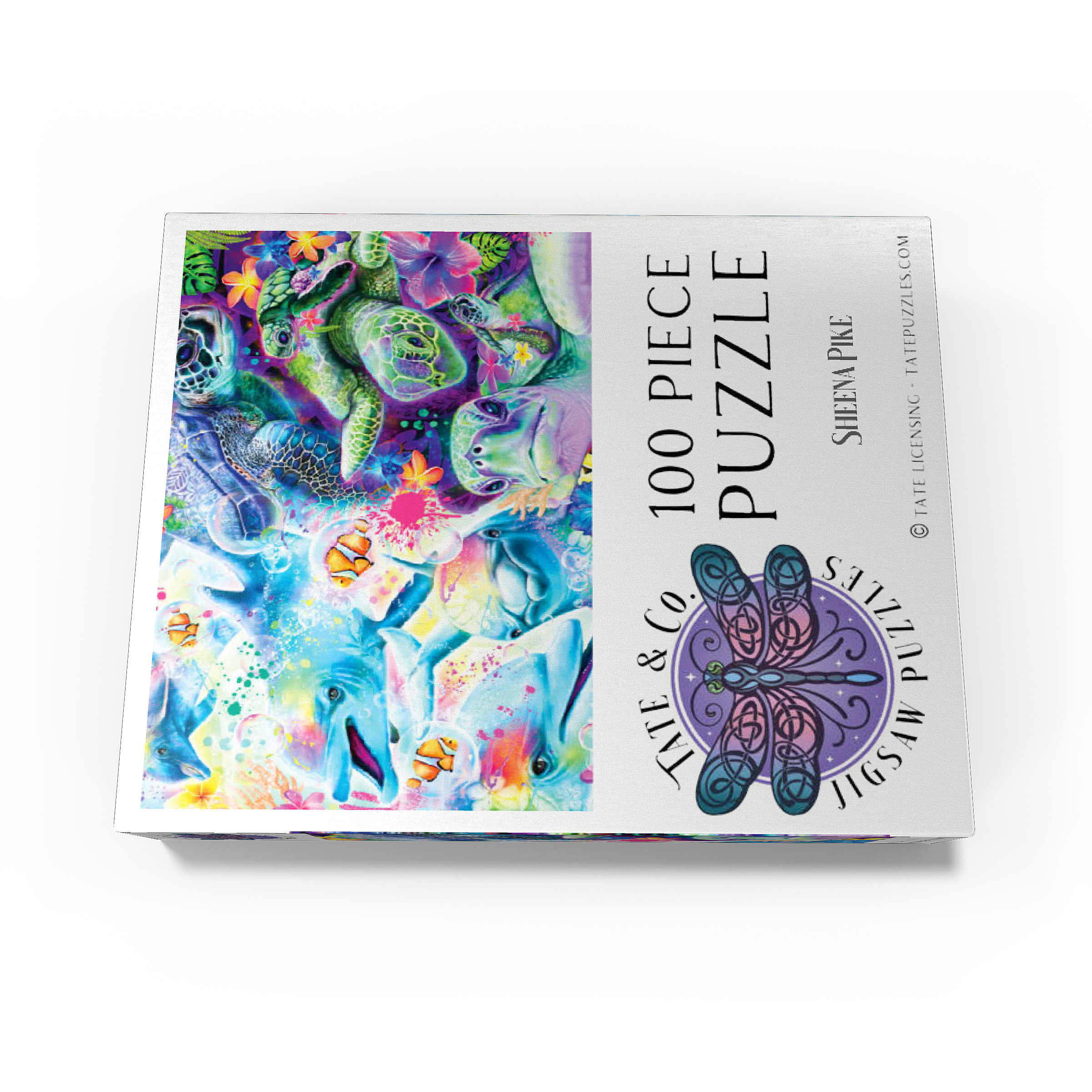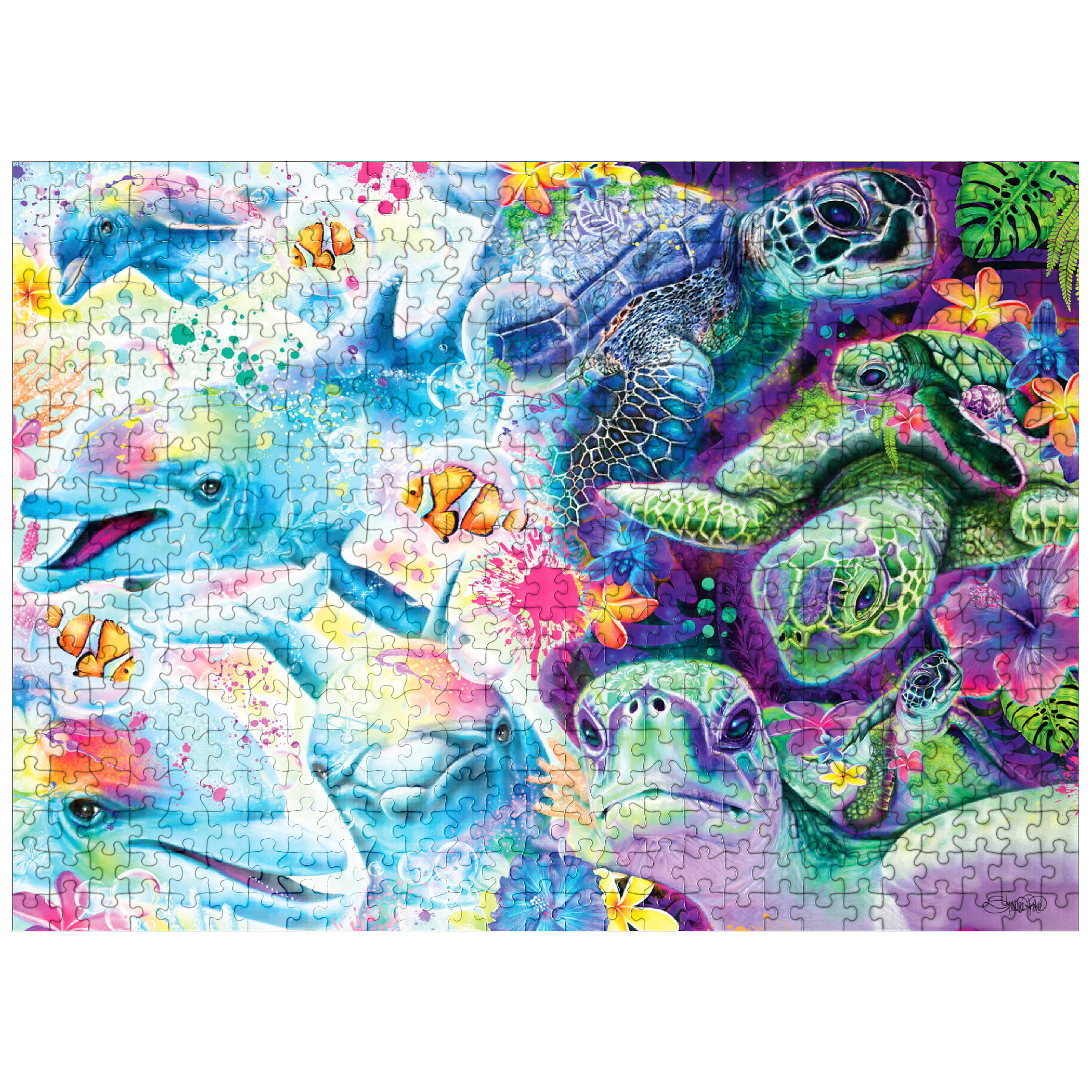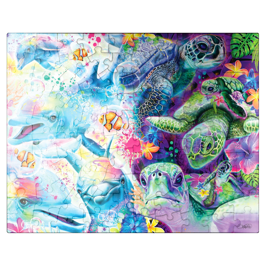 A vibrant and dynamic underwater scene rendered in a neon-infused aesthetic, reminiscent of the 1990s. Dolphins and sea turtles engage in playful interaction amidst a bustling ocean environment. The artwork, inspired by Sheena Pike, features whimsical elements such as clownfish, buoyant bubbles, and expressive splashes of color, creating a joyful and nostalgic visual experience.