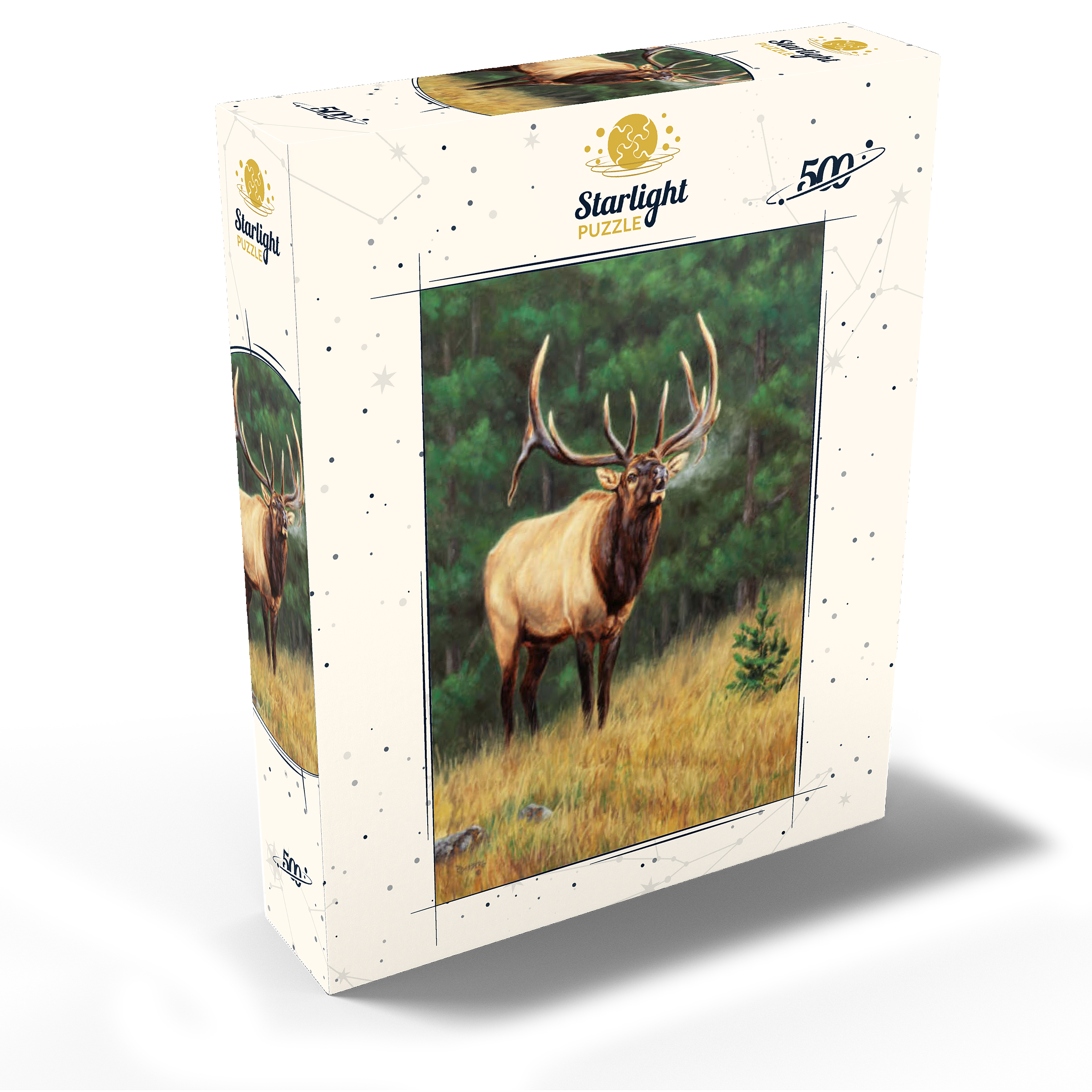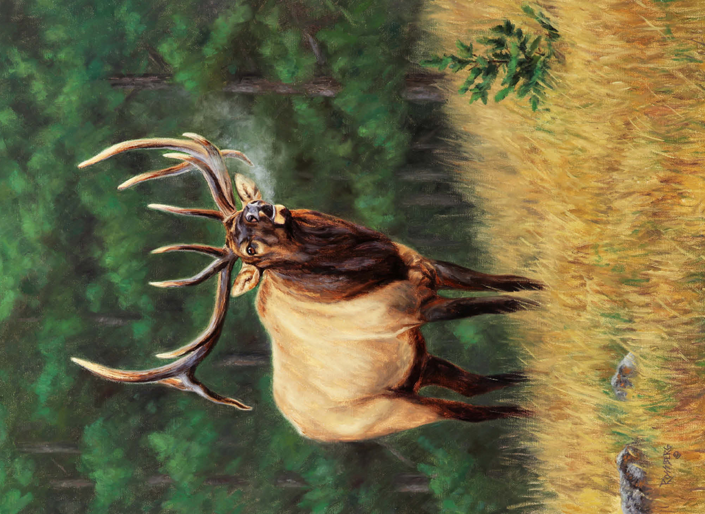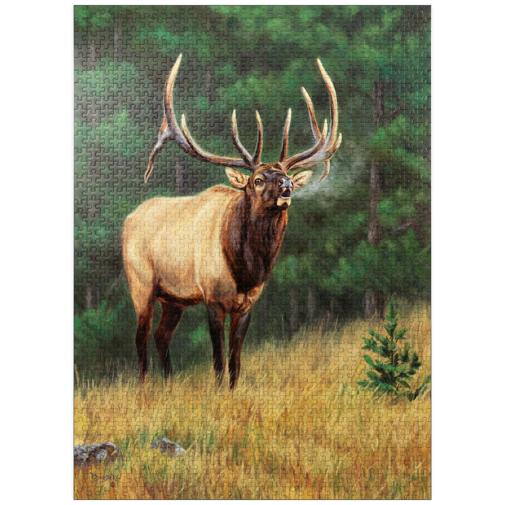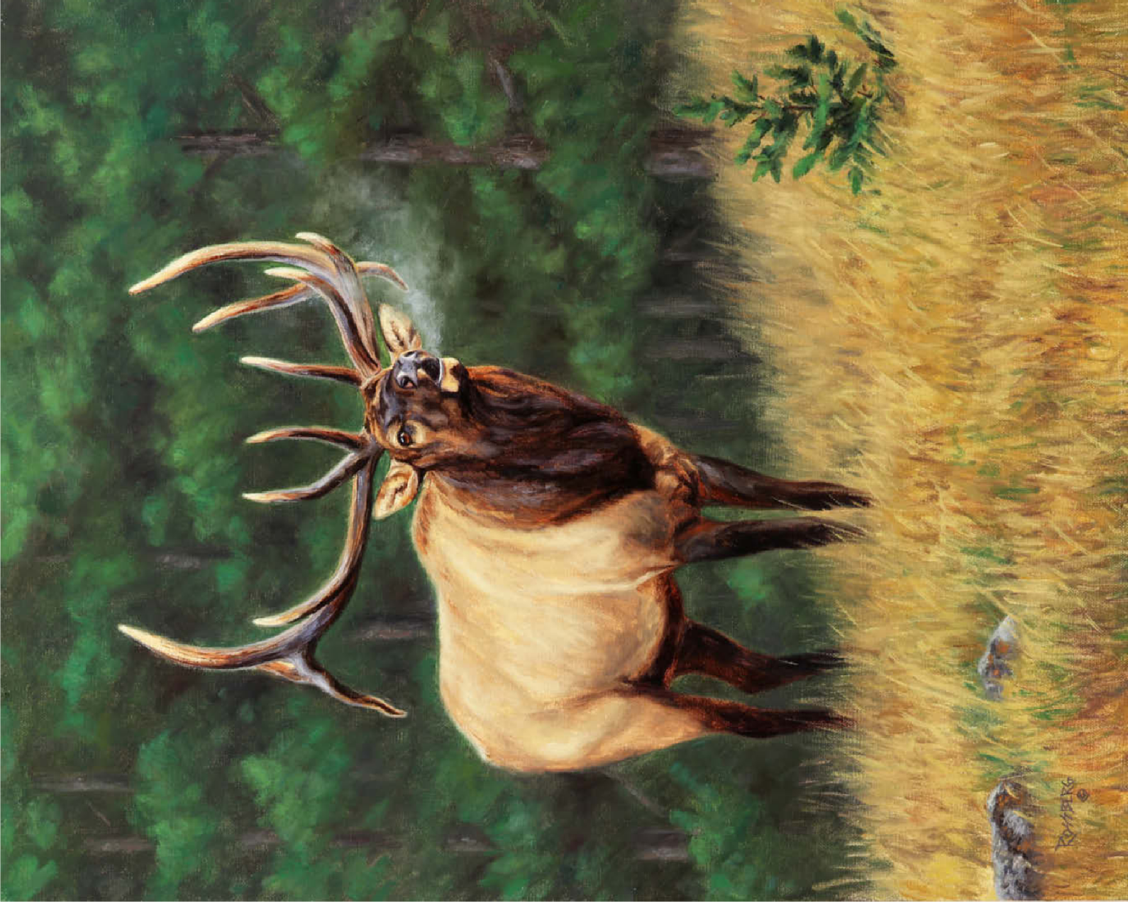 A powerful bull elk stands proudly in a sunlit forest clearing, surrounded by golden grass and vibrant green trees. Its massive antlers curve elegantly, showcasing the elk's strength and majesty. The breath visible in the cool air hints at a crisp, tranquil morning in the wilderness. This artwork captures the raw beauty and regal presence of one of nature's most iconic creatures in its natural habitat.