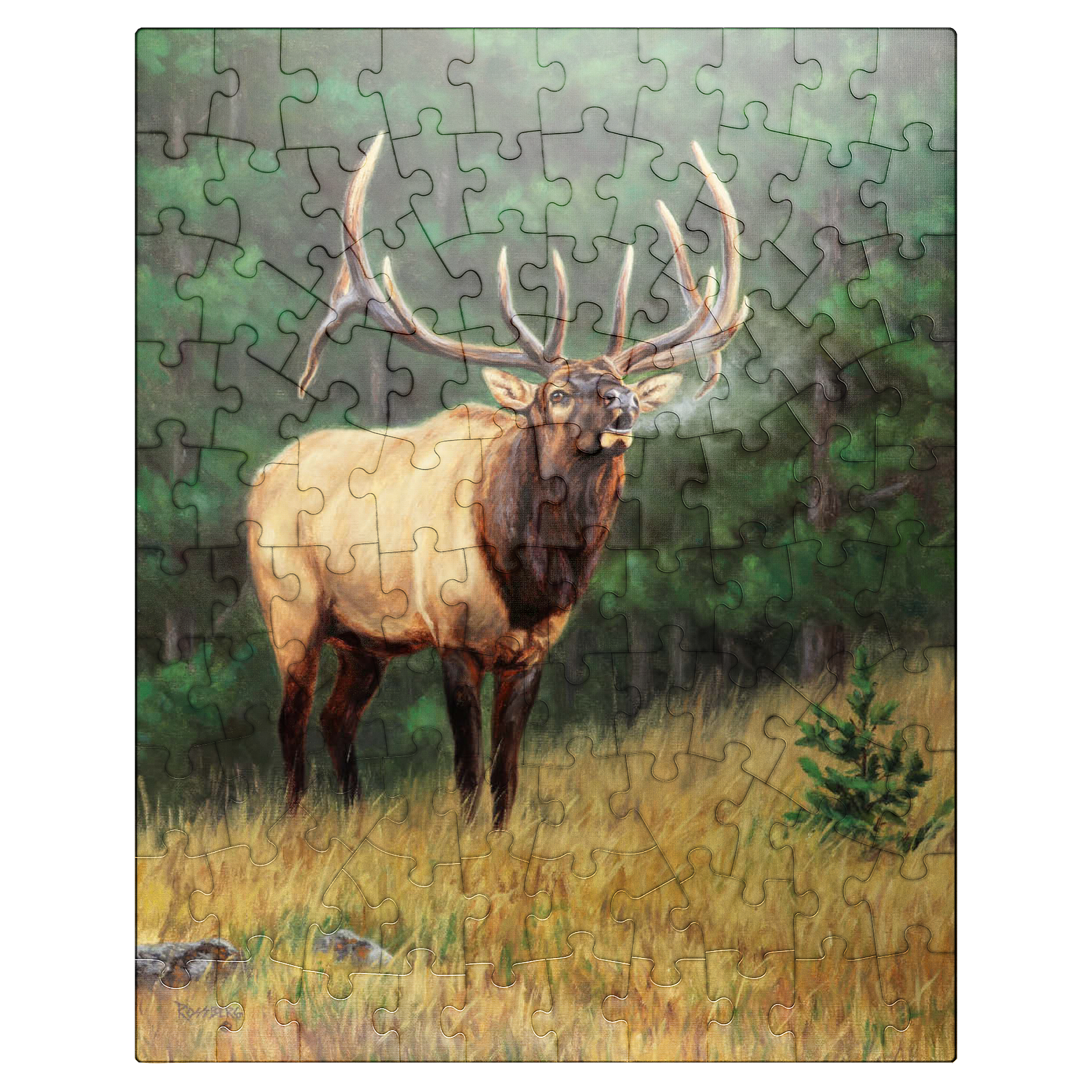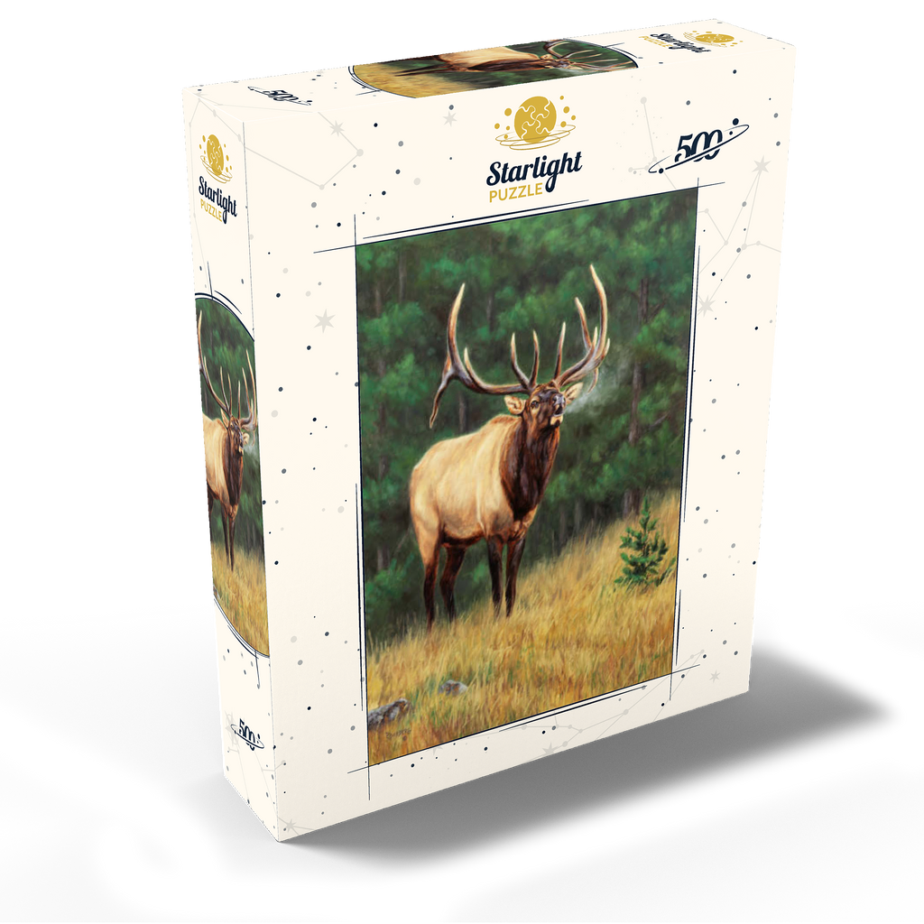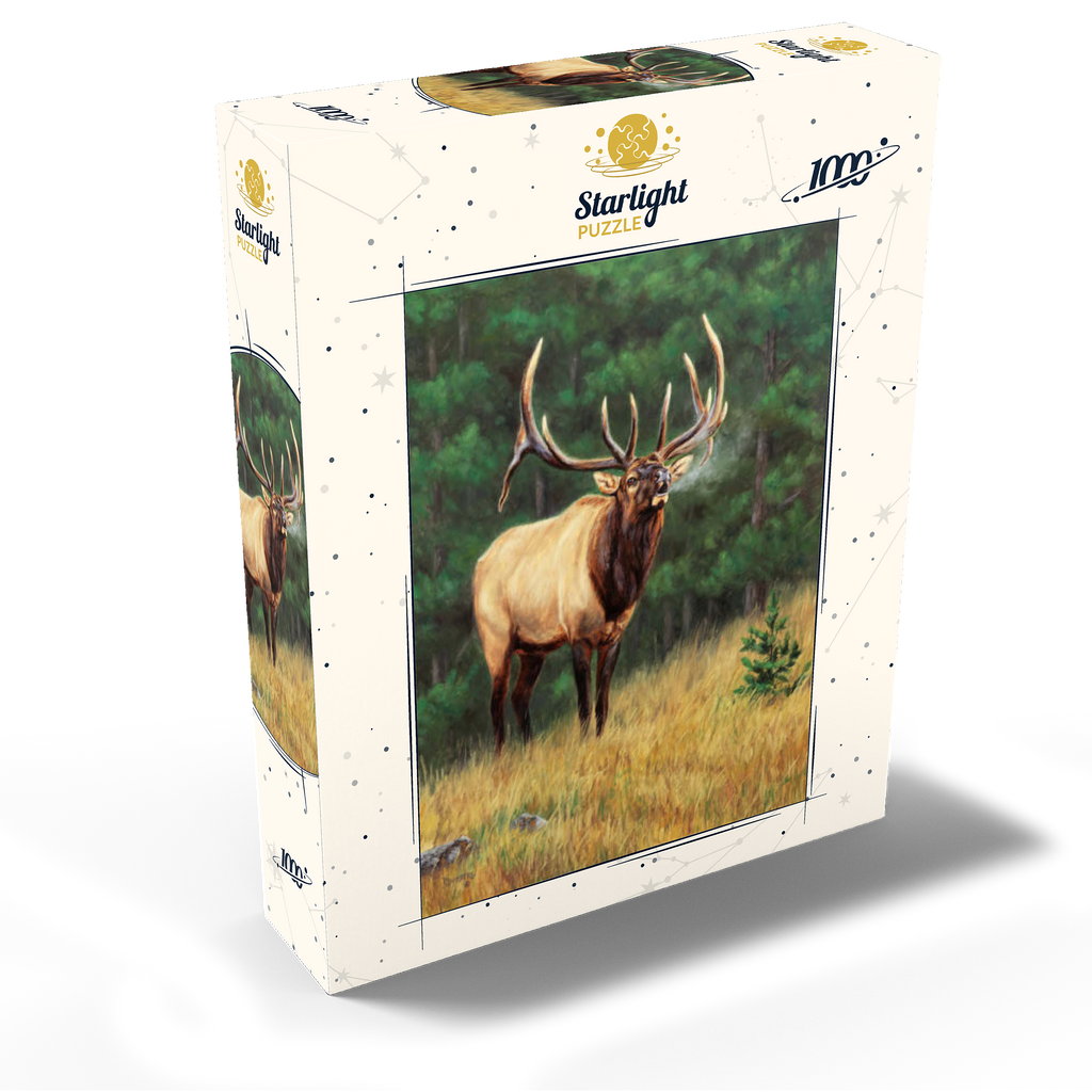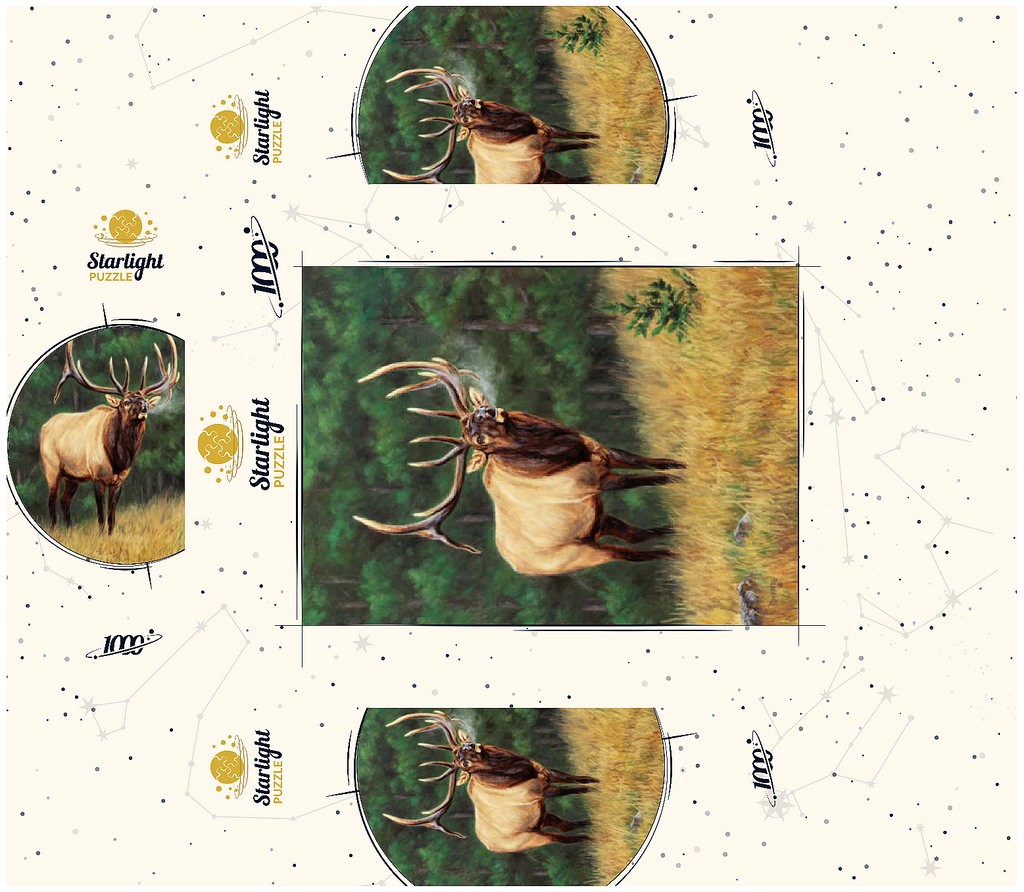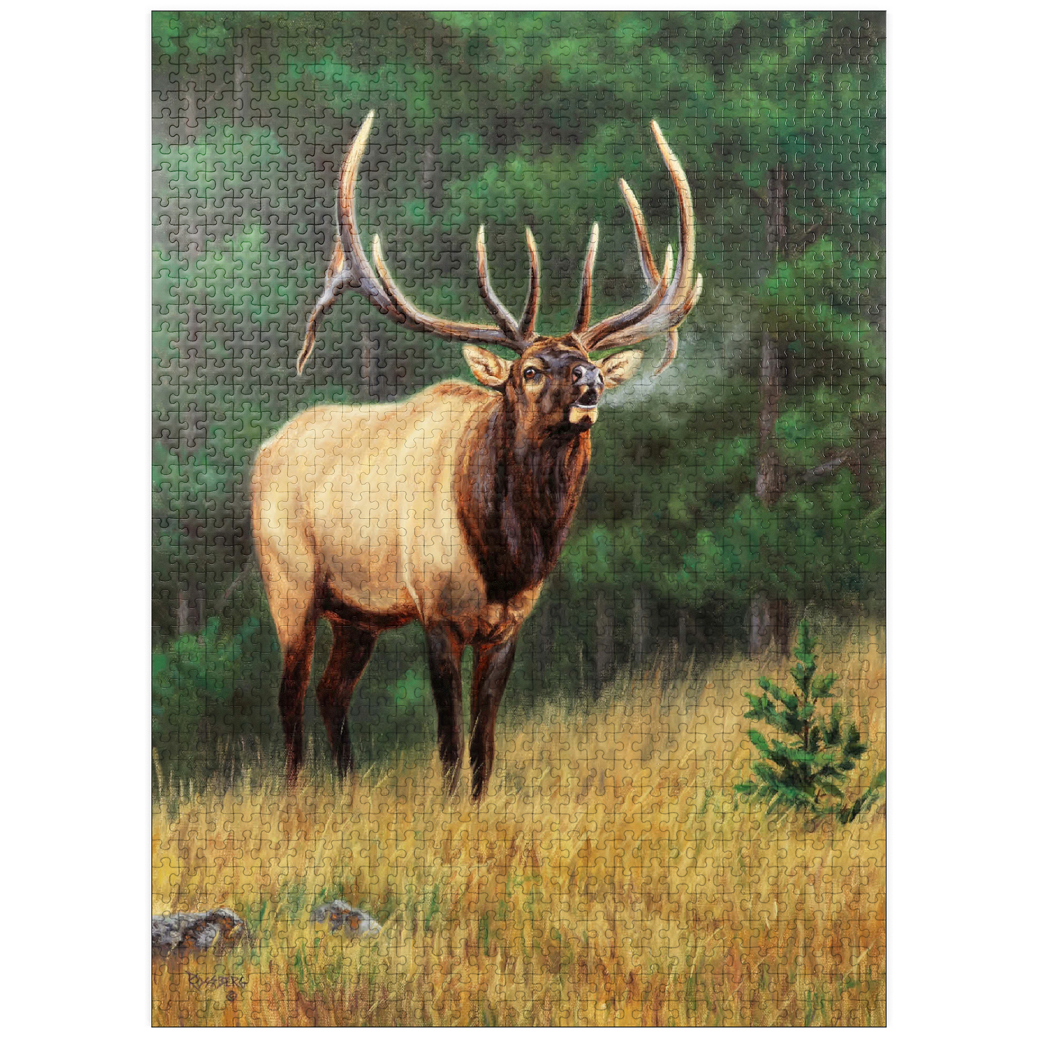 A powerful bull elk stands proudly in a sunlit forest clearing, surrounded by golden grass and vibrant green trees. Its massive antlers curve elegantly, showcasing the elk's strength and majesty. The breath visible in the cool air hints at a crisp, tranquil morning in the wilderness. This artwork captures the raw beauty and regal presence of one of nature's most iconic creatures in its natural habitat.