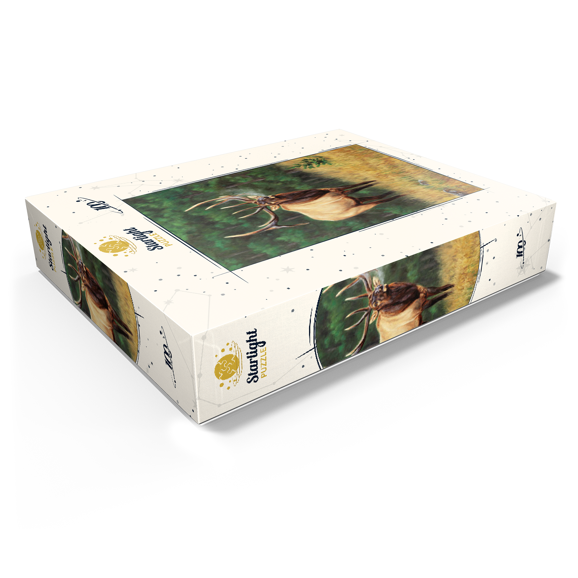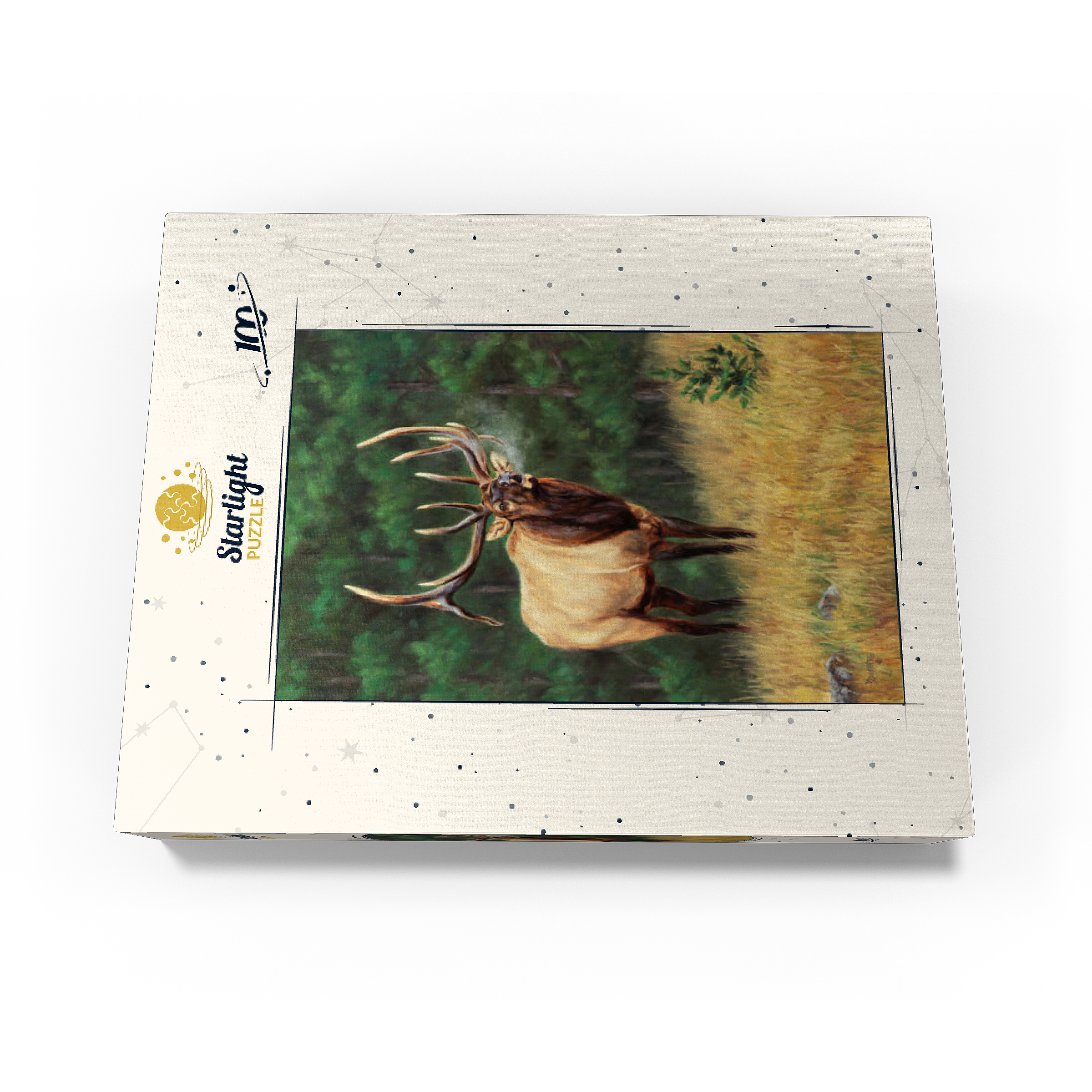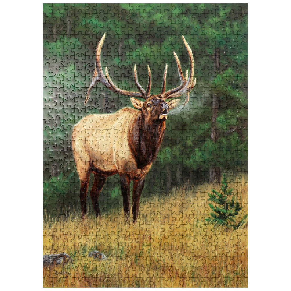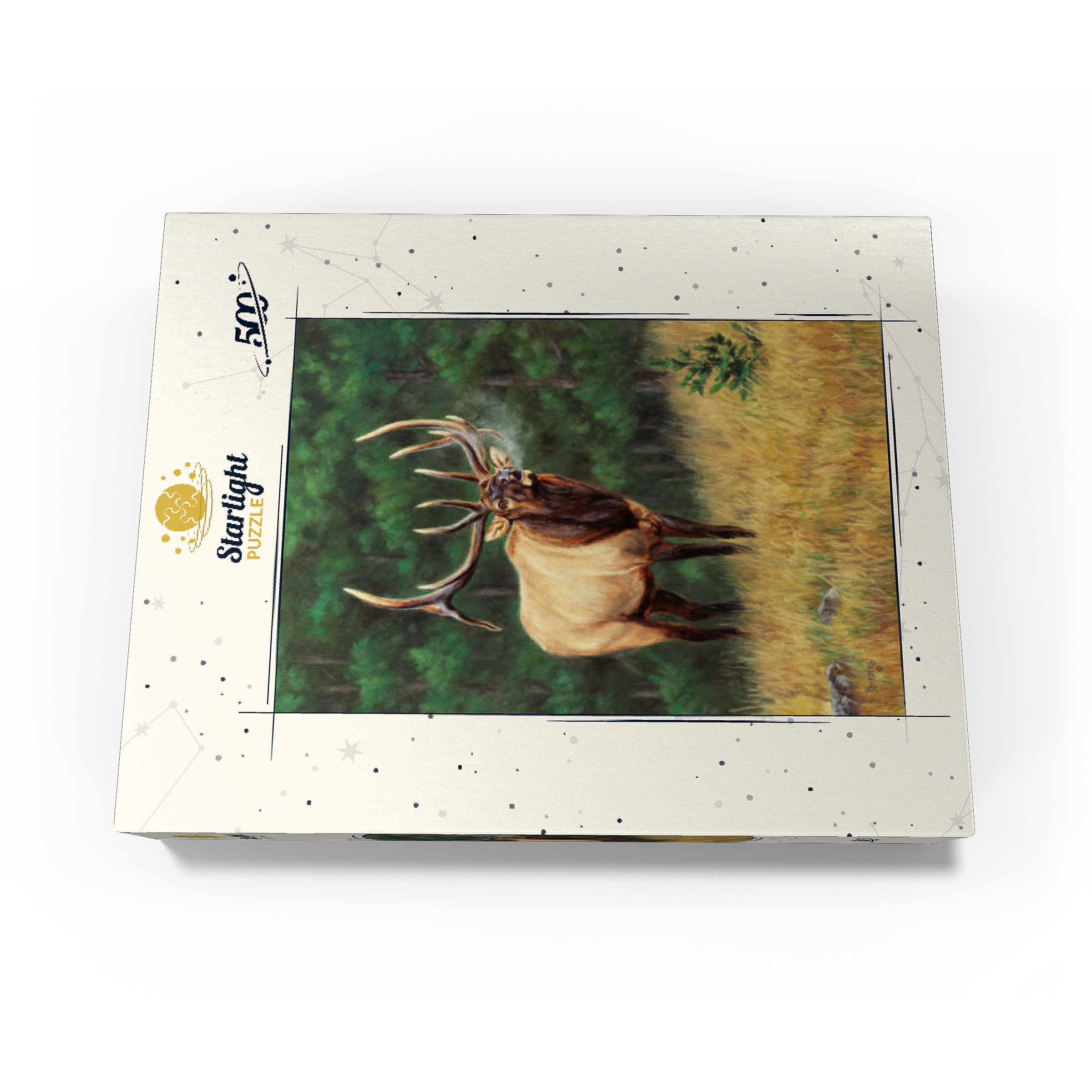 A powerful bull elk stands proudly in a sunlit forest clearing, surrounded by golden grass and vibrant green trees. Its massive antlers curve elegantly, showcasing the elk's strength and majesty. The breath visible in the cool air hints at a crisp, tranquil morning in the wilderness. This artwork captures the raw beauty and regal presence of one of nature's most iconic creatures in its natural habitat.