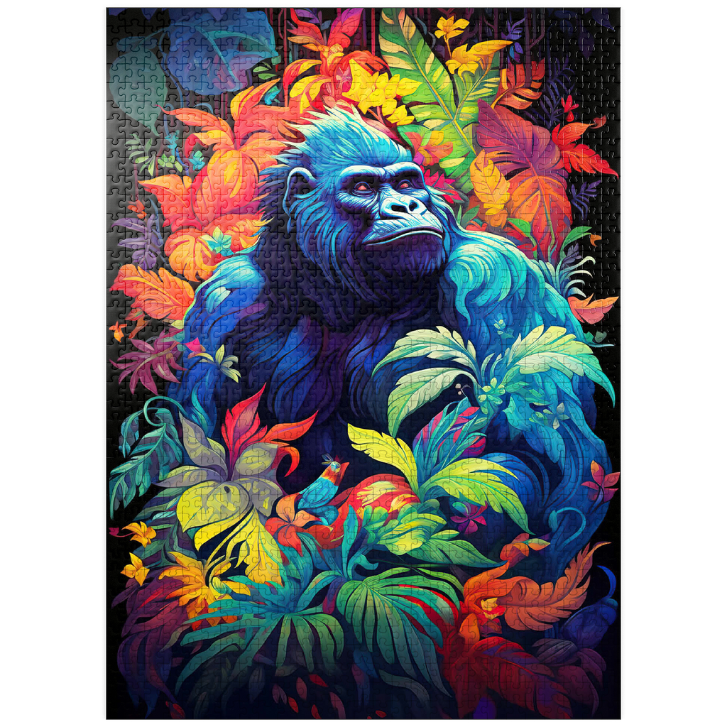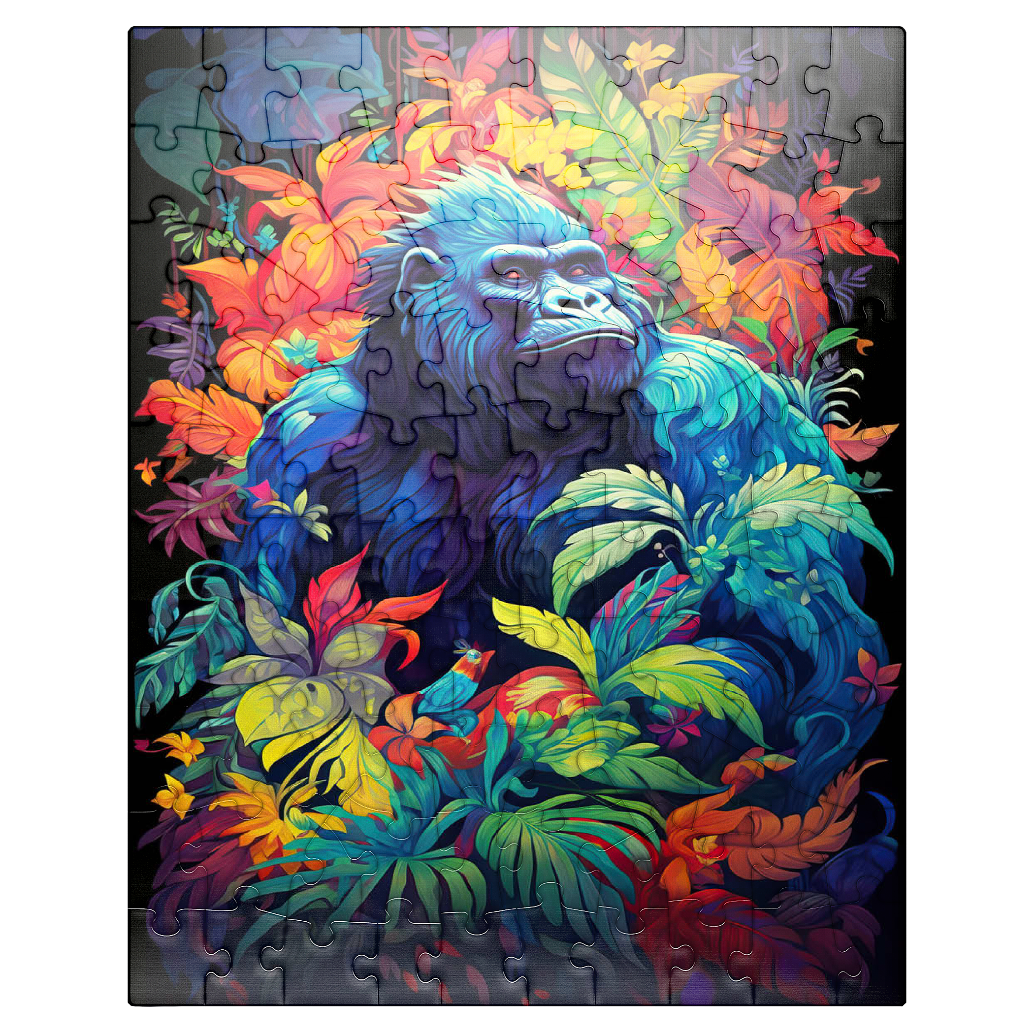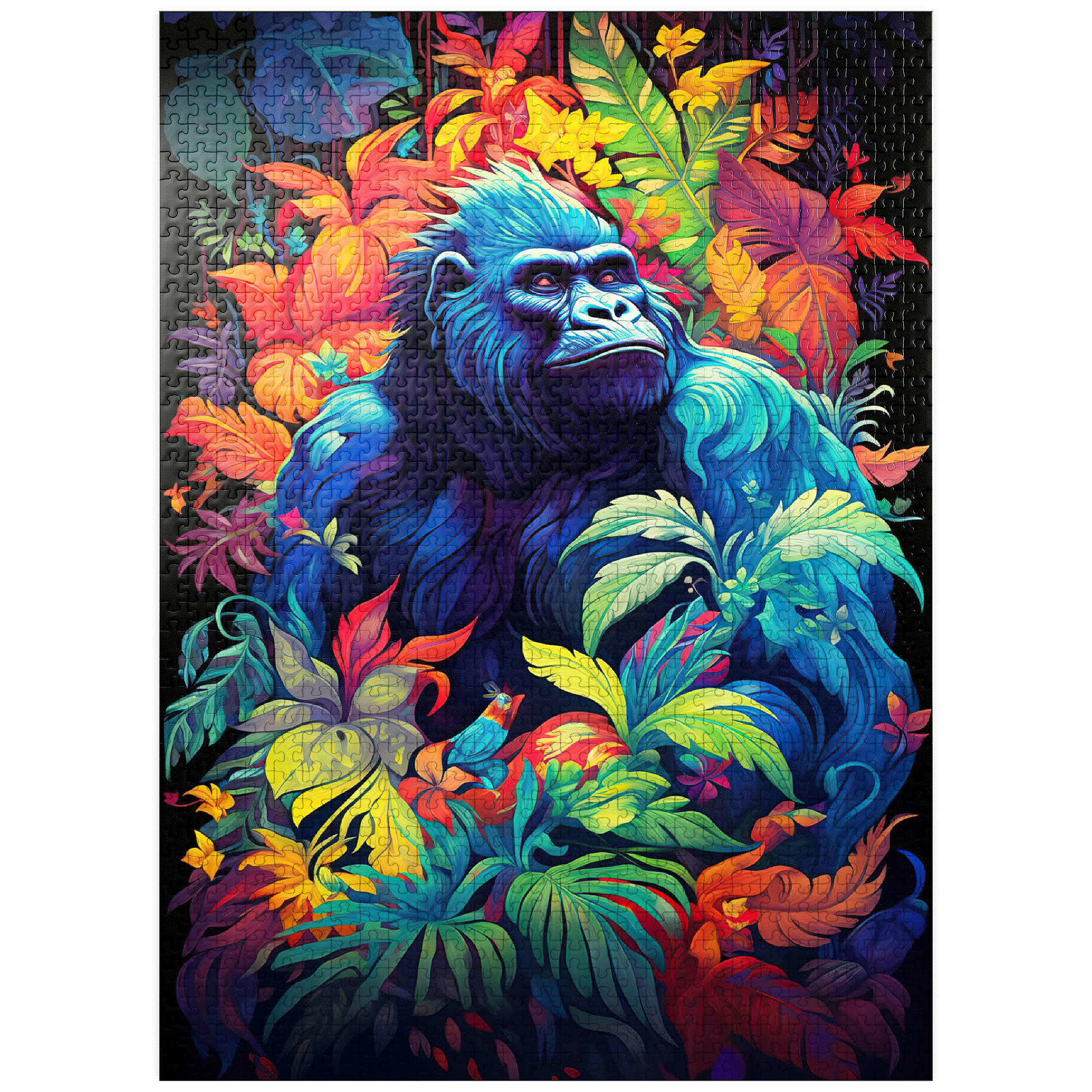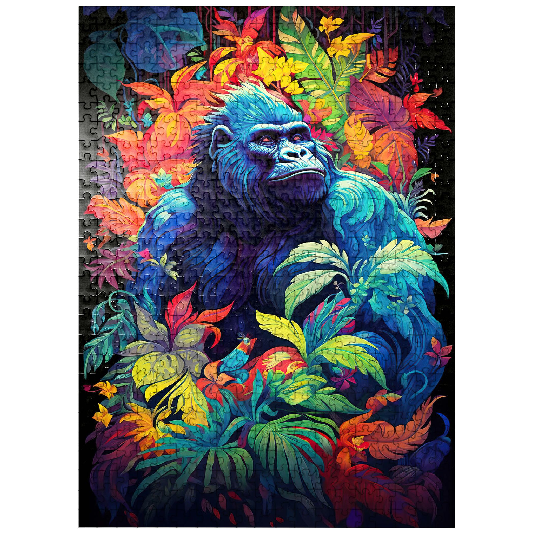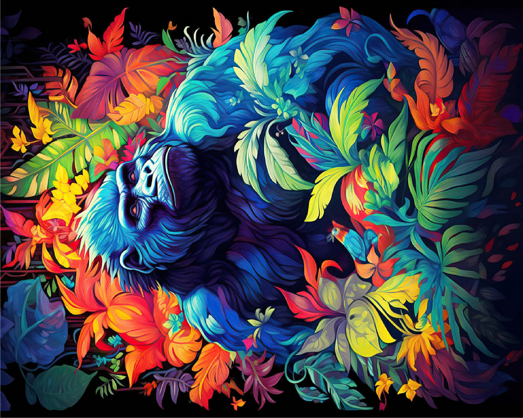 This stunning artwork features a powerful gorilla surrounded by a lush, vividly colored jungle. The deep blues and purples of the gorilla's fur contrast beautifully with the fiery oranges, yellows, and greens of the tropical foliage, creating a breathtaking fusion of nature and fantasy. The intense gaze of the gorilla adds a sense of wisdom and strength, making this piece a striking addition to any wildlife or artistic collection. A perfect choice for nature lovers, jungle explorers, and fans of bold, surreal animal art.