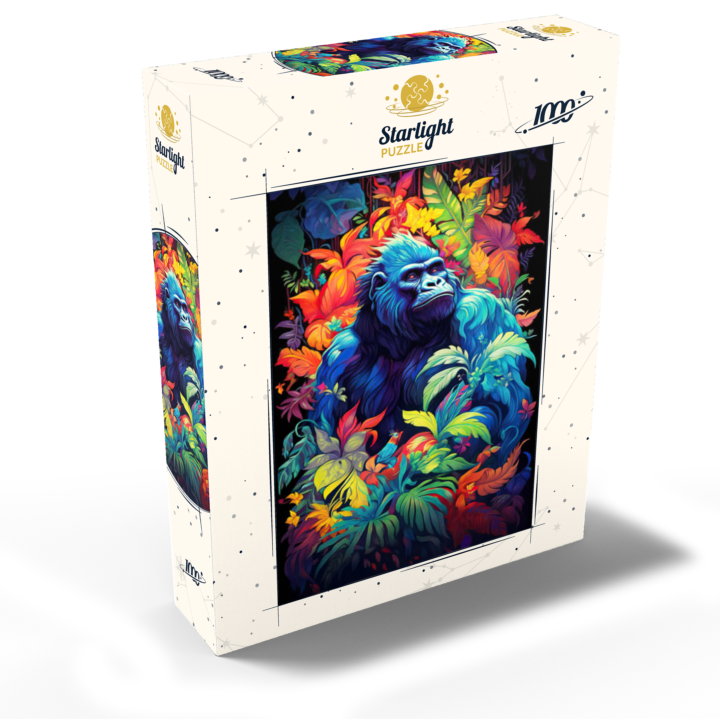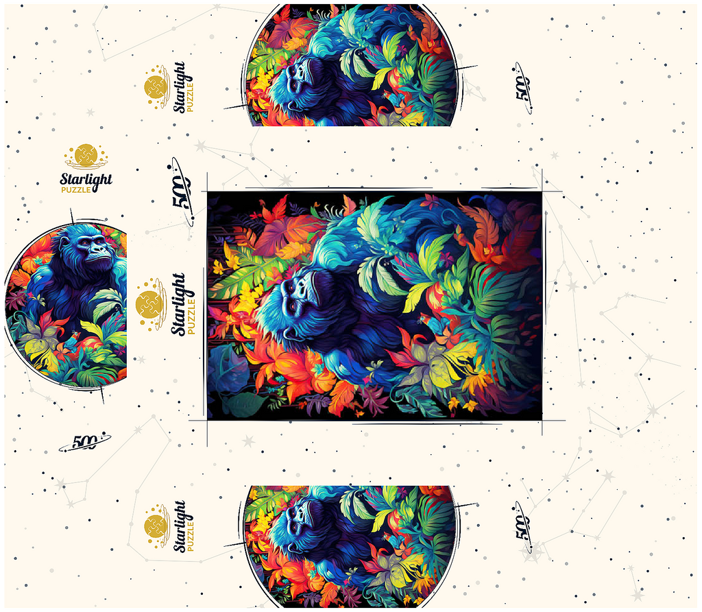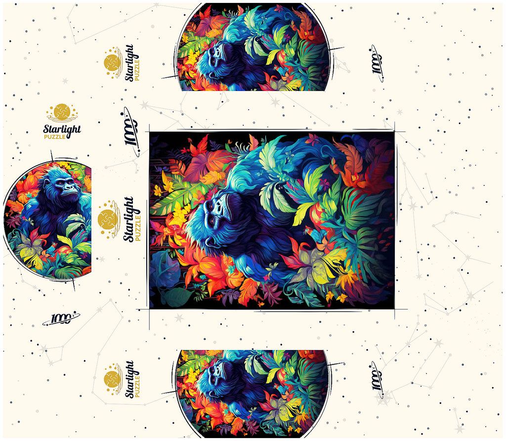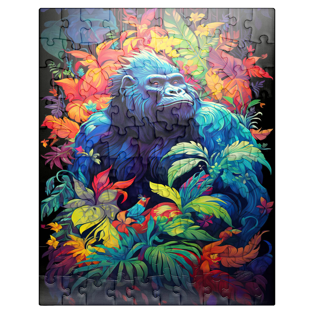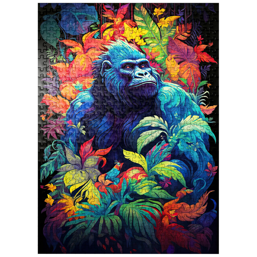This stunning artwork features a powerful gorilla surrounded by a lush, vividly colored jungle. The deep blues and purples of the gorilla's fur contrast beautifully with the fiery oranges, yellows, and greens of the tropical foliage, creating a breathtaking fusion of nature and fantasy. The intense gaze of the gorilla adds a sense of wisdom and strength, making this piece a striking addition to any wildlife or artistic collection. A perfect choice for nature lovers, jungle explorers, and fans of bold, surreal animal art.
