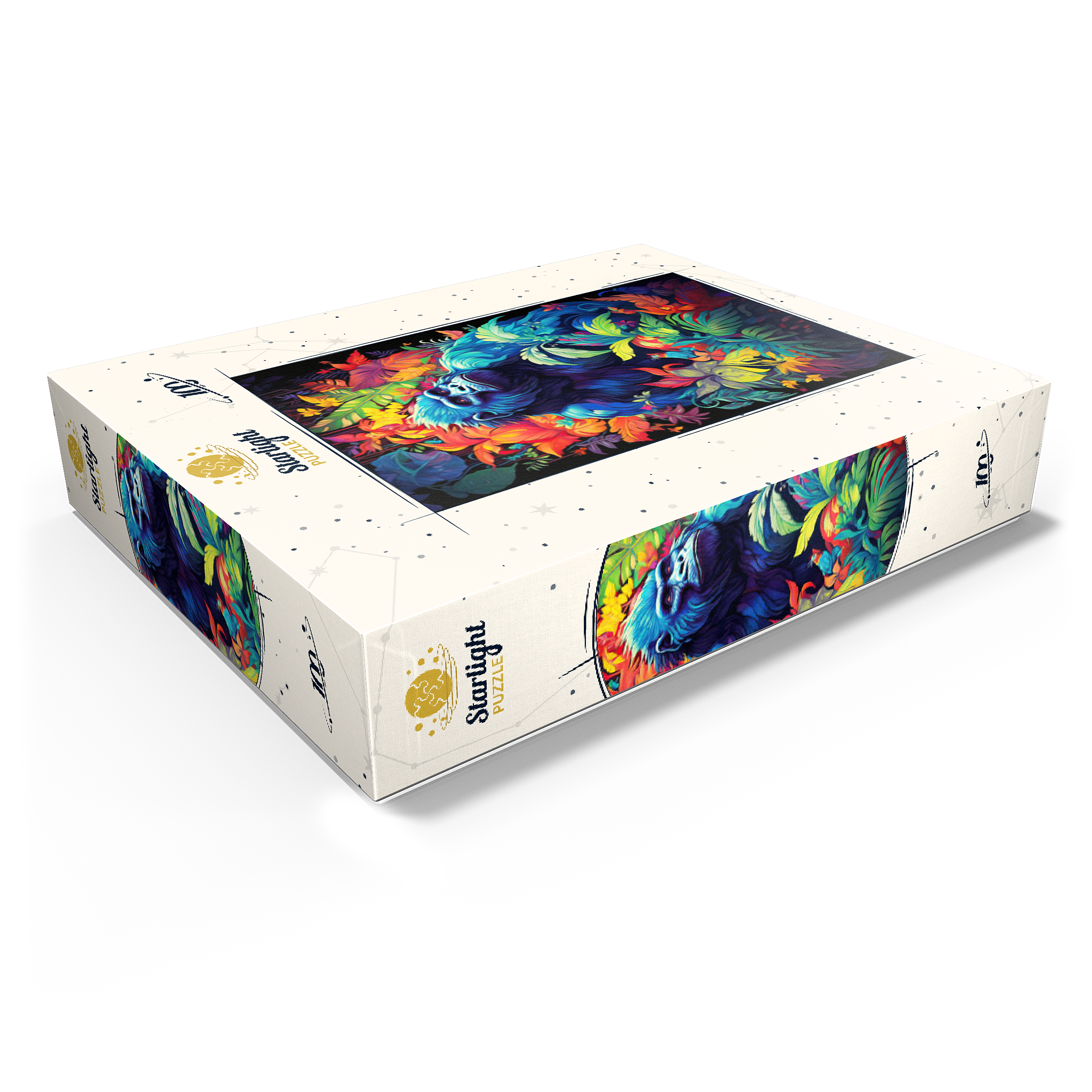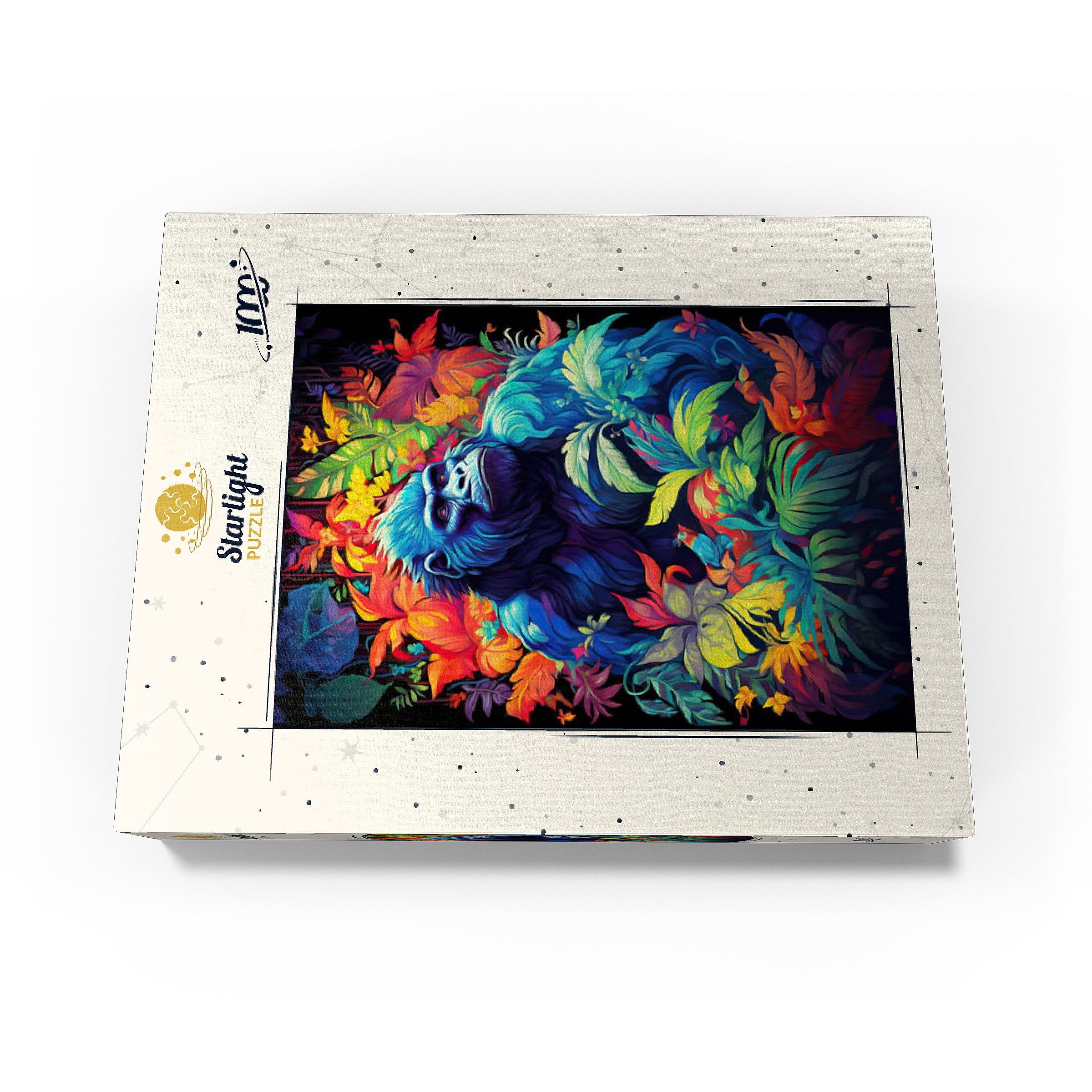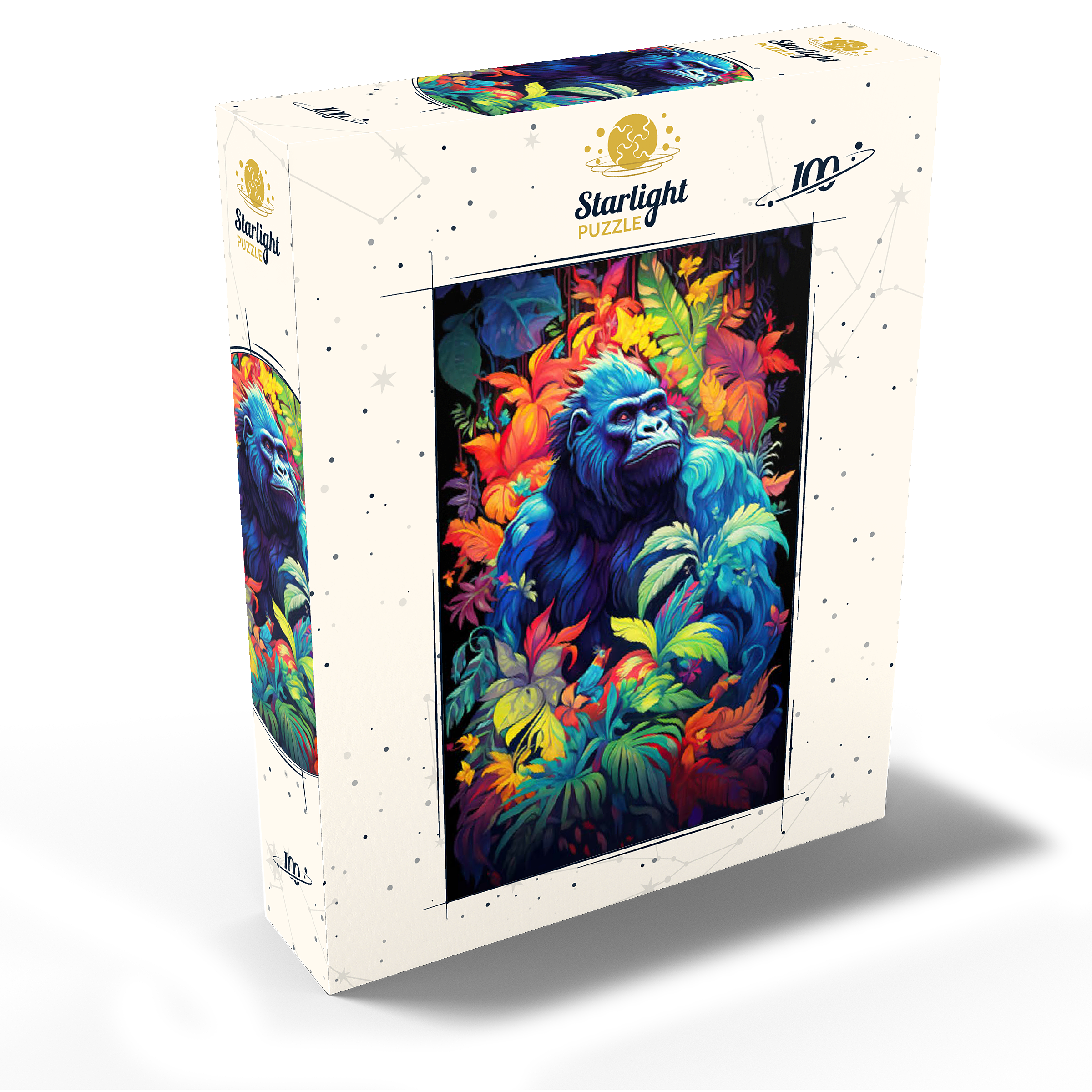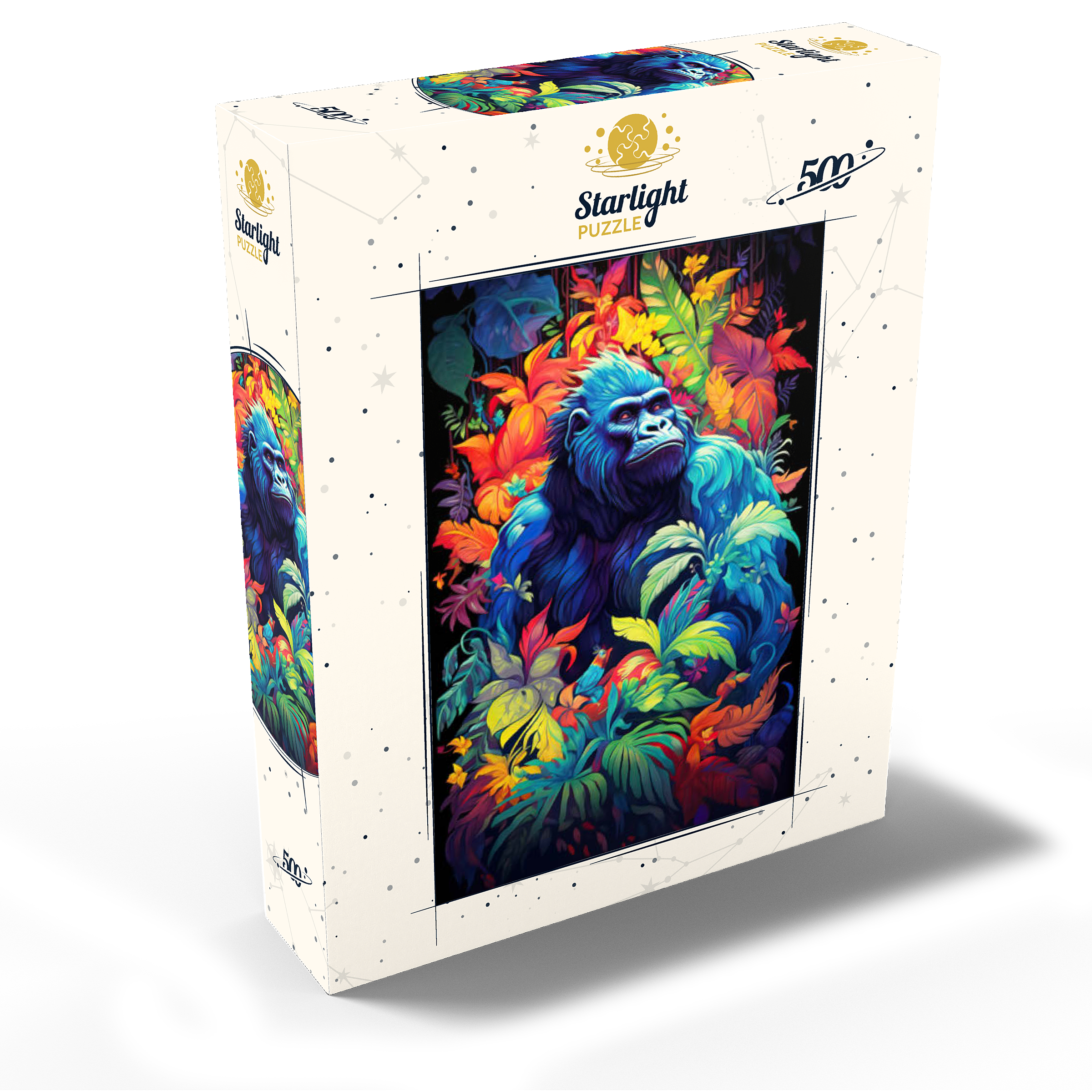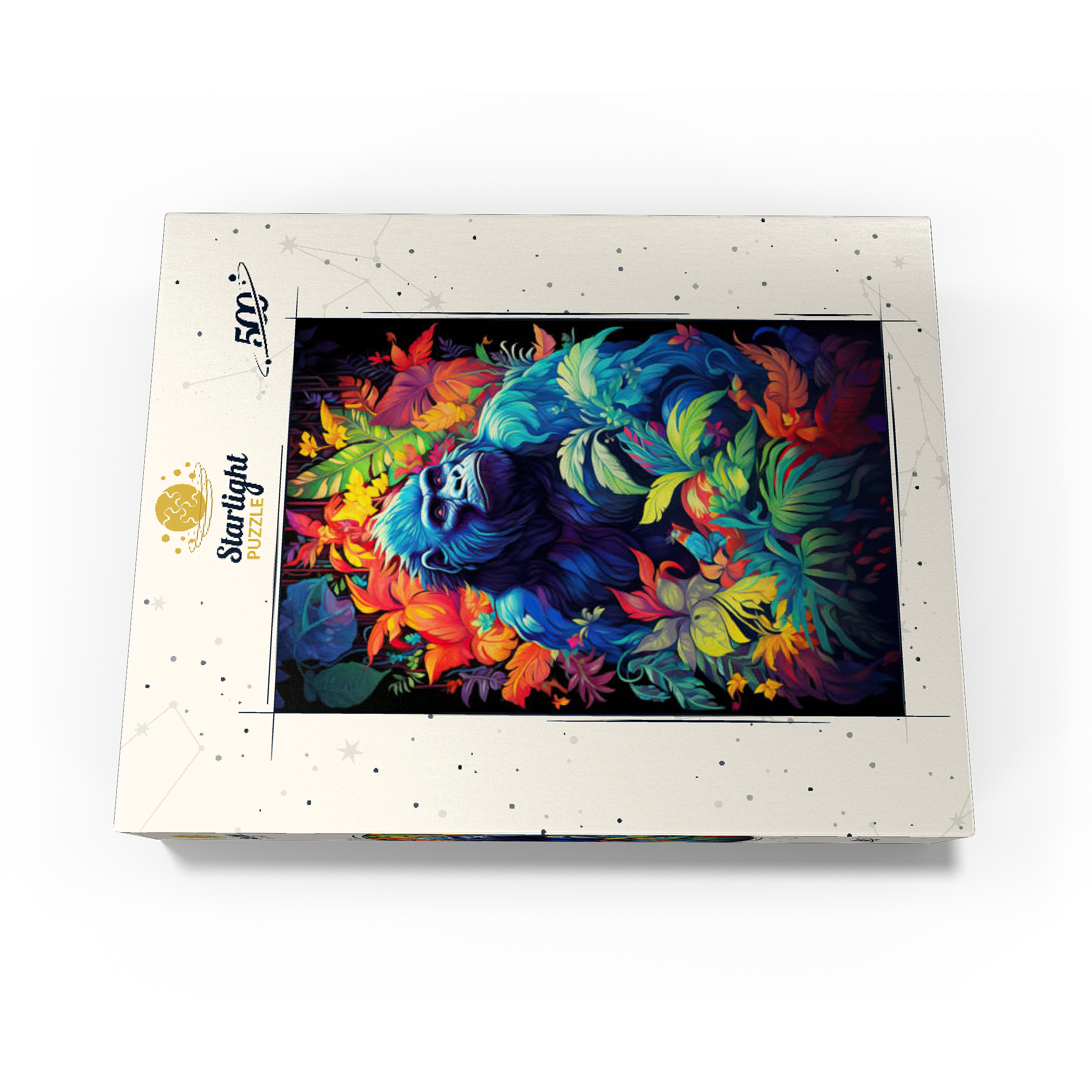 This stunning artwork features a powerful gorilla surrounded by a lush, vividly colored jungle. The deep blues and purples of the gorilla's fur contrast beautifully with the fiery oranges, yellows, and greens of the tropical foliage, creating a breathtaking fusion of nature and fantasy. The intense gaze of the gorilla adds a sense of wisdom and strength, making this piece a striking addition to any wildlife or artistic collection. A perfect choice for nature lovers, jungle explorers, and fans of bold, surreal animal art.