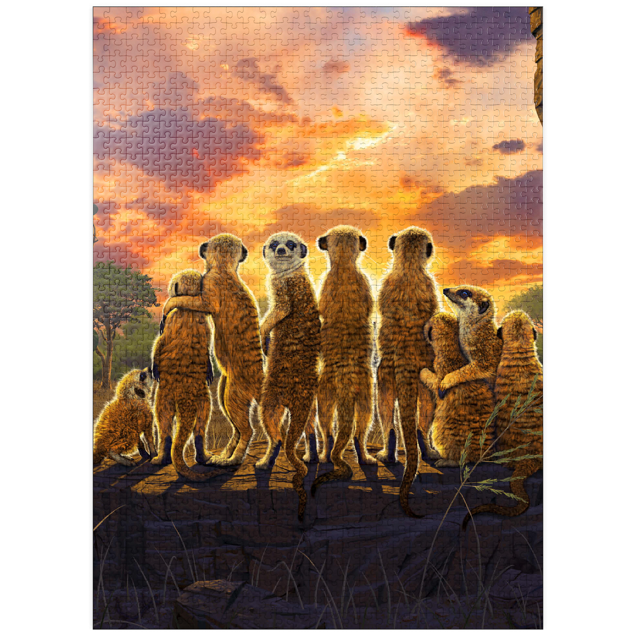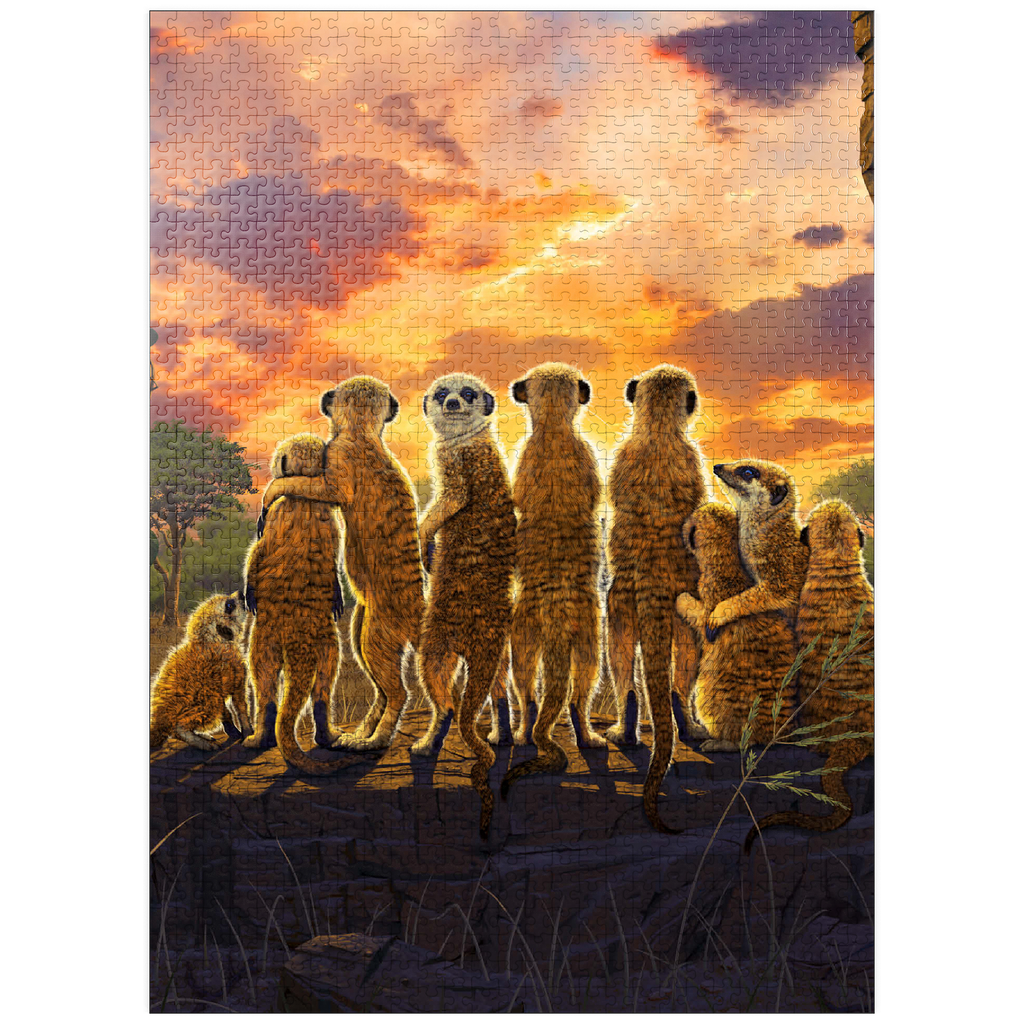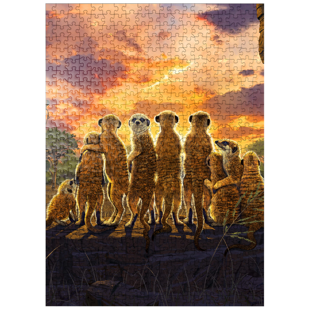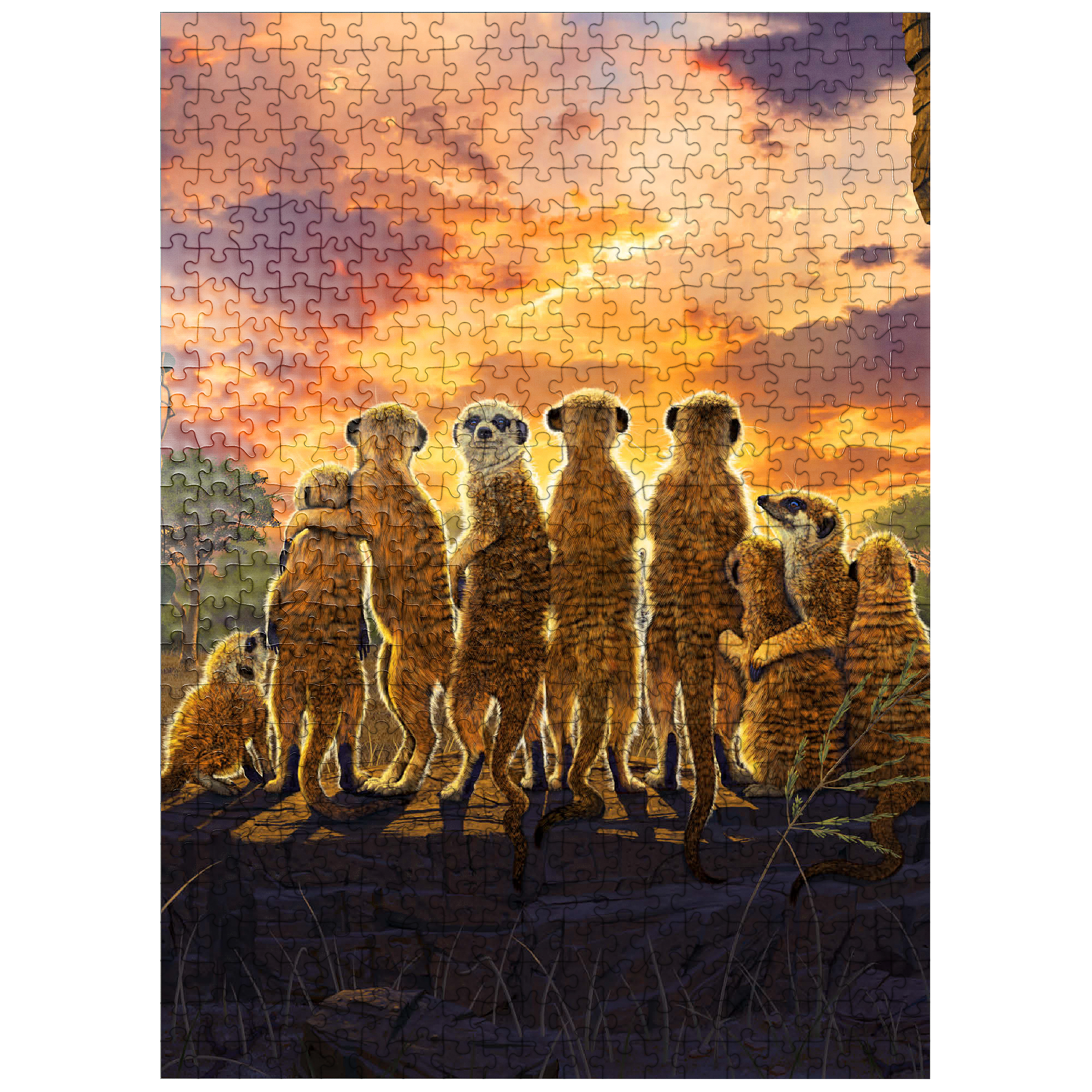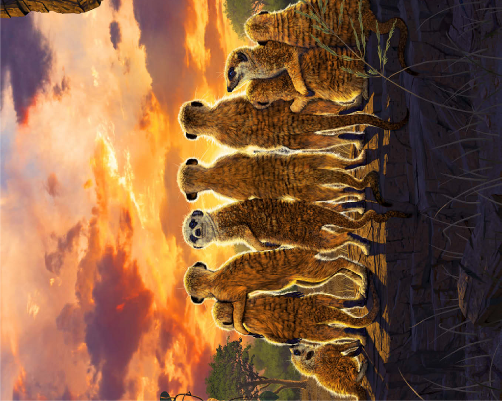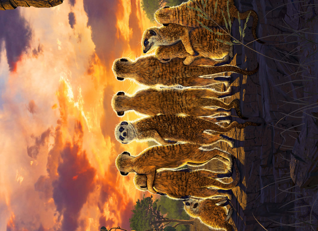 The Artwork depicts a meerkat family standing on a rock formation at sunset in an African savanna setting. the warm colors of the sunset are reflected in the meerkats' fur and the overall atmosphere of the scene. the background includes sparse vegetation and a rocky outcrop, suggesting a typical wildlife habitat. the overall feel is one of peaceful contemplation or serene observation of the sunset before they go to sleep.
