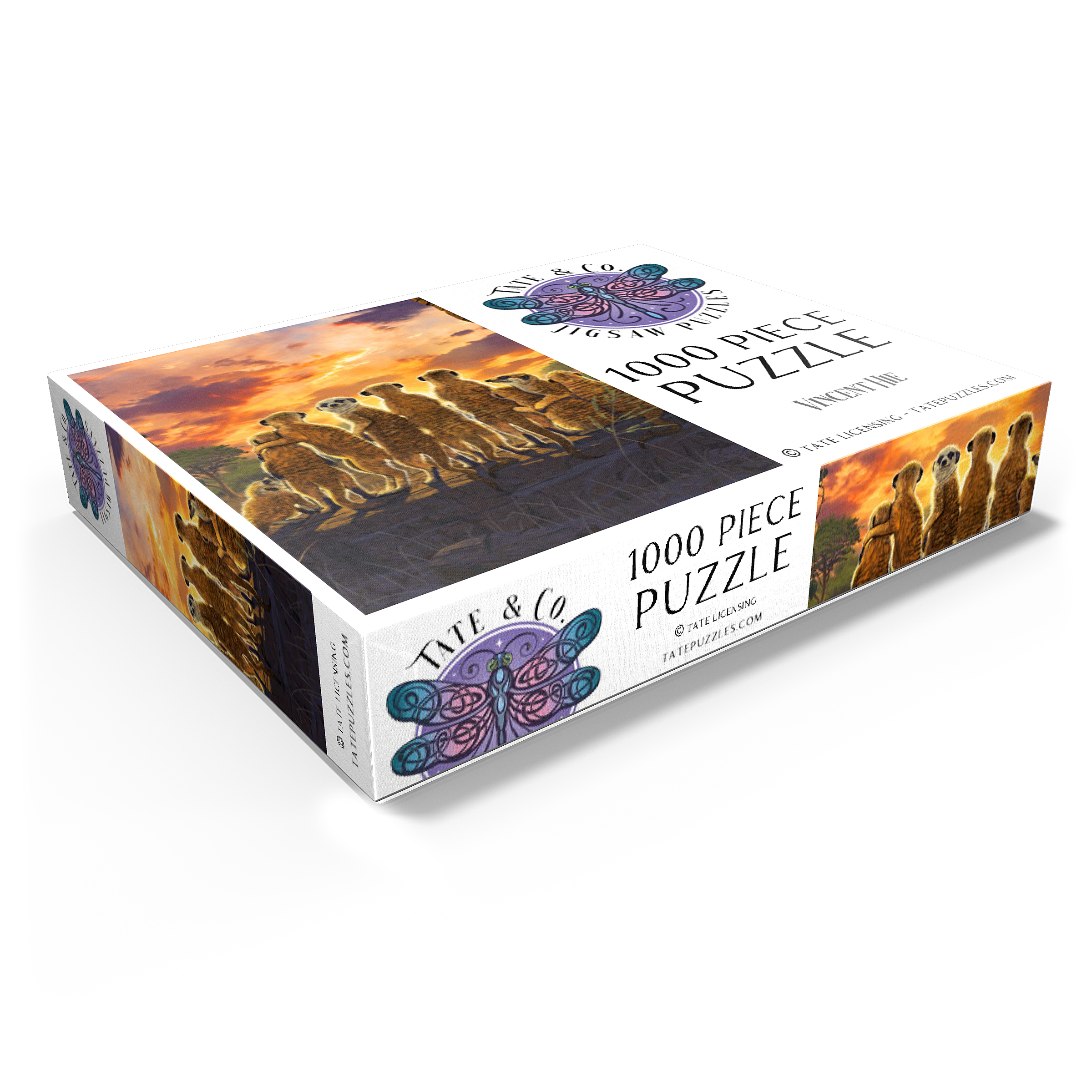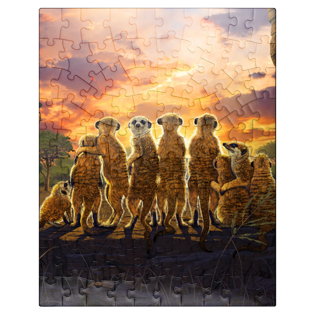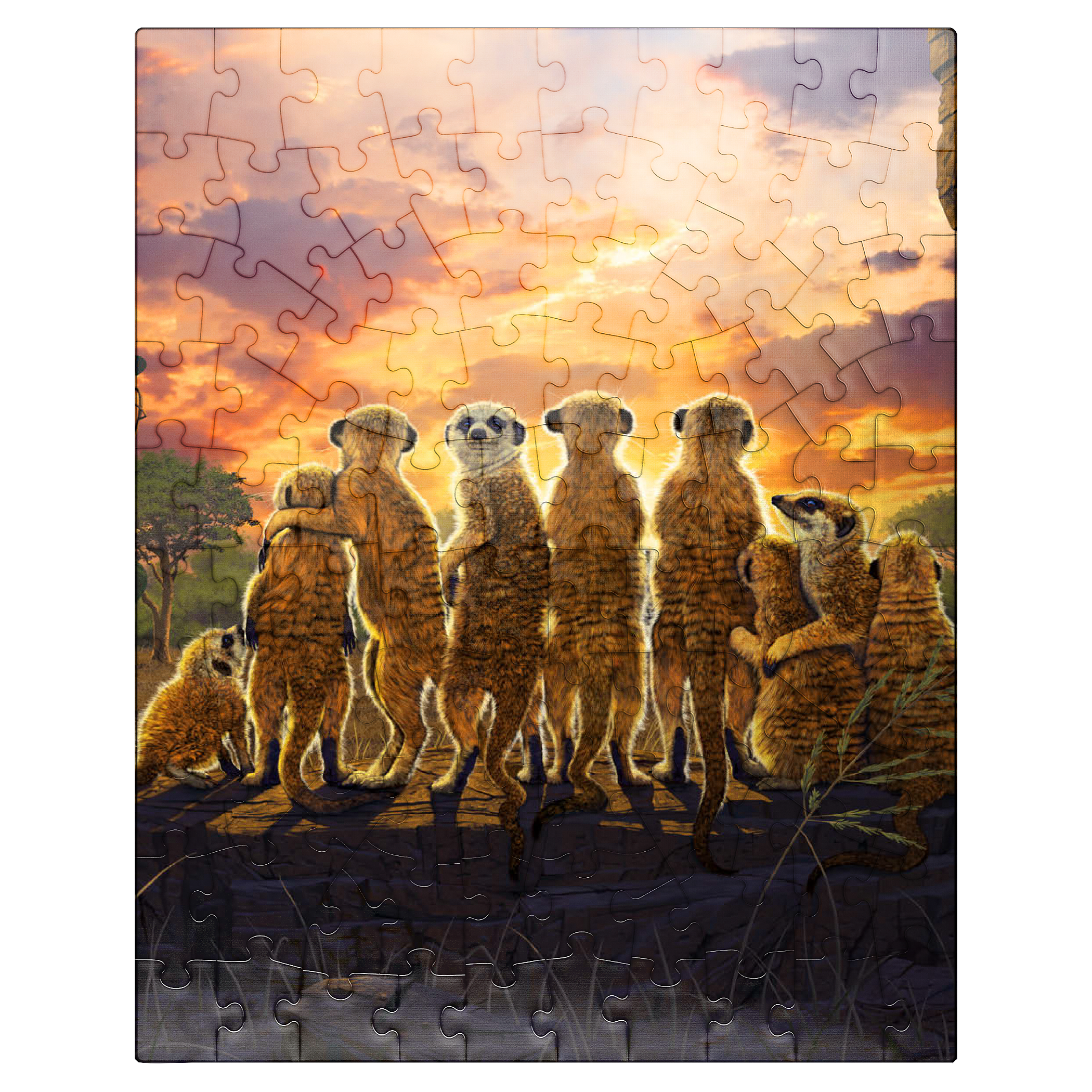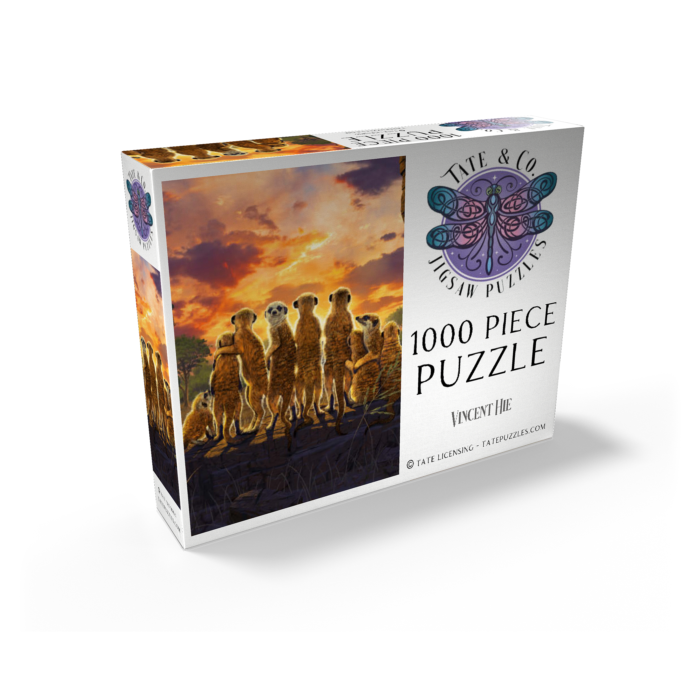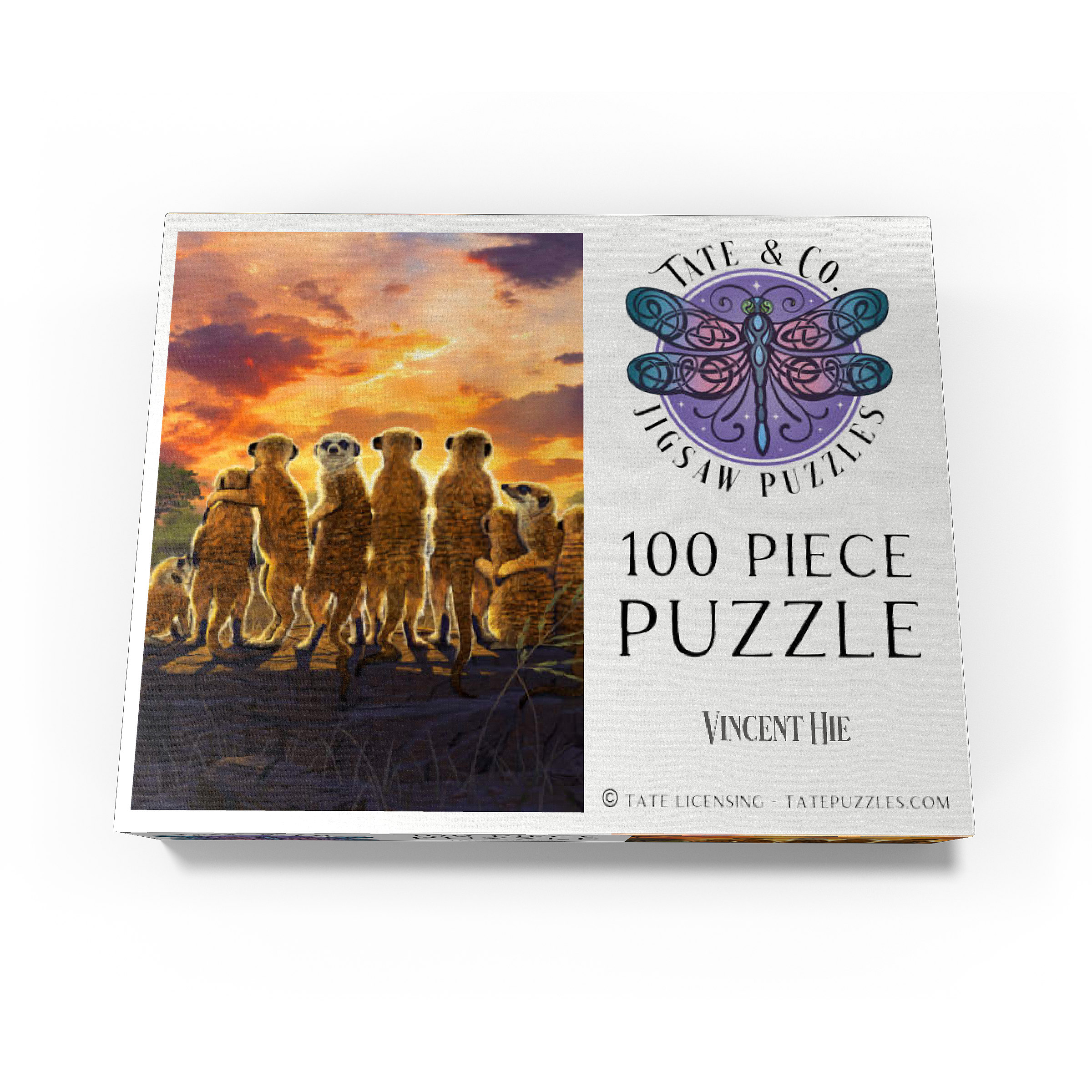 The Artwork depicts a meerkat family standing on a rock formation at sunset in an African savanna setting. the warm colors of the sunset are reflected in the meerkats' fur and the overall atmosphere of the scene. the background includes sparse vegetation and a rocky outcrop, suggesting a typical wildlife habitat. the overall feel is one of peaceful contemplation or serene observation of the sunset before they go to sleep.
