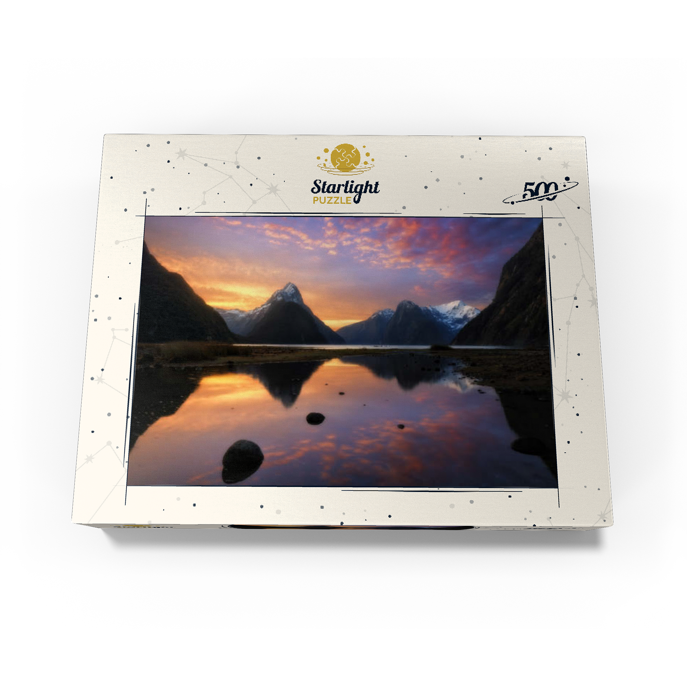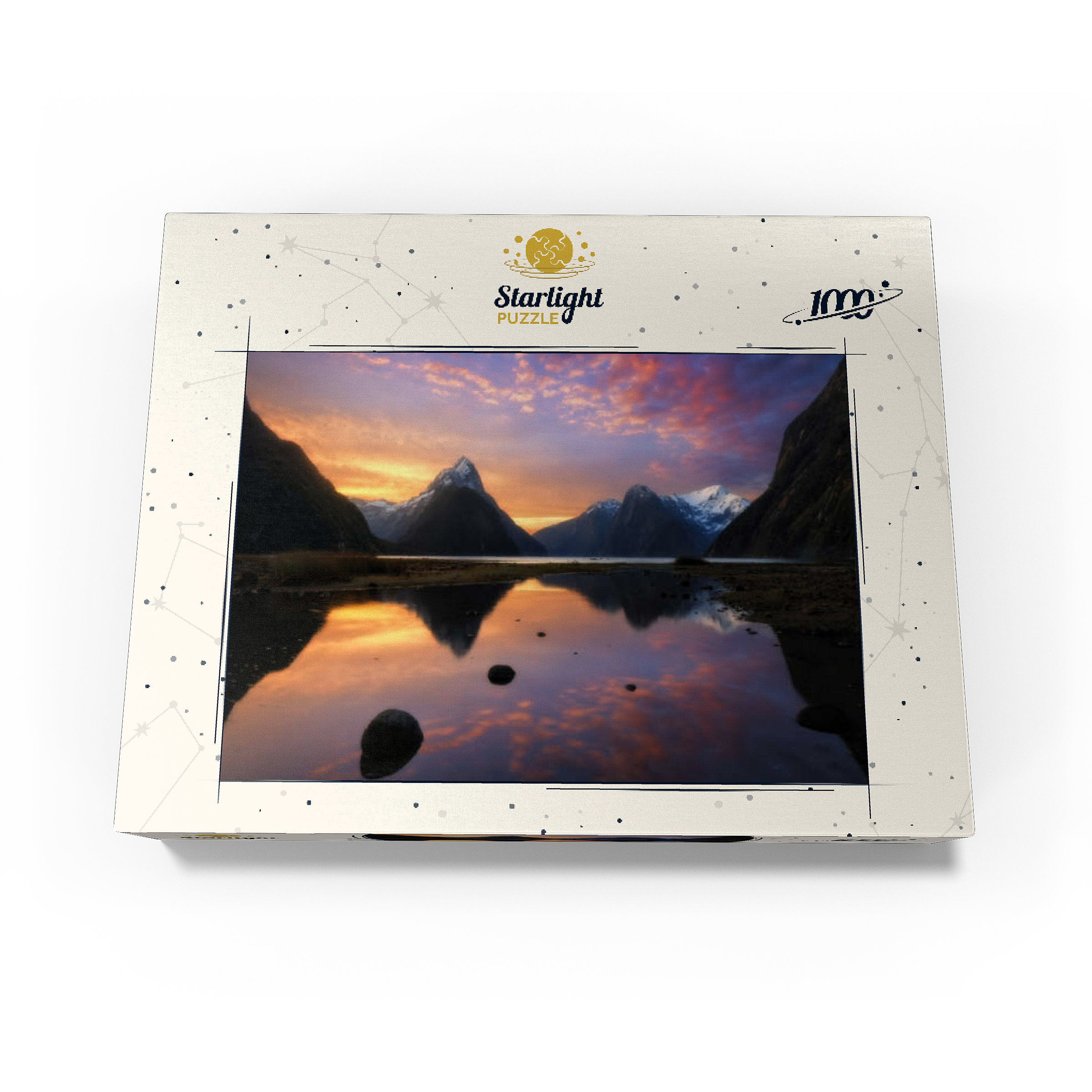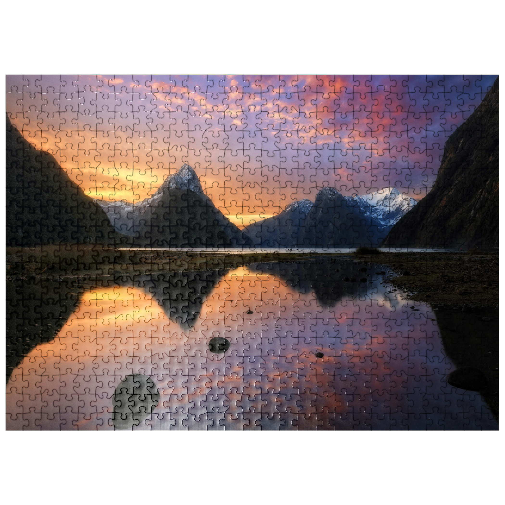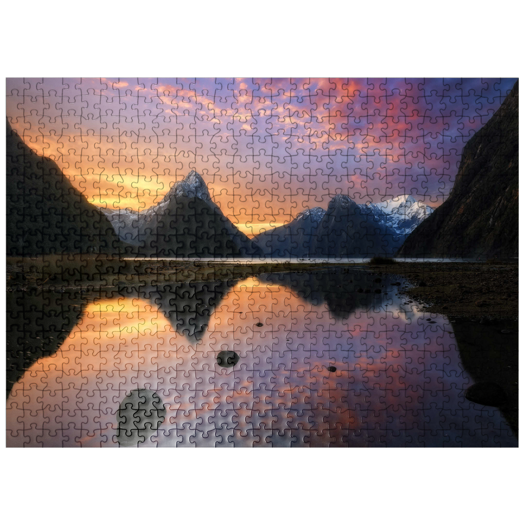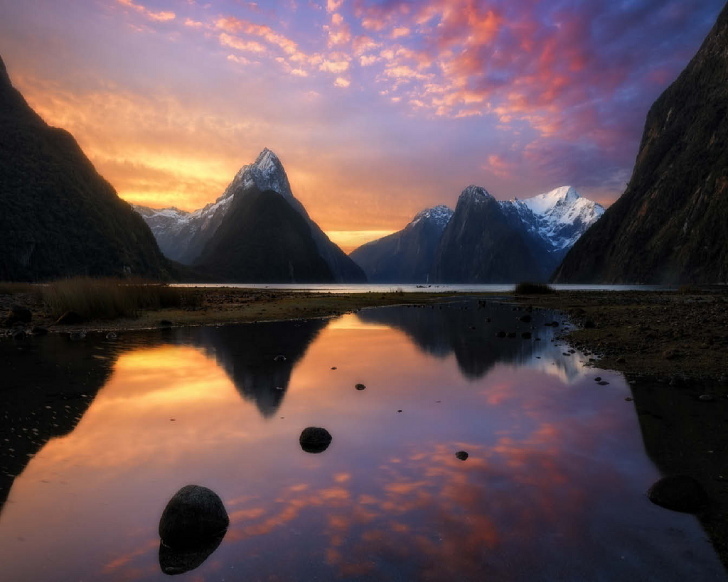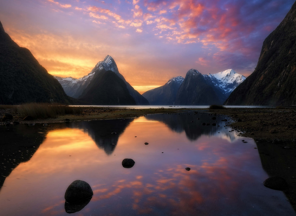 Milford Sound, located in Fiordland National Park, New Zealand, is renowned for its dramatic cliffs, serene waters, and snow-capped peaks. As the sun sets, the sky lights up with vibrant hues of orange, pink, and purple, reflecting on the tranquil surface below. Mitre Peak, one of the most iconic landmarks of the region, rises sharply, creating a stunning silhouette. The reflective fjord waters add a sense of symmetry to the landscape, making it a paradise for nature lovers and photographers.