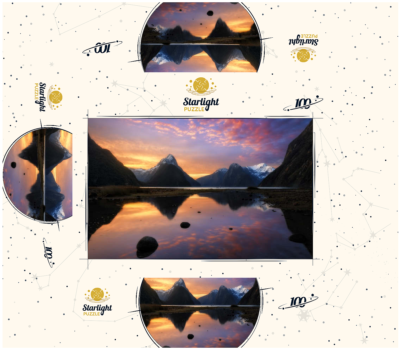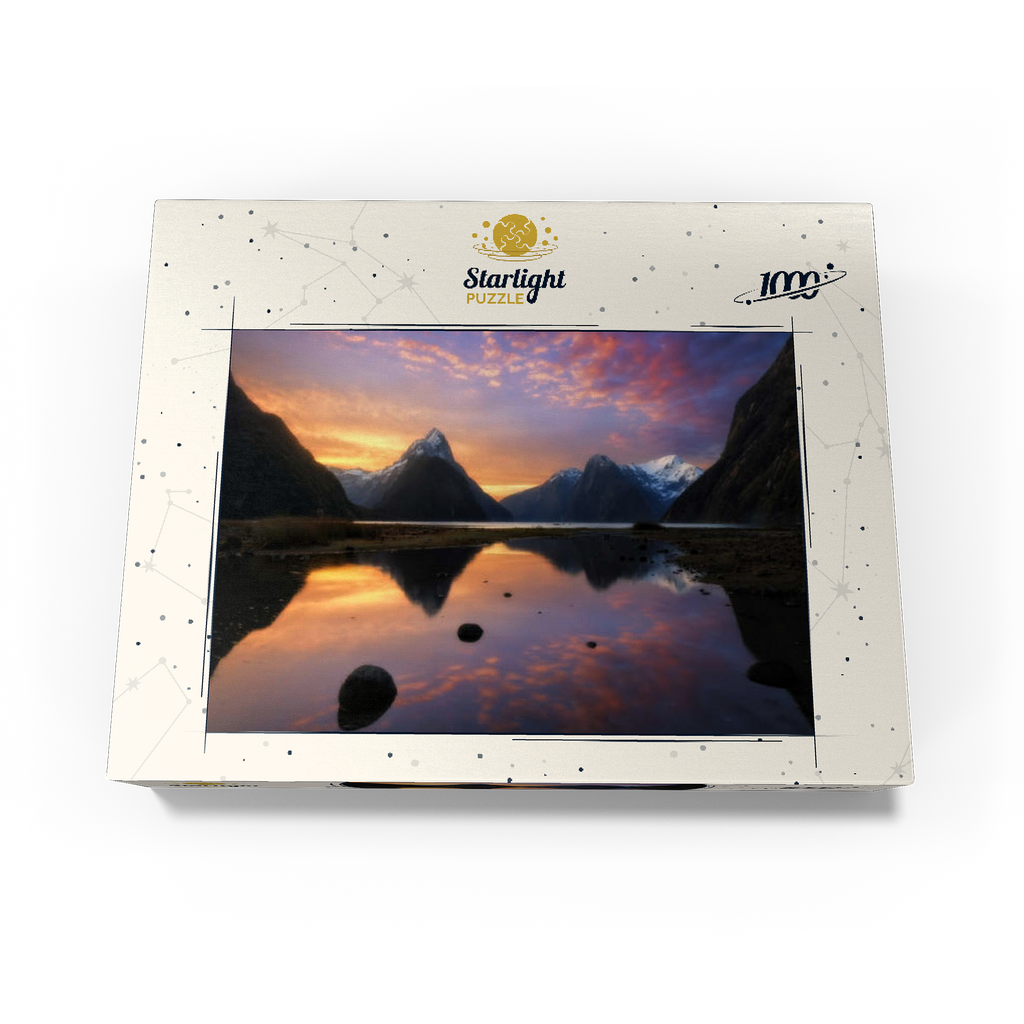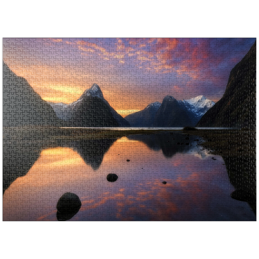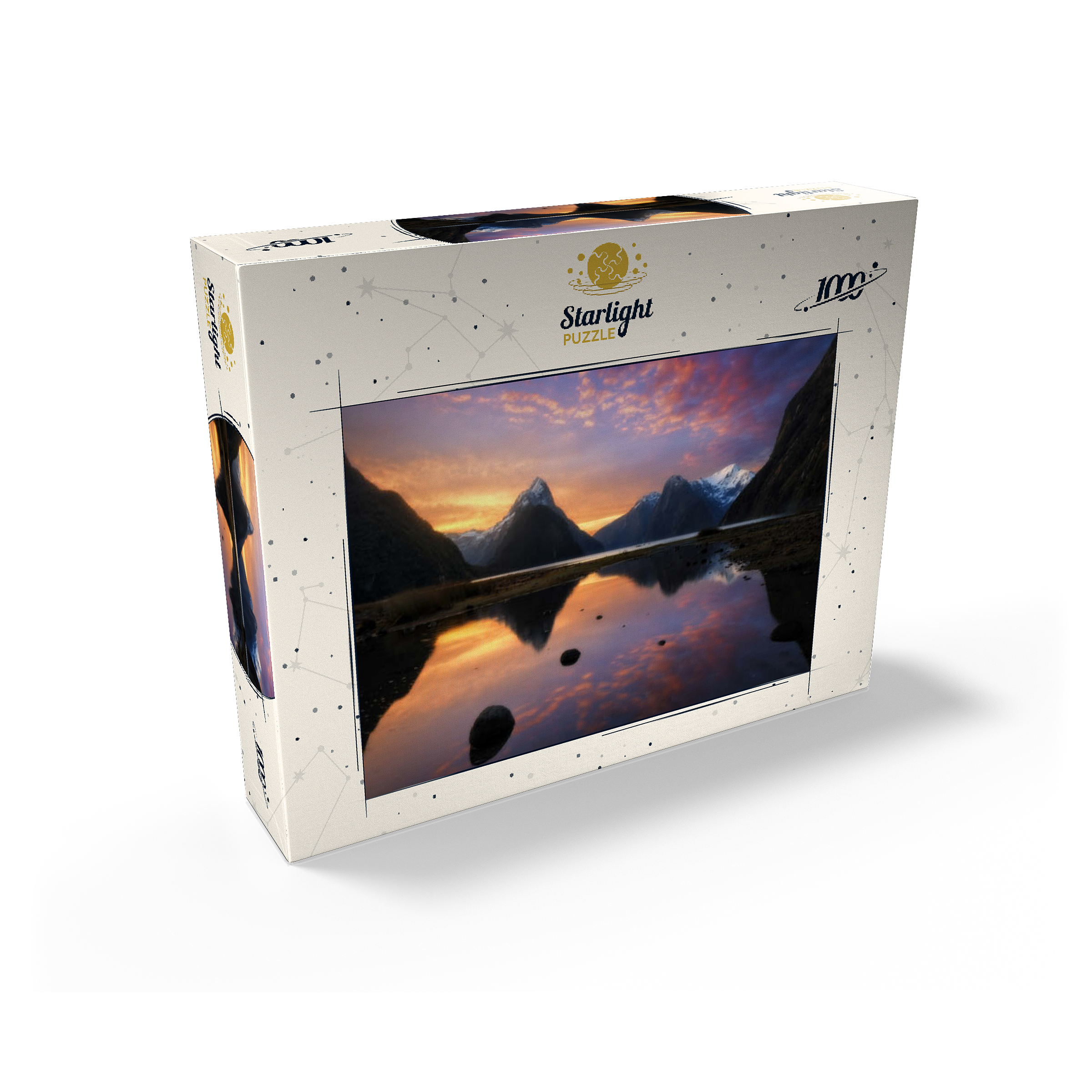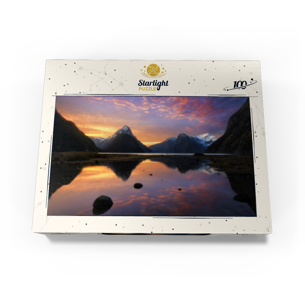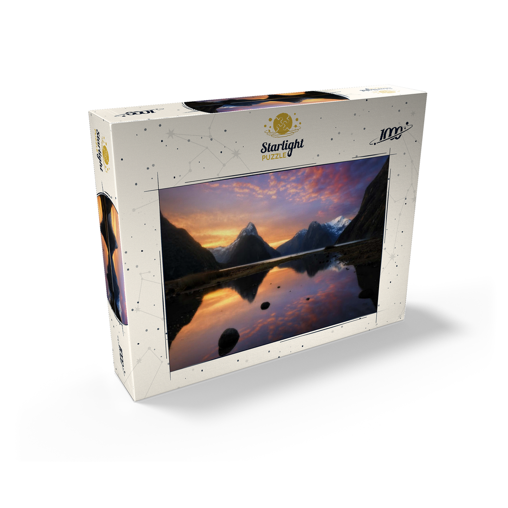 Milford Sound, located in Fiordland National Park, New Zealand, is renowned for its dramatic cliffs, serene waters, and snow-capped peaks. As the sun sets, the sky lights up with vibrant hues of orange, pink, and purple, reflecting on the tranquil surface below. Mitre Peak, one of the most iconic landmarks of the region, rises sharply, creating a stunning silhouette. The reflective fjord waters add a sense of symmetry to the landscape, making it a paradise for nature lovers and photographers.
