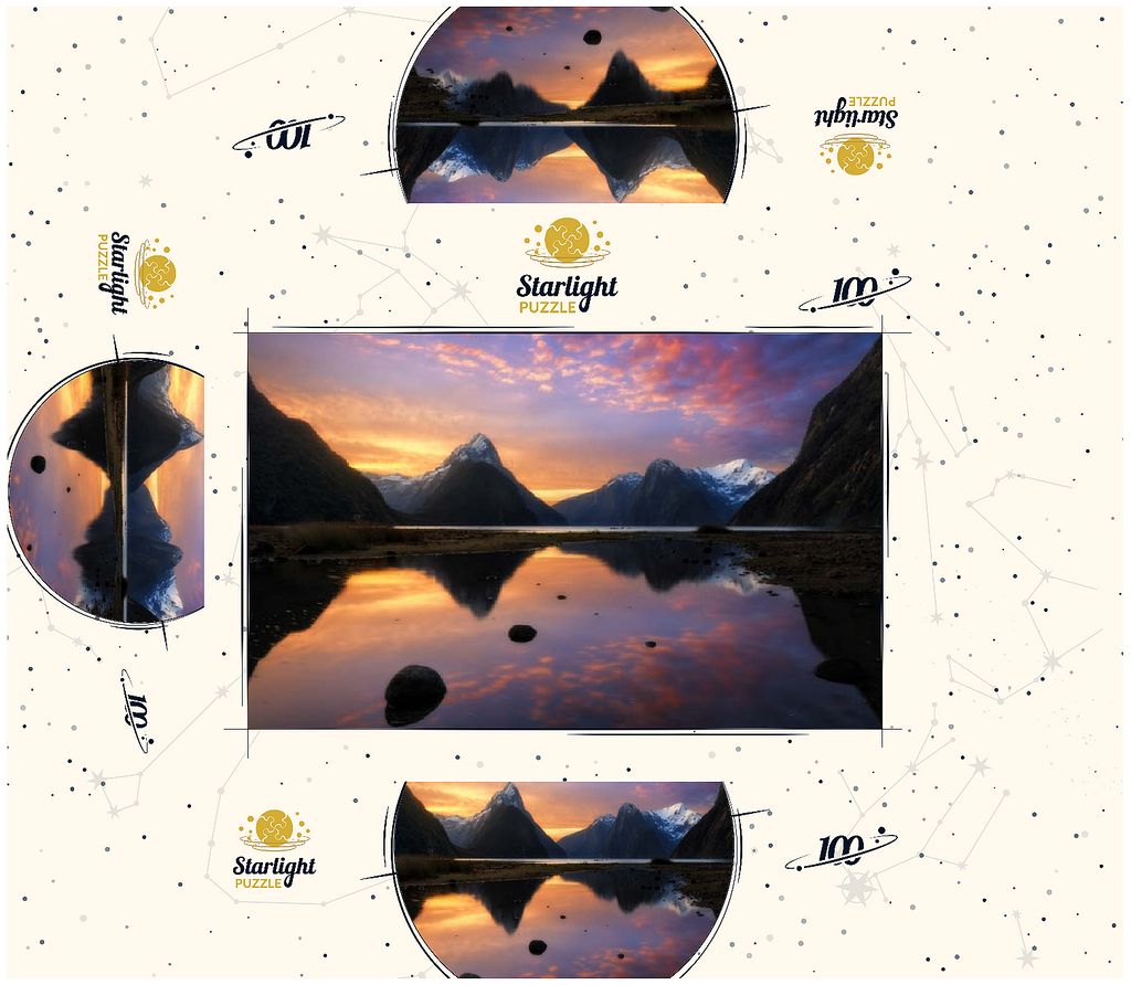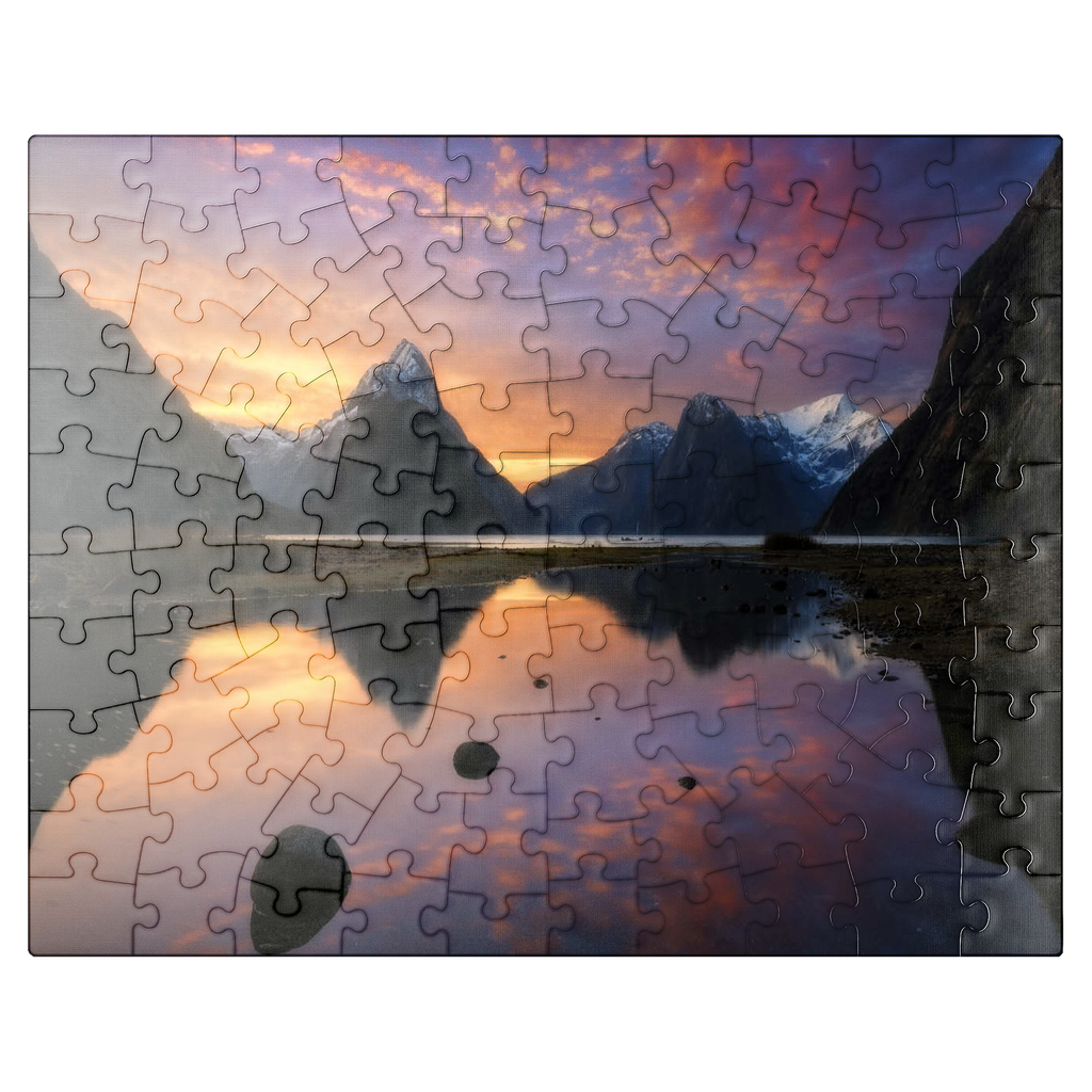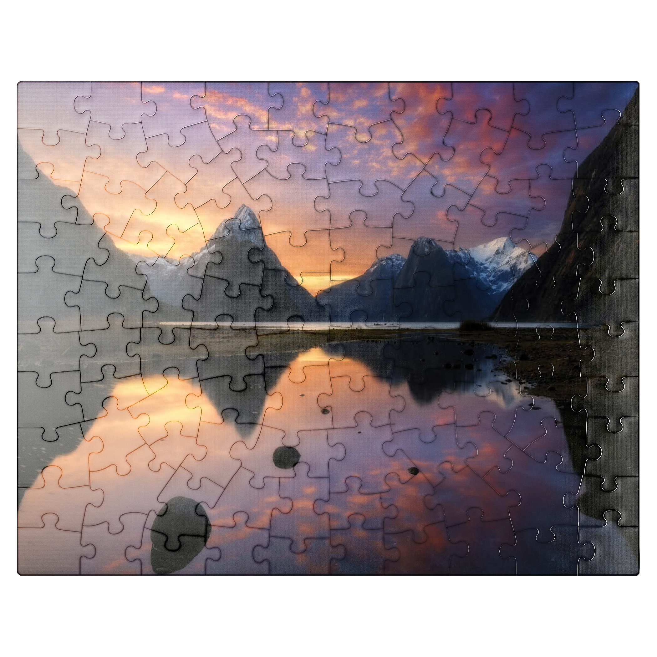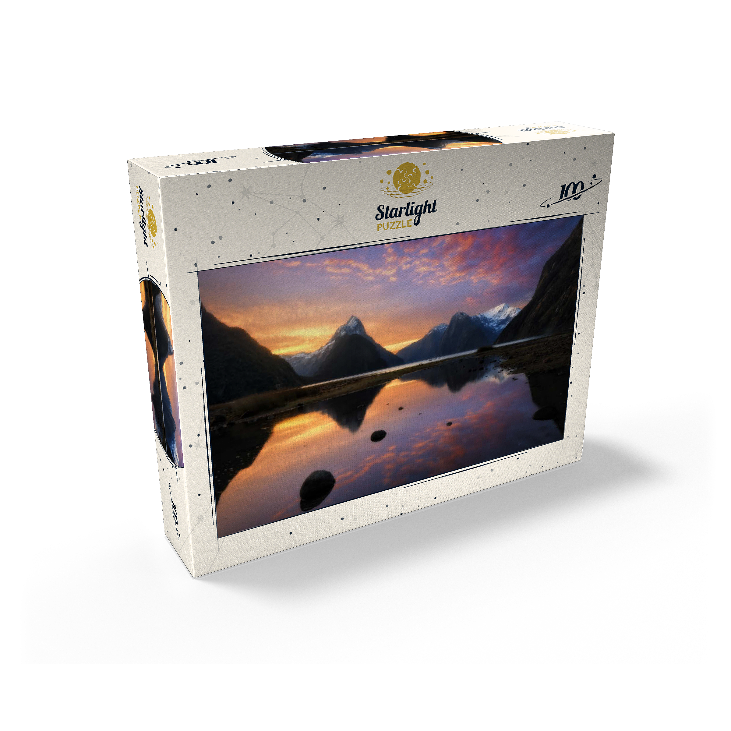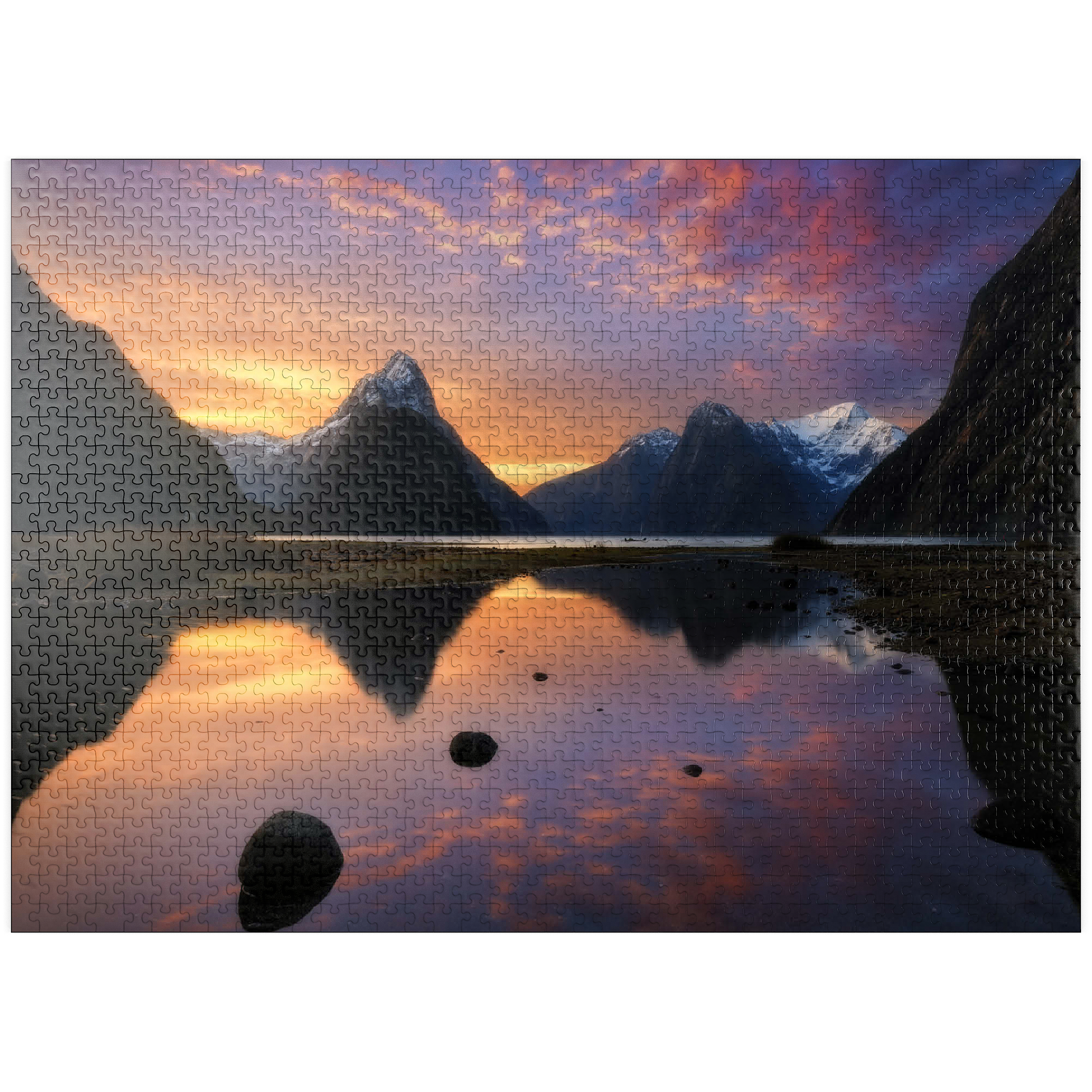 Milford Sound, located in Fiordland National Park, New Zealand, is renowned for its dramatic cliffs, serene waters, and snow-capped peaks. As the sun sets, the sky lights up with vibrant hues of orange, pink, and purple, reflecting on the tranquil surface below. Mitre Peak, one of the most iconic landmarks of the region, rises sharply, creating a stunning silhouette. The reflective fjord waters add a sense of symmetry to the landscape, making it a paradise for nature lovers and photographers.