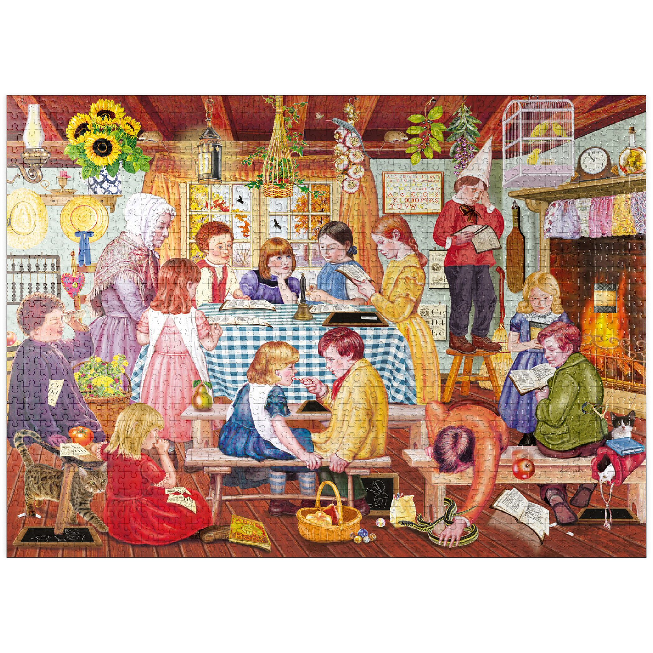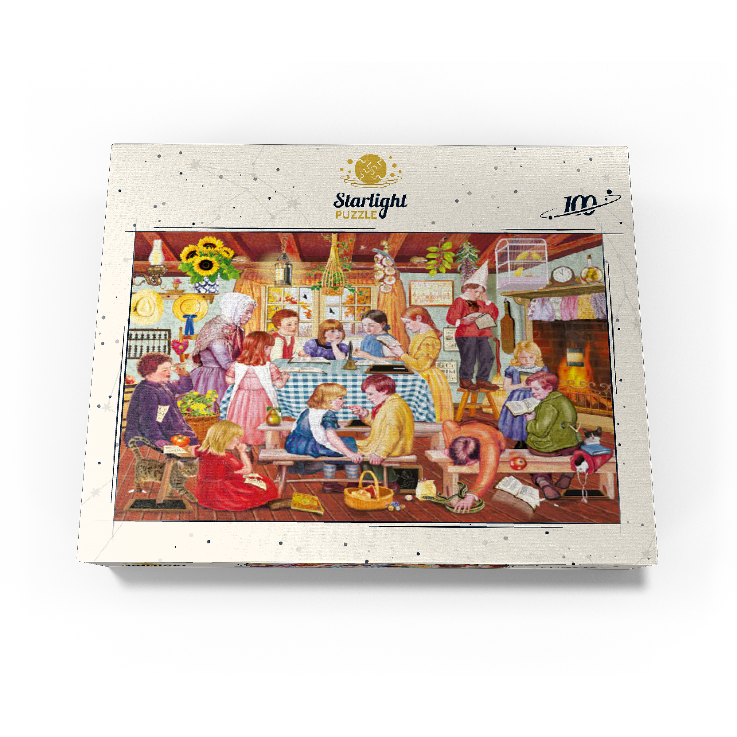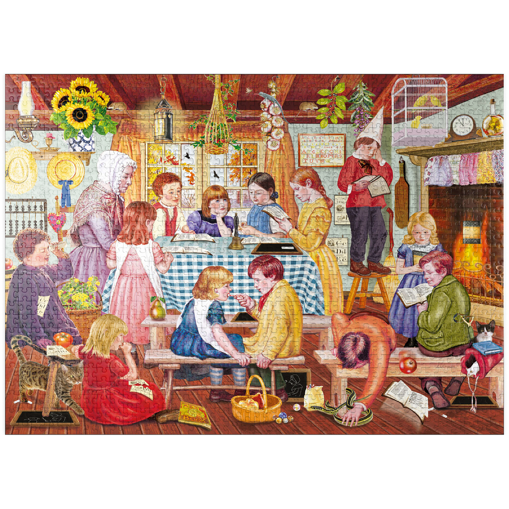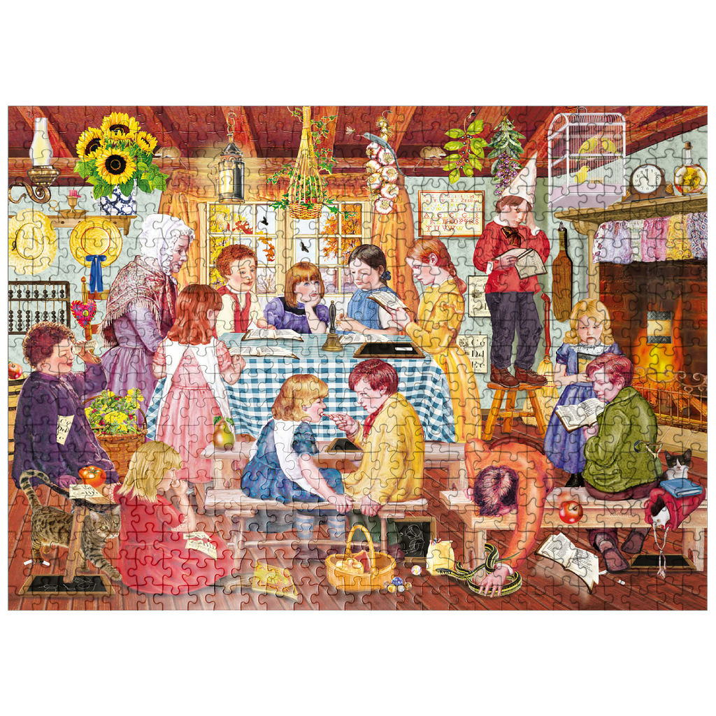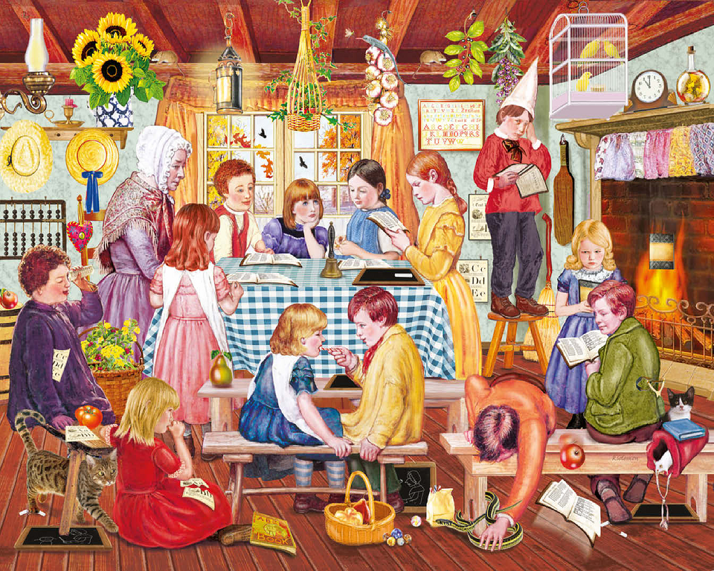 A charming scene of a traditional one-room schoolhouse filled with children engaged in various activities. Some students read aloud, others practice writing on slates, and a few play mischievously while an attentive teacher oversees the lively group. The room is adorned with vintage educational materials, a cozy fireplace, and rustic decor, including hanging herbs and sunflowers. This nostalgic image captures the warmth and simplicity of early classroom life, filled with curiosity and childhood energy.