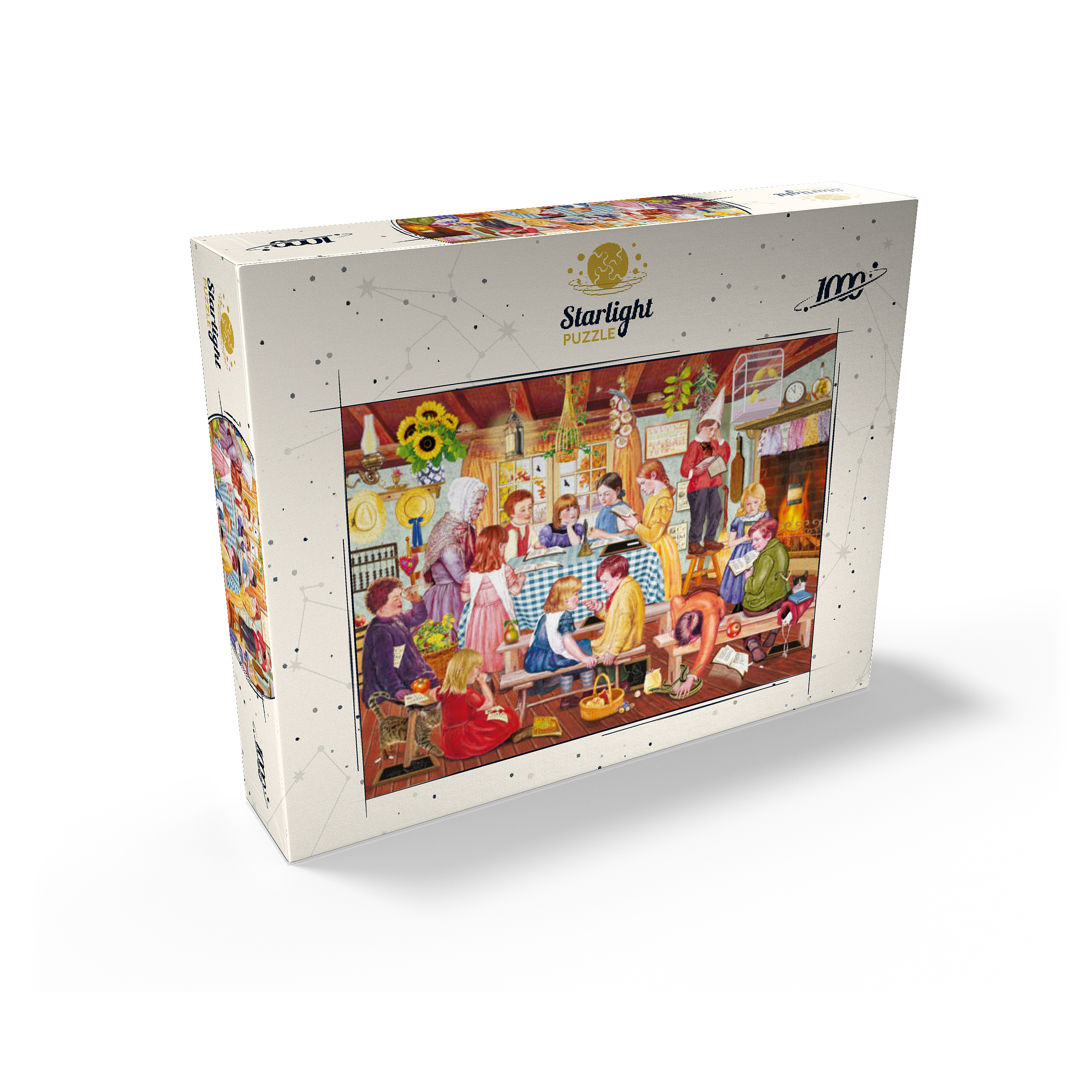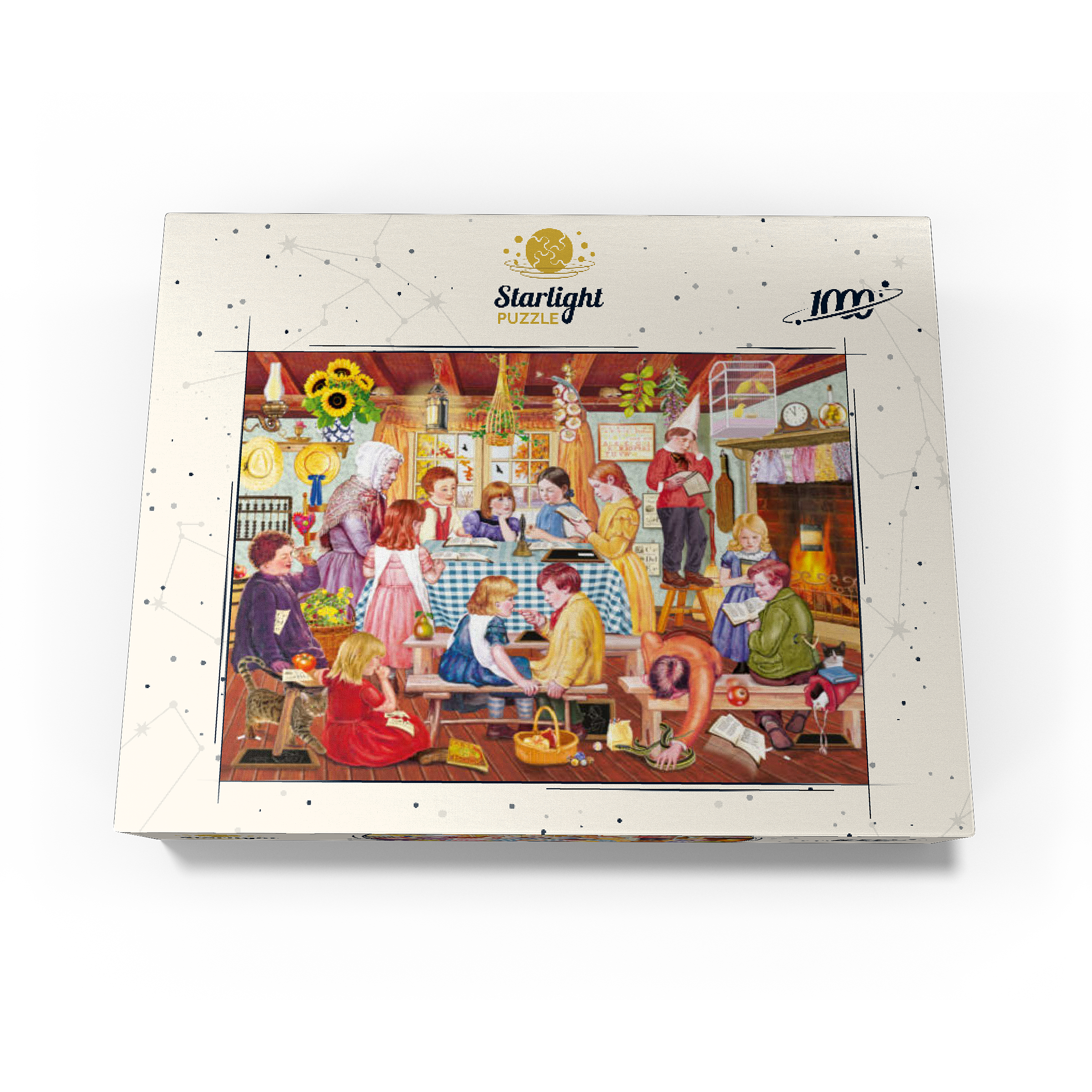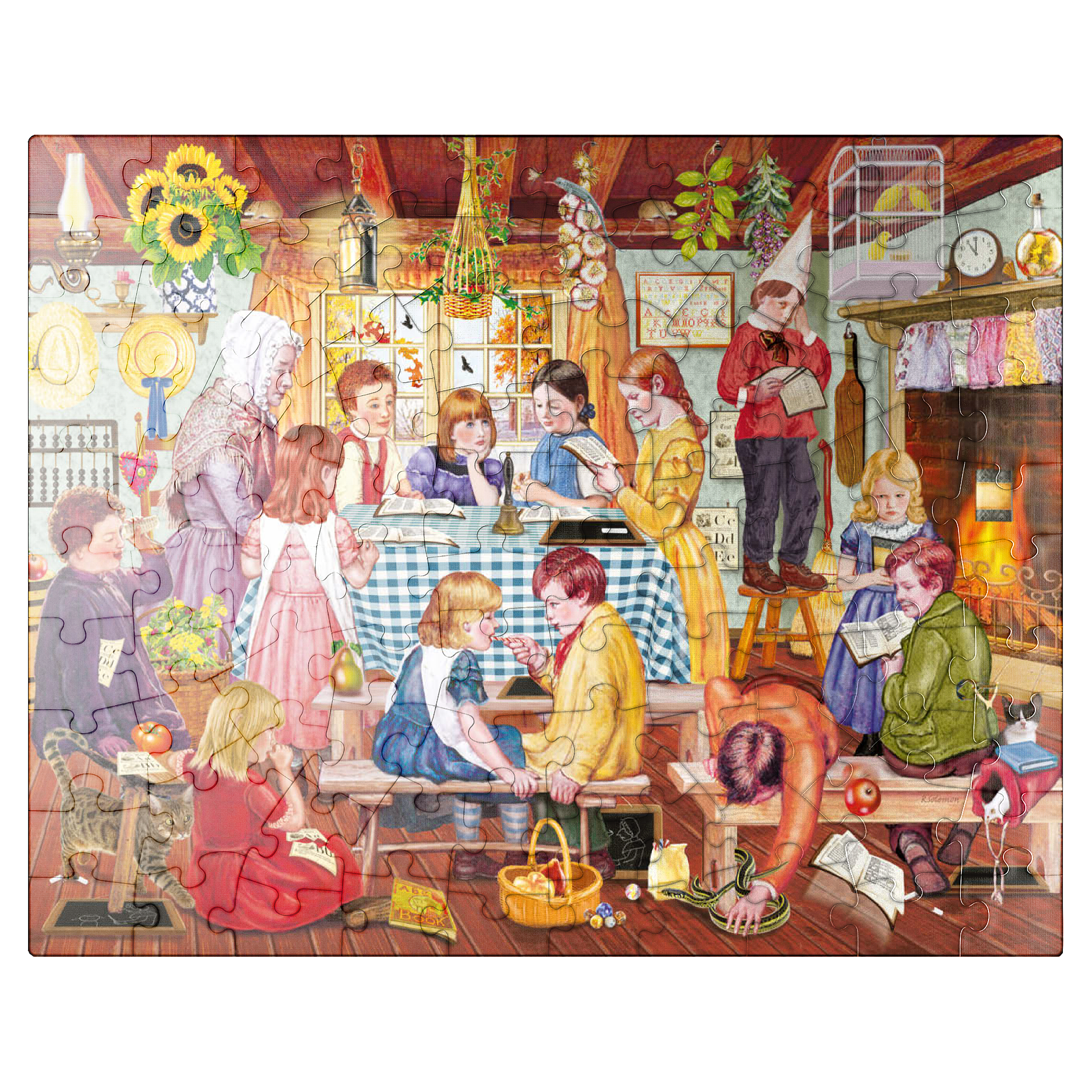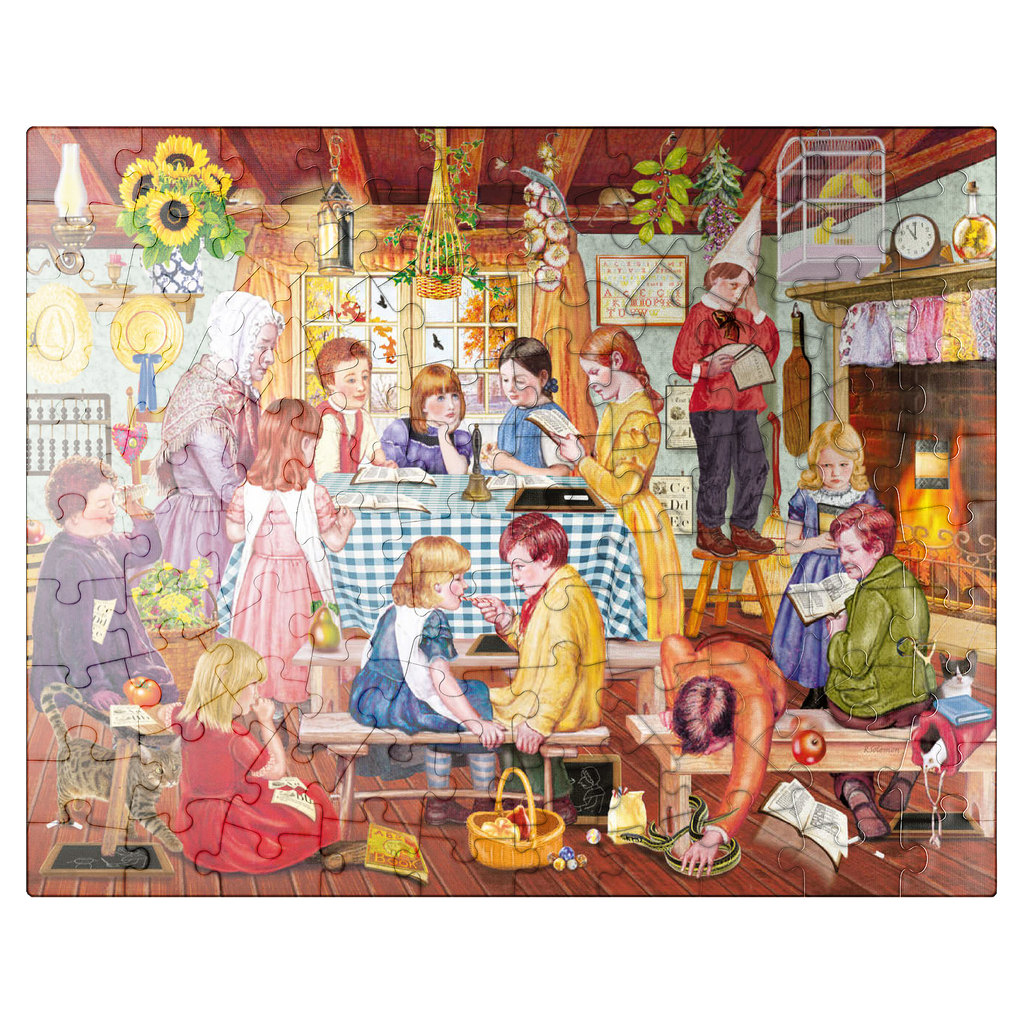 A charming scene of a traditional one-room schoolhouse filled with children engaged in various activities. Some students read aloud, others practice writing on slates, and a few play mischievously while an attentive teacher oversees the lively group. The room is adorned with vintage educational materials, a cozy fireplace, and rustic decor, including hanging herbs and sunflowers. This nostalgic image captures the warmth and simplicity of early classroom life, filled with curiosity and childhood energy.