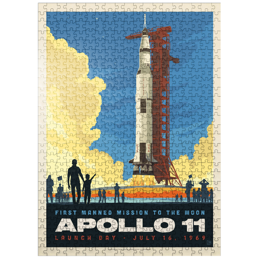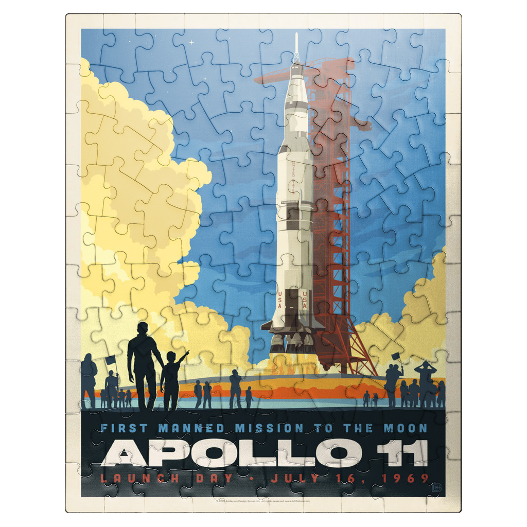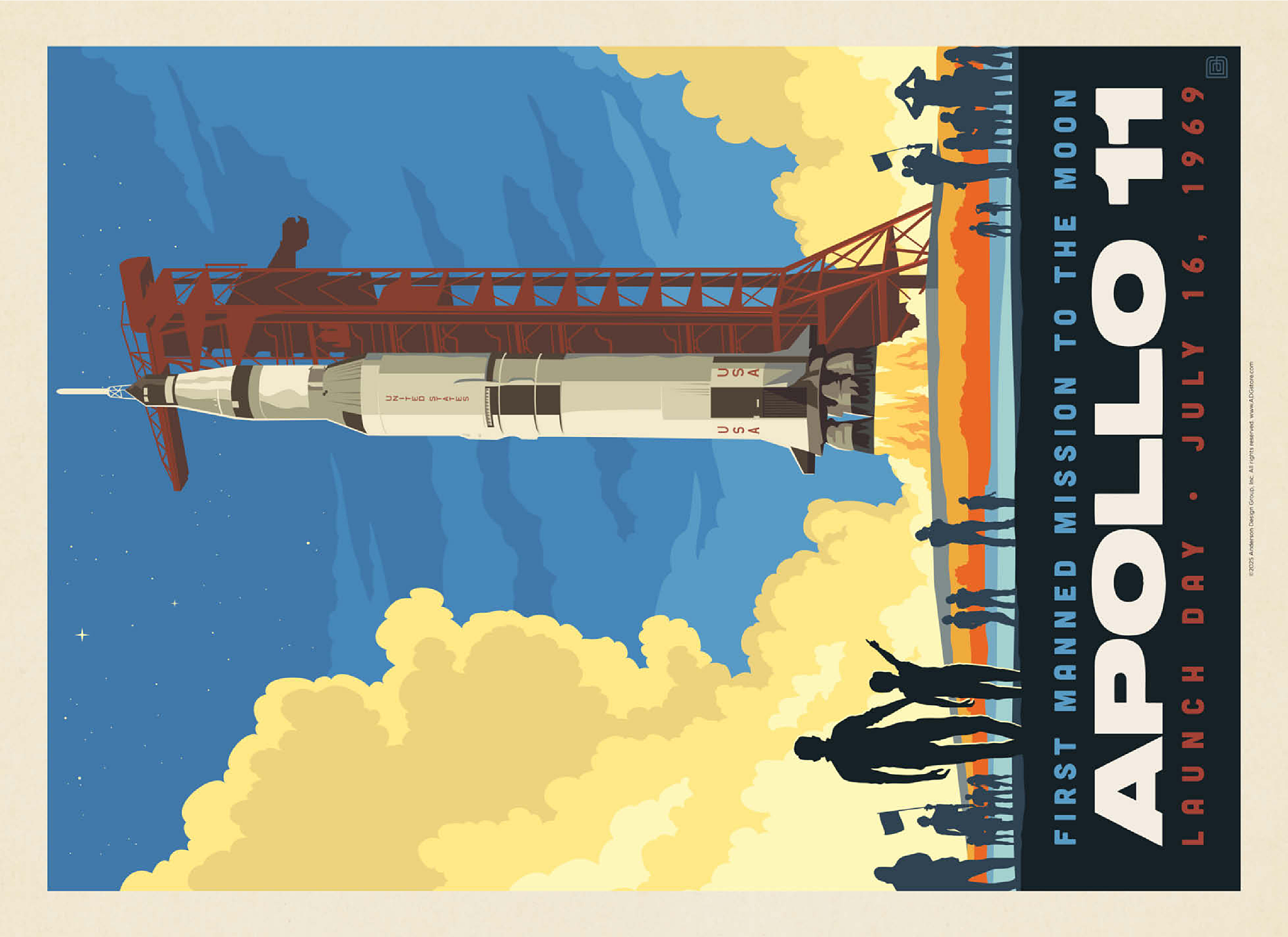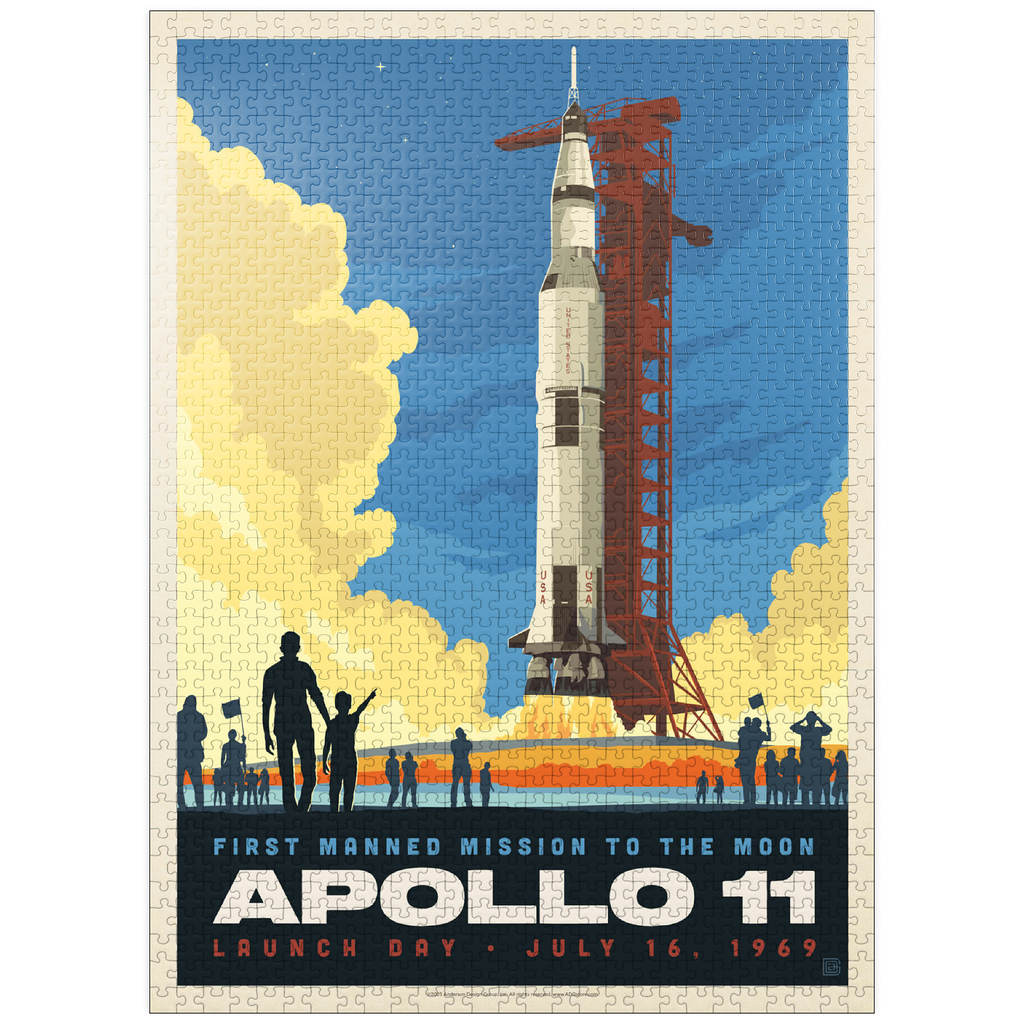 This vibrant retro-style depiction captures the historic launch of Apollo 11, the first manned mission to the moon, which took place on July 16, 1969, from Kennedy Space Center in Florida. The Saturn V rocket stands tall against a twilight sky, with dramatic clouds of smoke and flame marking liftoff as a crowd watches in awe. The bold, graphic style emphasizes the excitement and scale of NASA's monumental achievement in space exploration. Apollo 11 carried astronauts Neil Armstrong, Buzz Aldrin, and Michael Collins, forever changing human history with the first lunar landing. This artwork honors that iconic spaceflight in a dynamic and nostalgic visual.