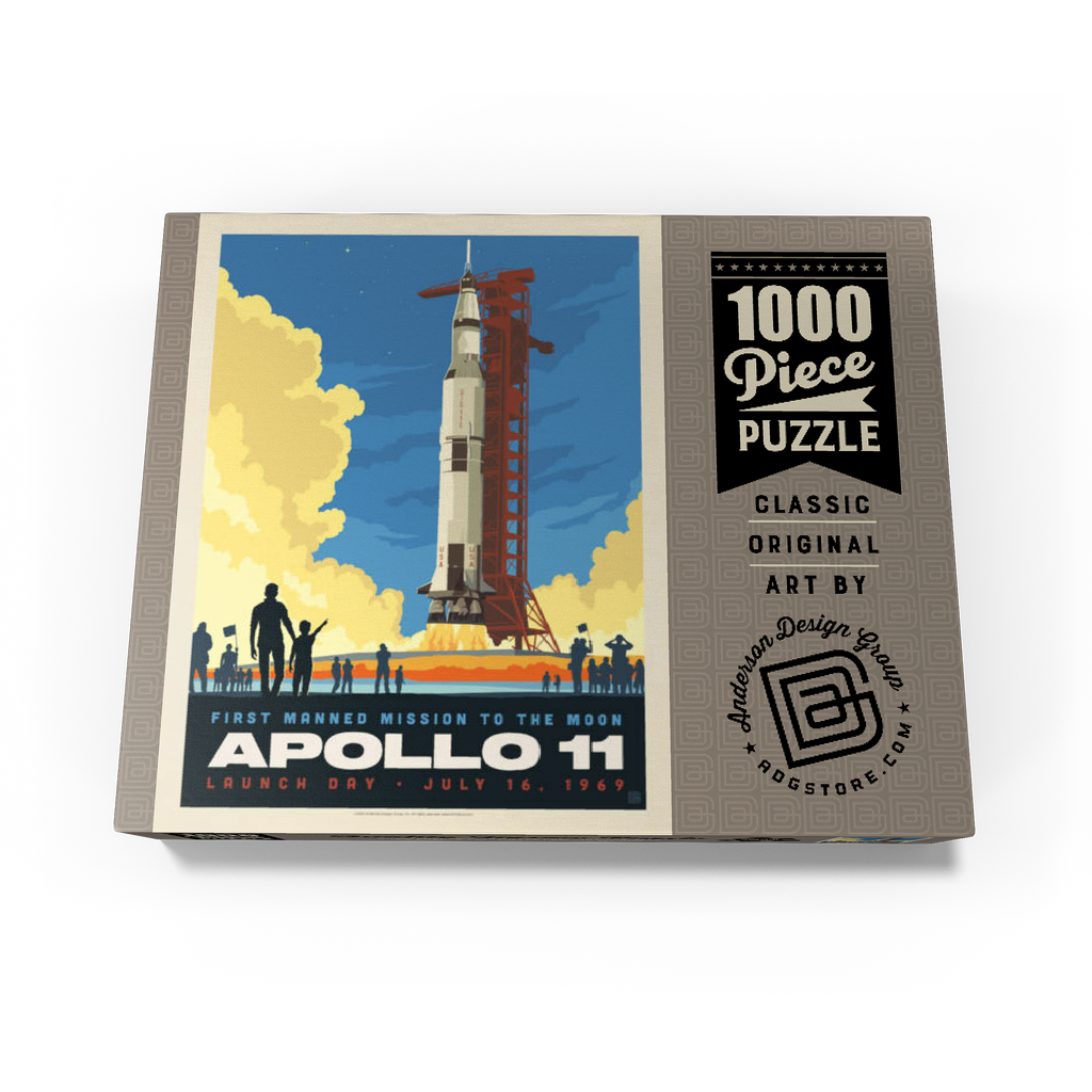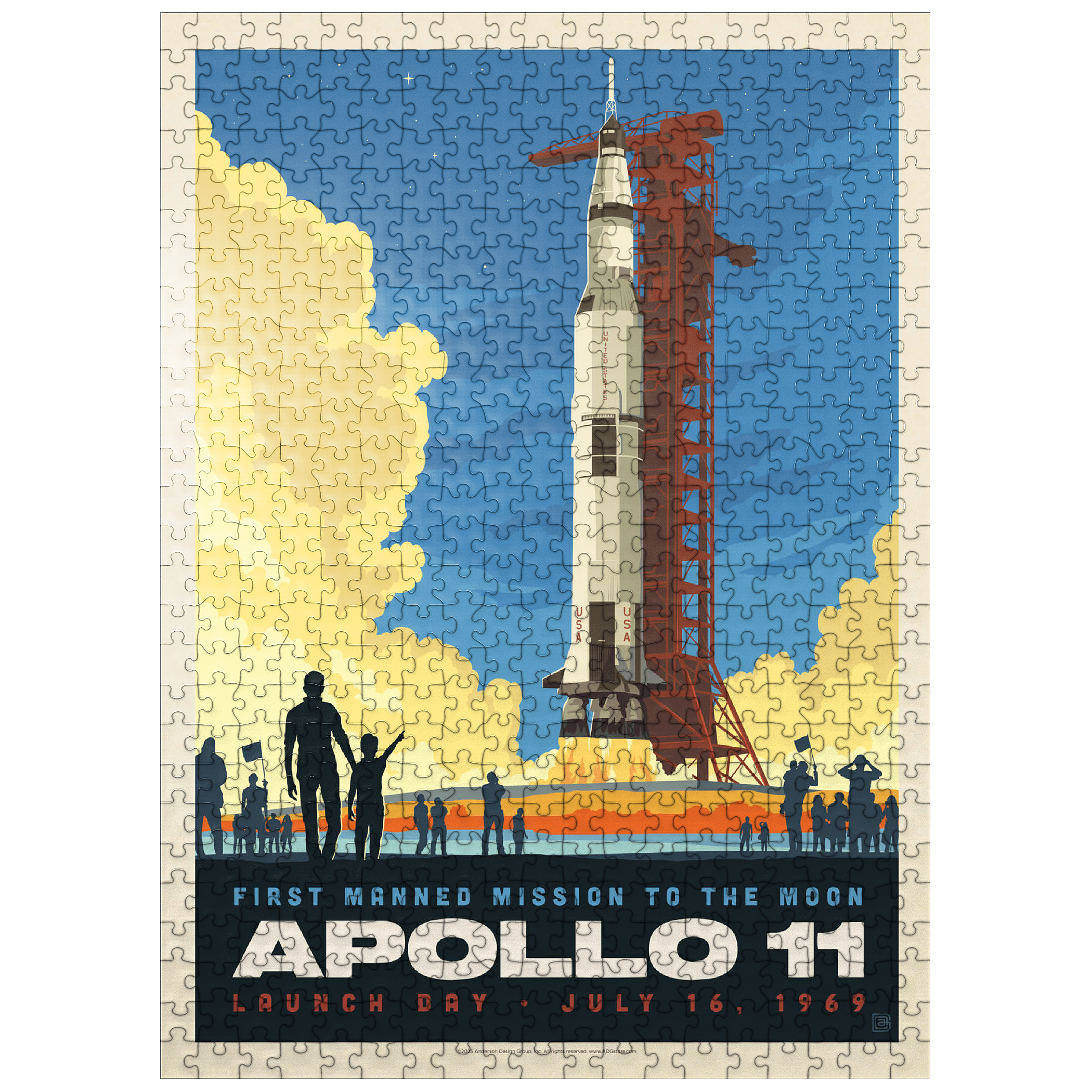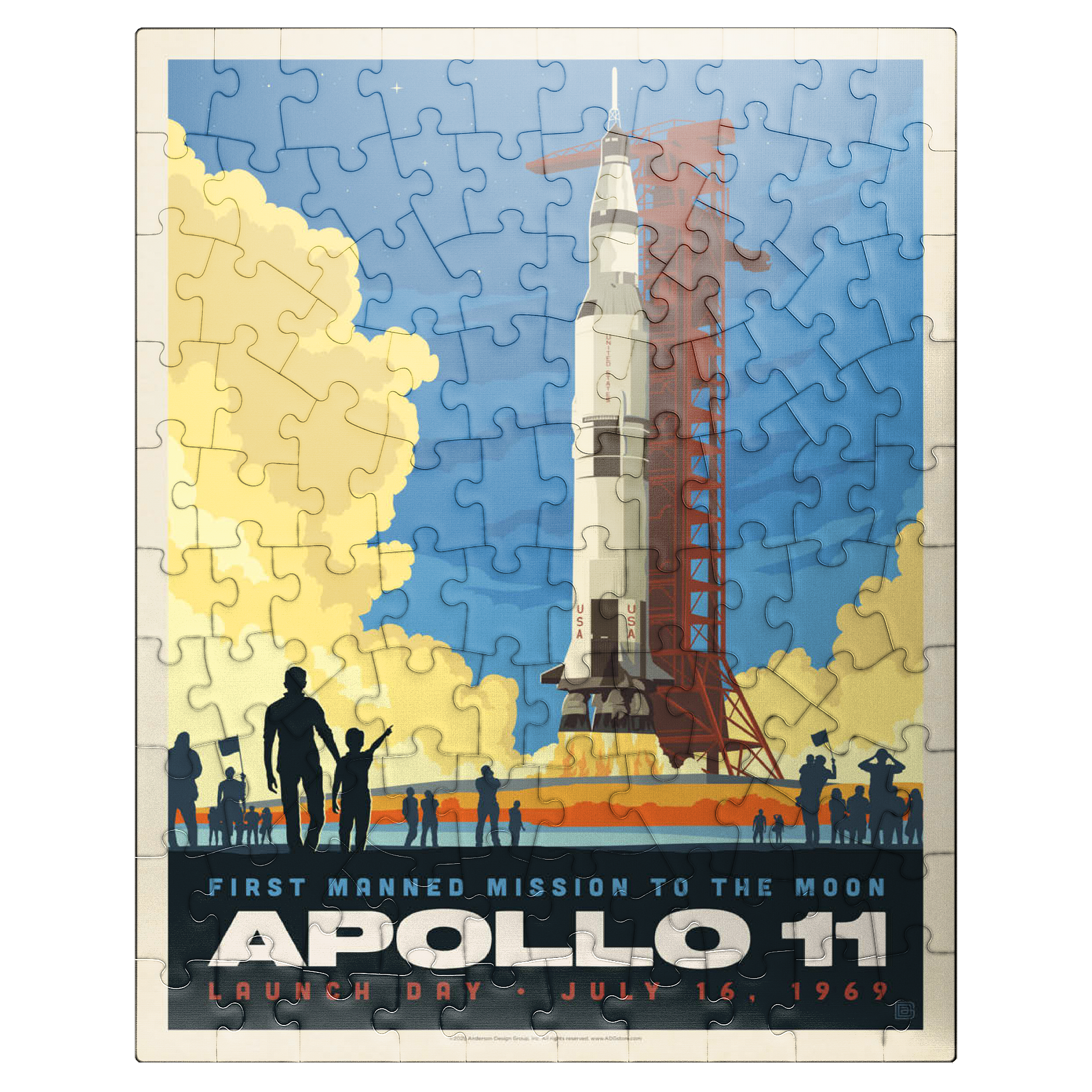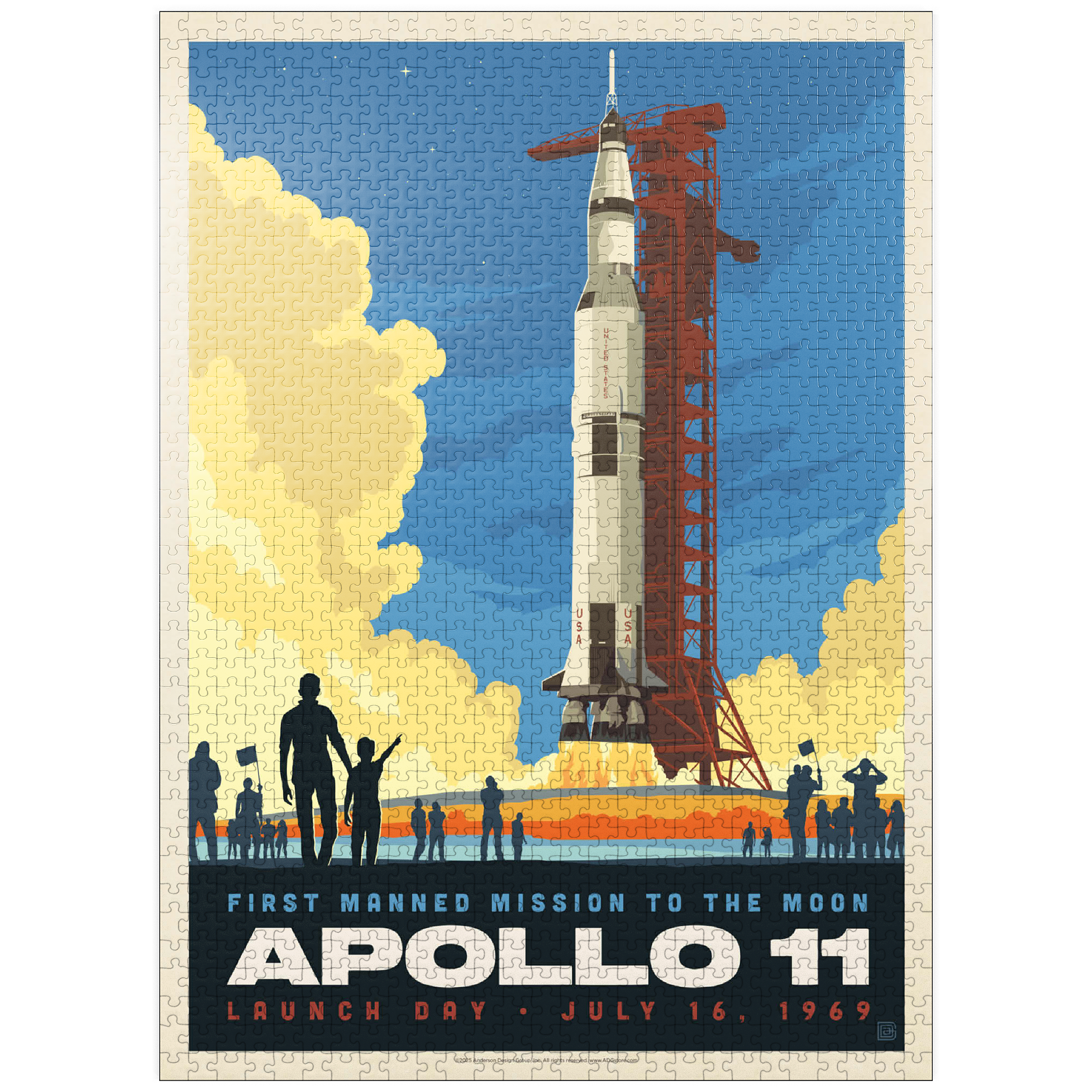 This vibrant retro-style depiction captures the historic launch of Apollo 11, the first manned mission to the moon, which took place on July 16, 1969, from Kennedy Space Center in Florida. The Saturn V rocket stands tall against a twilight sky, with dramatic clouds of smoke and flame marking liftoff as a crowd watches in awe. The bold, graphic style emphasizes the excitement and scale of NASA's monumental achievement in space exploration. Apollo 11 carried astronauts Neil Armstrong, Buzz Aldrin, and Michael Collins, forever changing human history with the first lunar landing. This artwork honors that iconic spaceflight in a dynamic and nostalgic visual.