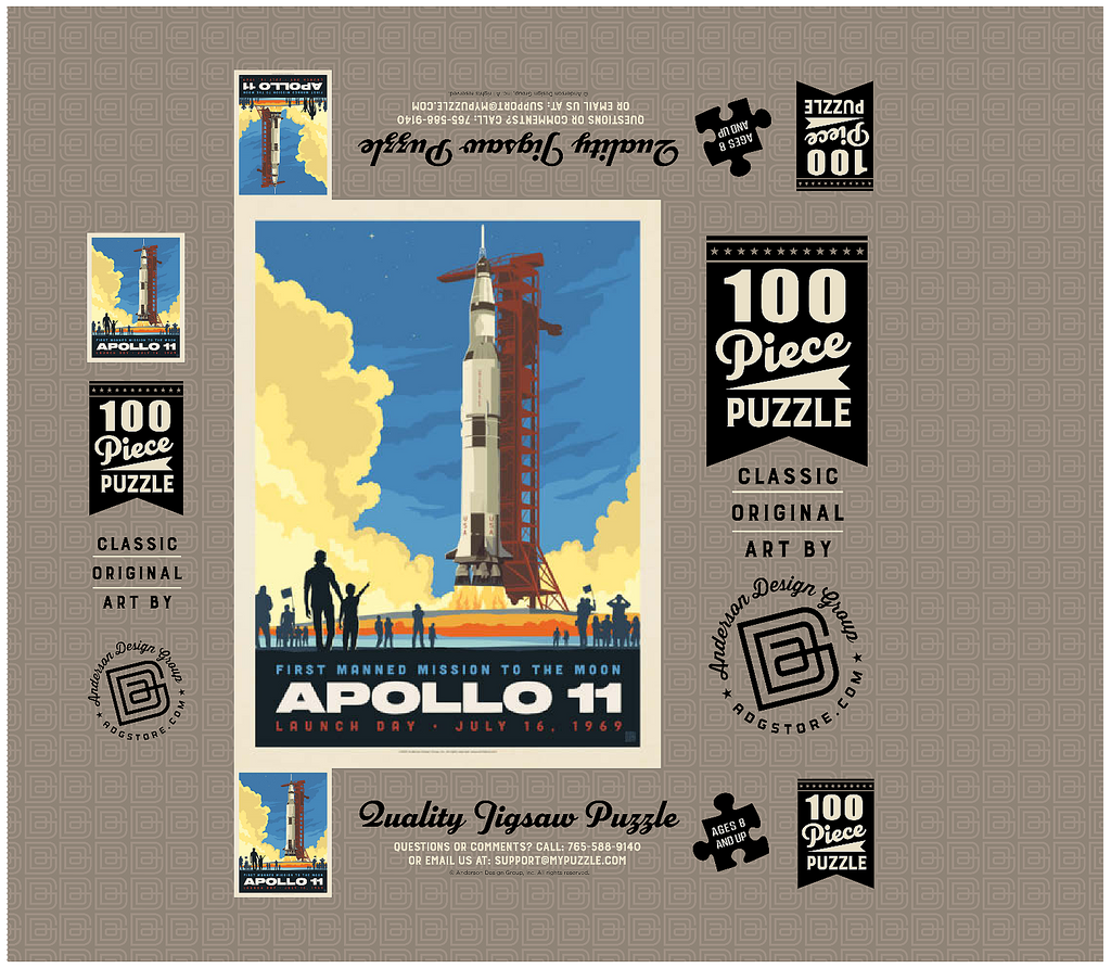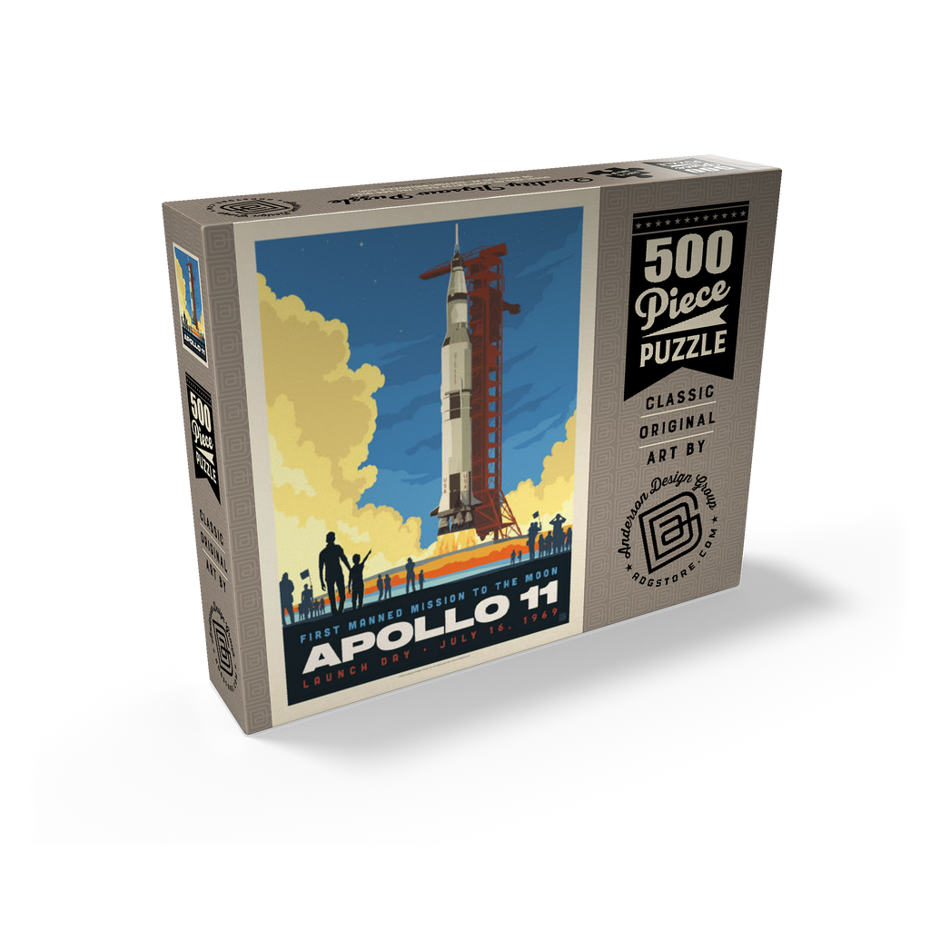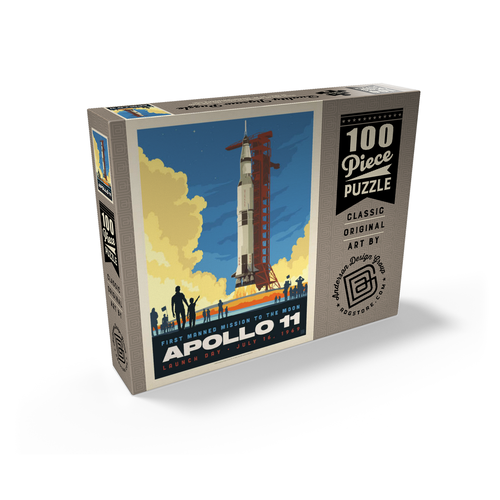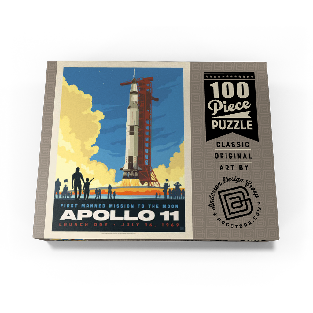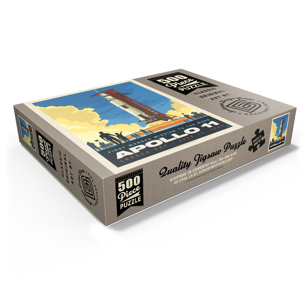 This vibrant retro-style depiction captures the historic launch of Apollo 11, the first manned mission to the moon, which took place on July 16, 1969, from Kennedy Space Center in Florida. The Saturn V rocket stands tall against a twilight sky, with dramatic clouds of smoke and flame marking liftoff as a crowd watches in awe. The bold, graphic style emphasizes the excitement and scale of NASA's monumental achievement in space exploration. Apollo 11 carried astronauts Neil Armstrong, Buzz Aldrin, and Michael Collins, forever changing human history with the first lunar landing. This artwork honors that iconic spaceflight in a dynamic and nostalgic visual.