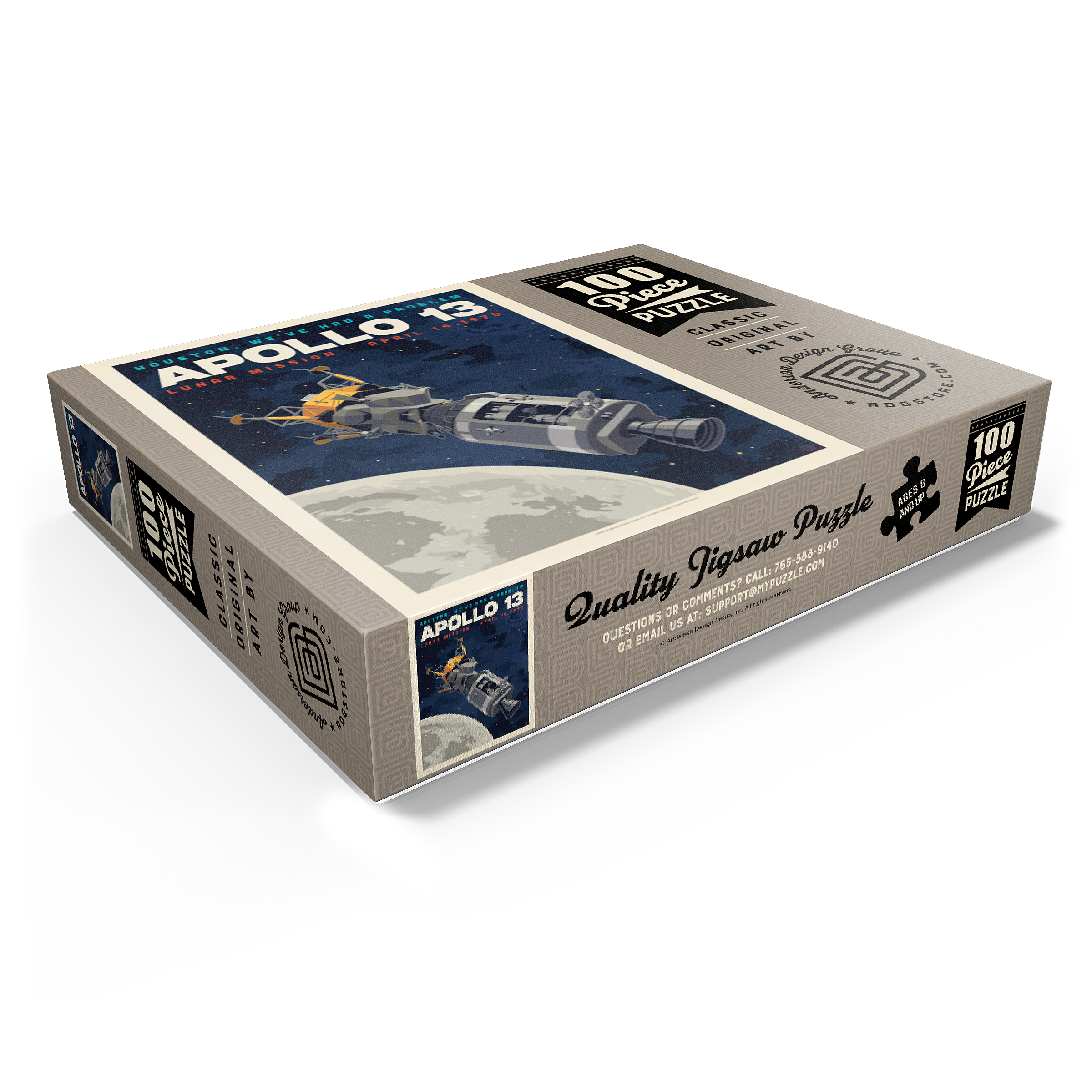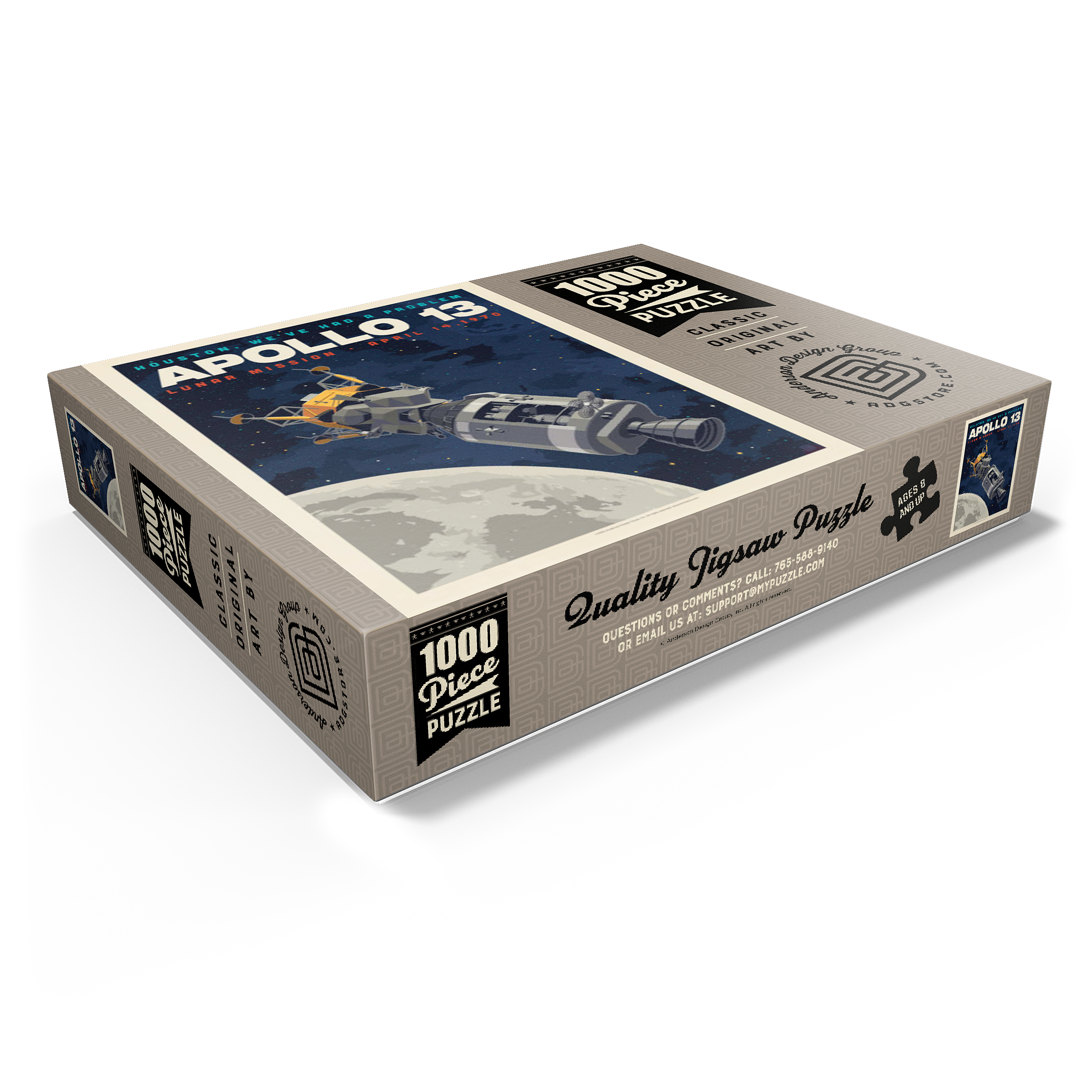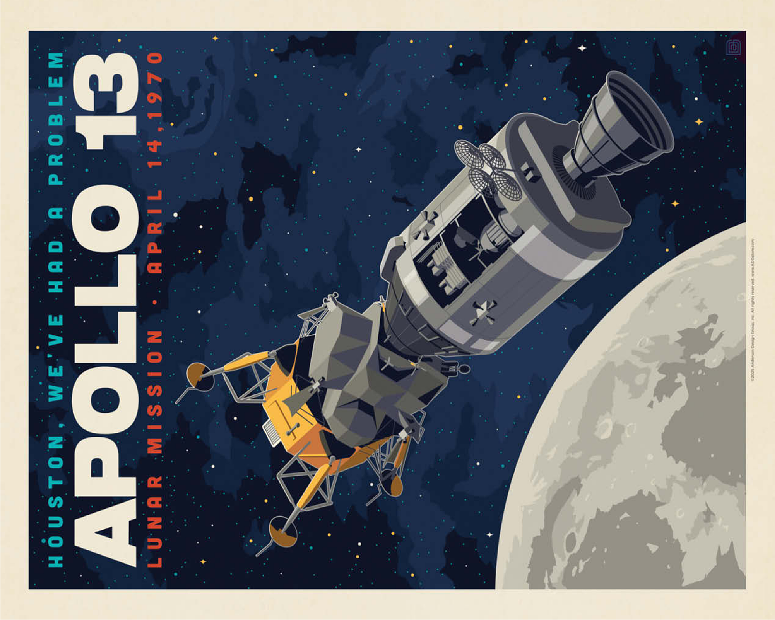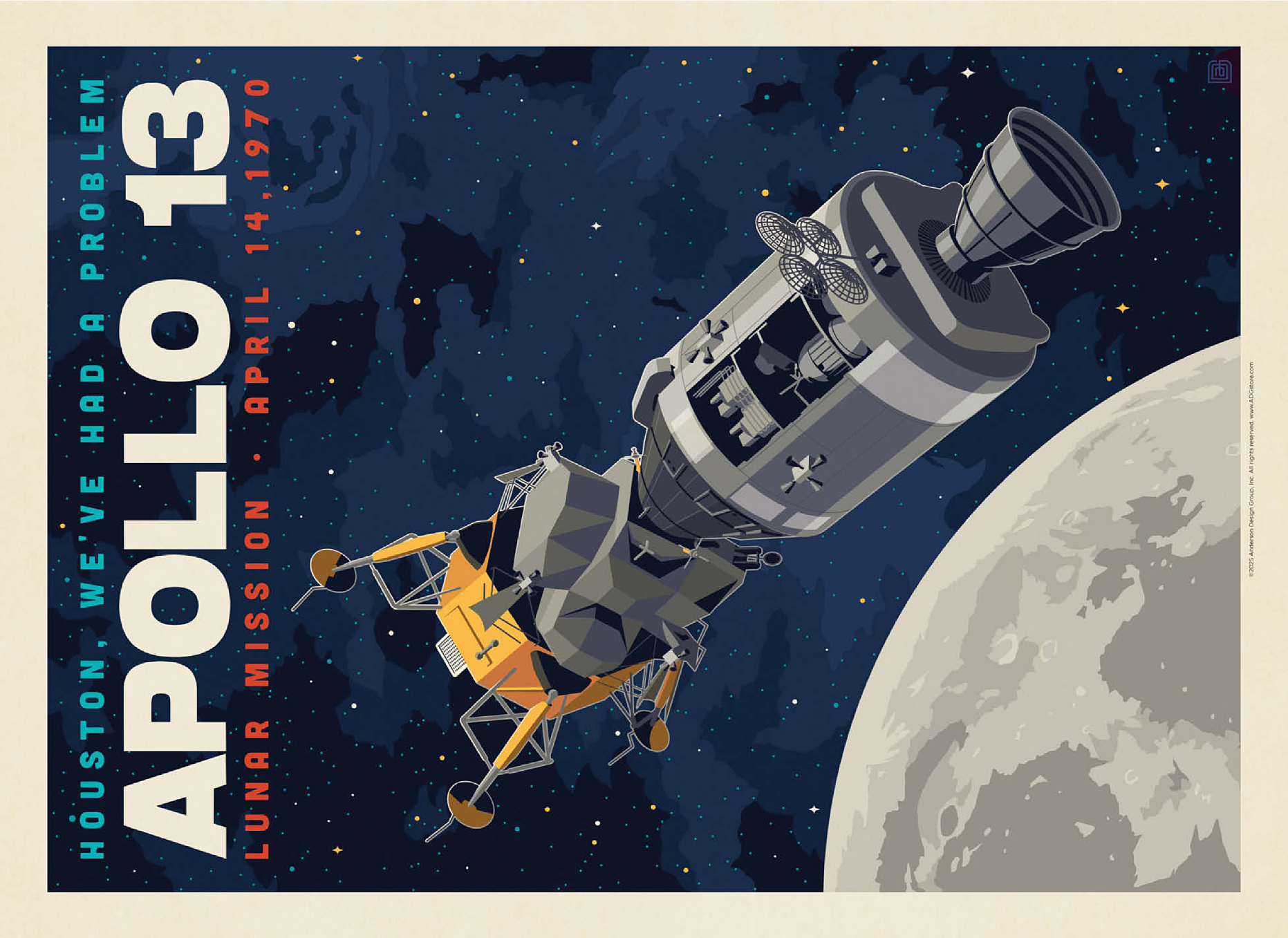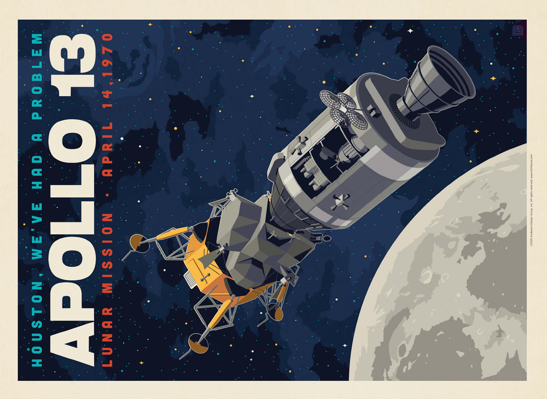 This stylized artwork captures the Apollo 13 spacecraft in lunar orbit during its fateful mission on April 14, 1970. Known for the phrase "Houston, we've had a problem," Apollo 13 was NASA's third intended moon landing but became a dramatic rescue mission after an oxygen tank explosion. The image highlights the lunar module and command-service module drifting near the moon's surface, set against a backdrop of deep space filled with stars. With its retro aesthetic and technical detail, this scene commemorates one of NASA's most heroic efforts in space history, reflecting innovation, teamwork, and survival in the face of adversity.
