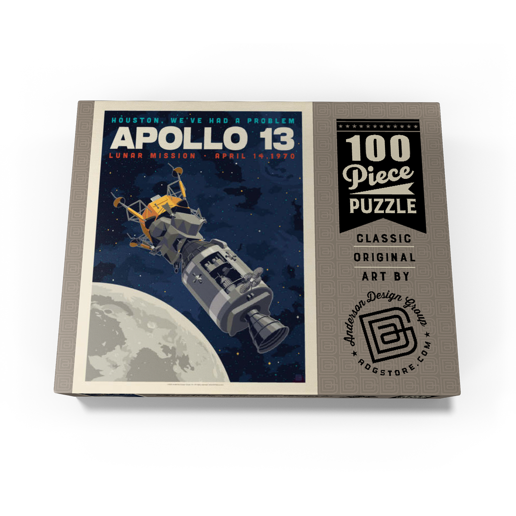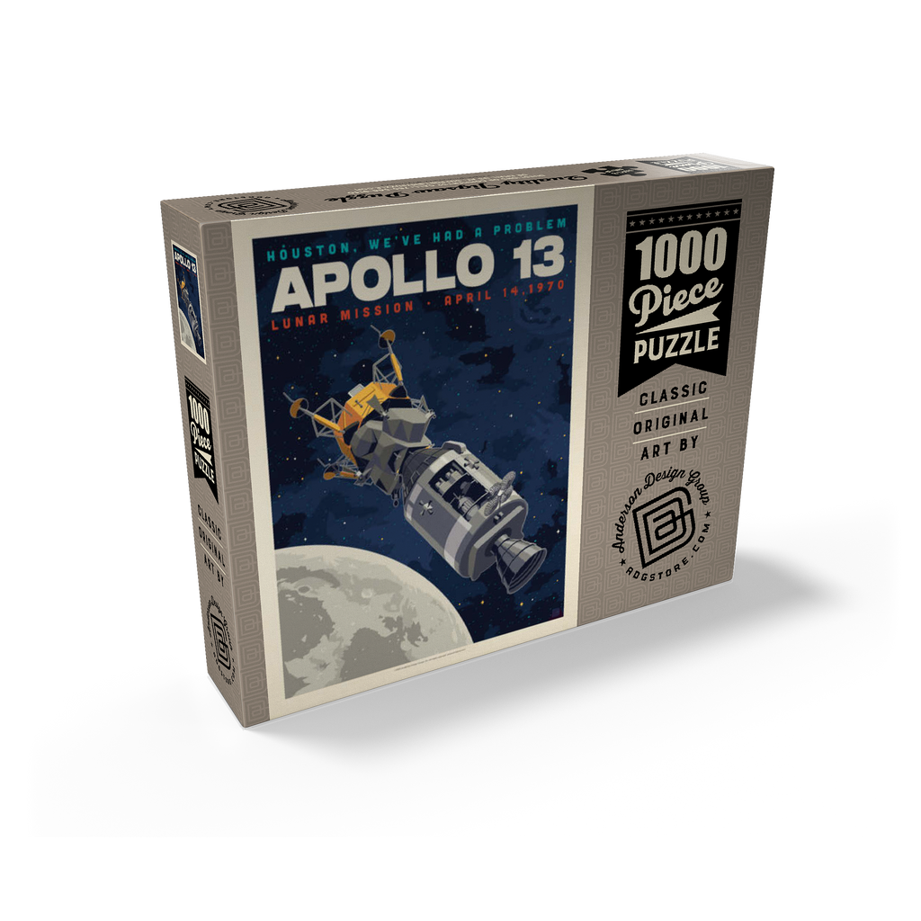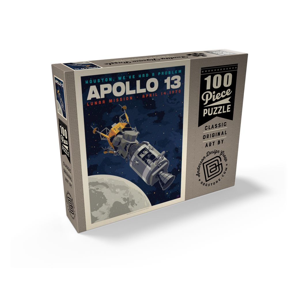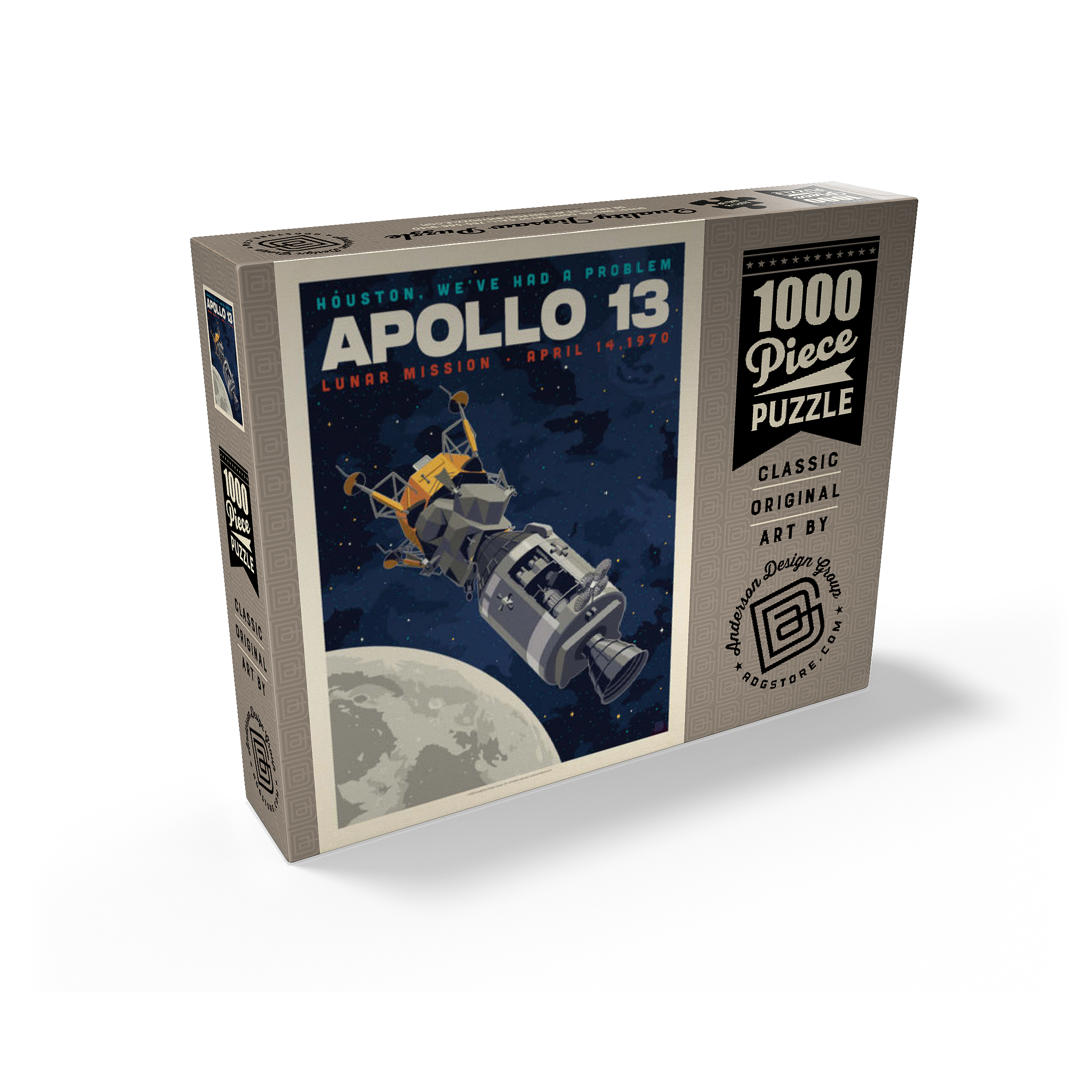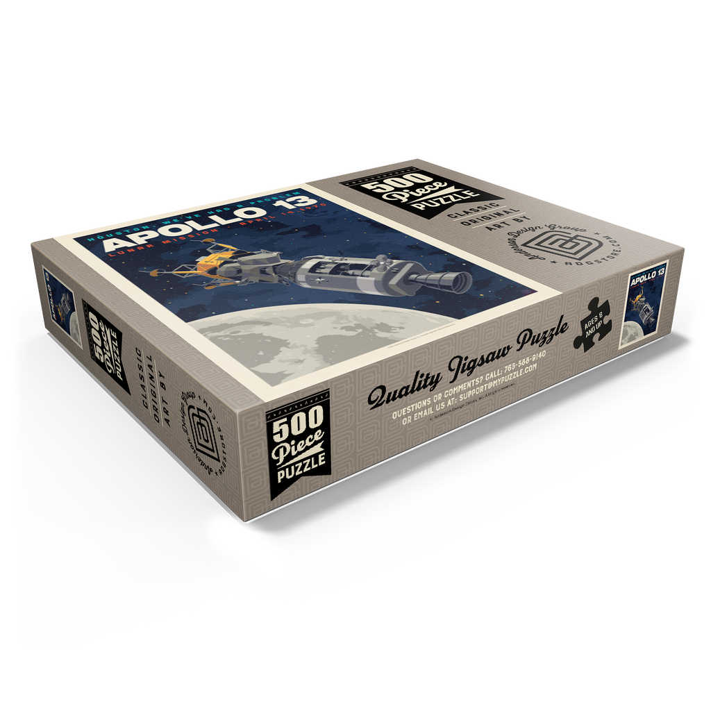 This stylized artwork captures the Apollo 13 spacecraft in lunar orbit during its fateful mission on April 14, 1970. Known for the phrase "Houston, we've had a problem," Apollo 13 was NASA's third intended moon landing but became a dramatic rescue mission after an oxygen tank explosion. The image highlights the lunar module and command-service module drifting near the moon's surface, set against a backdrop of deep space filled with stars. With its retro aesthetic and technical detail, this scene commemorates one of NASA's most heroic efforts in space history, reflecting innovation, teamwork, and survival in the face of adversity.