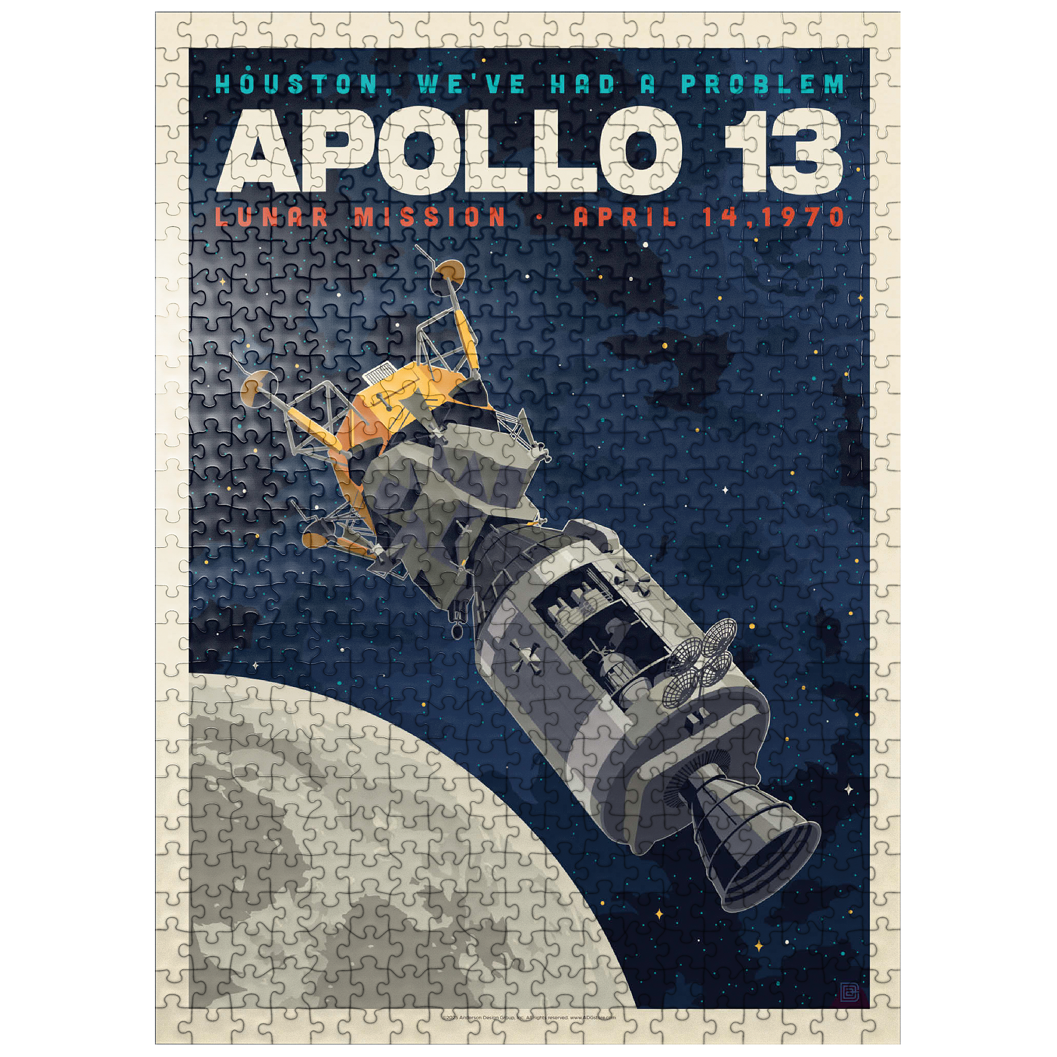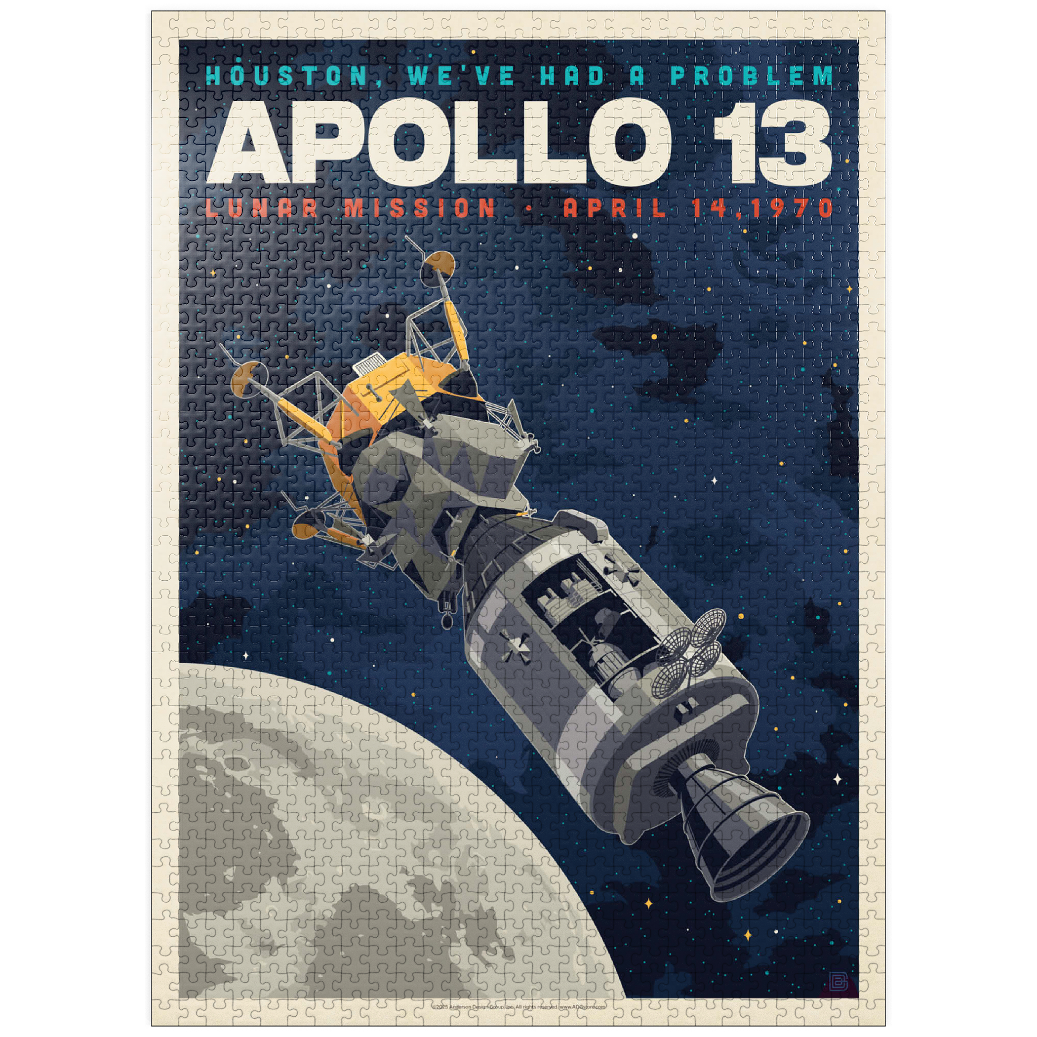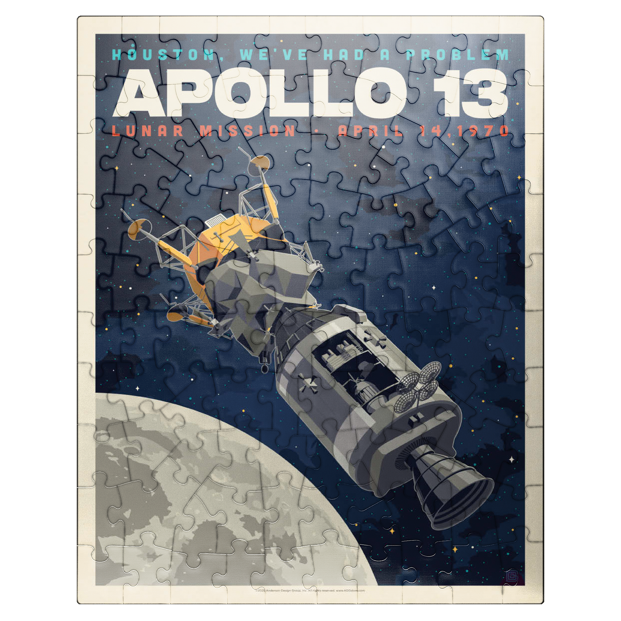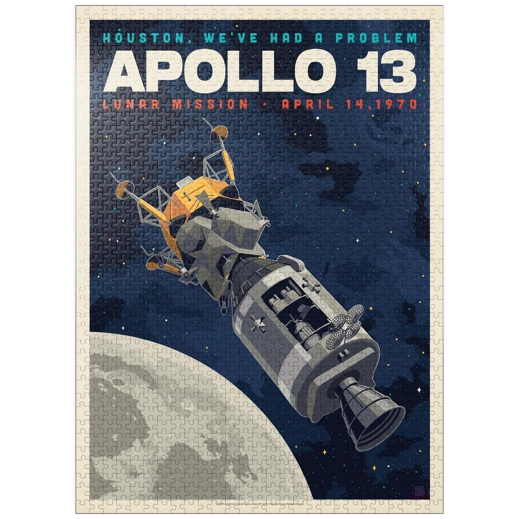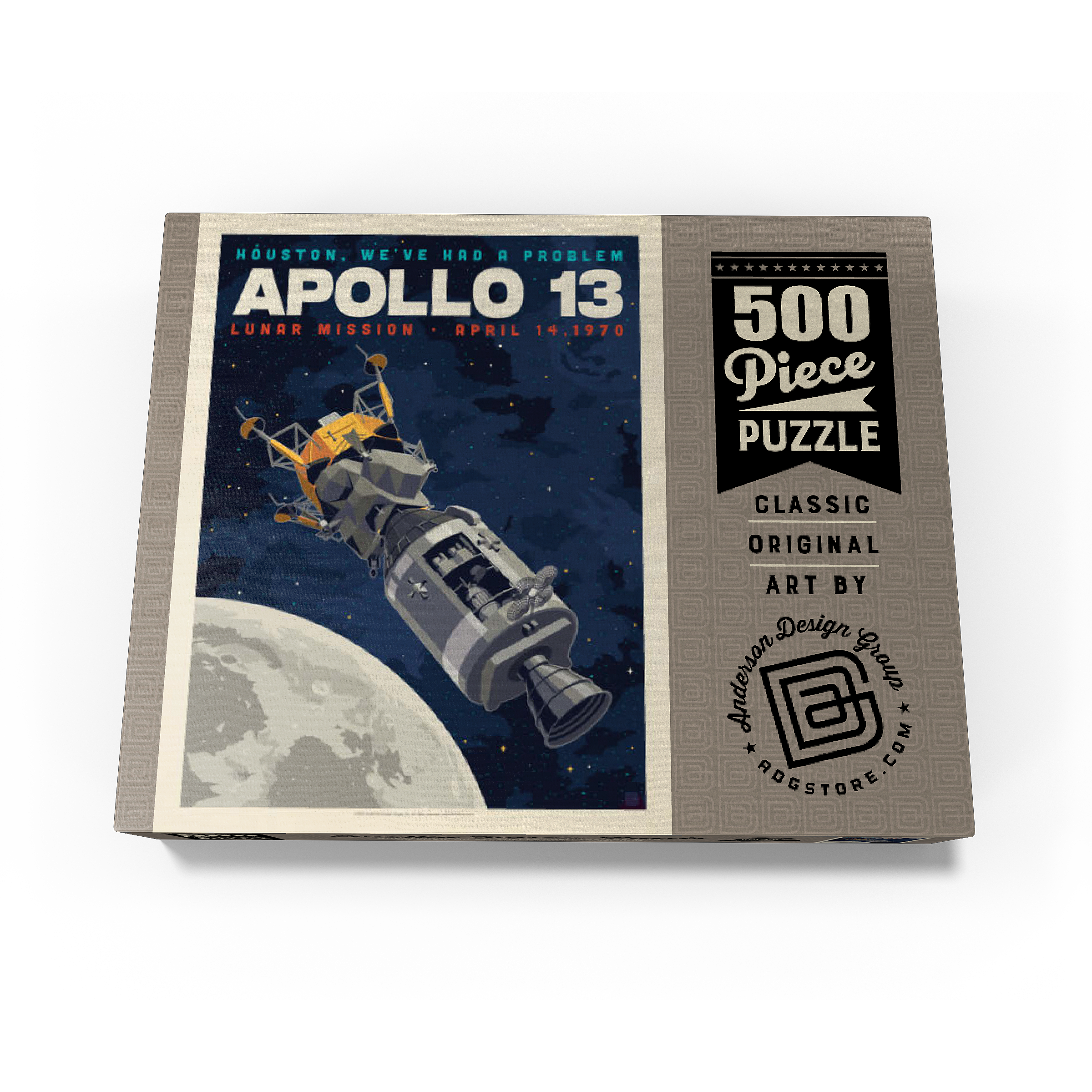 This stylized artwork captures the Apollo 13 spacecraft in lunar orbit during its fateful mission on April 14, 1970. Known for the phrase "Houston, we've had a problem," Apollo 13 was NASA's third intended moon landing but became a dramatic rescue mission after an oxygen tank explosion. The image highlights the lunar module and command-service module drifting near the moon's surface, set against a backdrop of deep space filled with stars. With its retro aesthetic and technical detail, this scene commemorates one of NASA's most heroic efforts in space history, reflecting innovation, teamwork, and survival in the face of adversity.