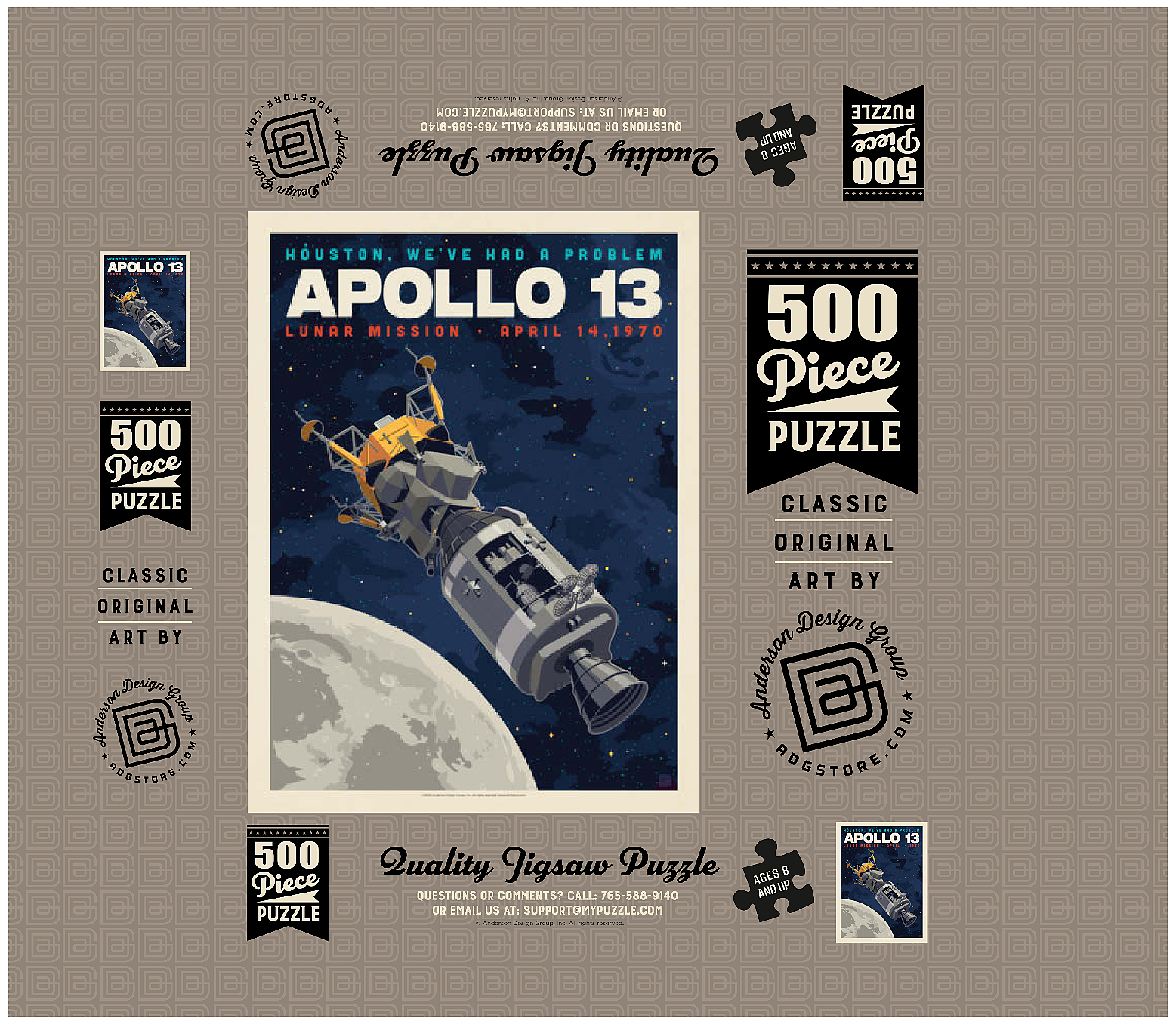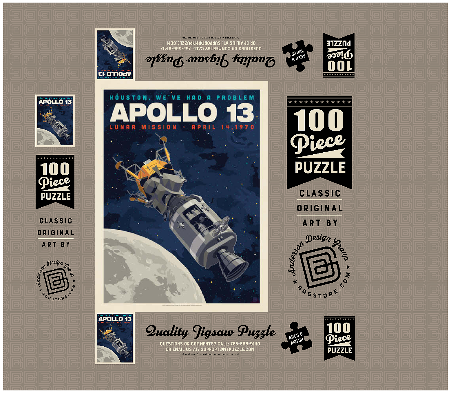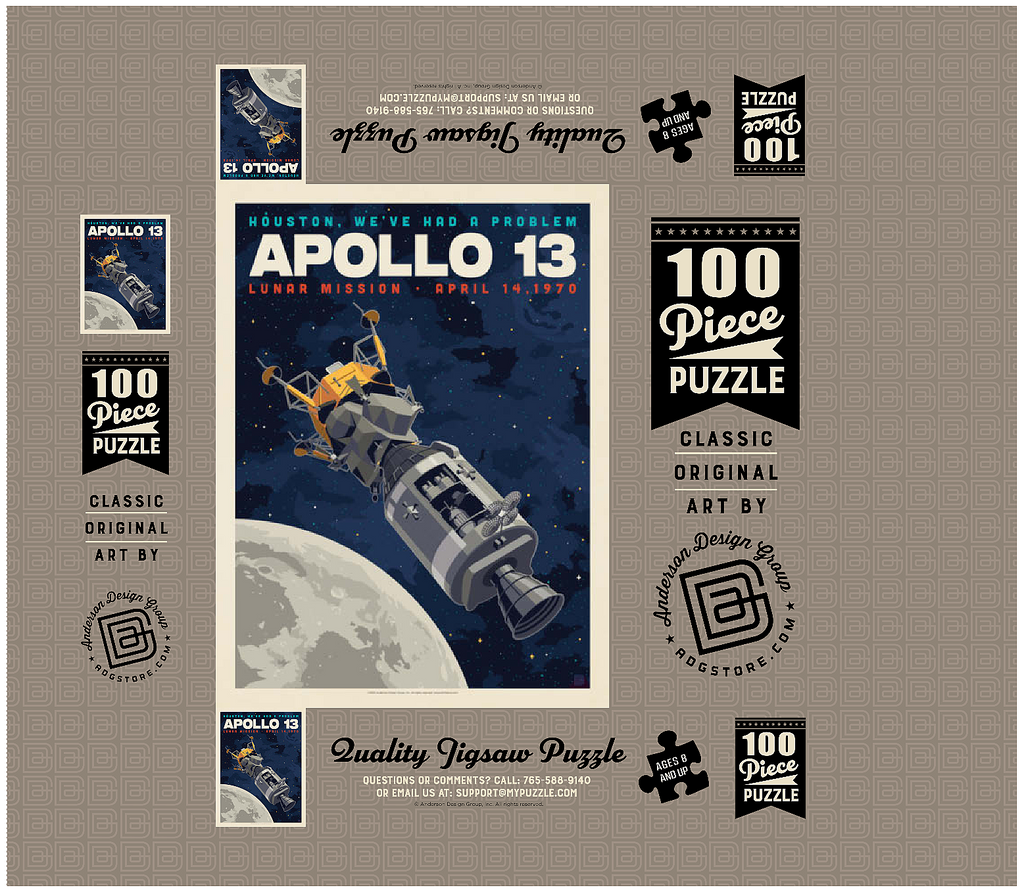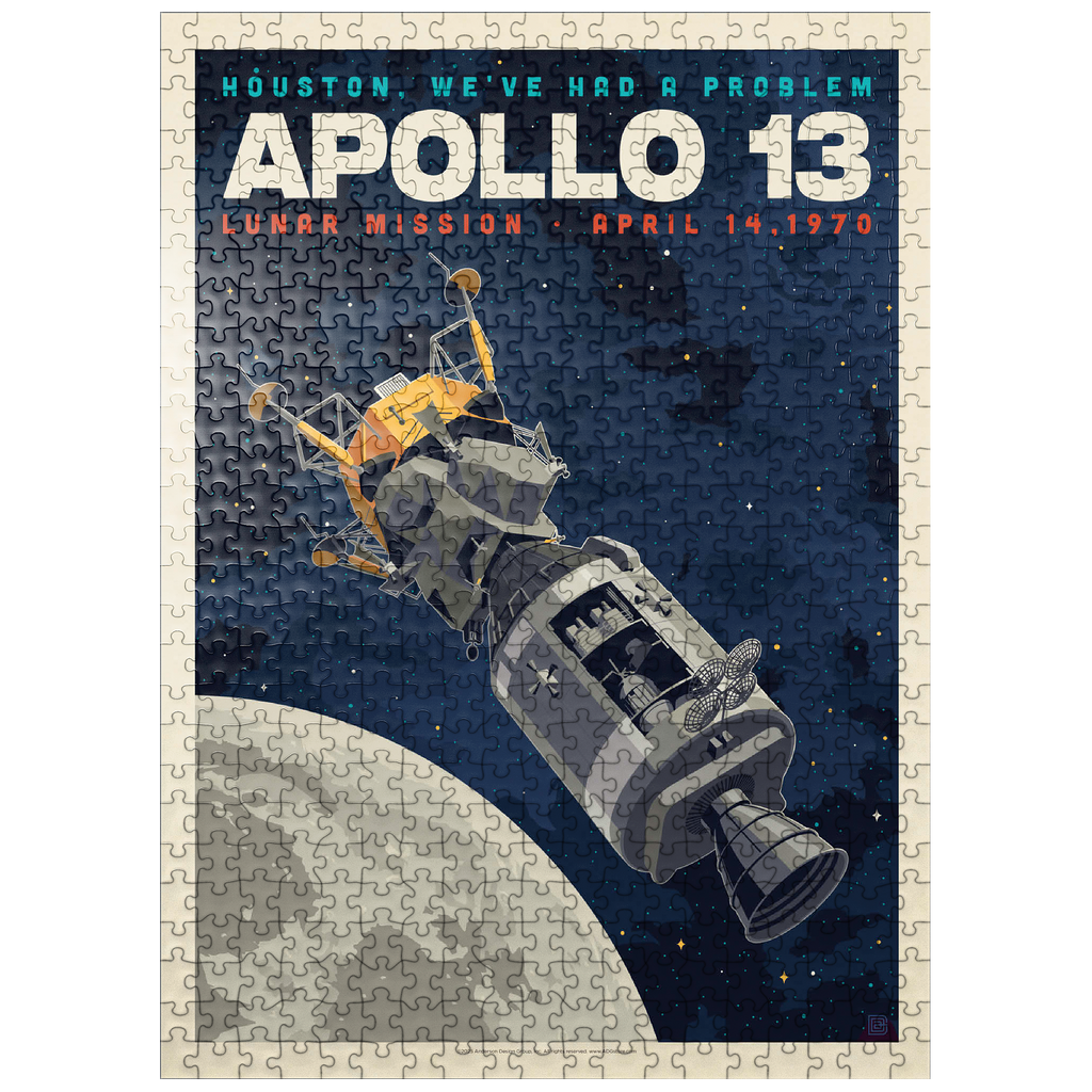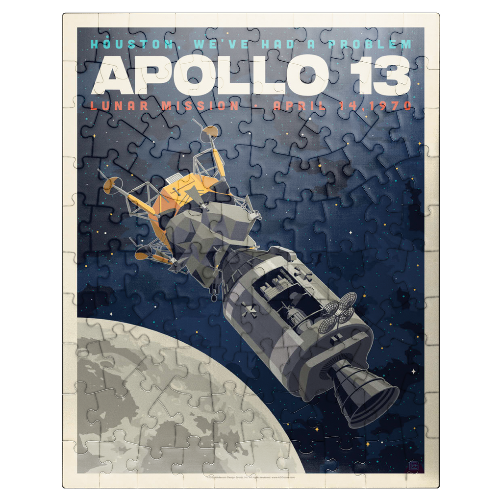 This stylized artwork captures the Apollo 13 spacecraft in lunar orbit during its fateful mission on April 14, 1970. Known for the phrase "Houston, we've had a problem," Apollo 13 was NASA's third intended moon landing but became a dramatic rescue mission after an oxygen tank explosion. The image highlights the lunar module and command-service module drifting near the moon's surface, set against a backdrop of deep space filled with stars. With its retro aesthetic and technical detail, this scene commemorates one of NASA's most heroic efforts in space history, reflecting innovation, teamwork, and survival in the face of adversity.