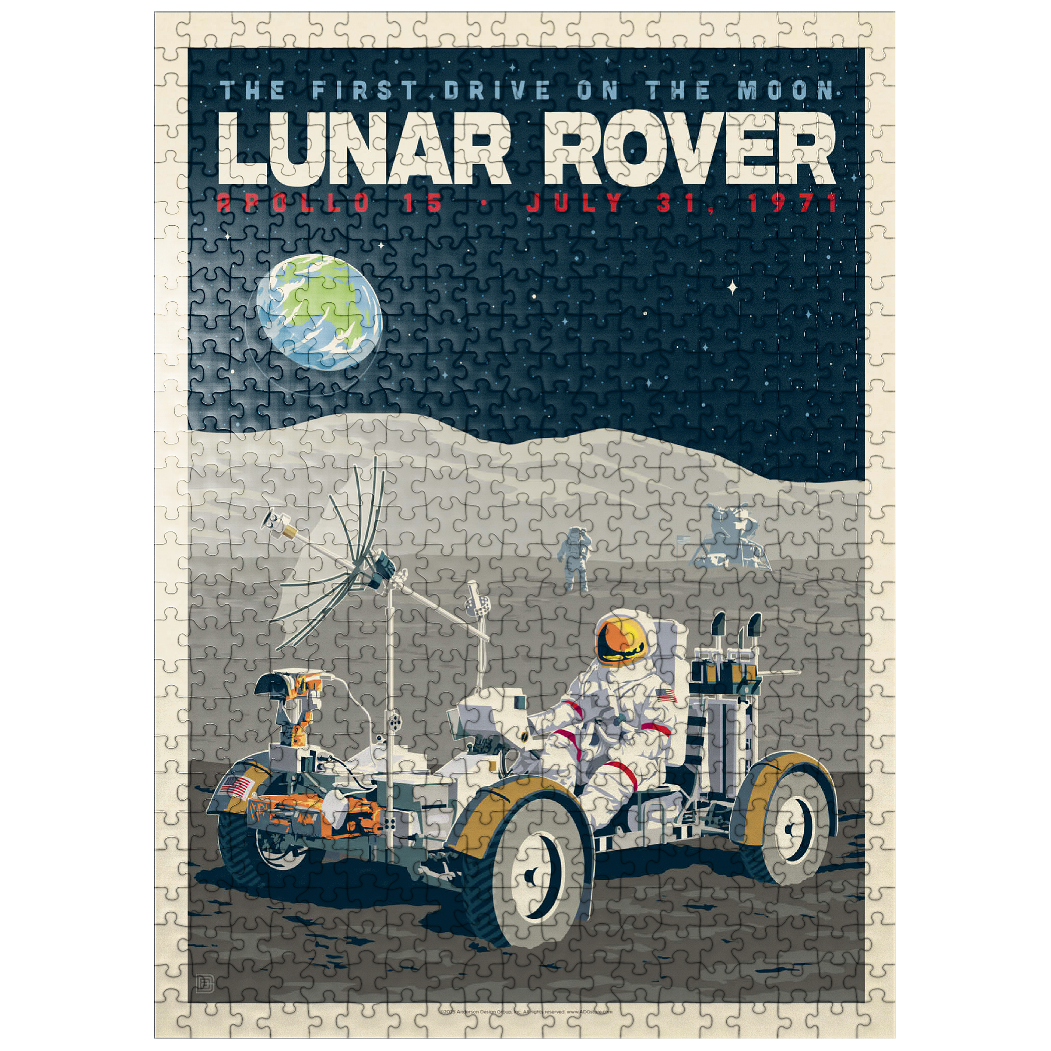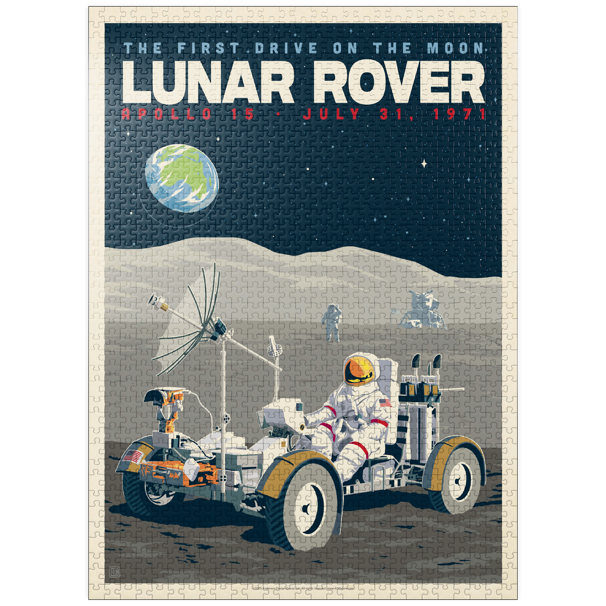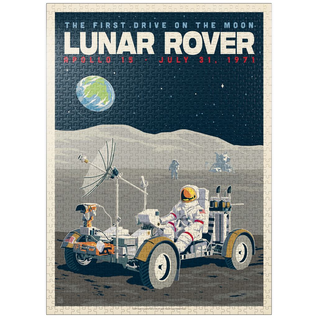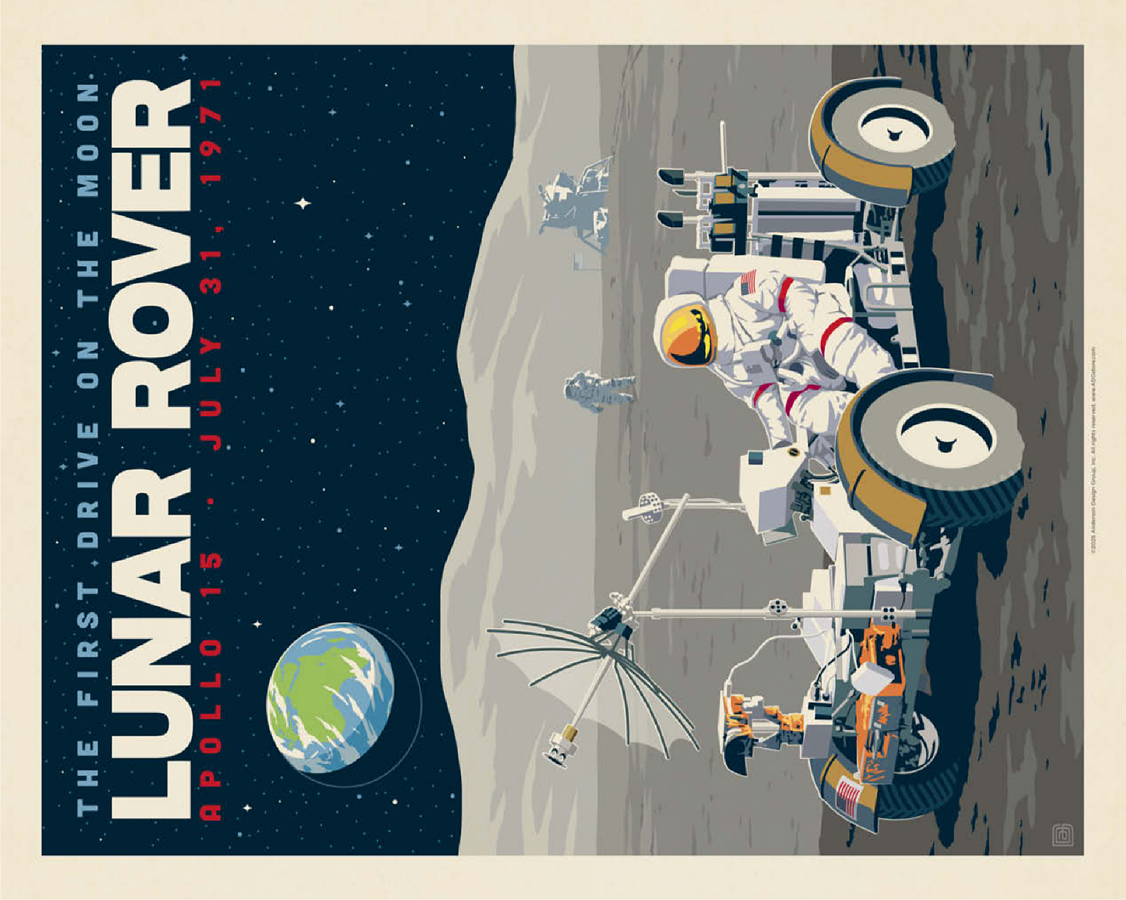 This retro-style artwork commemorates the historic first drive on the moon during NASA's Apollo 15 mission on July 31, 1971. It features the Lunar Roving Vehicle (LRV) operated by an astronaut in full gear, navigating the rugged lunar surface with Earth visible in the starry sky above. Apollo 15 marked the debut of the moon rover, allowing astronauts to explore greater distances and conduct more extensive scientific experiments. The background includes another astronaut and the lunar module, adding depth to the scene. This stylized depiction celebrates one of space exploration's most innovative engineering milestones.