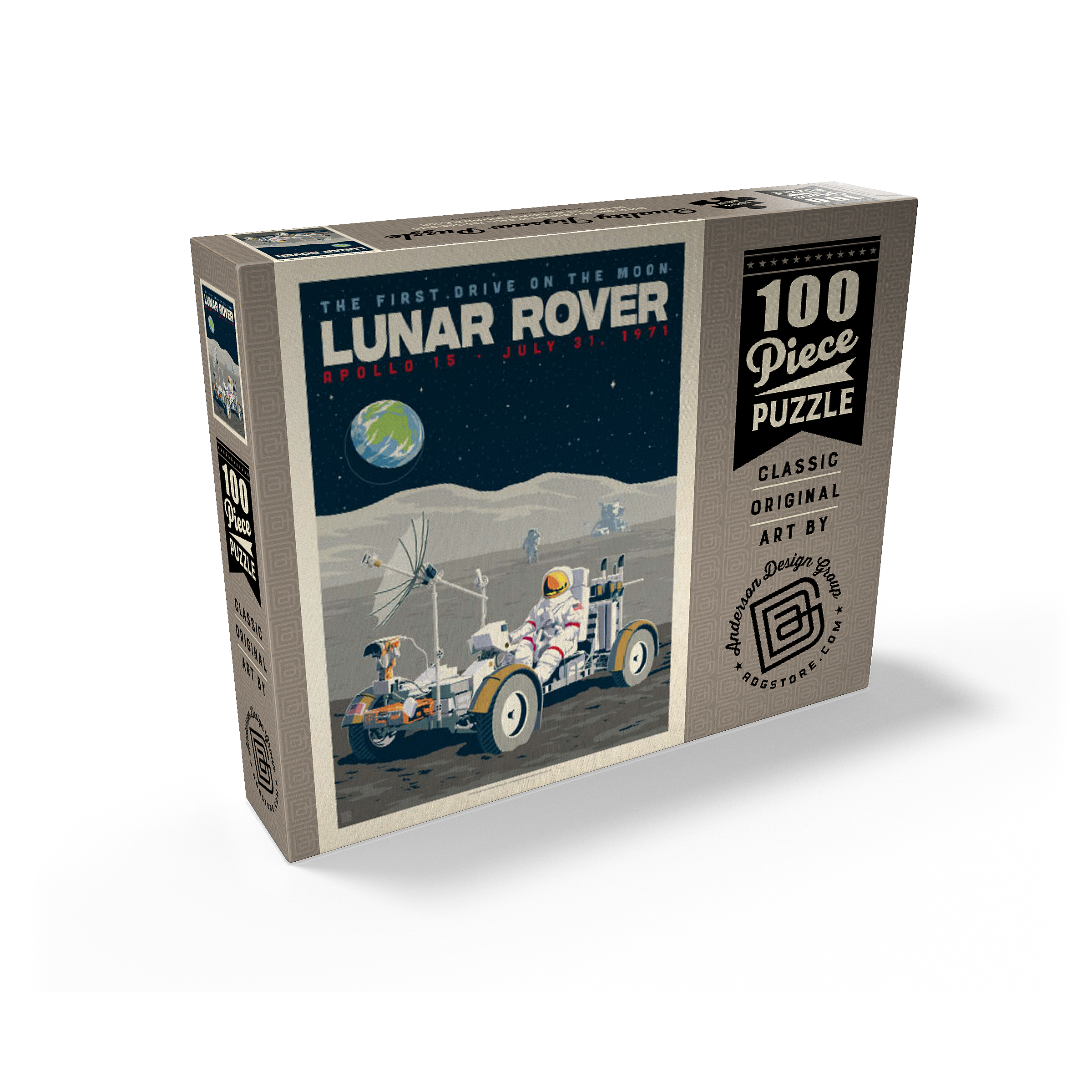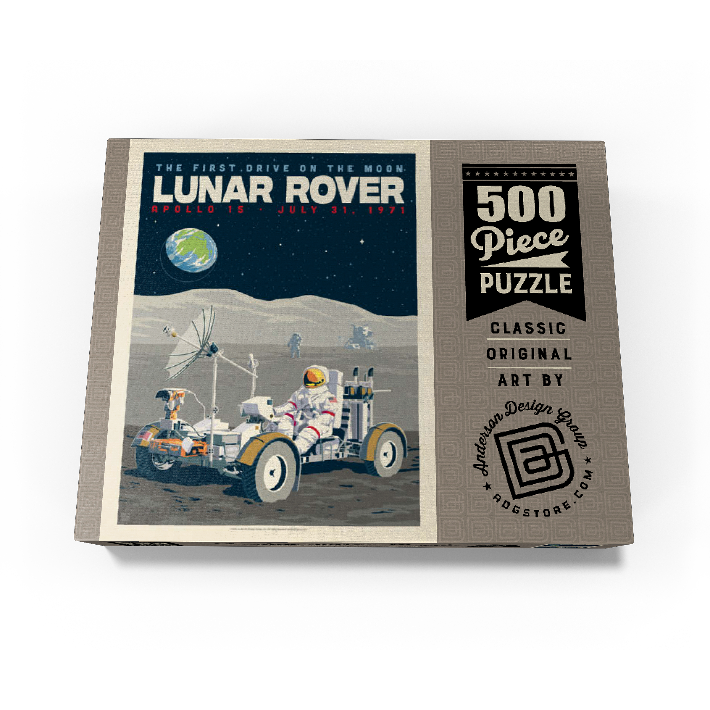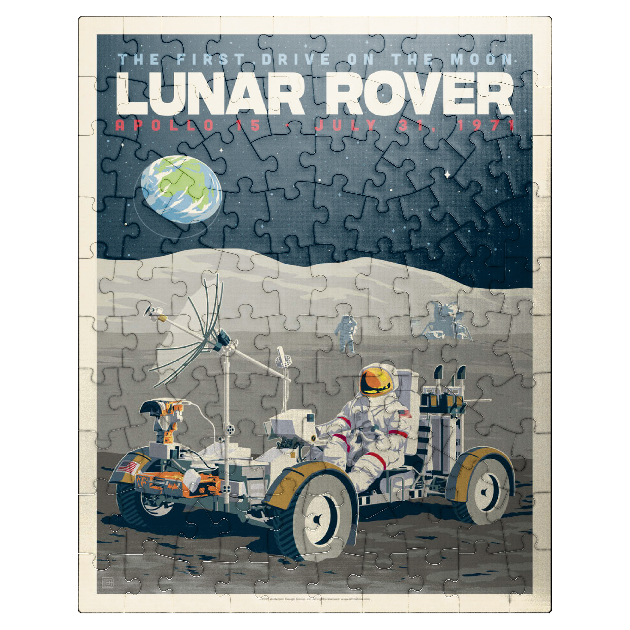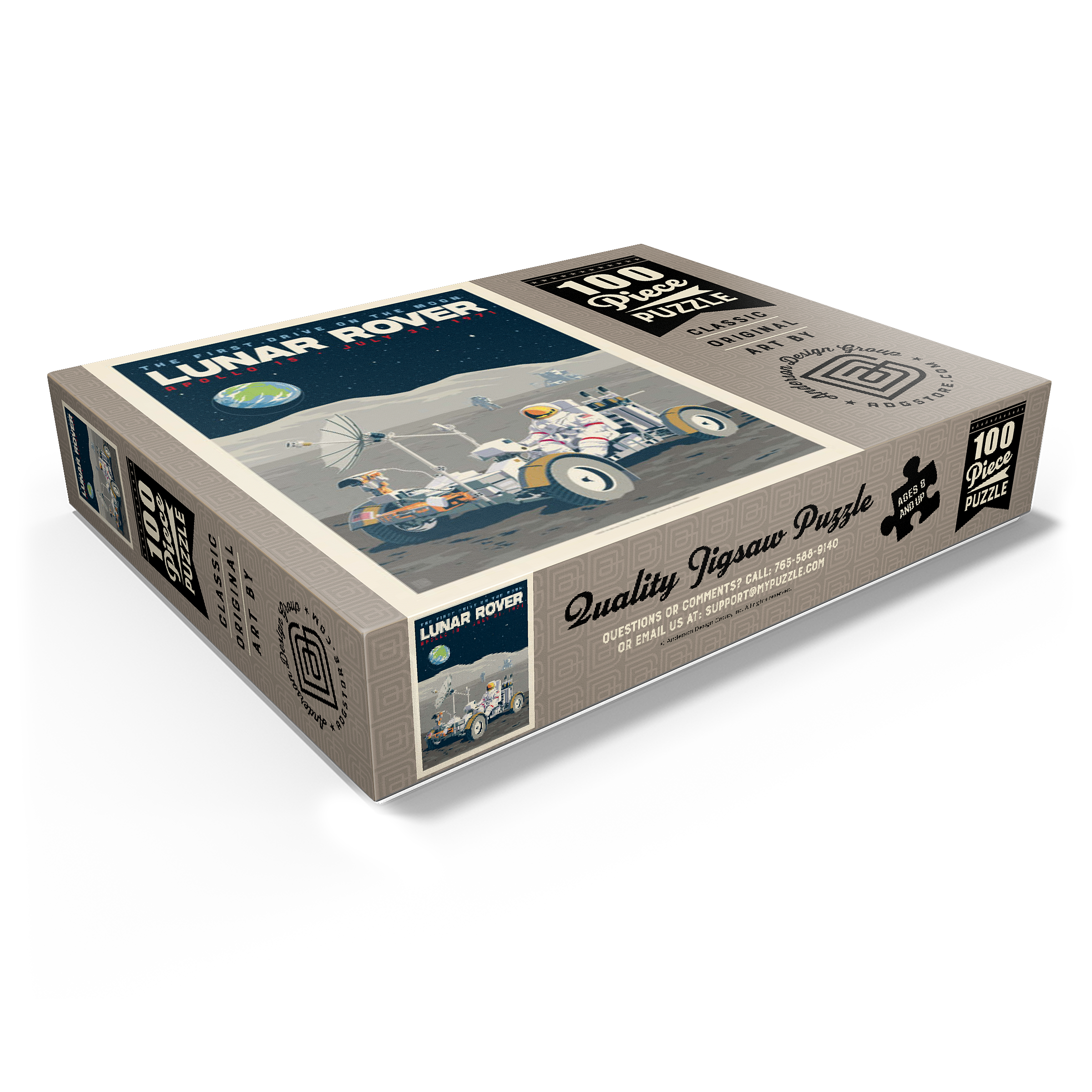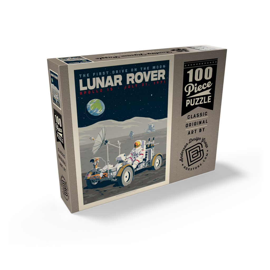 This retro-style artwork commemorates the historic first drive on the moon during NASA's Apollo 15 mission on July 31, 1971. It features the Lunar Roving Vehicle (LRV) operated by an astronaut in full gear, navigating the rugged lunar surface with Earth visible in the starry sky above. Apollo 15 marked the debut of the moon rover, allowing astronauts to explore greater distances and conduct more extensive scientific experiments. The background includes another astronaut and the lunar module, adding depth to the scene. This stylized depiction celebrates one of space exploration's most innovative engineering milestones.