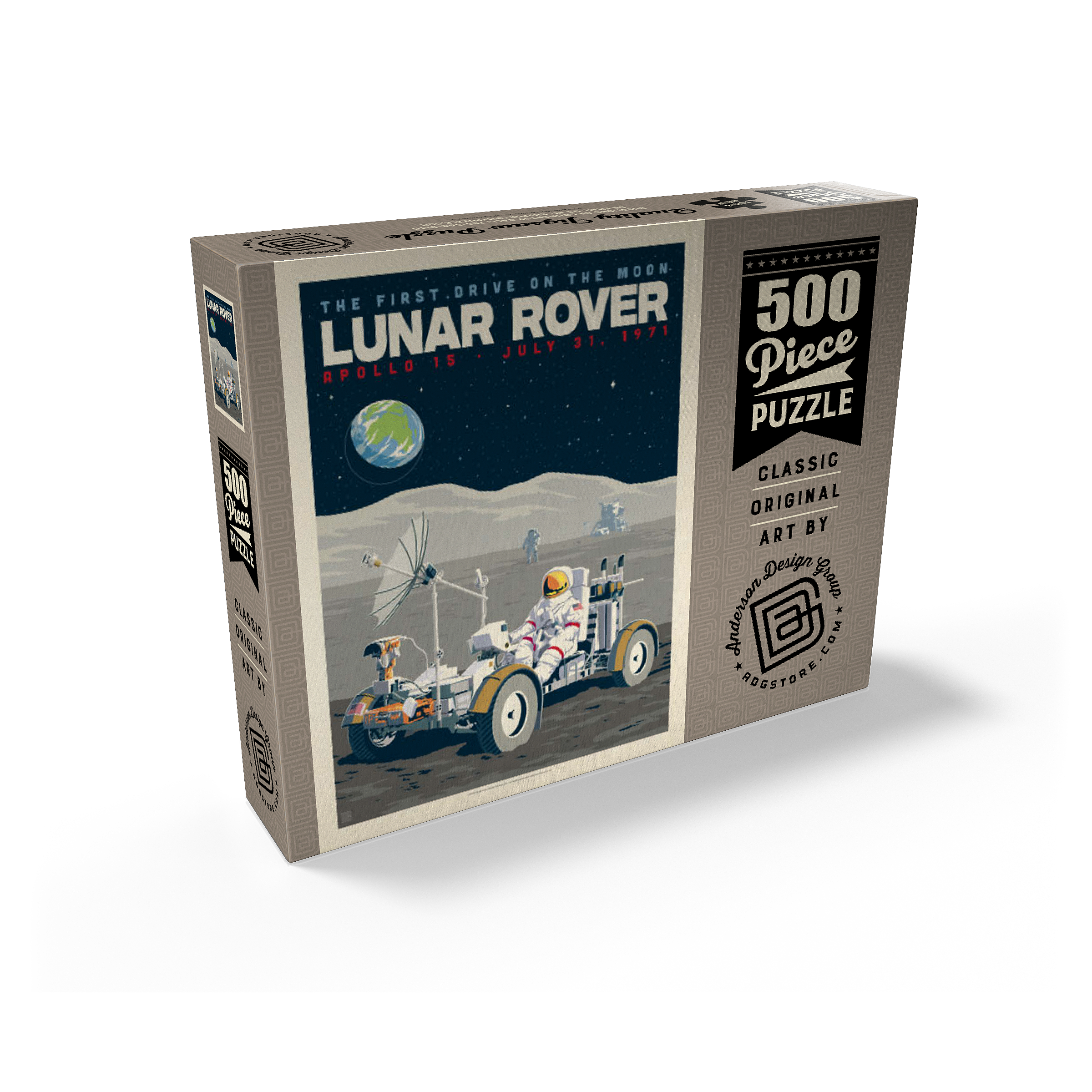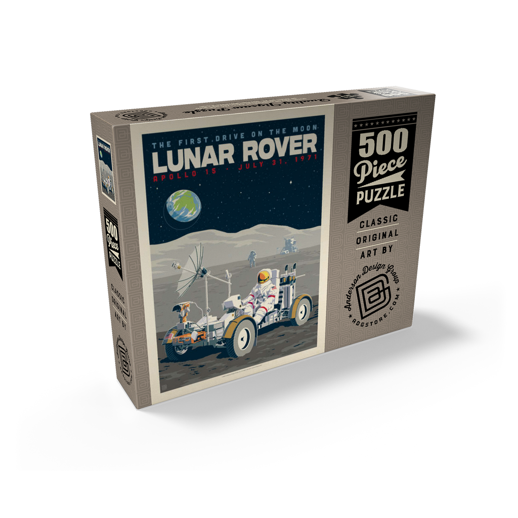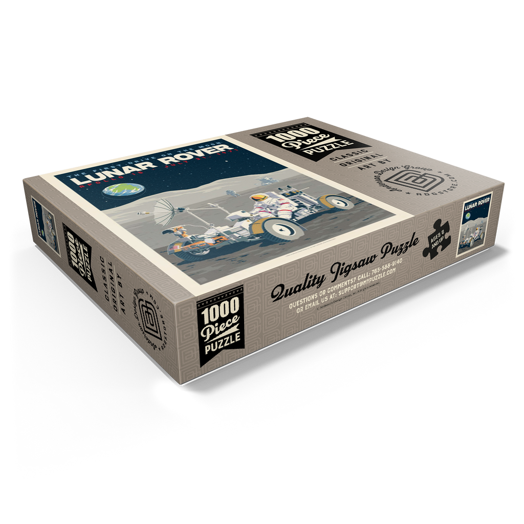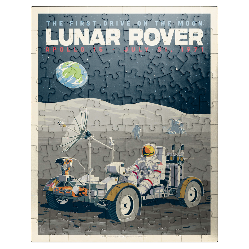 This retro-style artwork commemorates the historic first drive on the moon during NASA's Apollo 15 mission on July 31, 1971. It features the Lunar Roving Vehicle (LRV) operated by an astronaut in full gear, navigating the rugged lunar surface with Earth visible in the starry sky above. Apollo 15 marked the debut of the moon rover, allowing astronauts to explore greater distances and conduct more extensive scientific experiments. The background includes another astronaut and the lunar module, adding depth to the scene. This stylized depiction celebrates one of space exploration's most innovative engineering milestones.