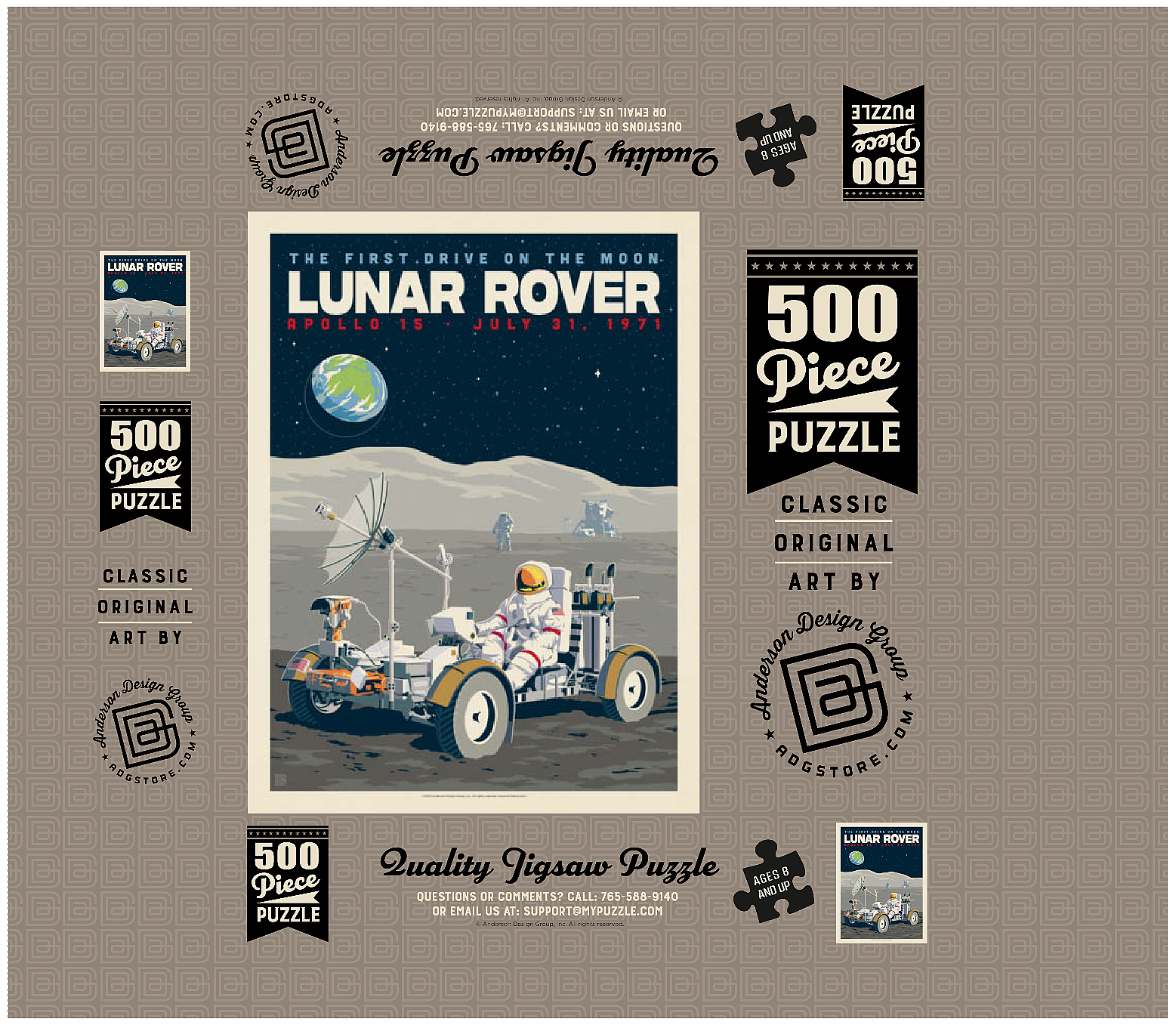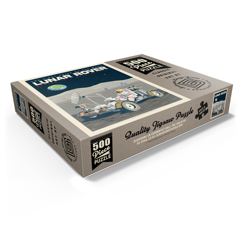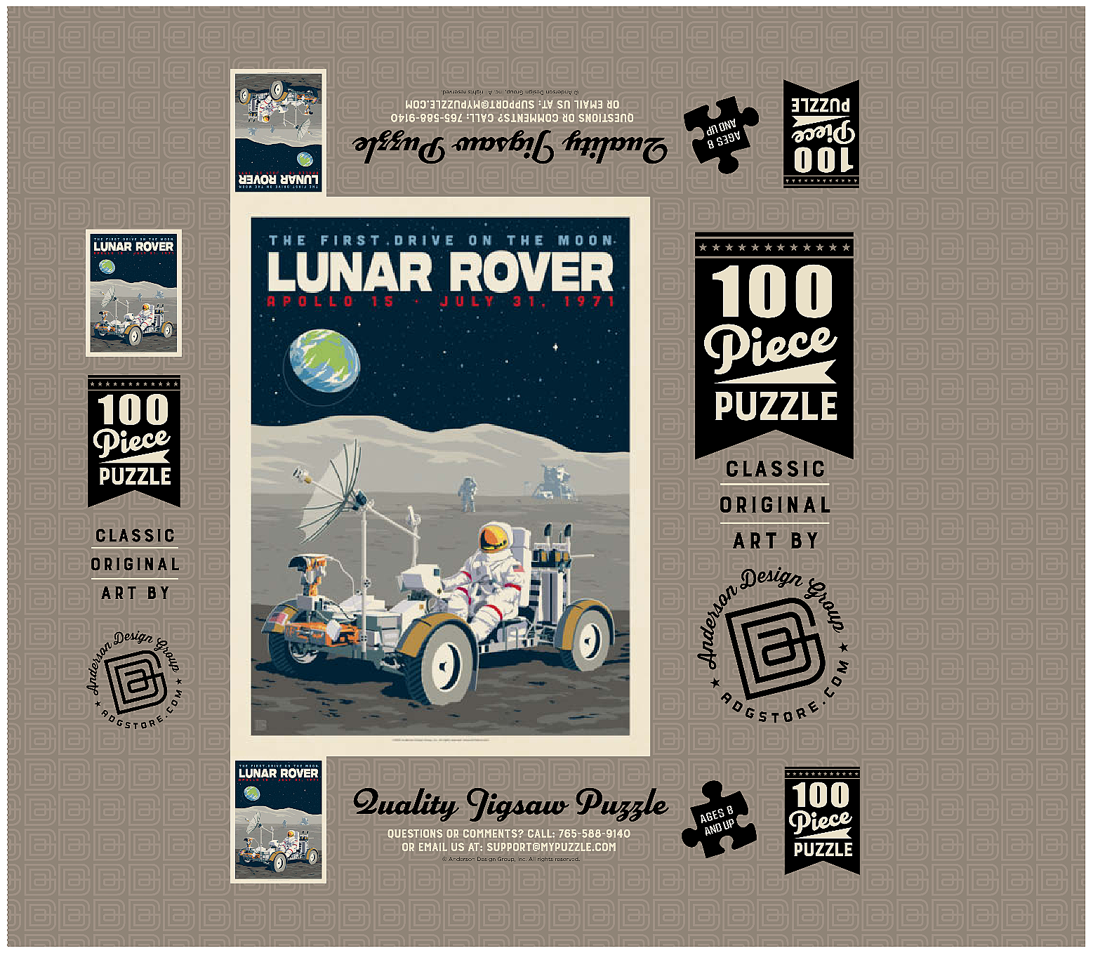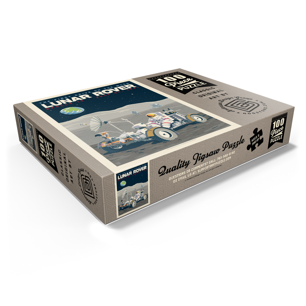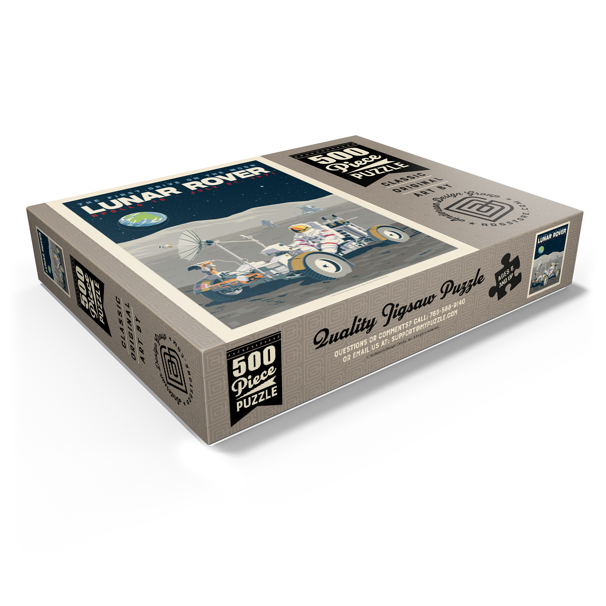 This retro-style artwork commemorates the historic first drive on the moon during NASA's Apollo 15 mission on July 31, 1971. It features the Lunar Roving Vehicle (LRV) operated by an astronaut in full gear, navigating the rugged lunar surface with Earth visible in the starry sky above. Apollo 15 marked the debut of the moon rover, allowing astronauts to explore greater distances and conduct more extensive scientific experiments. The background includes another astronaut and the lunar module, adding depth to the scene. This stylized depiction celebrates one of space exploration's most innovative engineering milestones.