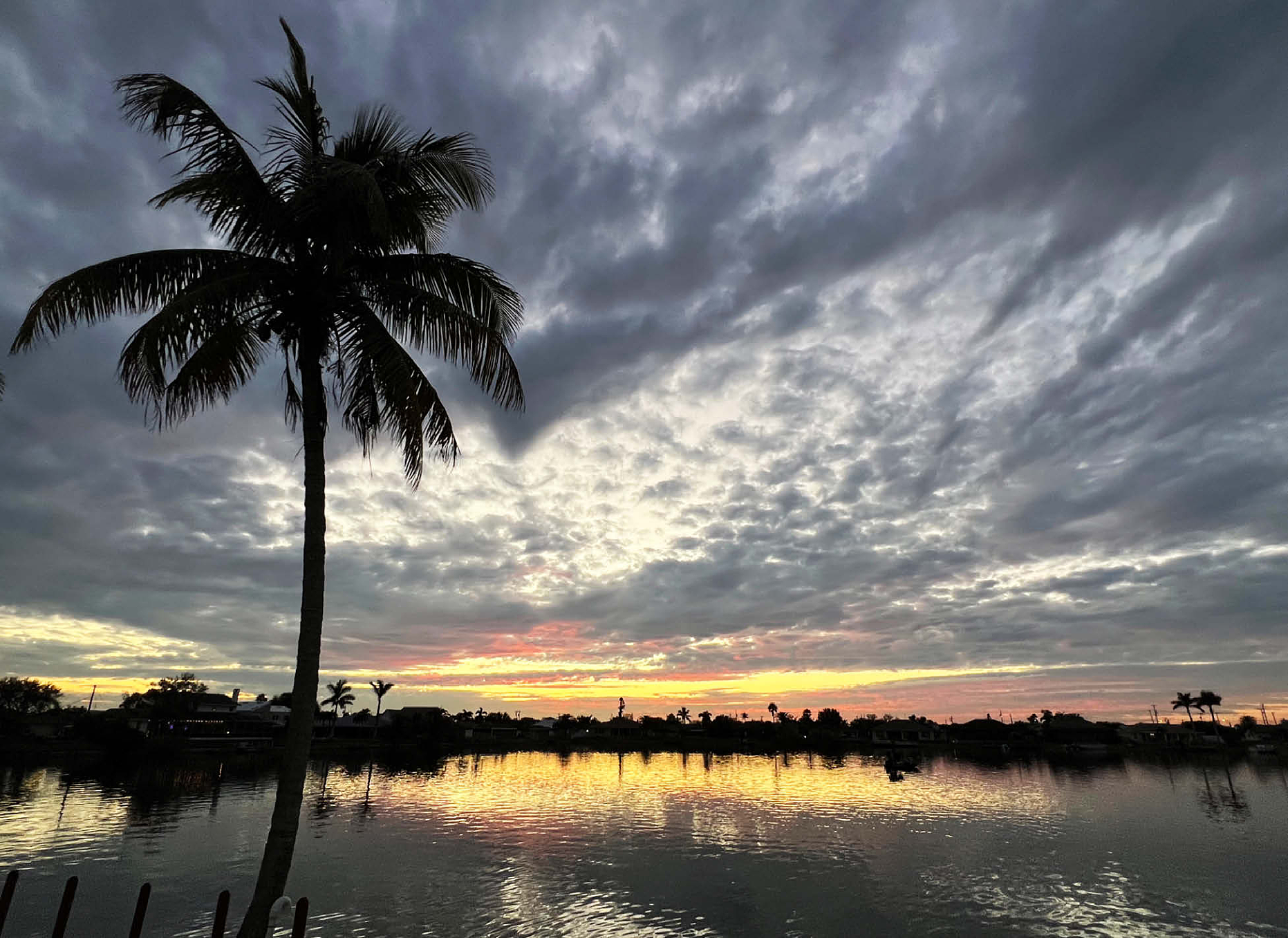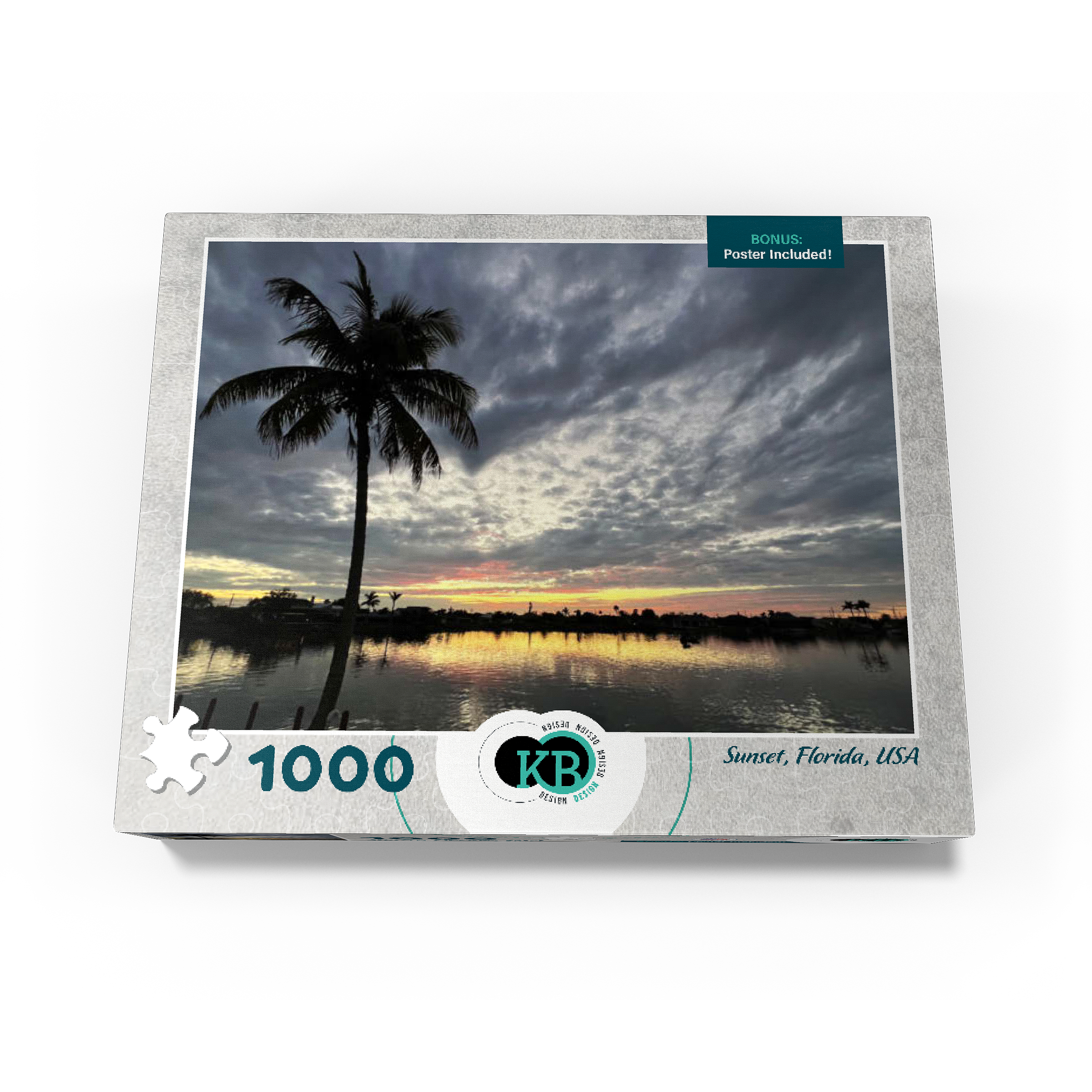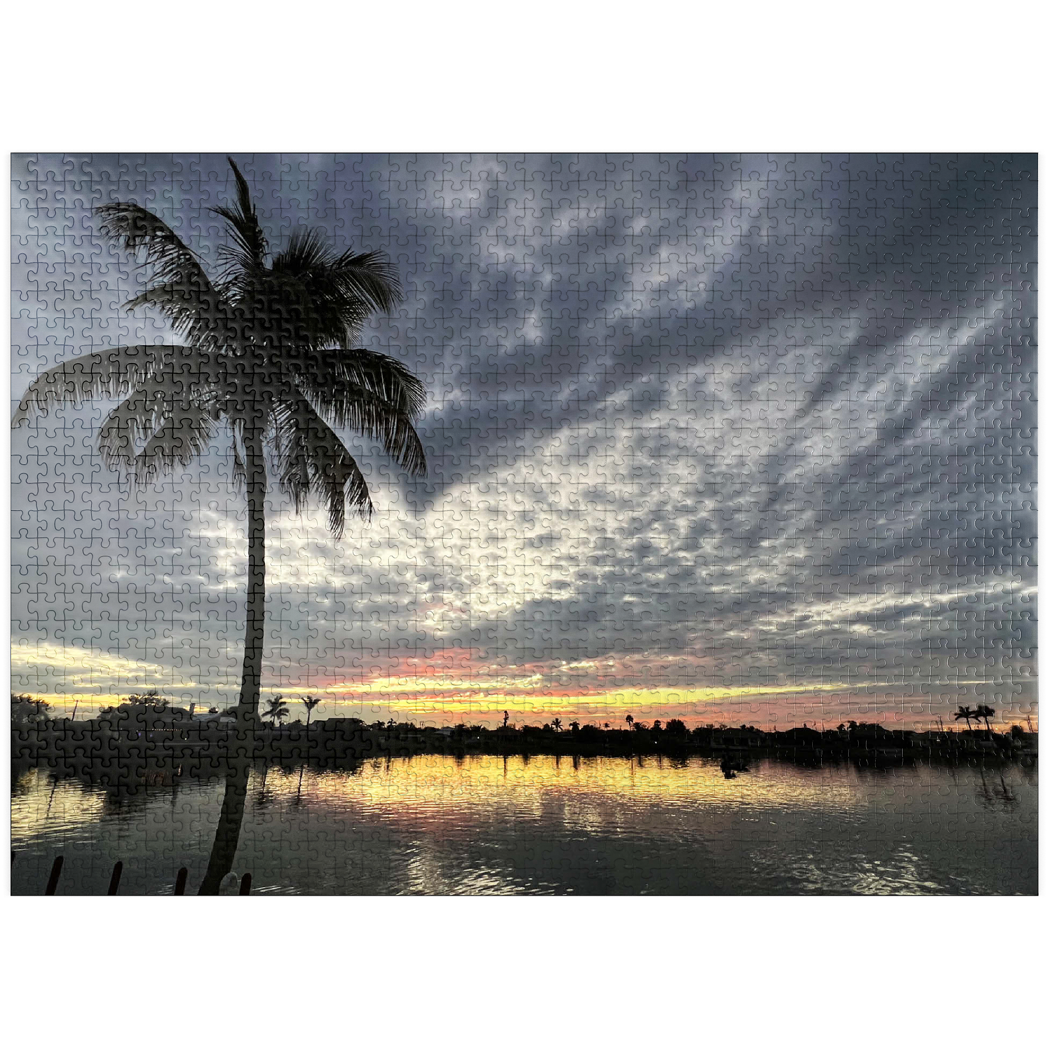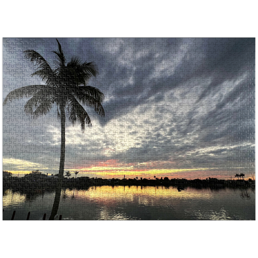 Capture the breathtaking beauty of a dramatic tropical sunset with this stunning waterfront scene. A tall palm tree silhouette stands against a sky filled with textured clouds, illuminated by the warm hues of the setting sun. The golden light reflects off the calm water, creating a peaceful yet moody atmosphere. Perfect for wall art, digital backgrounds, or tropical-inspired decor, this high-resolution sunset photography embodies the beauty of coastal serenity and nature’s artistry.