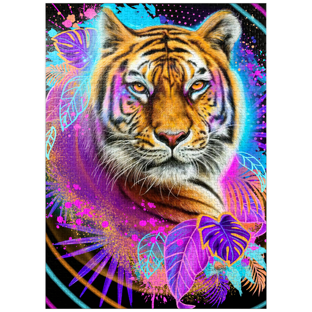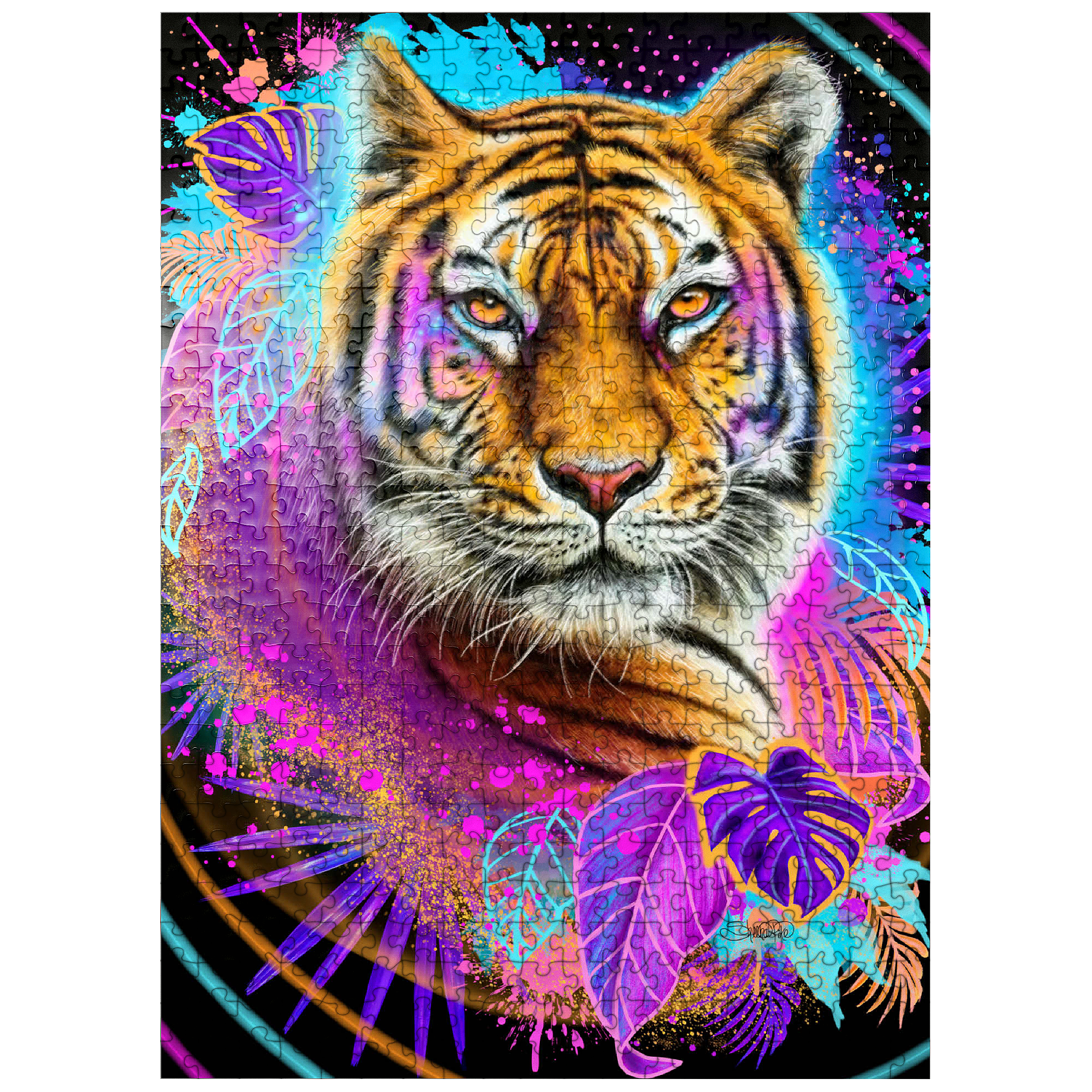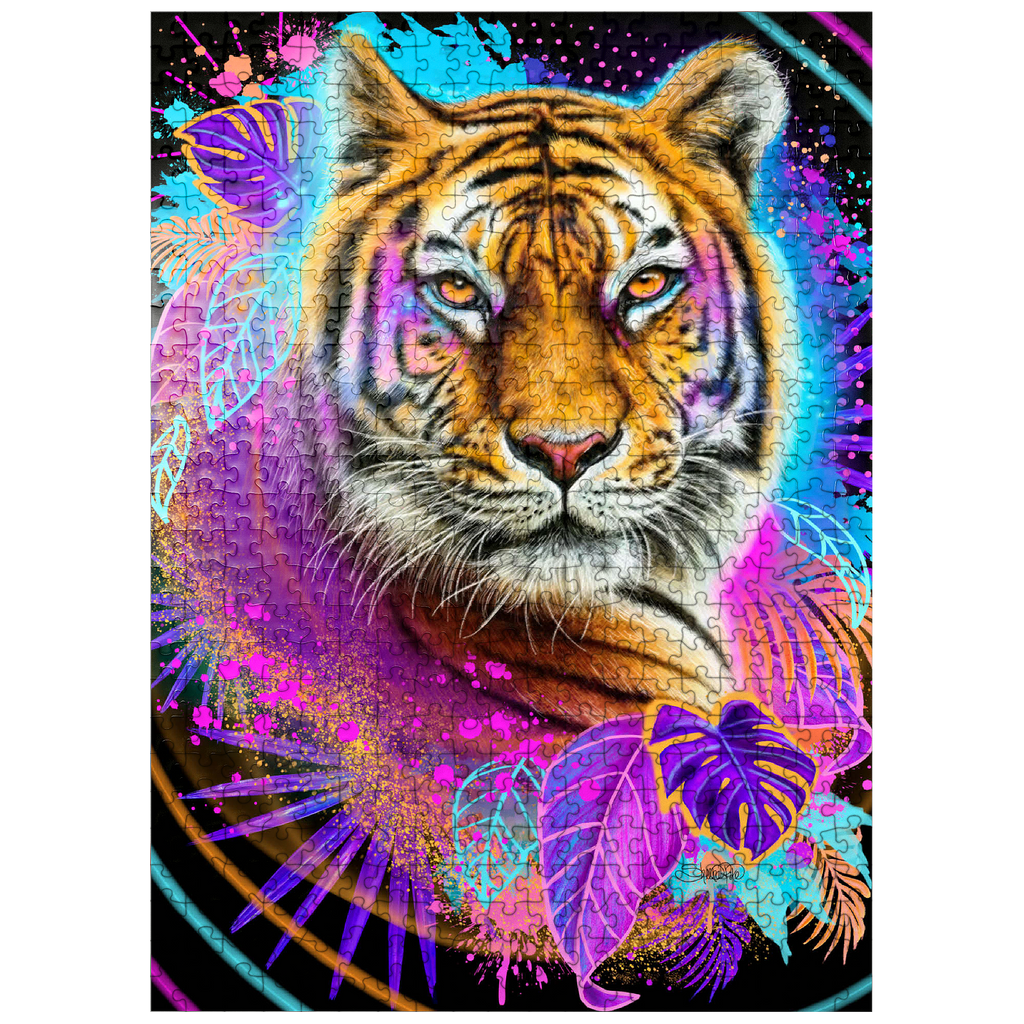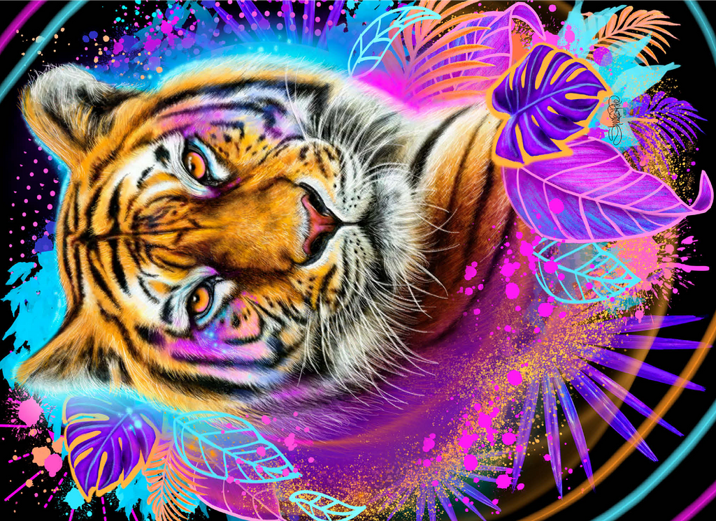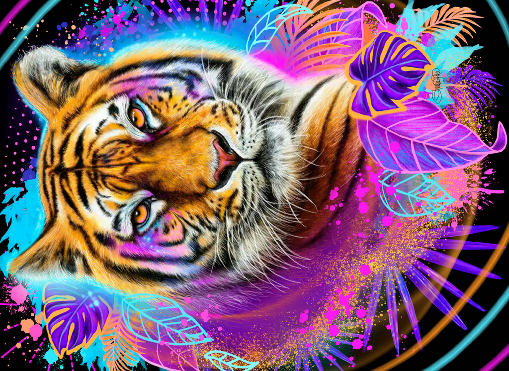 A vibrant, neon-infused portrait of a tiger, rendered in the style of Sheena Pike. the composition, evocative of 1990s aesthetics, features a cool color palette and is dynamically framed by lush tropical foliage and bursts of complementary colors. the tiger image is playfully detailed with interwoven leaves and floral accents, creating a visually engaging and contemporary piece of art