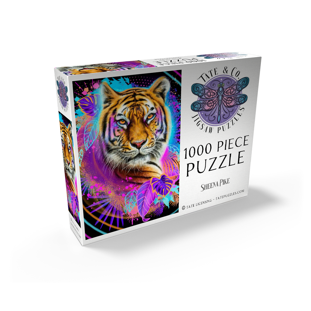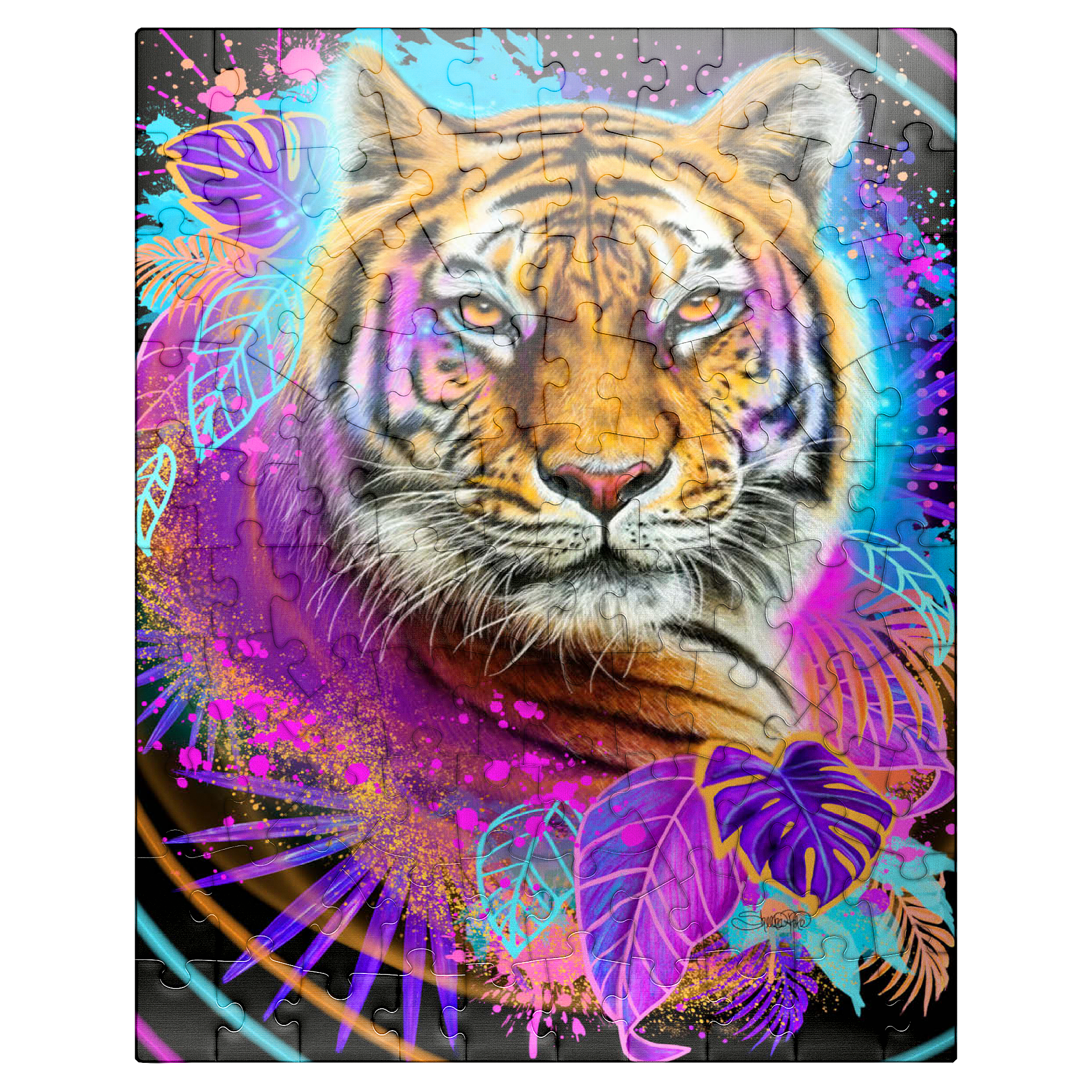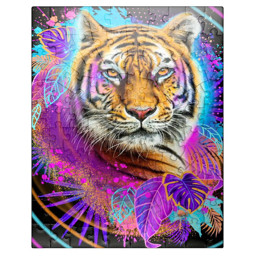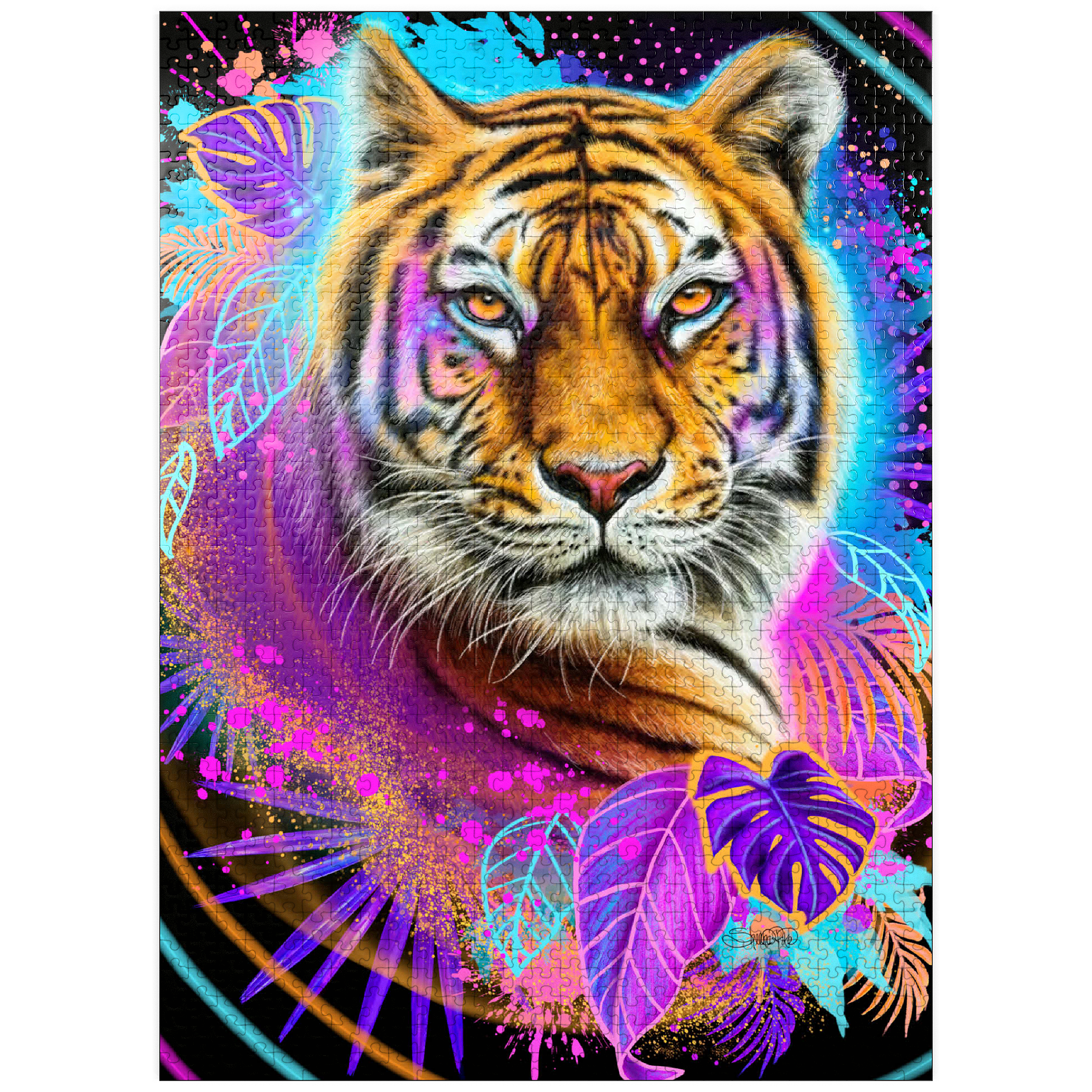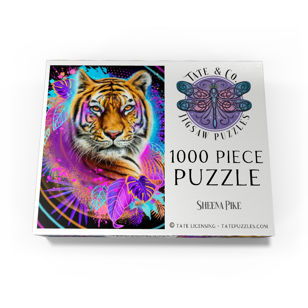 A vibrant, neon-infused portrait of a tiger, rendered in the style of Sheena Pike. the composition, evocative of 1990s aesthetics, features a cool color palette and is dynamically framed by lush tropical foliage and bursts of complementary colors. the tiger image is playfully detailed with interwoven leaves and floral accents, creating a visually engaging and contemporary piece of art