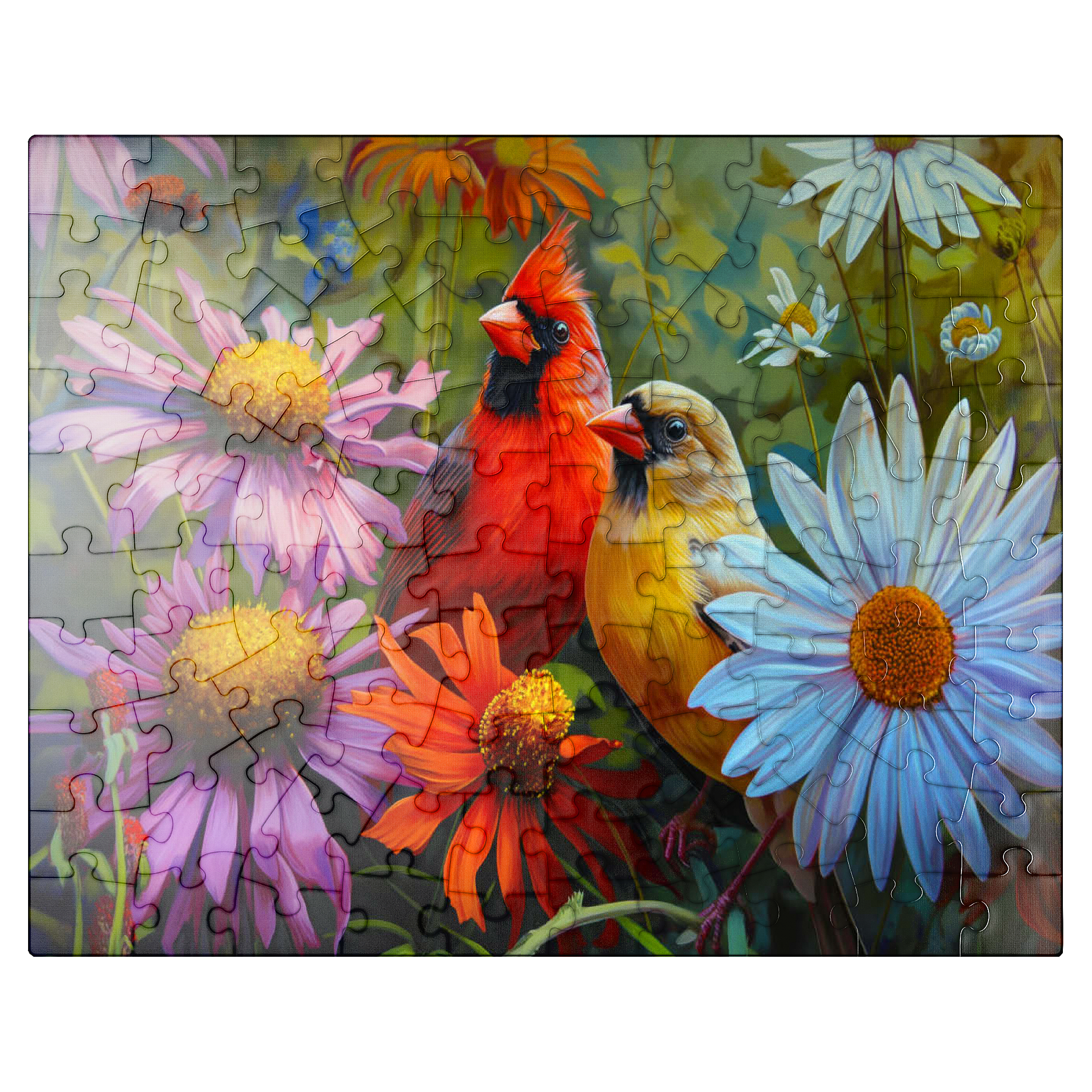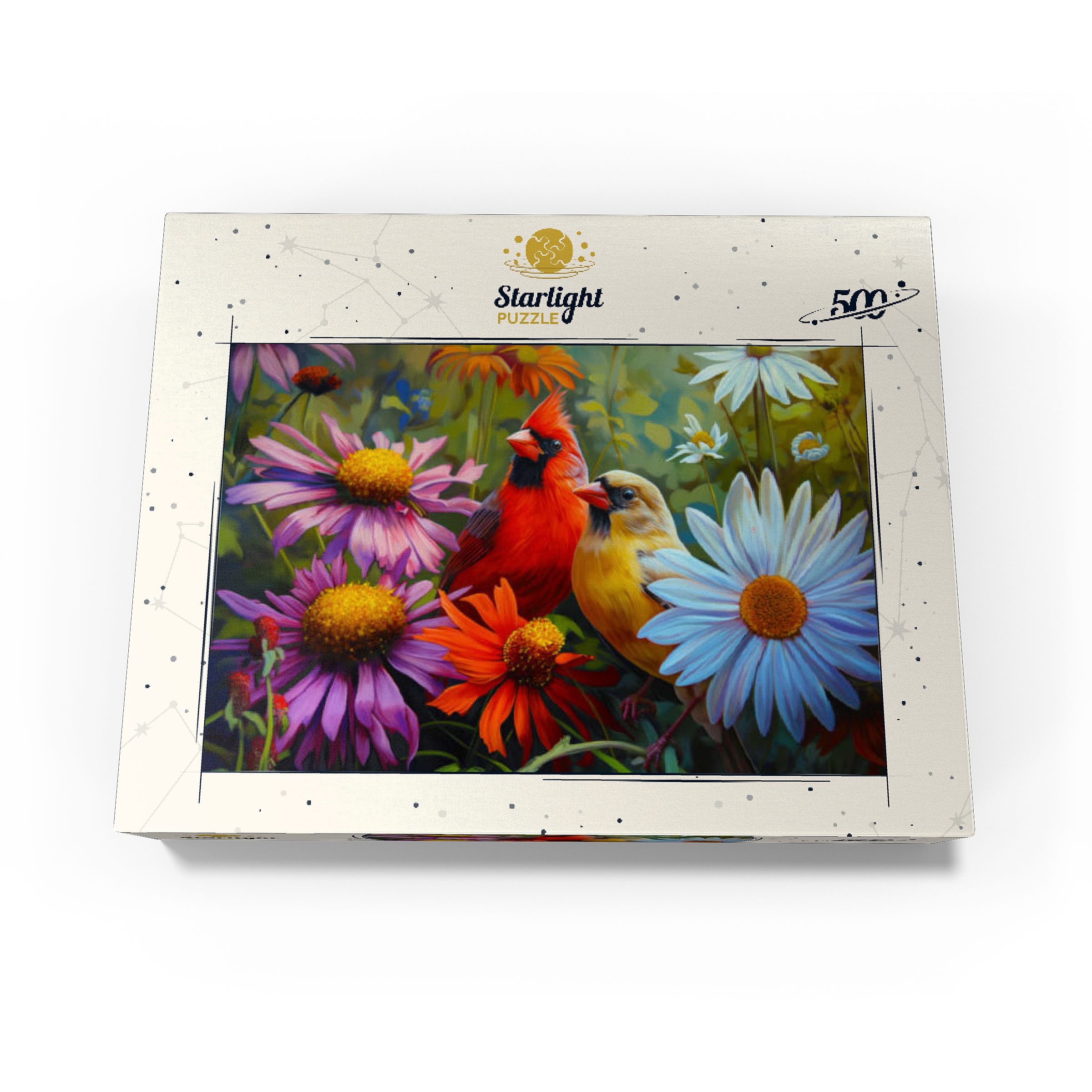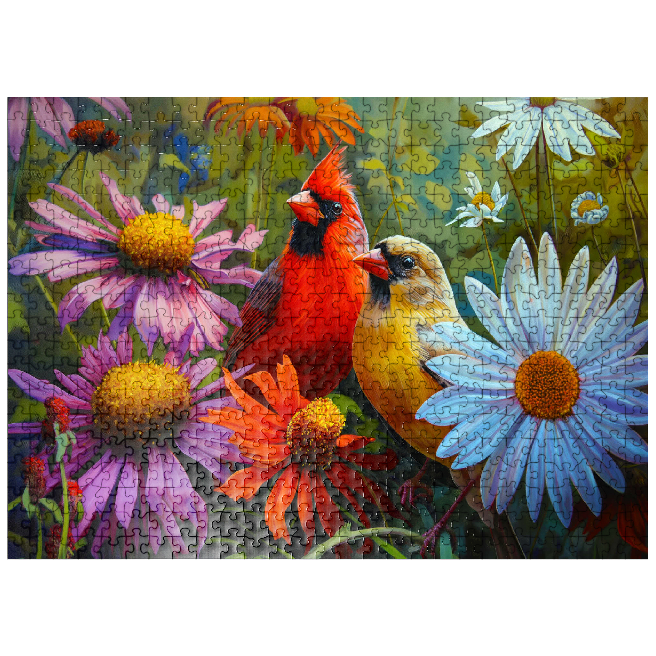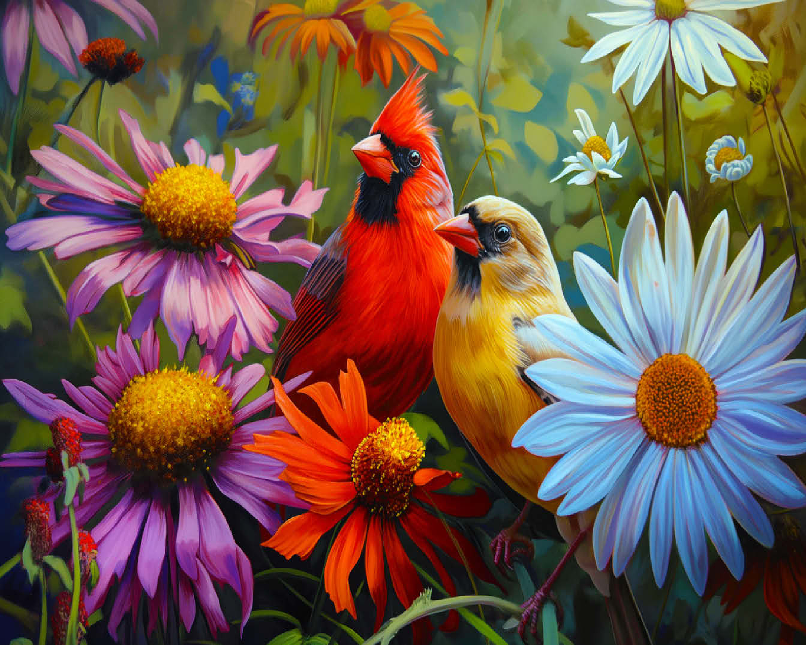 This vibrant illustration captures the beauty of a male and female Northern Cardinal perched among blooming wildflowers, including daisies and coneflowers. The male cardinal's striking red plumage contrasts with the female's soft yellow and brown tones, creating a harmonious yet colorful scene. The lush greenery and delicate floral details highlight the serene beauty of nature, making it a captivating portrayal of wildlife and seasonal blossoms.