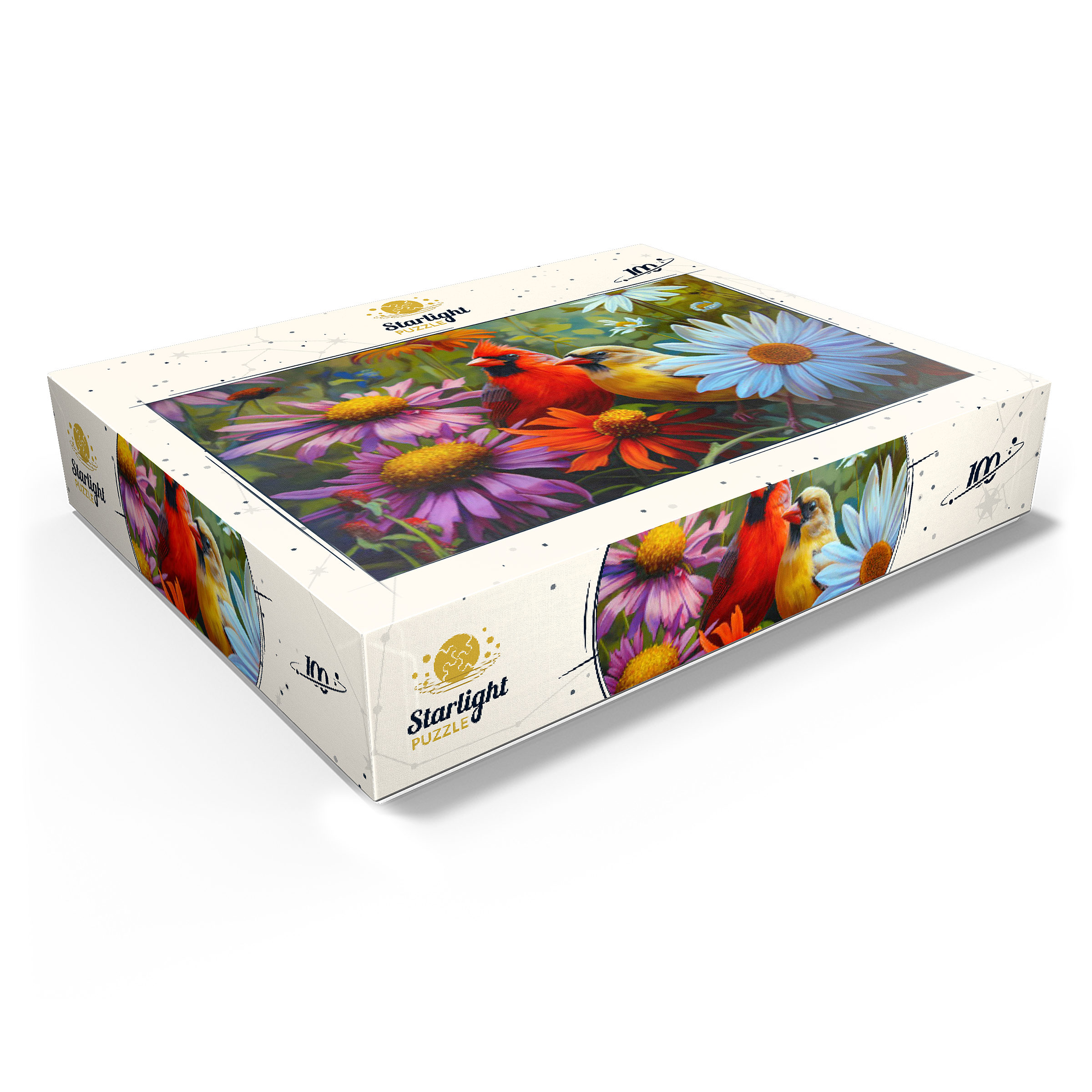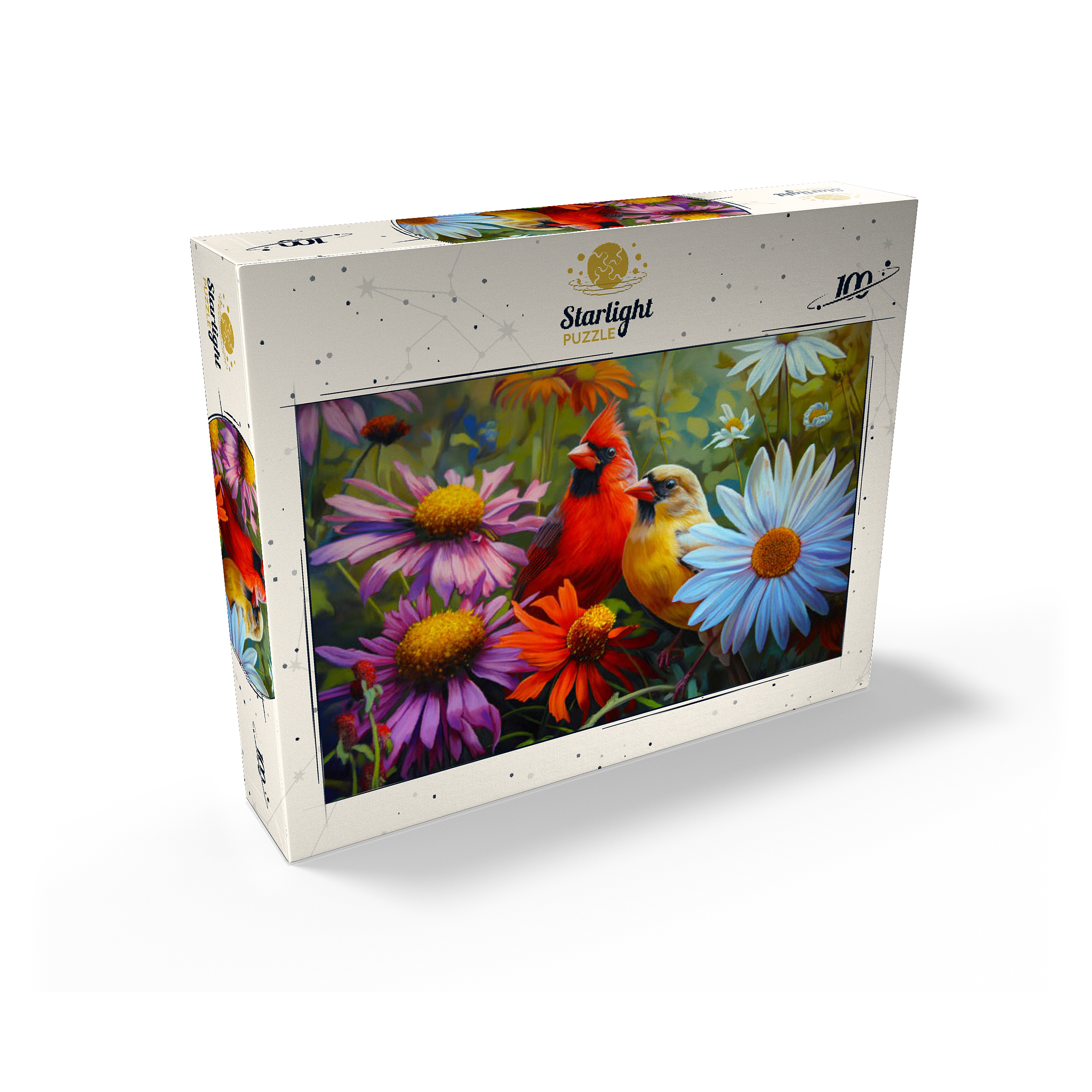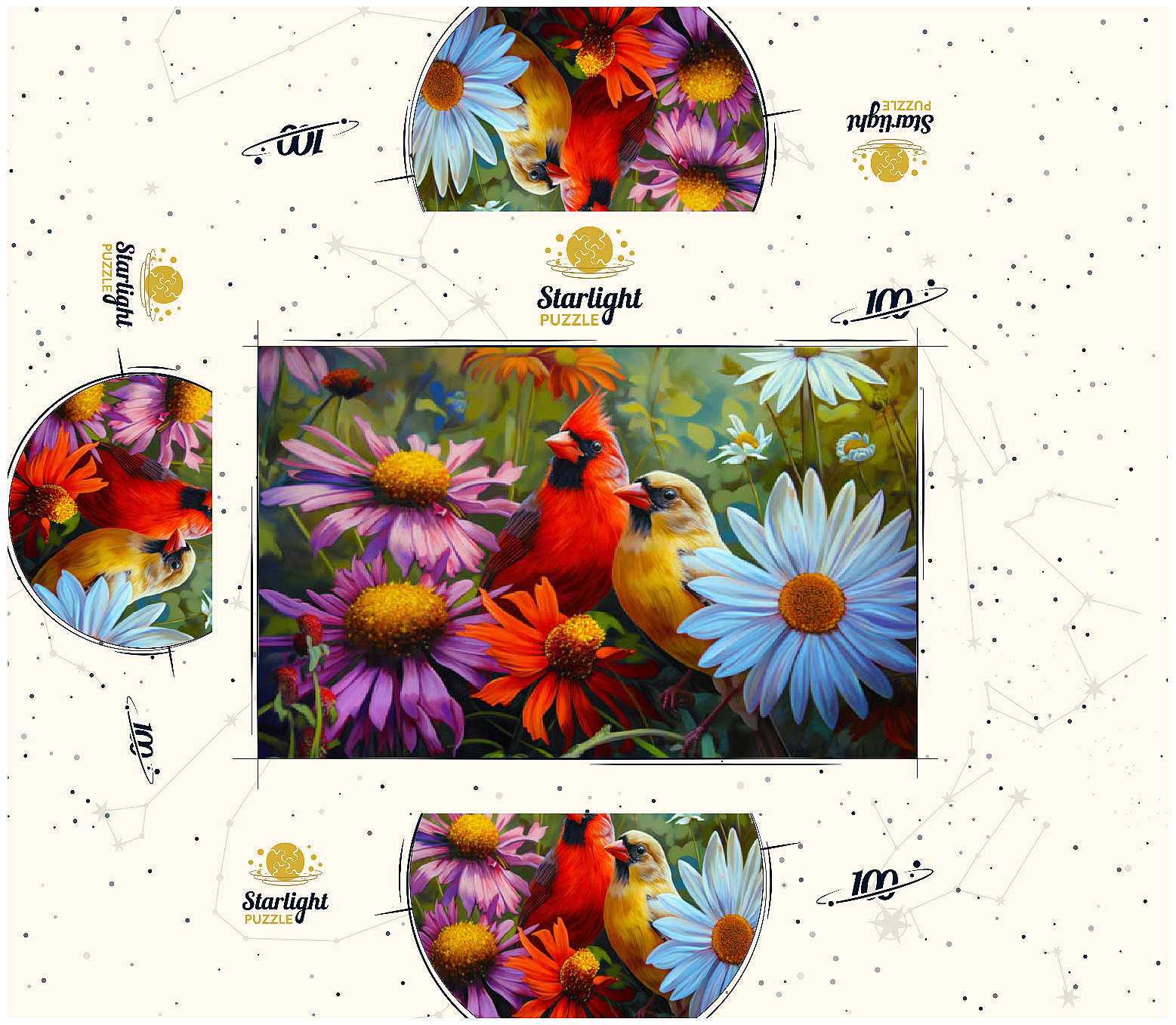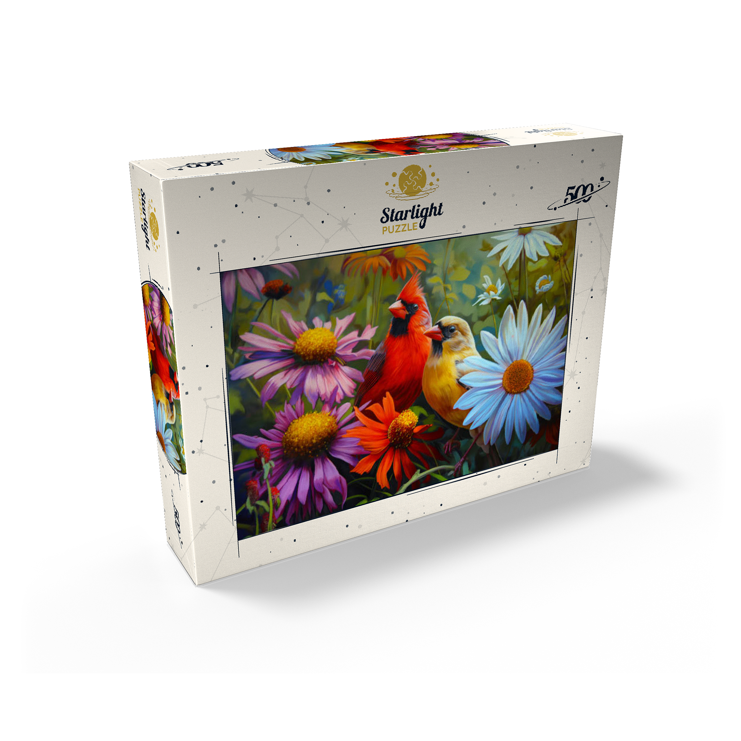 This vibrant illustration captures the beauty of a male and female Northern Cardinal perched among blooming wildflowers, including daisies and coneflowers. The male cardinal's striking red plumage contrasts with the female's soft yellow and brown tones, creating a harmonious yet colorful scene. The lush greenery and delicate floral details highlight the serene beauty of nature, making it a captivating portrayal of wildlife and seasonal blossoms.