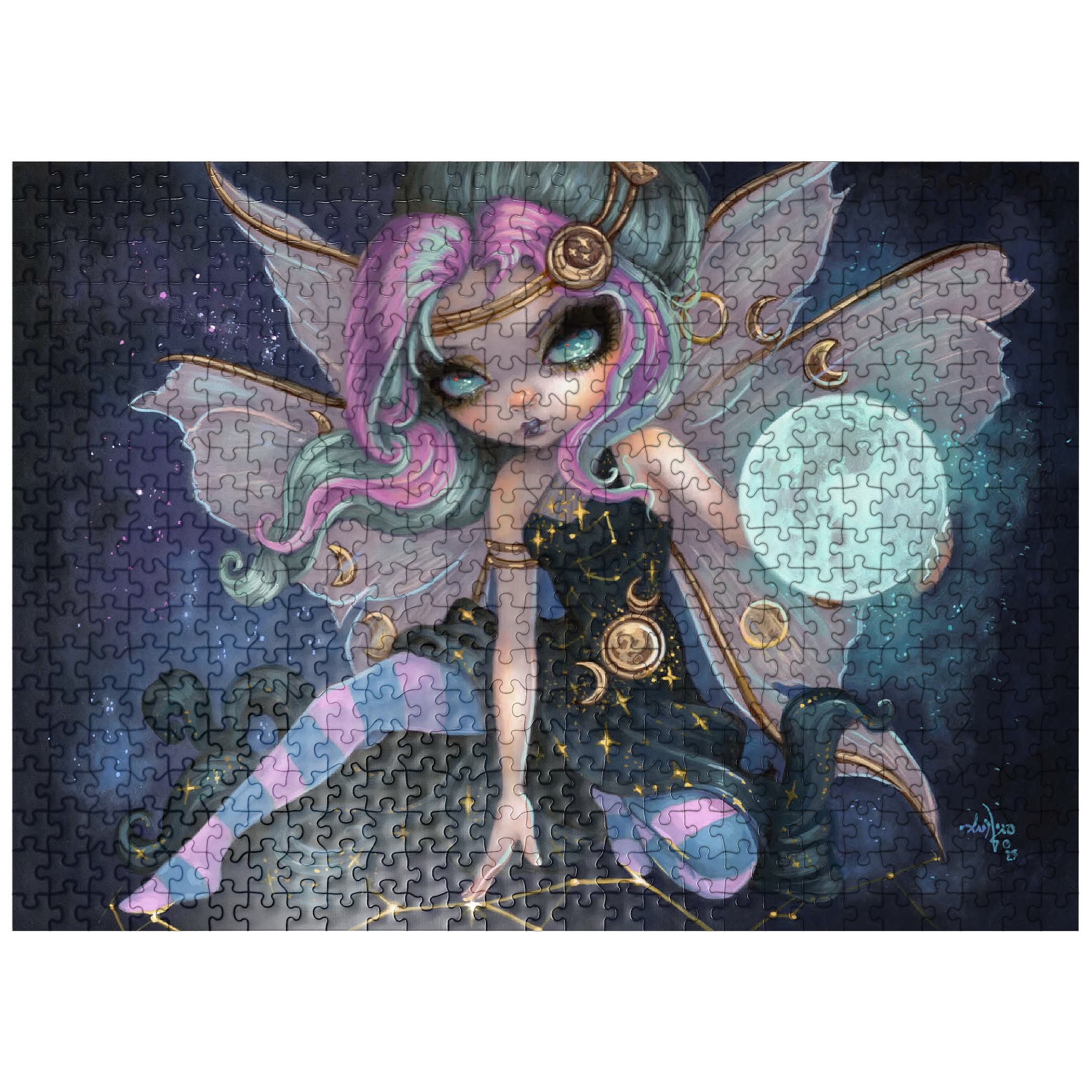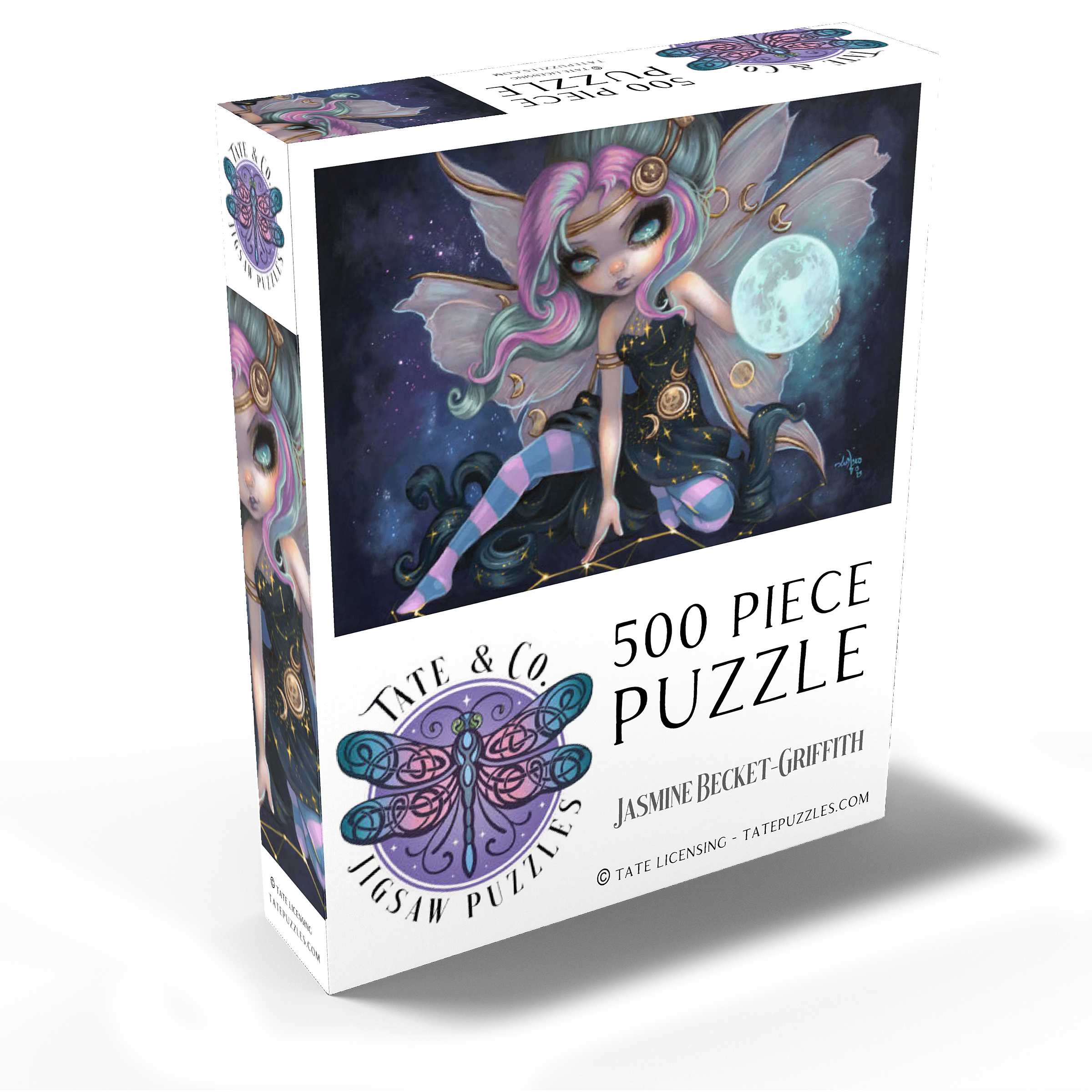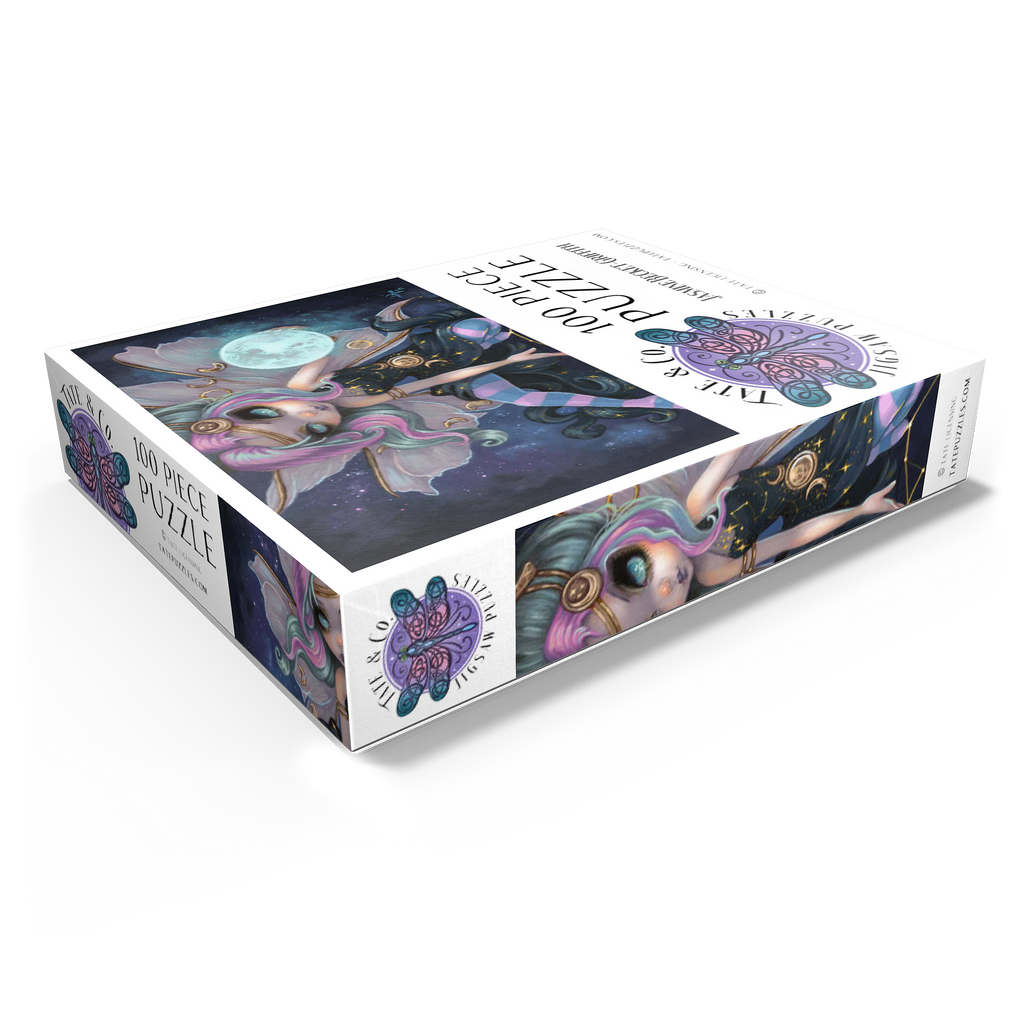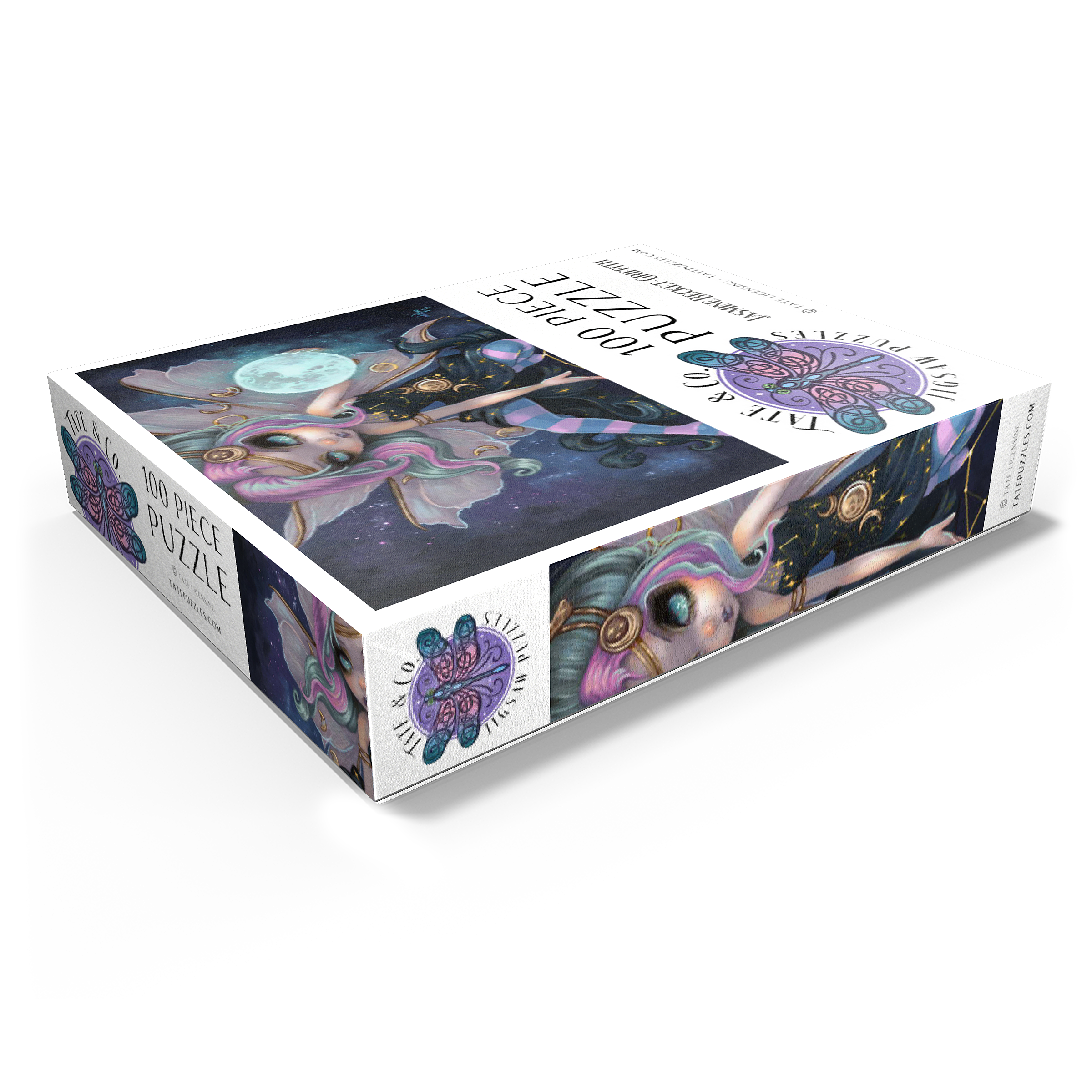 Glimmering among the stars, the captivating Onyx Moonshadow puzzle features a beautiful celestial Strangeling fairy. Shining darkly in the constellations, she elegantly holds the Moon in the palm of her hand. This beloved, dark fantasy artwork captures the mystique of the cosmos and the magic of the night sky. Assemble this favorite fairy painting and bring the lunar shadow to life. A stunning puzzle for celestial and fantasy art fans!
