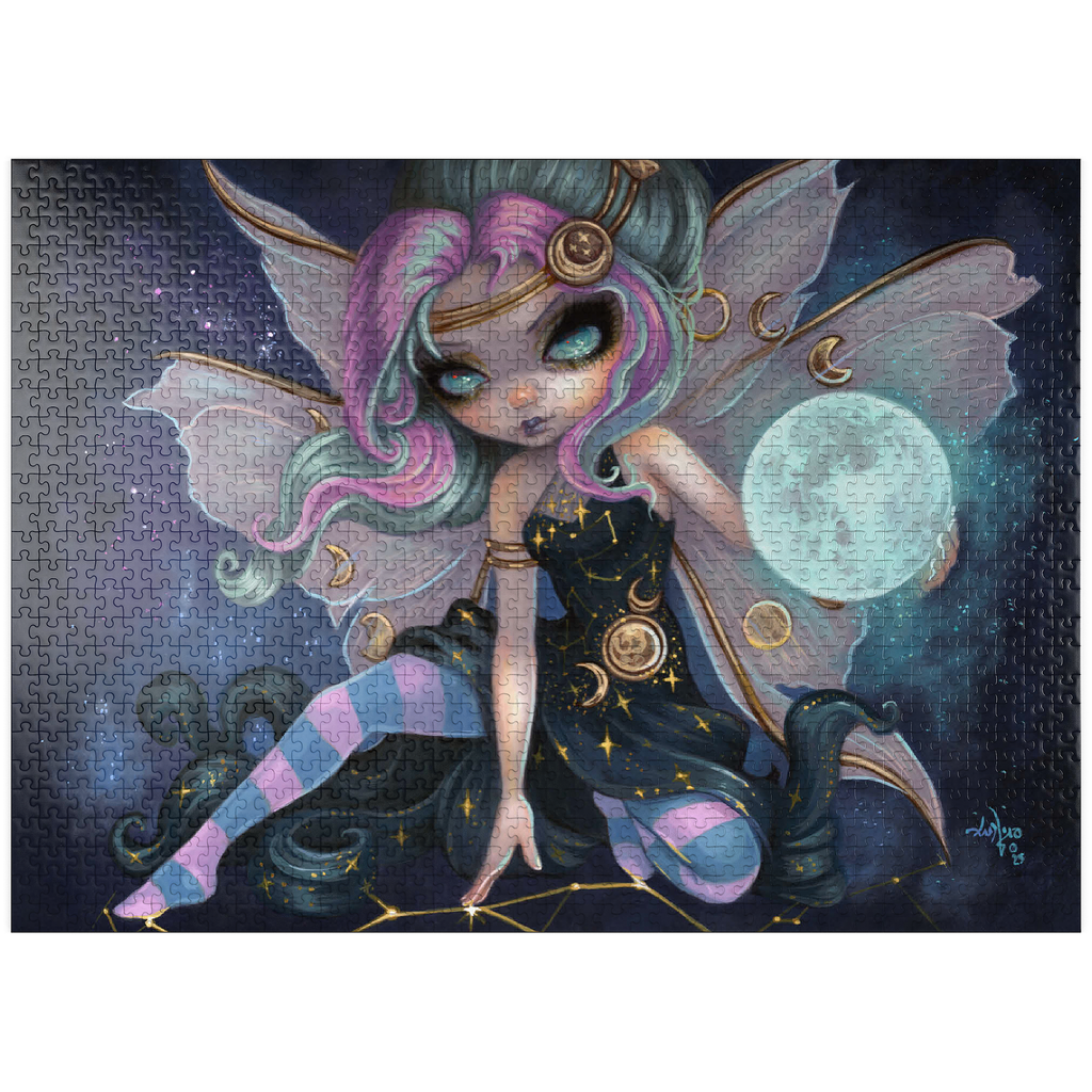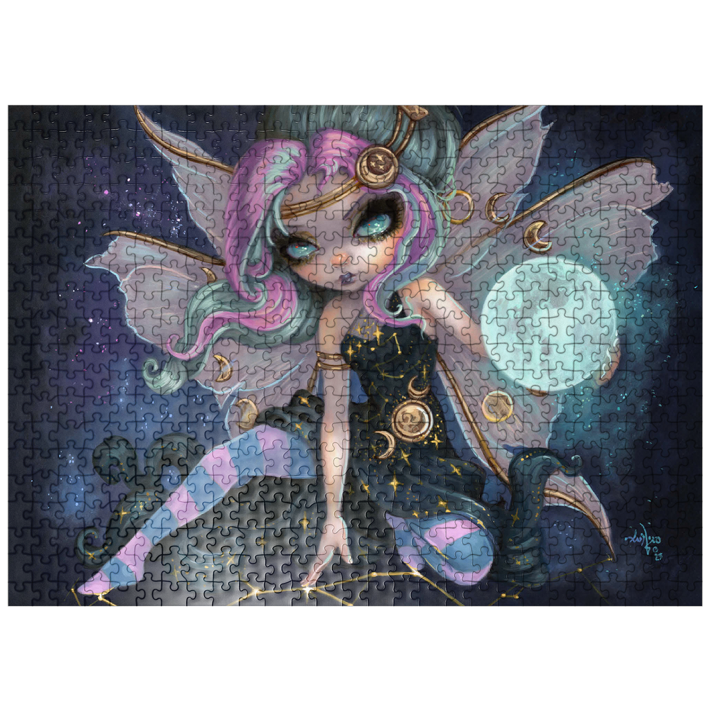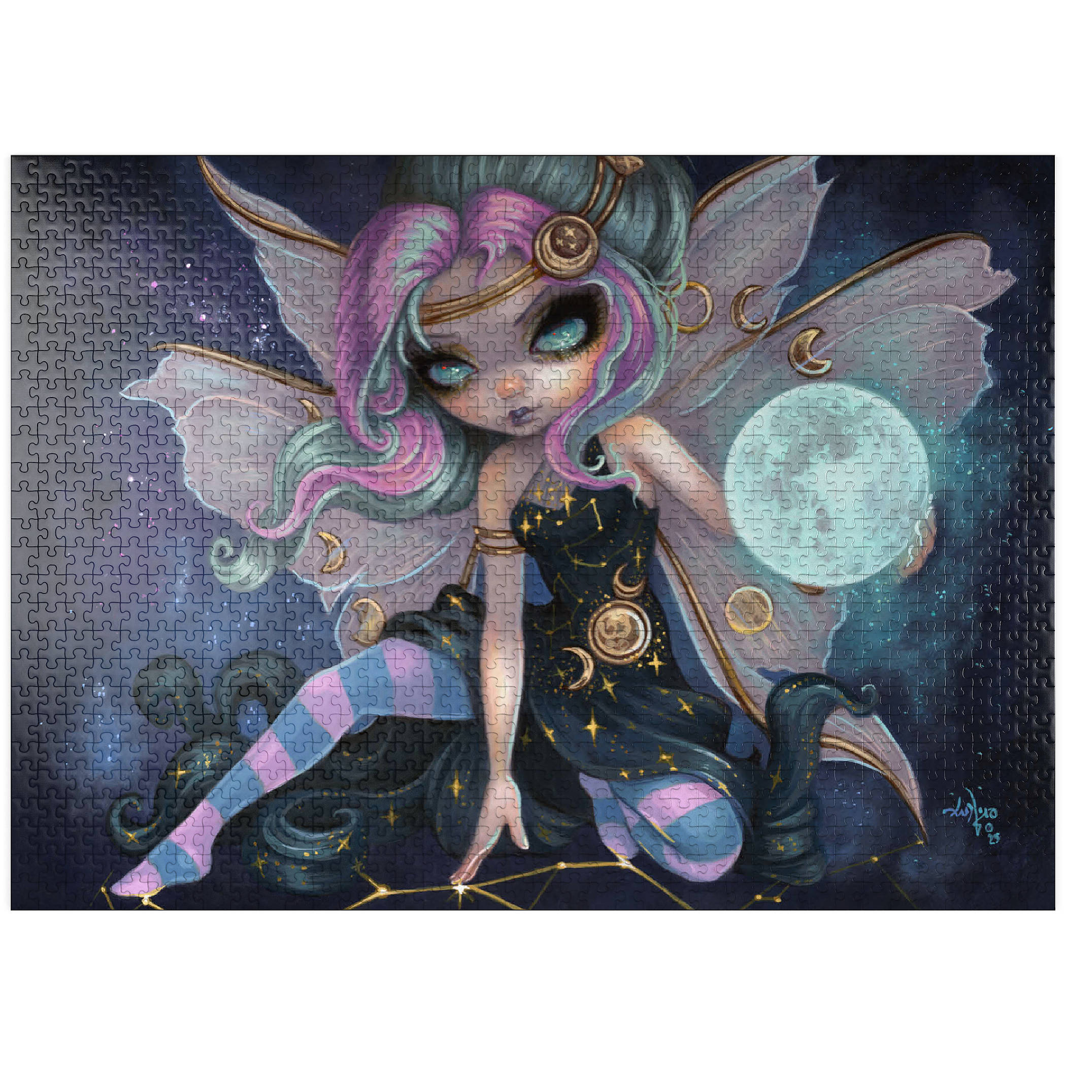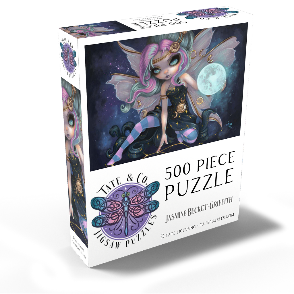 Glimmering among the stars, the captivating Onyx Moonshadow puzzle features a beautiful celestial Strangeling fairy. Shining darkly in the constellations, she elegantly holds the Moon in the palm of her hand. This beloved, dark fantasy artwork captures the mystique of the cosmos and the magic of the night sky. Assemble this favorite fairy painting and bring the lunar shadow to life. A stunning puzzle for celestial and fantasy art fans!