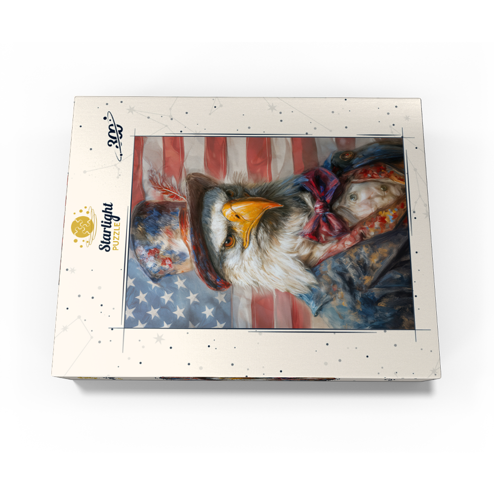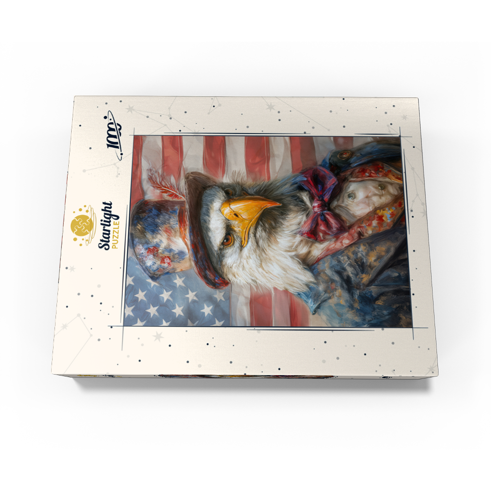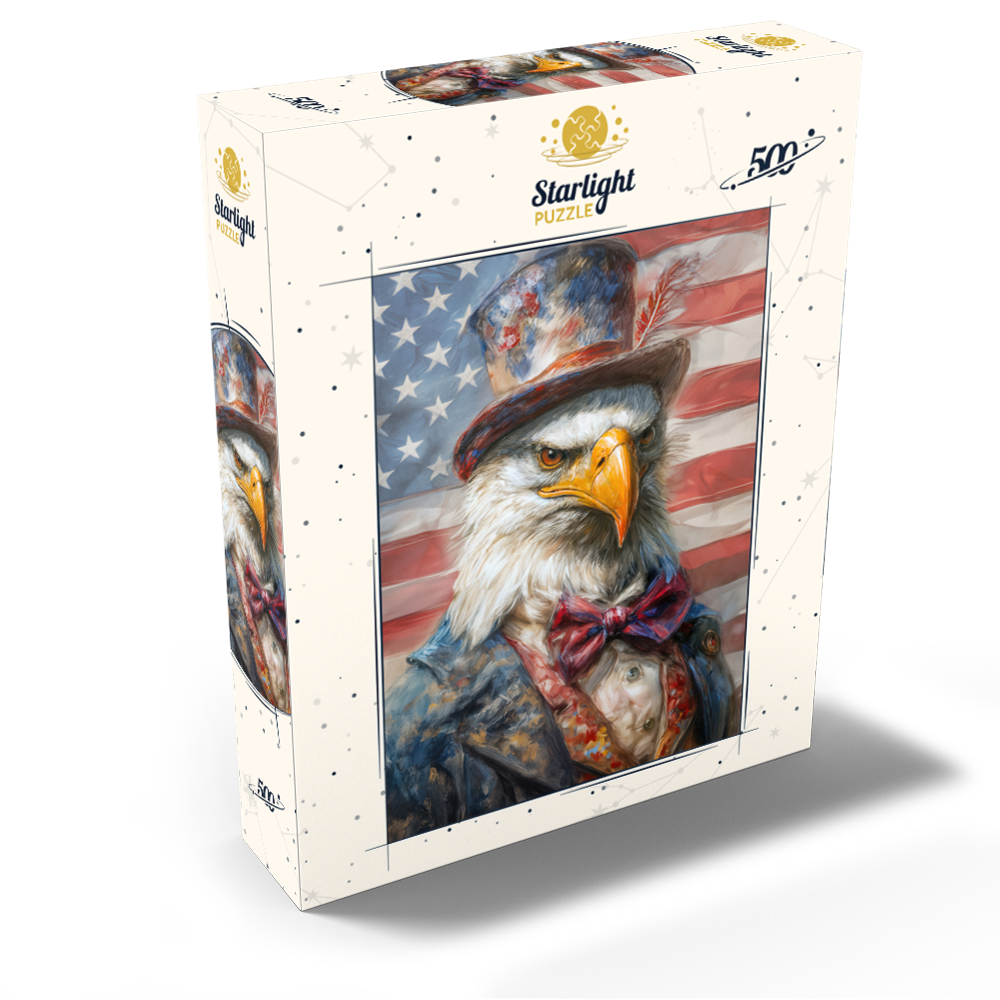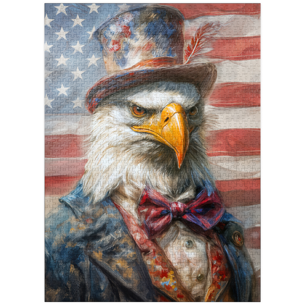 A patriotic bald eagle wearing an Uncle Sam top hat and vintage red white and blue suit is shown in front of the United States flag, creating a bold Americana freedom theme for USA national pride decor. The design emphasizes the eagle intense gaze, golden beak, and detailed feathers, with dramatic lighting and a soft textured look that adds depth and a heroic mood. Stars and stripes elements reinforce classic Fourth of July style, making it highly relevant for Independence Day, Veterans Day, Memorial Day, and patriotic home or office wall art. Strong search intent keywords include American bald eagle, US flag background, liberty, freedom, and USA symbol.