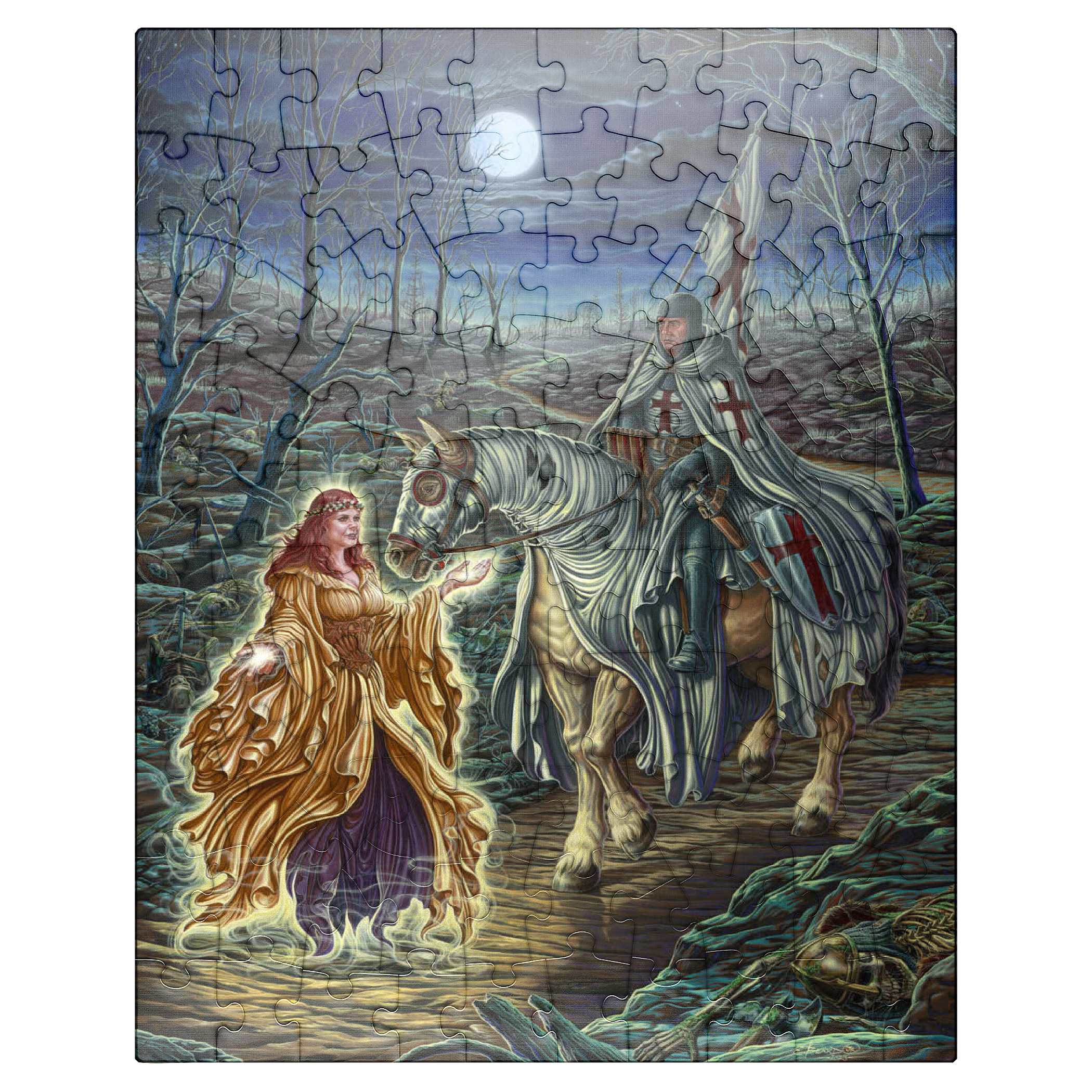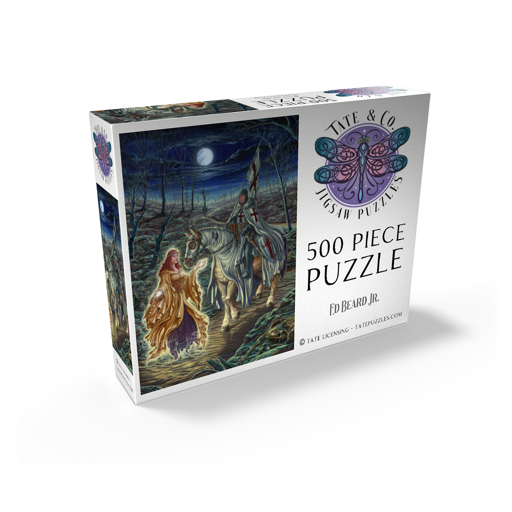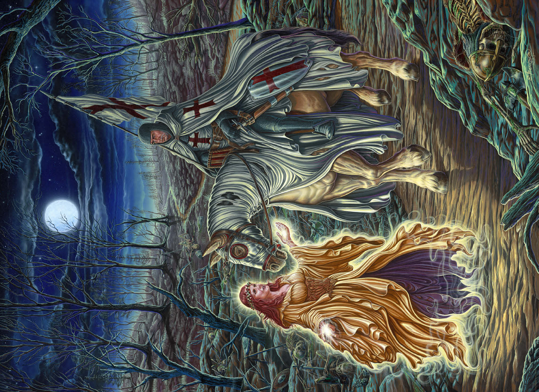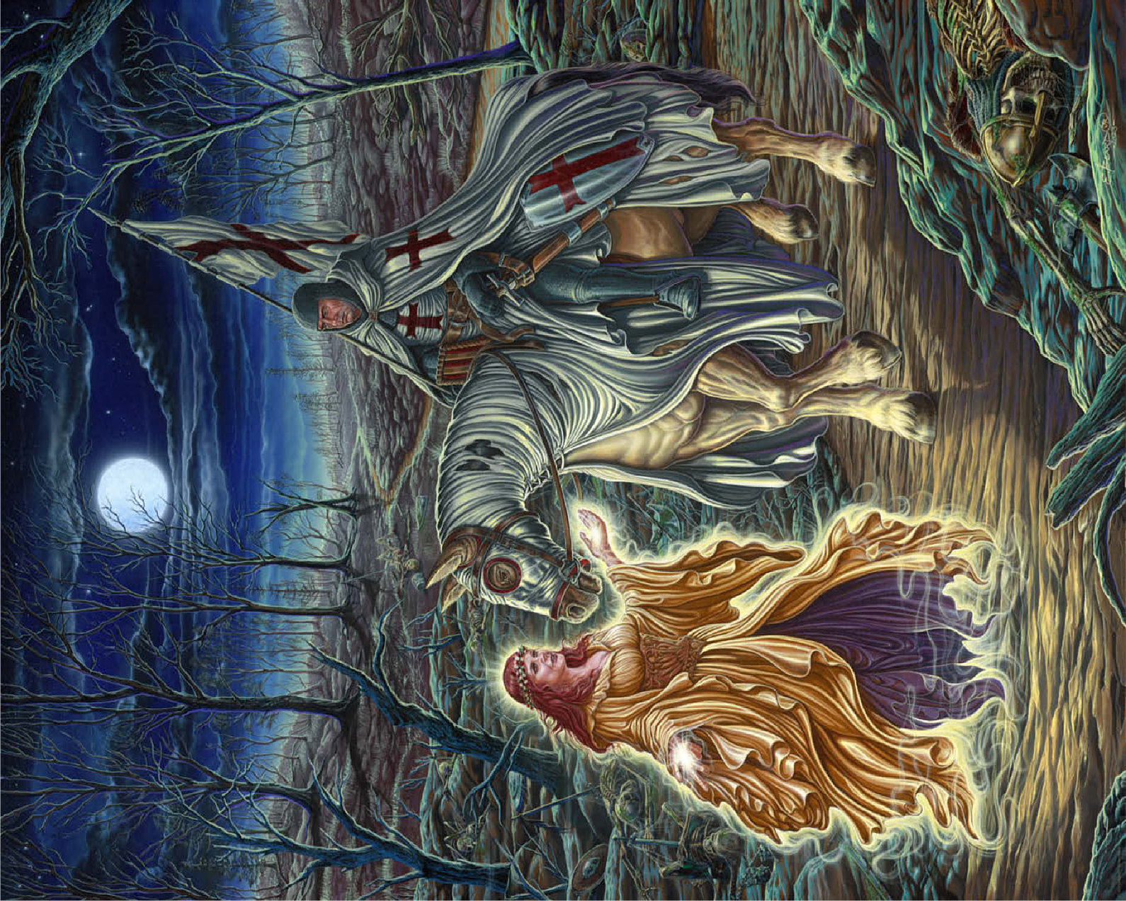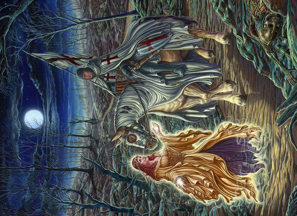 This brave and noble Knights Templar is the last of his order. Insurmountable battles have taken its toll on this soldier. He holds firm to his flag and is guided by his trusty steed through a perilous forest, stricken with echoes of the remains of fallen warriors of the past. A gravely haunted evil place surrounds him in his final moments. Alas, due to his honorable and pure heart, a guiding angel spirit appears before him only seen or detected by his horse. She leads them to safety.