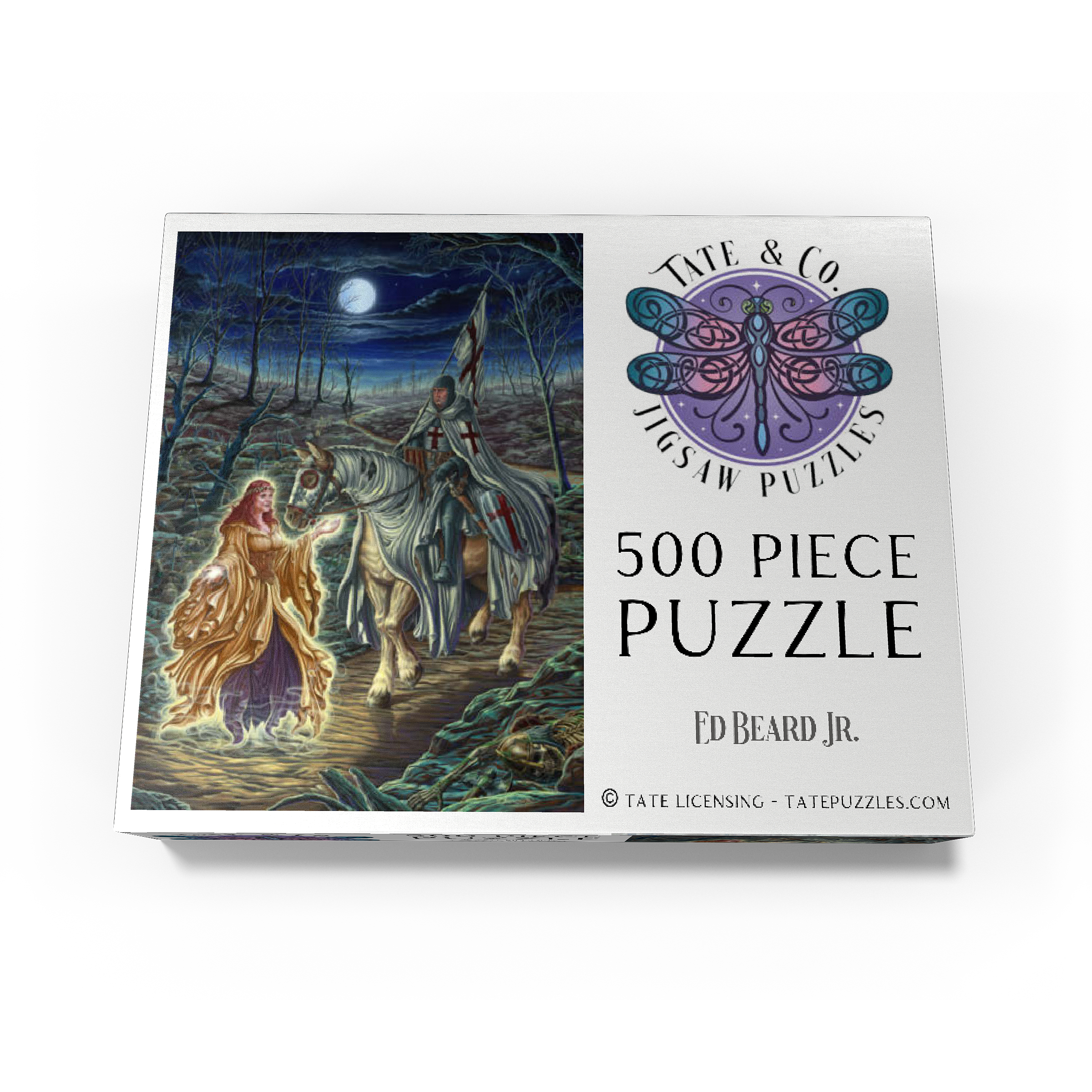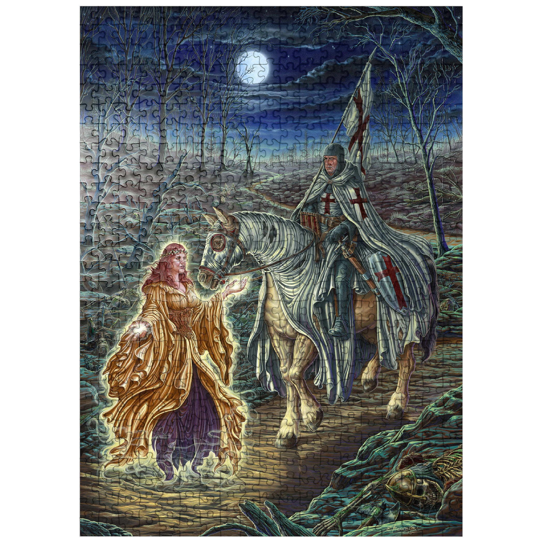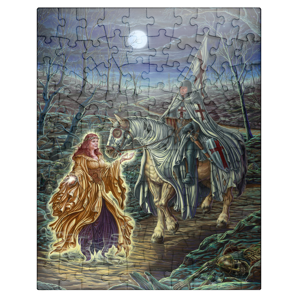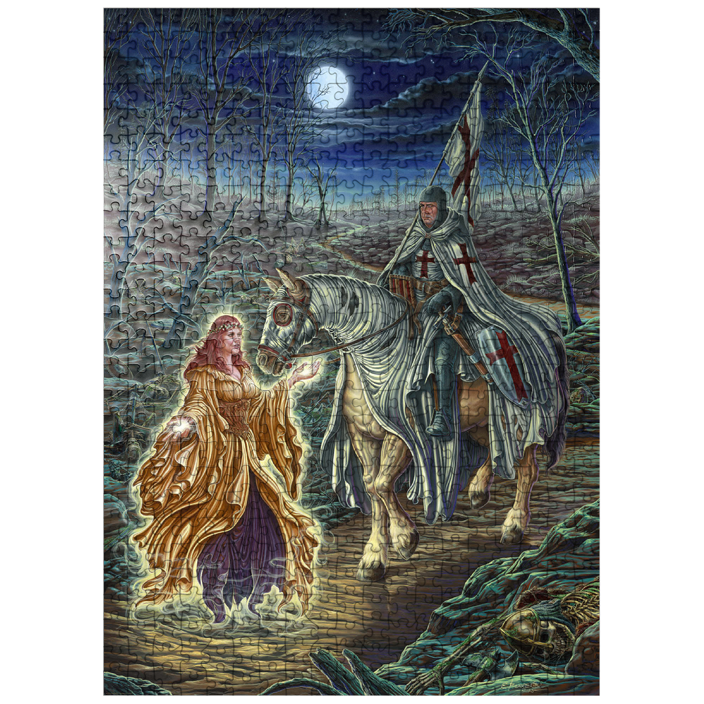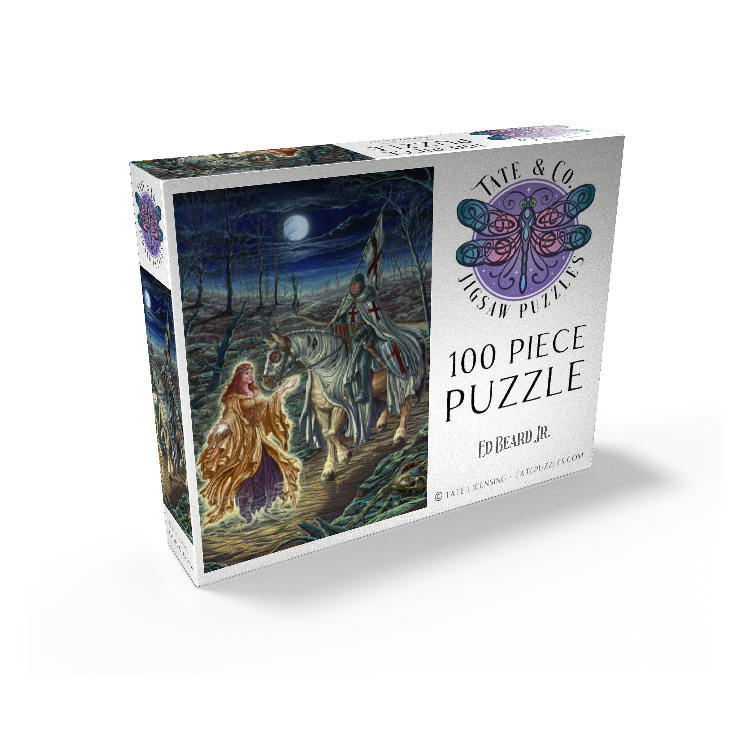 This brave and noble Knights Templar is the last of his order. Insurmountable battles have taken its toll on this soldier. He holds firm to his flag and is guided by his trusty steed through a perilous forest, stricken with echoes of the remains of fallen warriors of the past. A gravely haunted evil place surrounds him in his final moments. Alas, due to his honorable and pure heart, a guiding angel spirit appears before him only seen or detected by his horse. She leads them to safety.