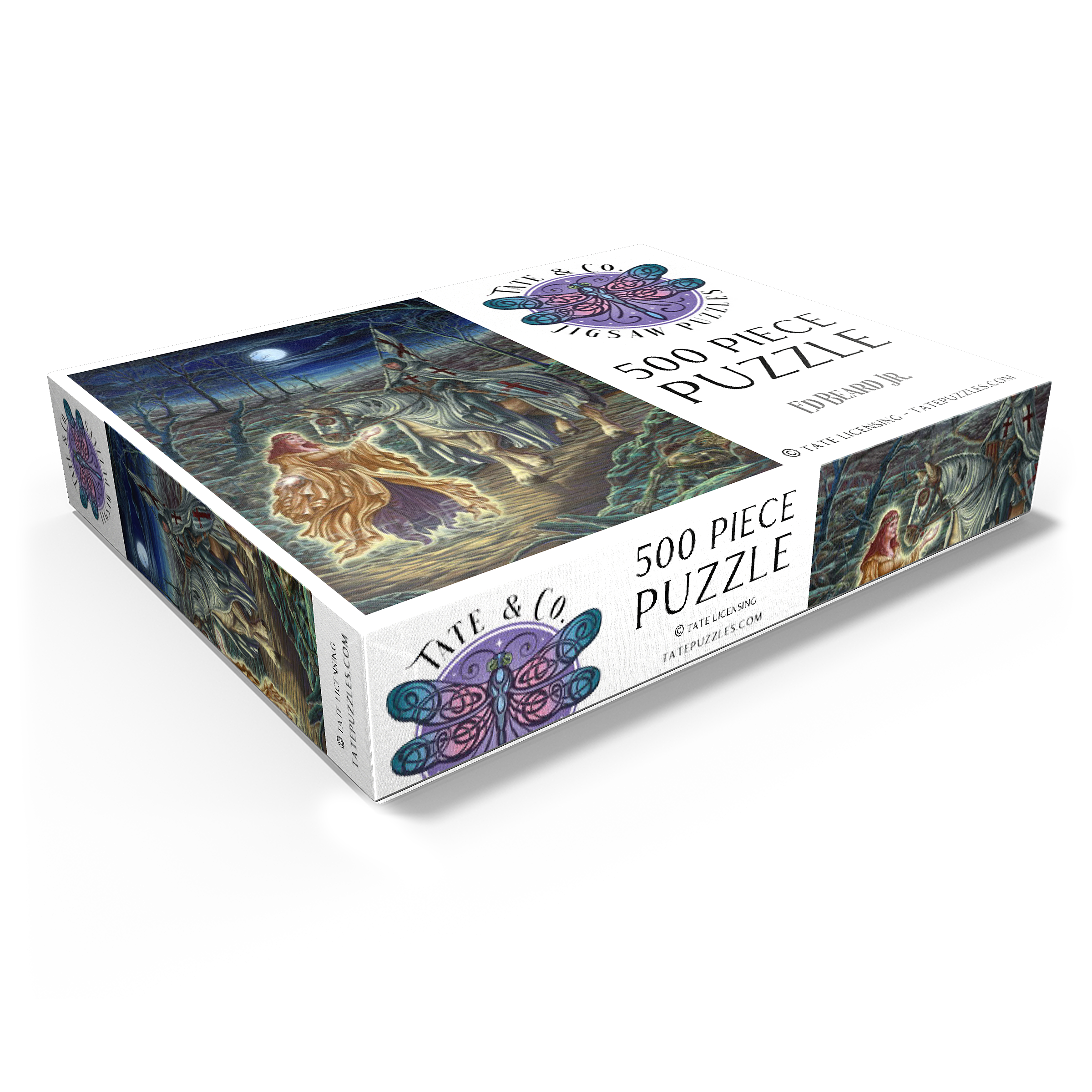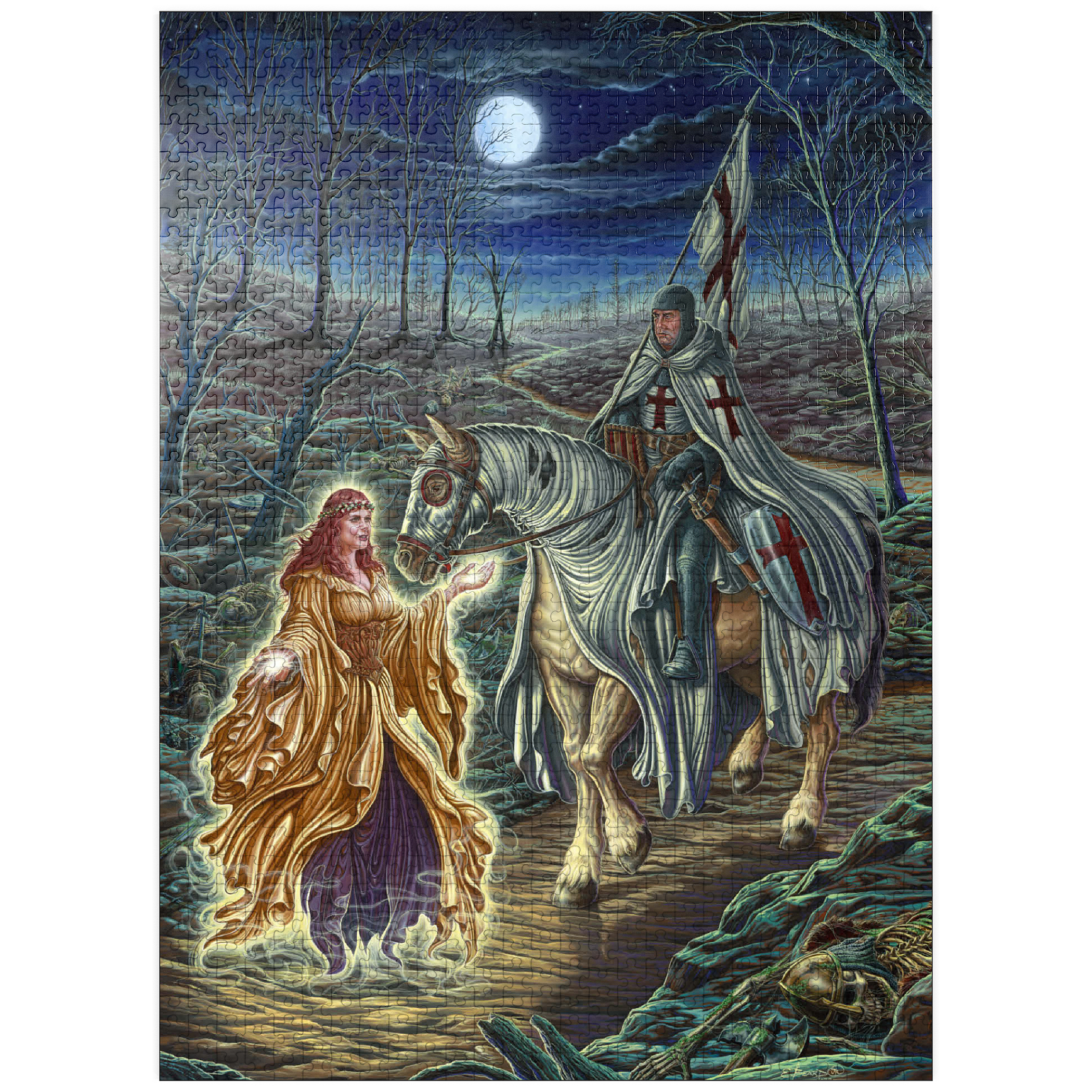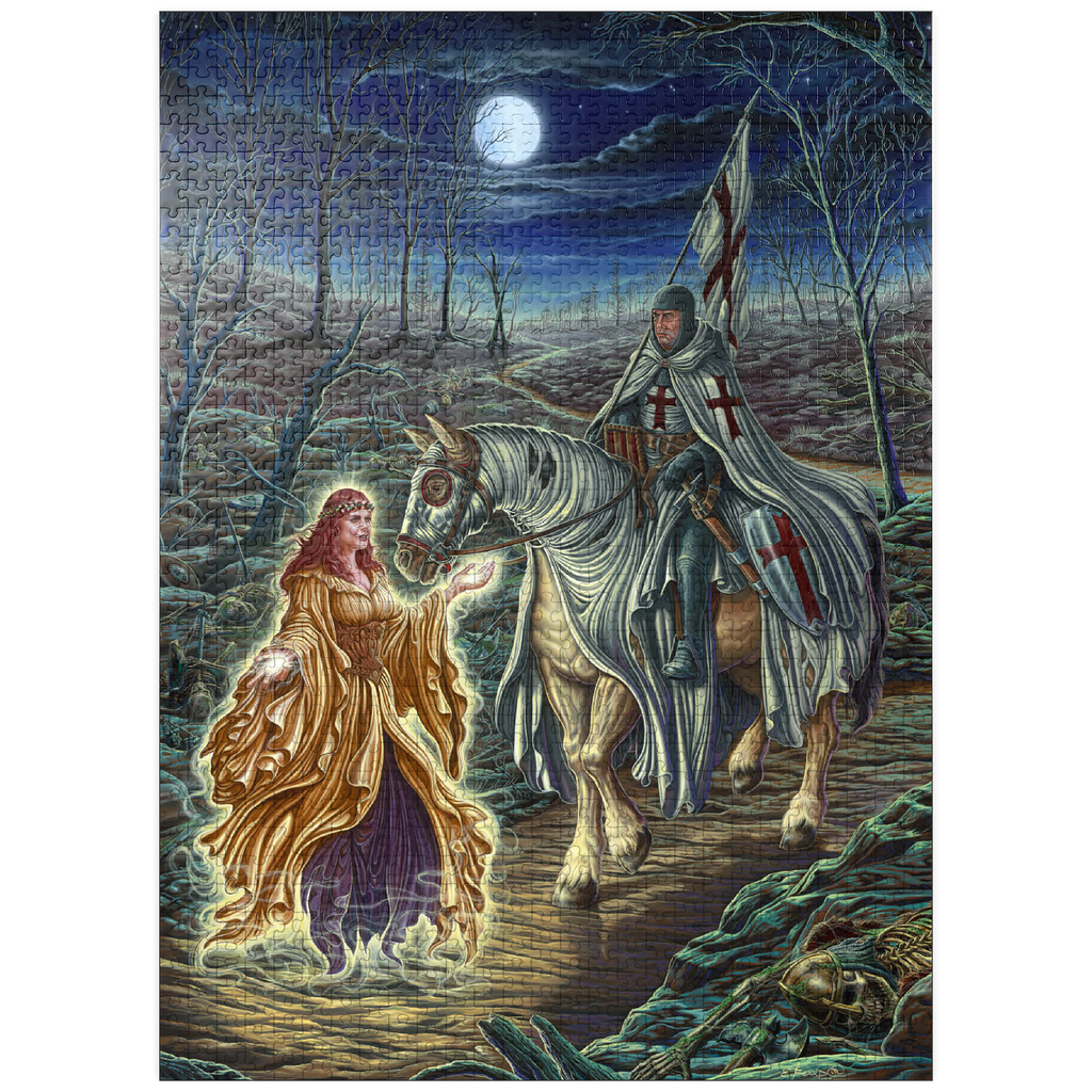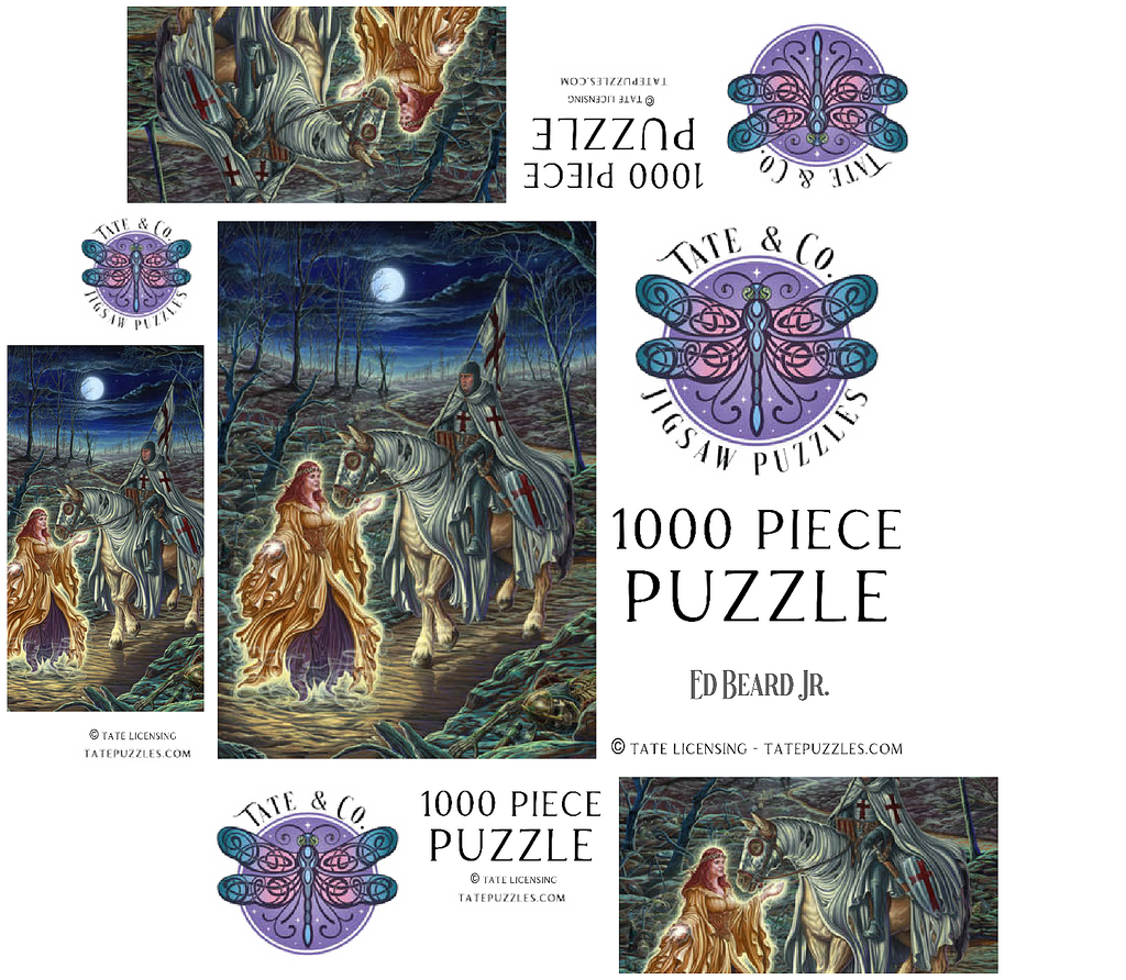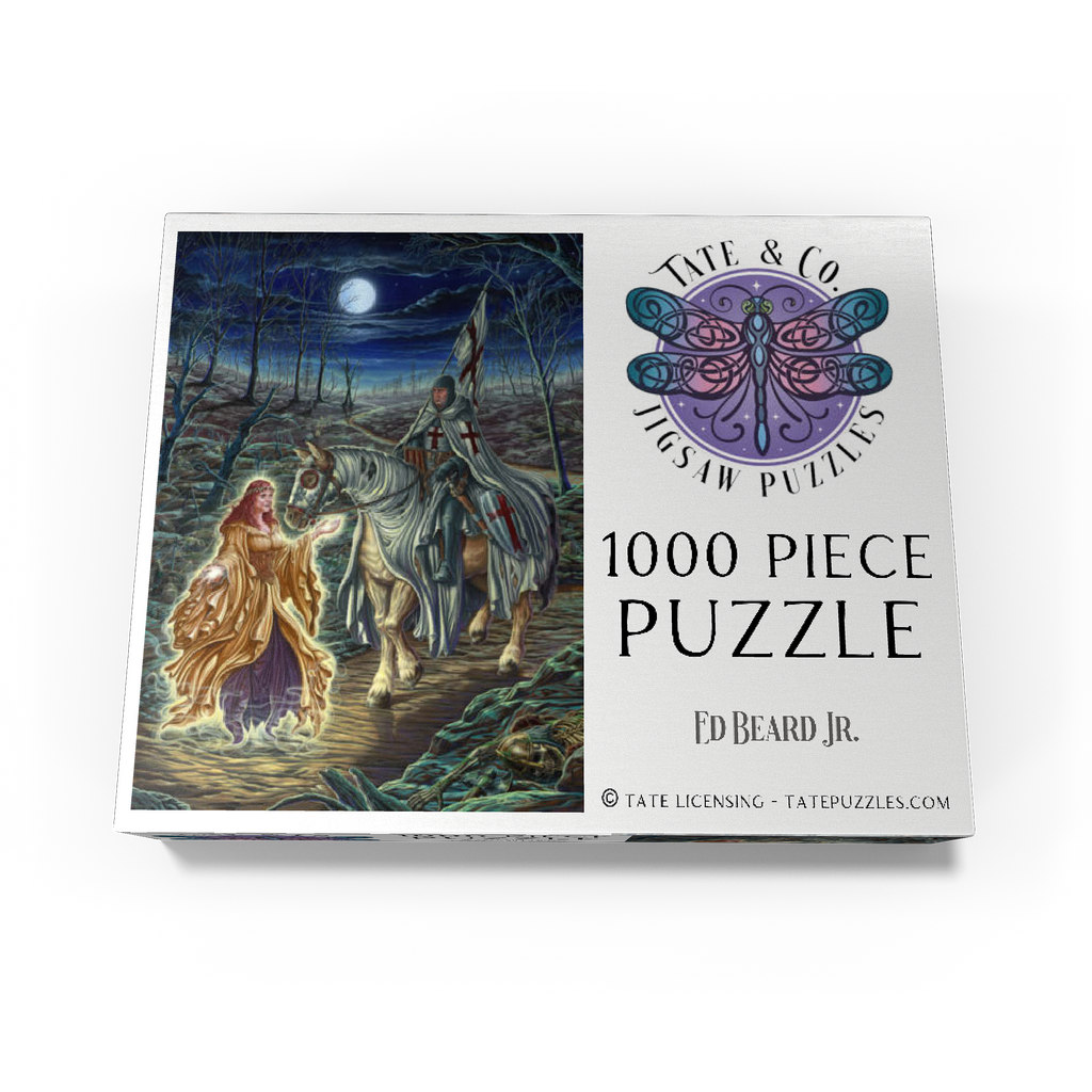 This brave and noble Knights Templar is the last of his order. Insurmountable battles have taken its toll on this soldier. He holds firm to his flag and is guided by his trusty steed through a perilous forest, stricken with echoes of the remains of fallen warriors of the past. A gravely haunted evil place surrounds him in his final moments. Alas, due to his honorable and pure heart, a guiding angel spirit appears before him only seen or detected by his horse. She leads them to safety.