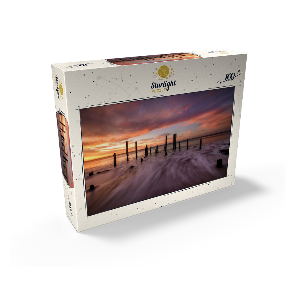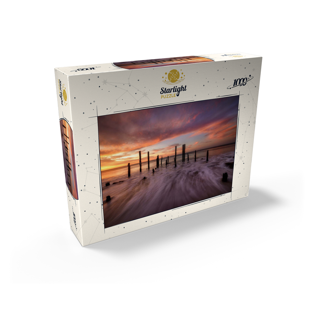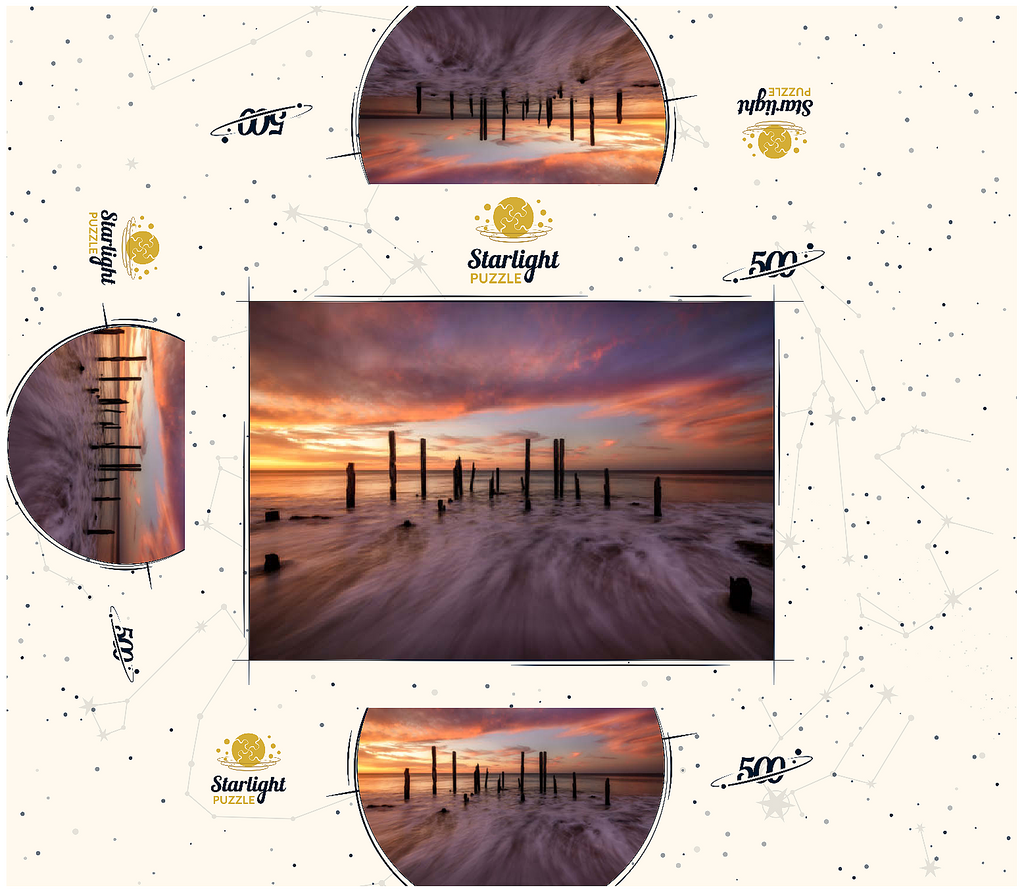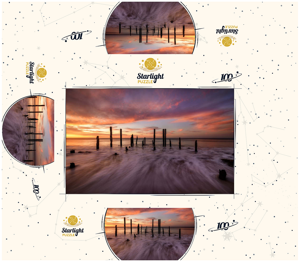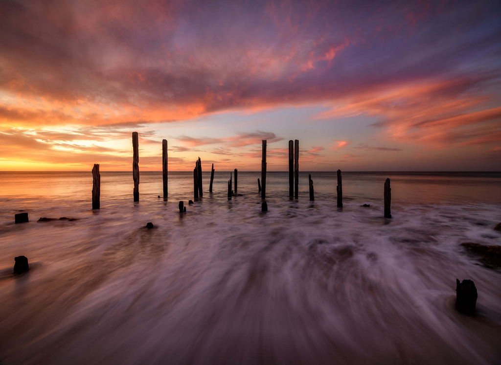 The Port Willunga Jetty Ruins in South Australia offer a dramatic coastal scene, with weathered wooden pylons standing resilient against the ocean tides. As the sun sets, the sky ignites with vibrant hues of orange, pink, and purple, casting a stunning reflection over the water. The motion of the waves creates a mist-like effect, adding to the ethereal beauty of the shoreline. This iconic destination is a favorite for photographers and visitors seeking the serene ambiance of the Australian coast.