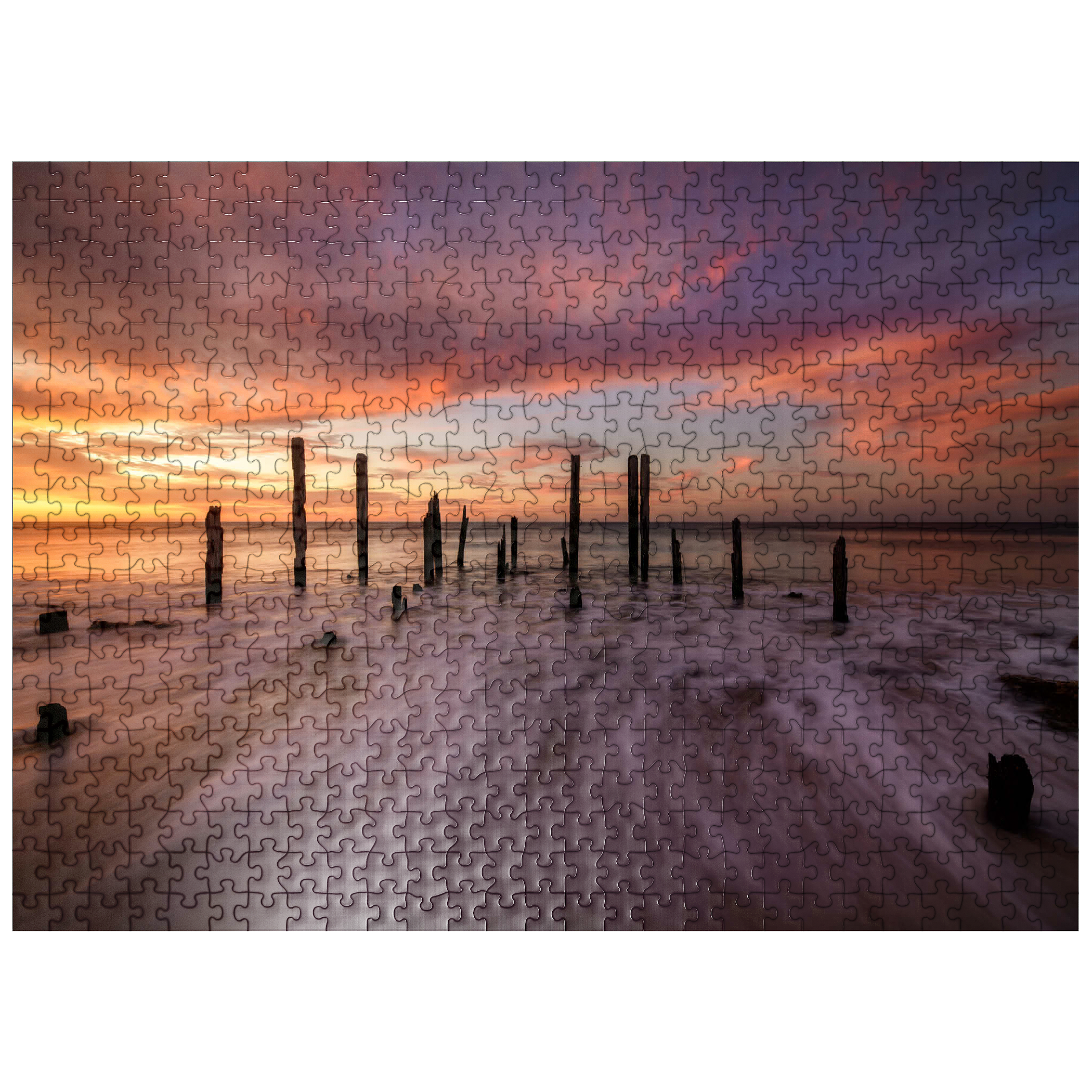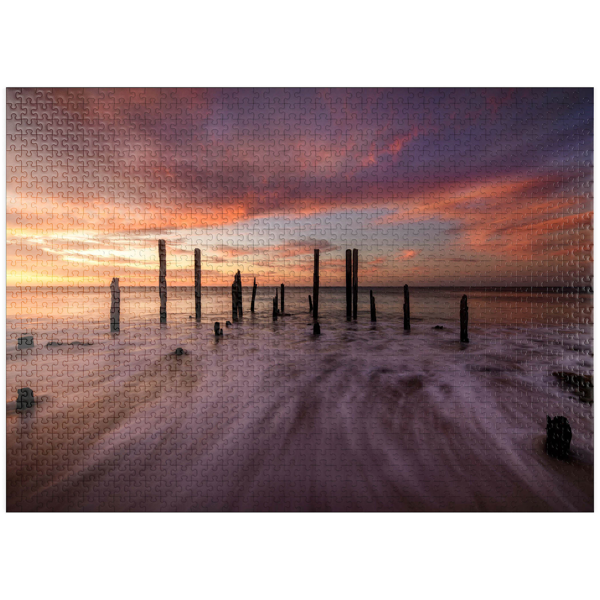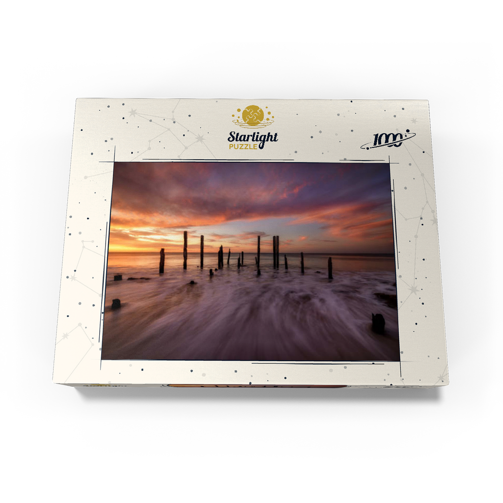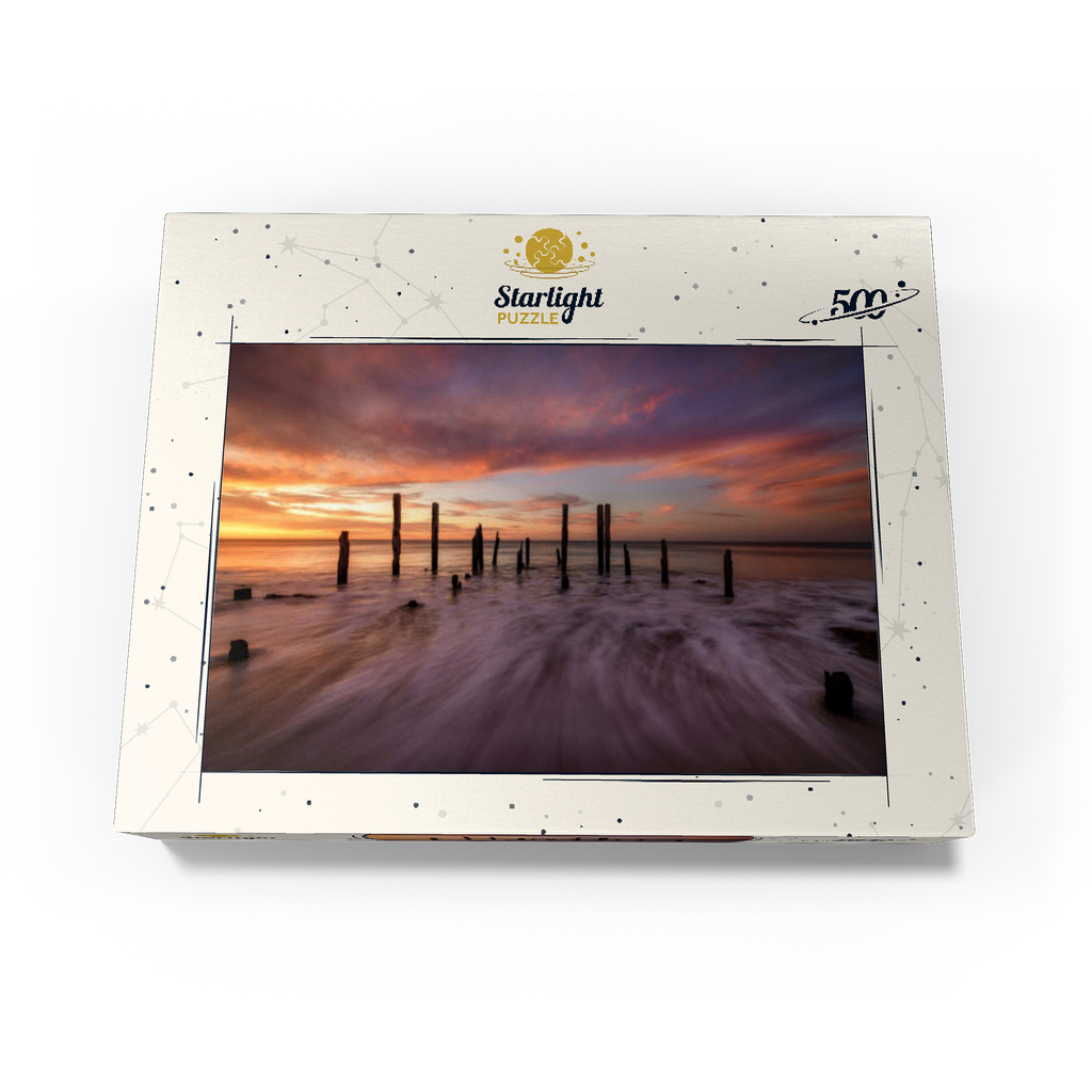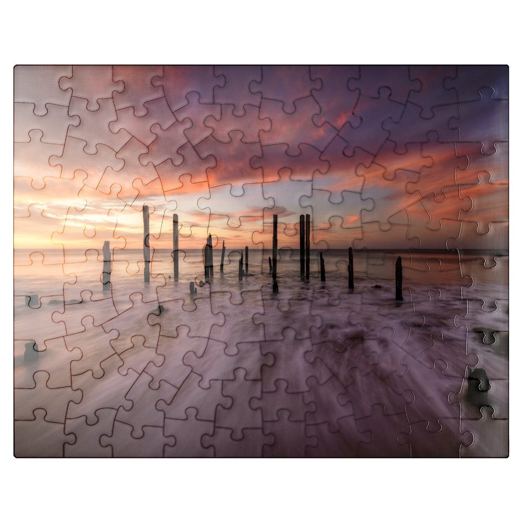 The Port Willunga Jetty Ruins in South Australia offer a dramatic coastal scene, with weathered wooden pylons standing resilient against the ocean tides. As the sun sets, the sky ignites with vibrant hues of orange, pink, and purple, casting a stunning reflection over the water. The motion of the waves creates a mist-like effect, adding to the ethereal beauty of the shoreline. This iconic destination is a favorite for photographers and visitors seeking the serene ambiance of the Australian coast.