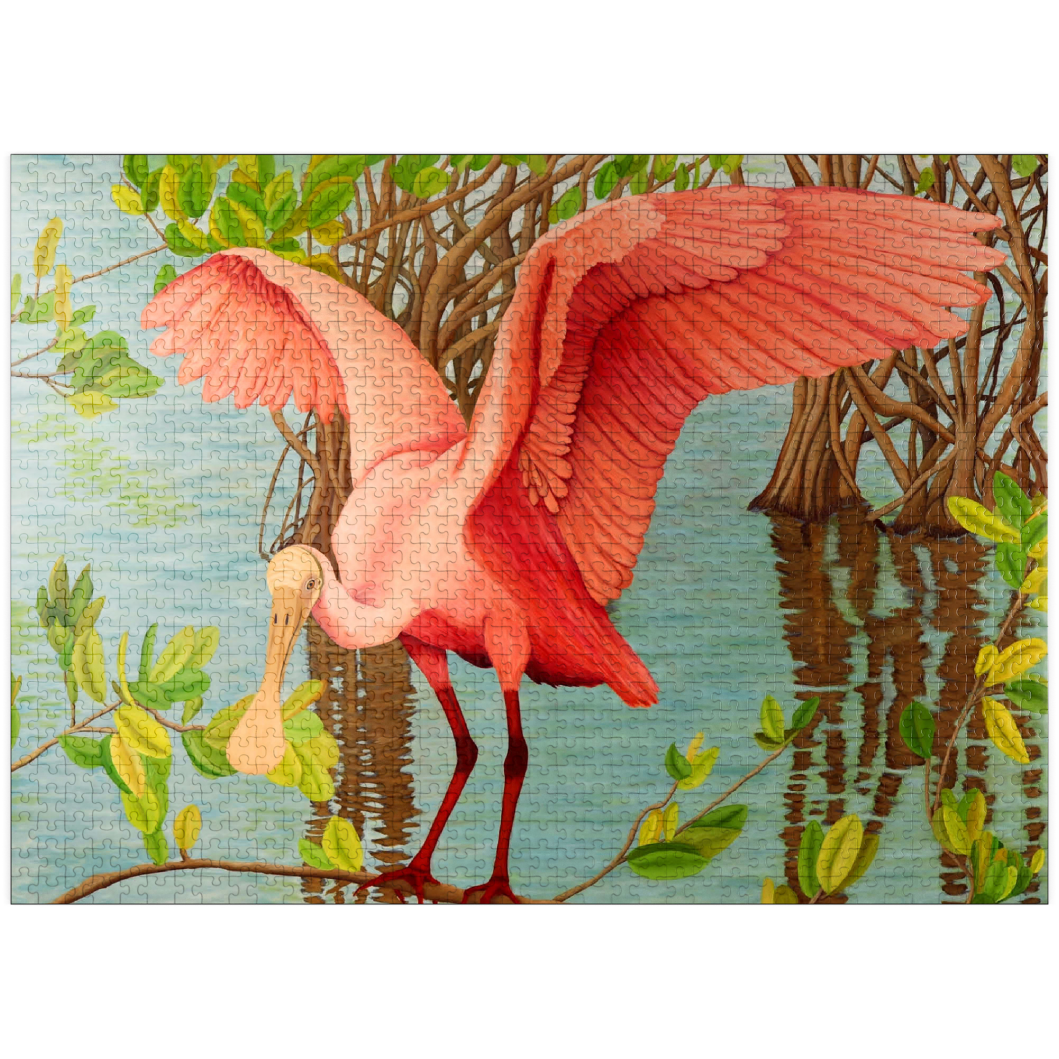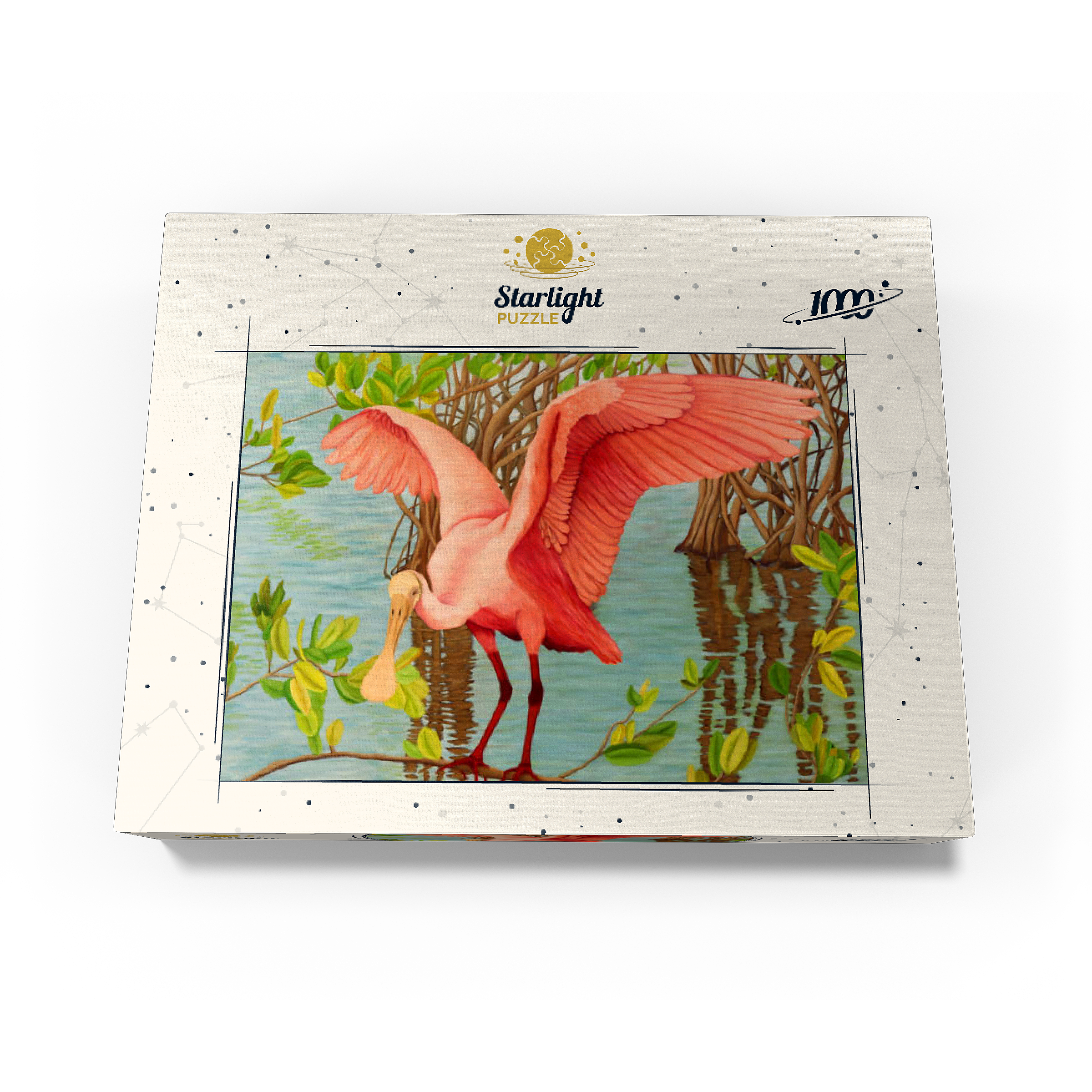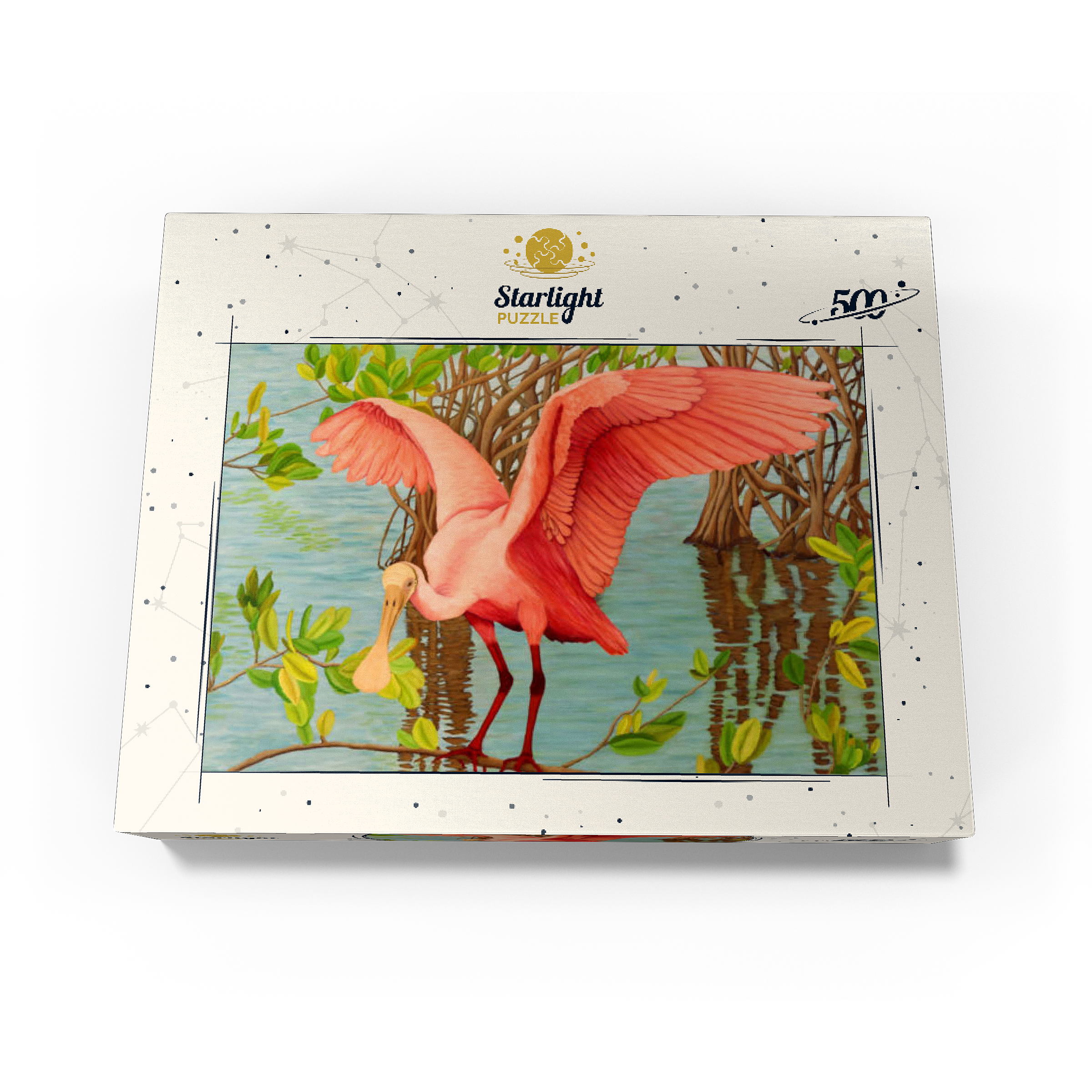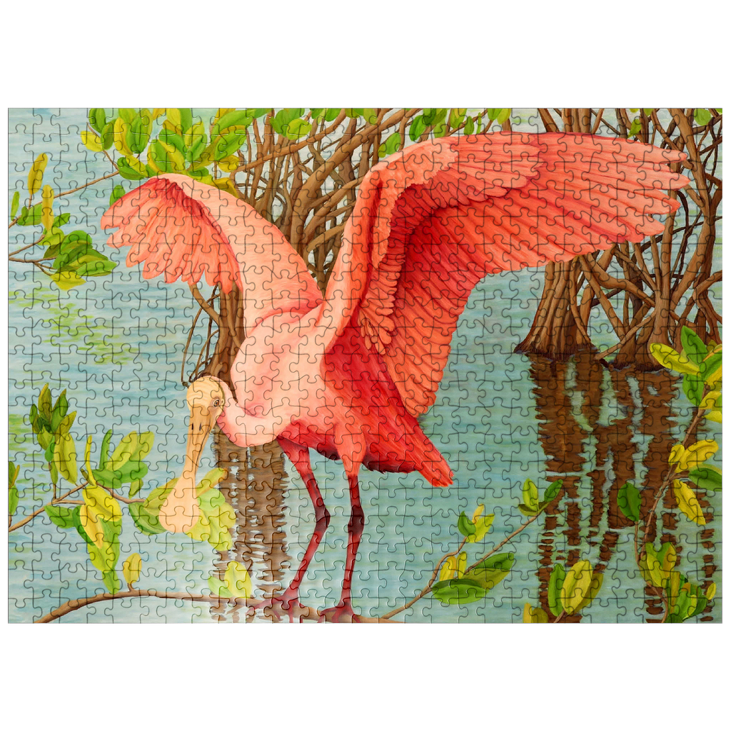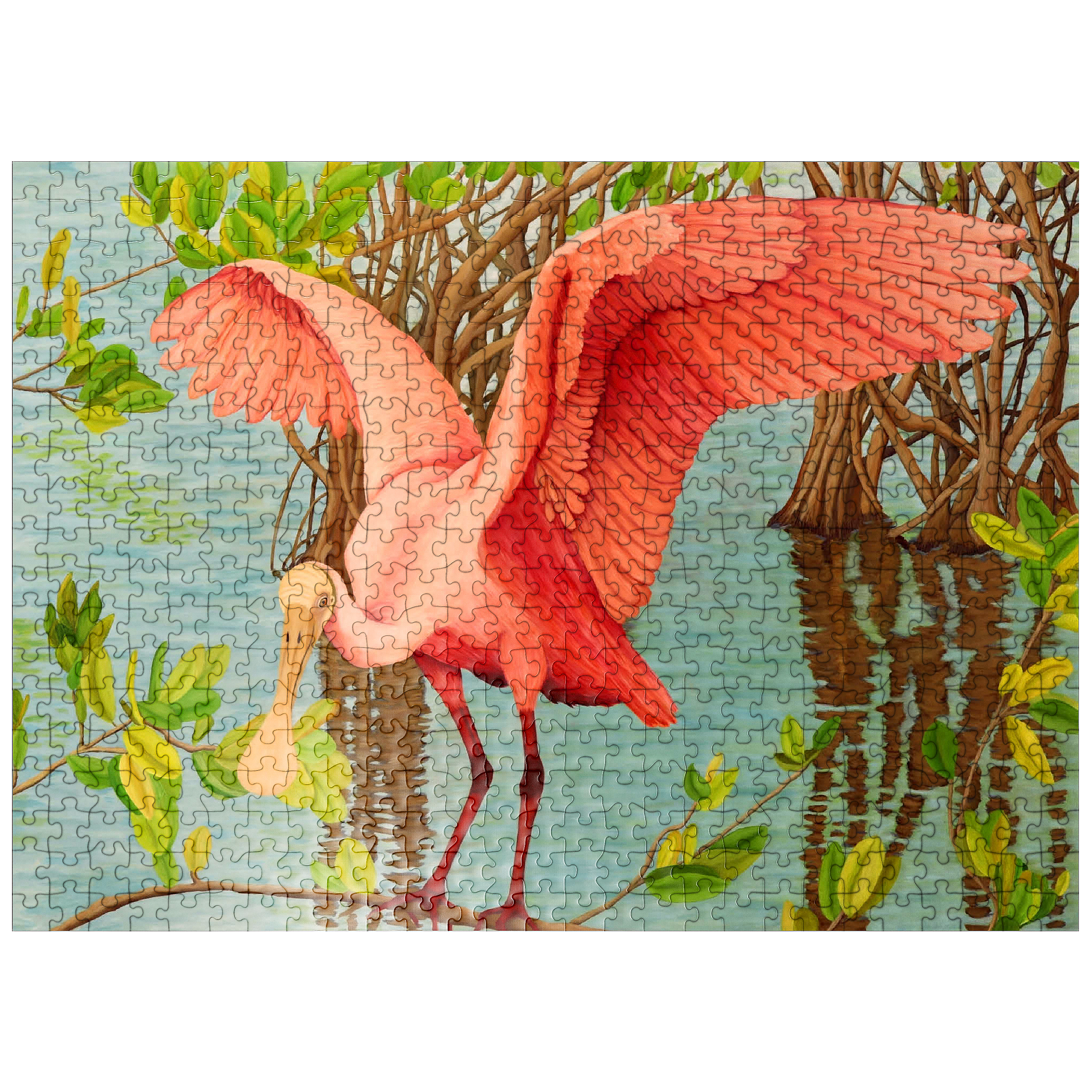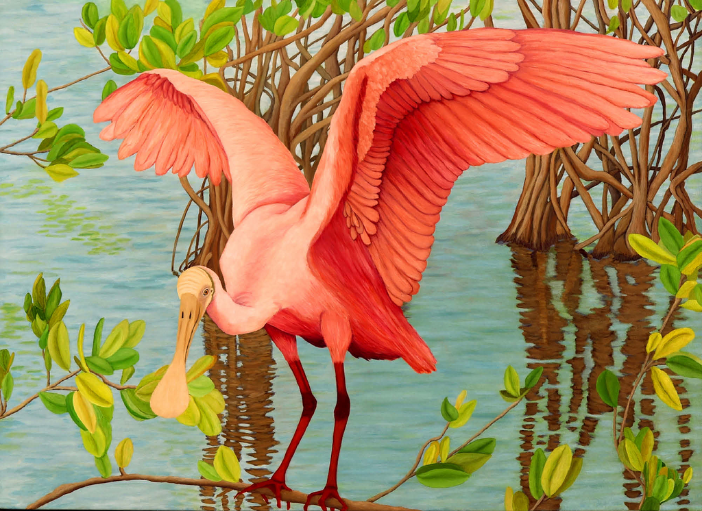 A stunning depiction of a roseate spoonbill gracefully perched among vibrant green mangrove branches in a serene wetland setting. The bird's bright pink plumage contrasts beautifully with the lush greenery and reflective water below. Its unique spoon-shaped bill and outstretched wings add elegance to the composition, highlighting the intricate relationship between this wading bird and its natural habitat. The artwork captures the tranquil beauty of mangrove ecosystems and the charm of this iconic species found in coastal wetlands.