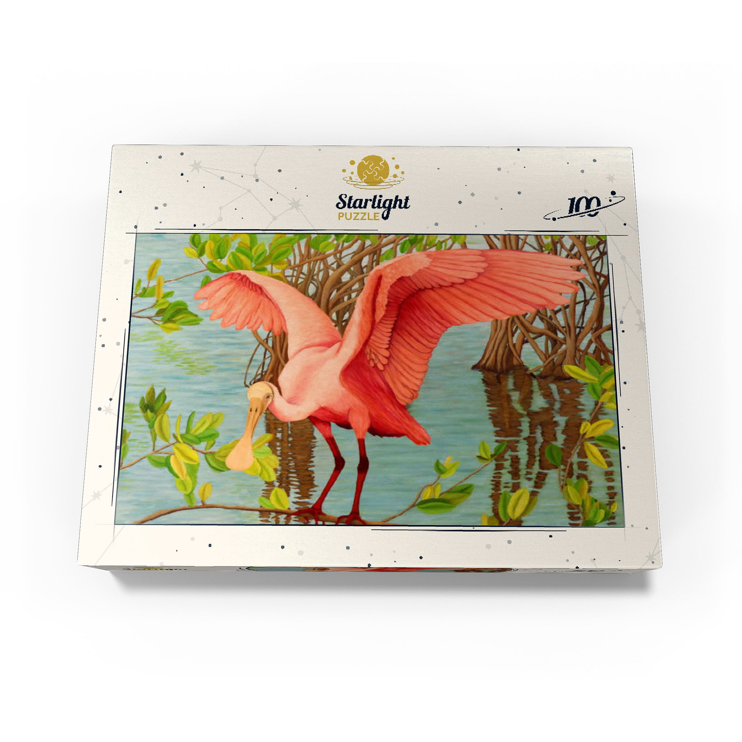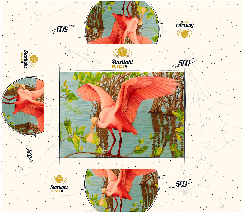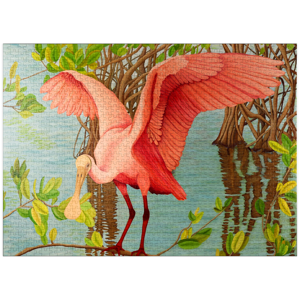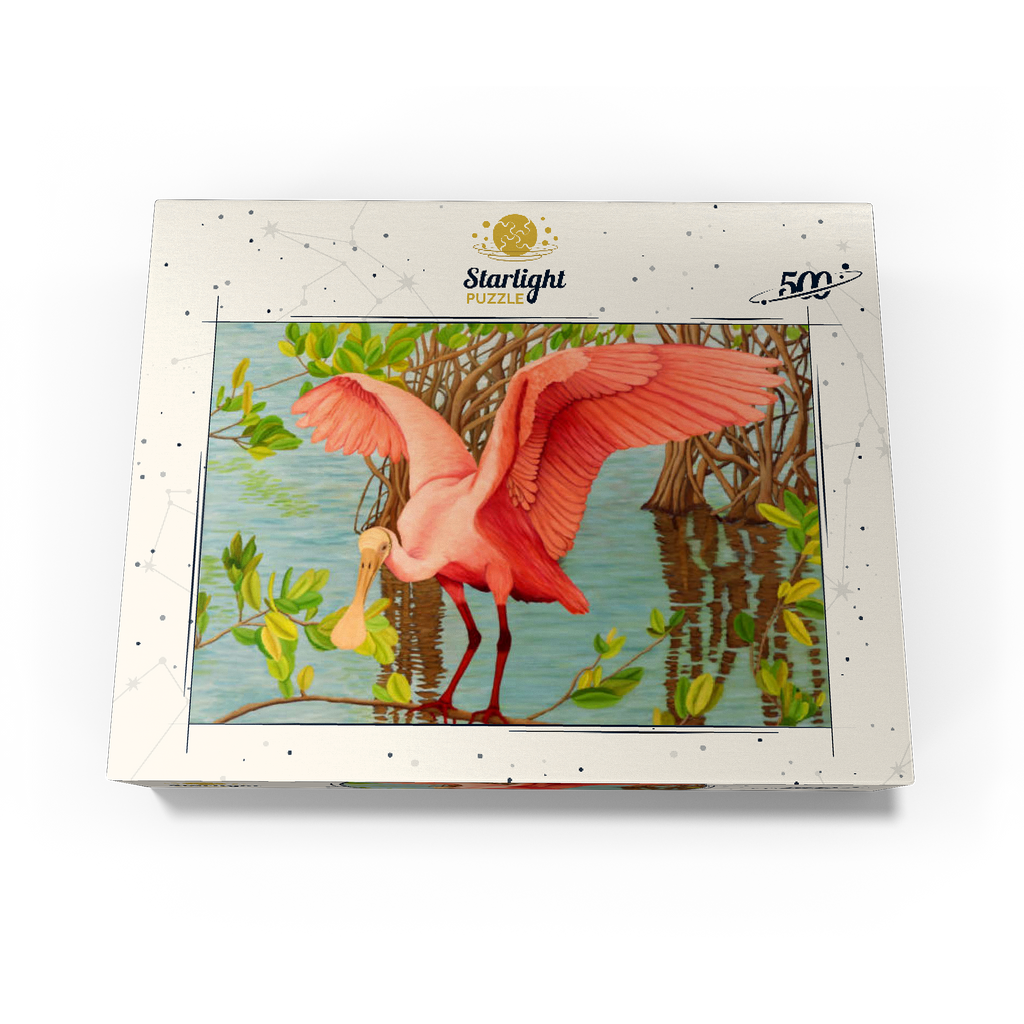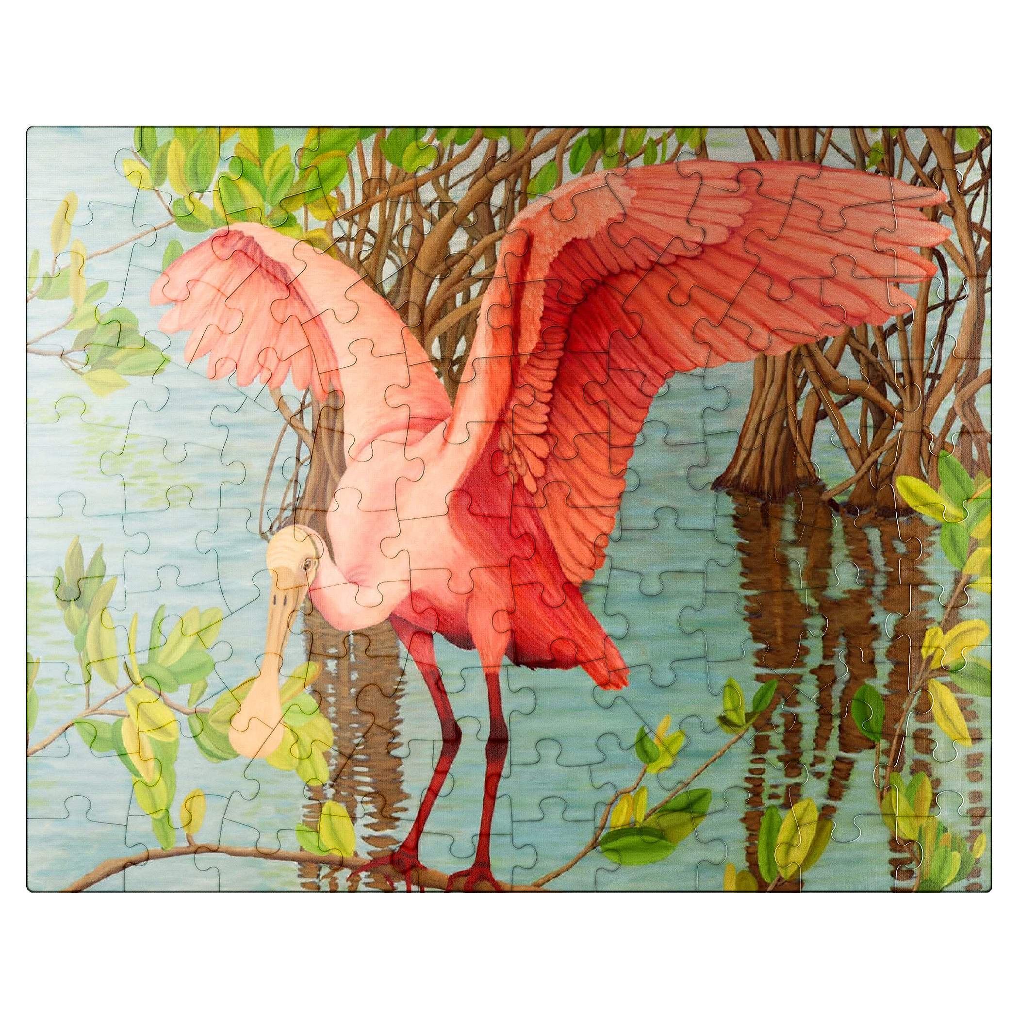 A stunning depiction of a roseate spoonbill gracefully perched among vibrant green mangrove branches in a serene wetland setting. The bird's bright pink plumage contrasts beautifully with the lush greenery and reflective water below. Its unique spoon-shaped bill and outstretched wings add elegance to the composition, highlighting the intricate relationship between this wading bird and its natural habitat. The artwork captures the tranquil beauty of mangrove ecosystems and the charm of this iconic species found in coastal wetlands.
