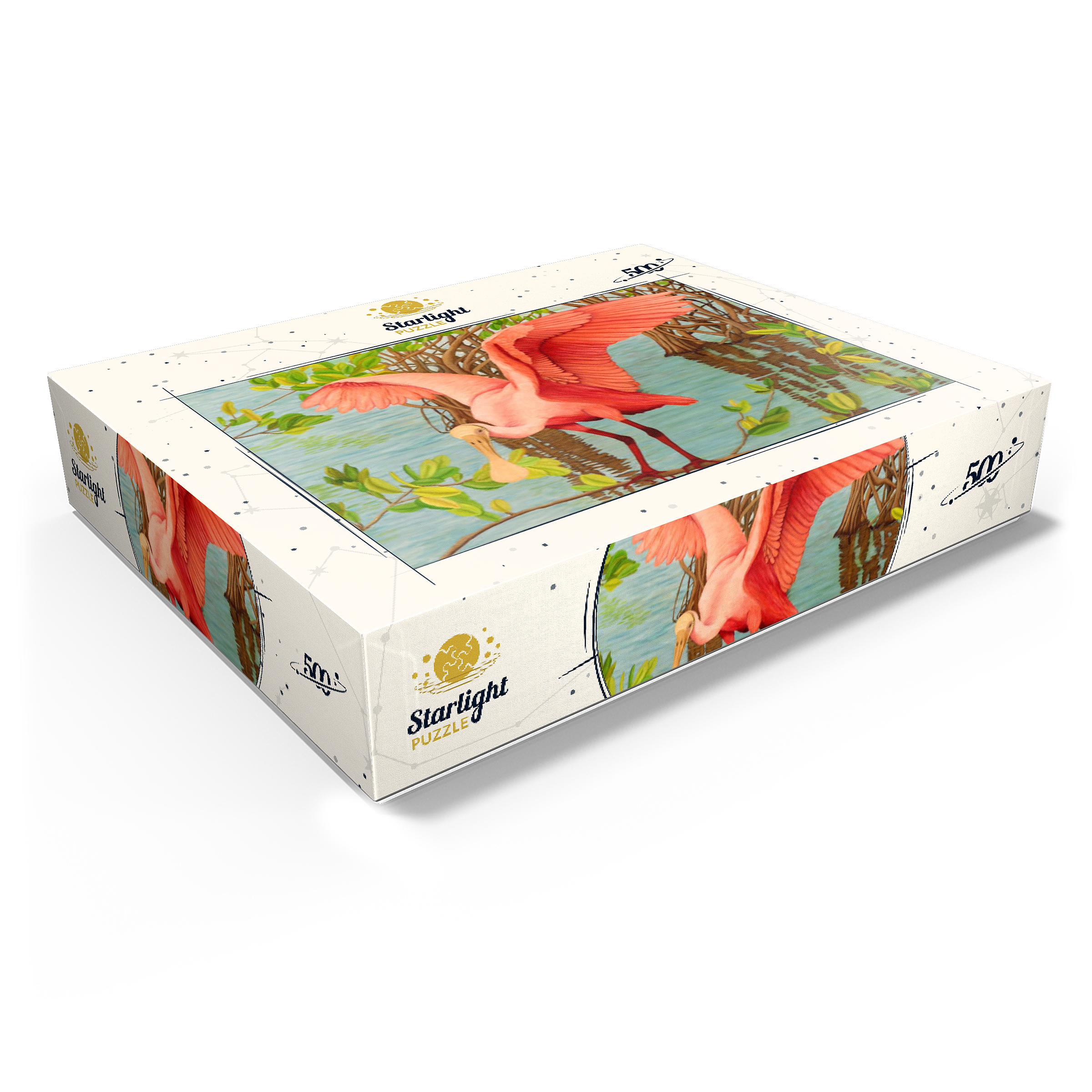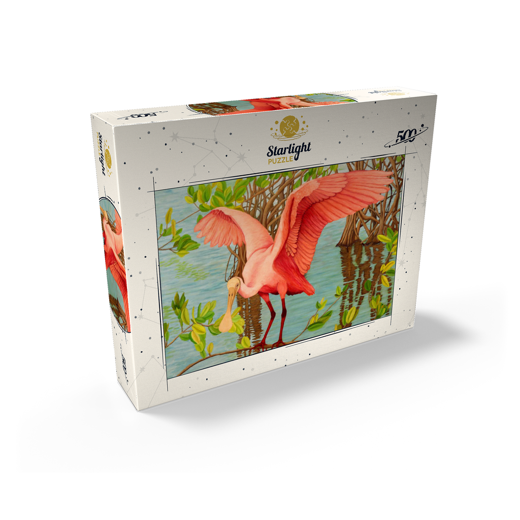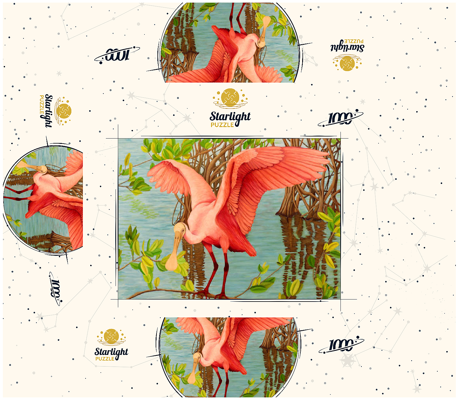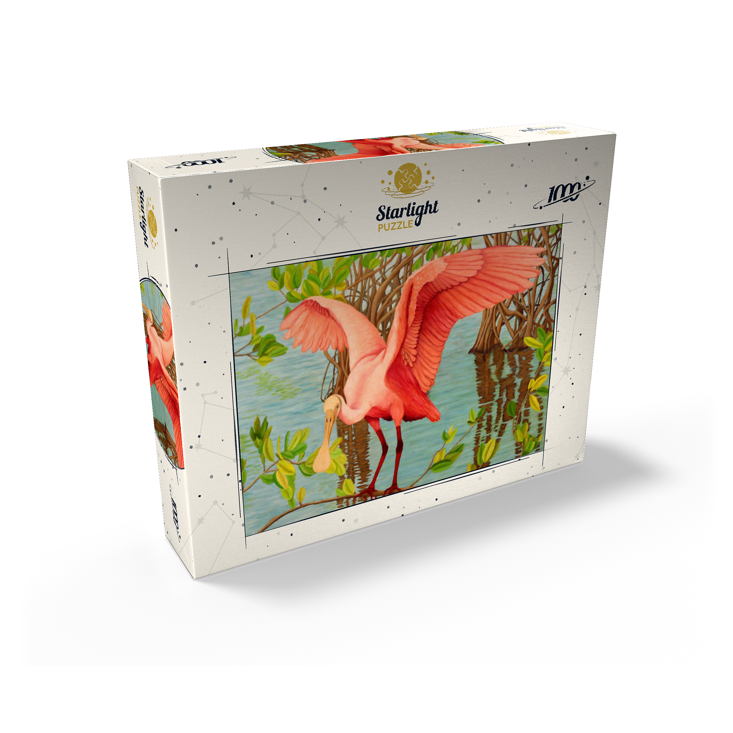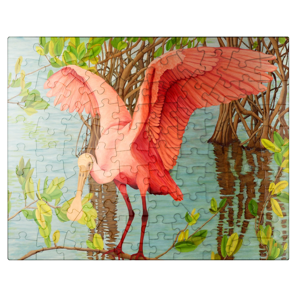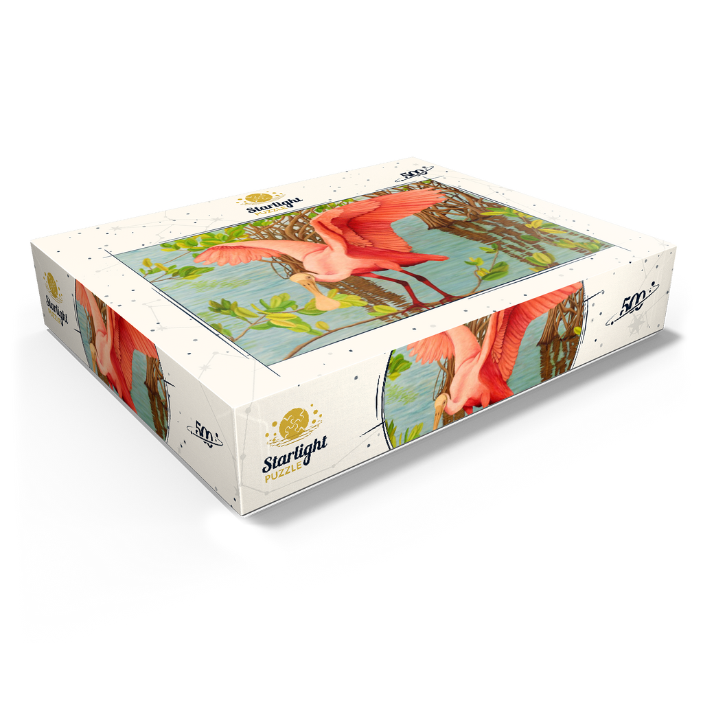 A stunning depiction of a roseate spoonbill gracefully perched among vibrant green mangrove branches in a serene wetland setting. The bird's bright pink plumage contrasts beautifully with the lush greenery and reflective water below. Its unique spoon-shaped bill and outstretched wings add elegance to the composition, highlighting the intricate relationship between this wading bird and its natural habitat. The artwork captures the tranquil beauty of mangrove ecosystems and the charm of this iconic species found in coastal wetlands.