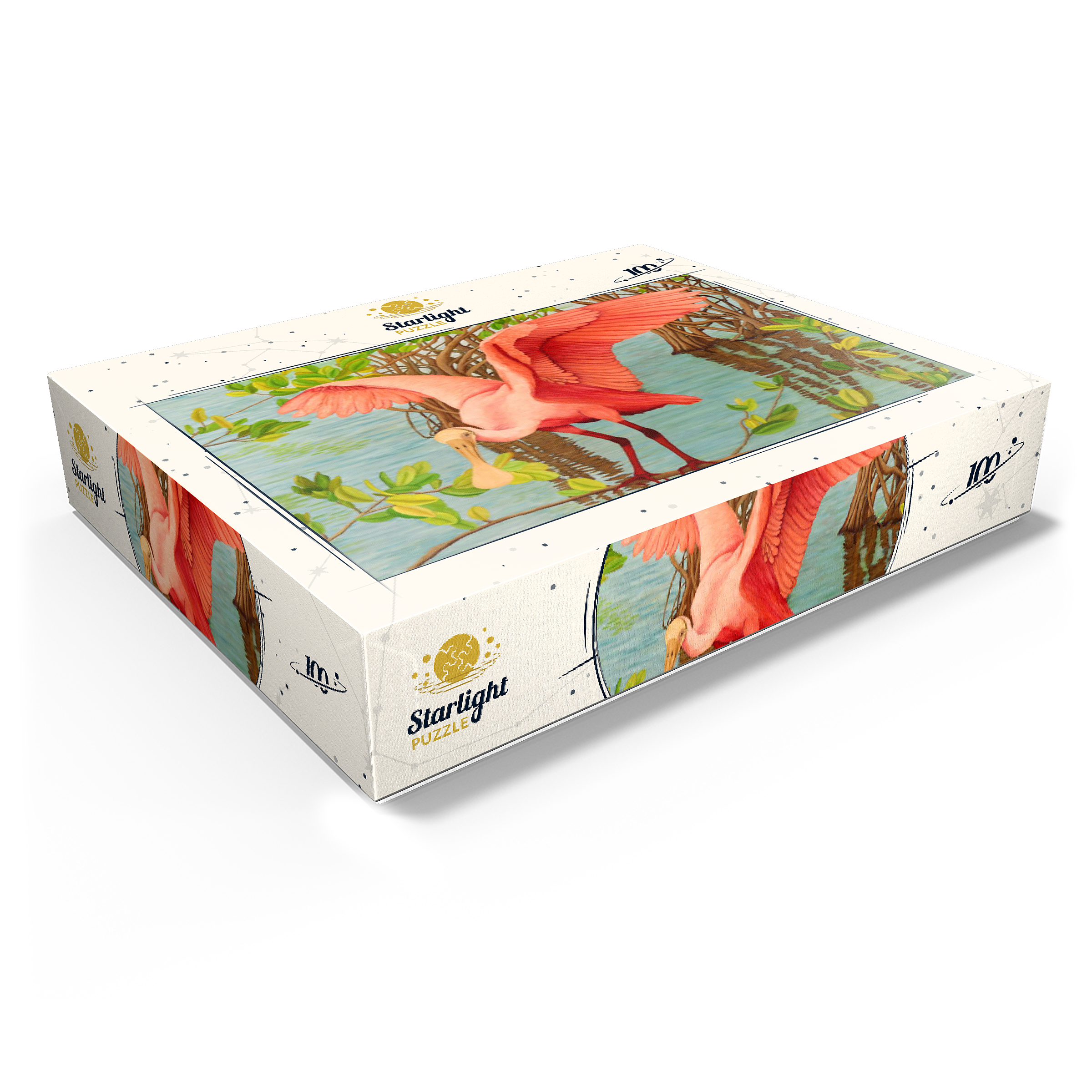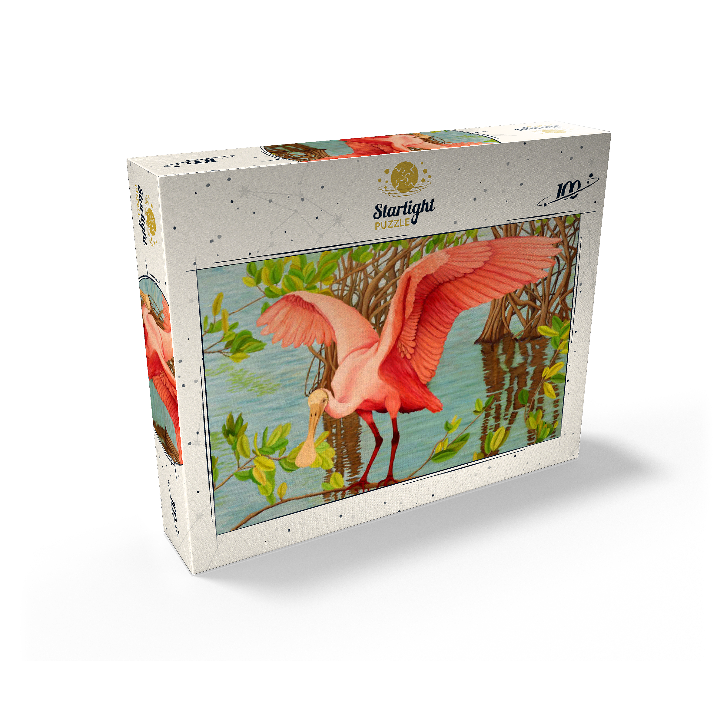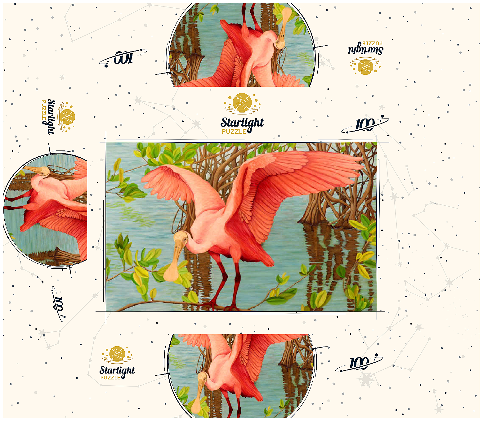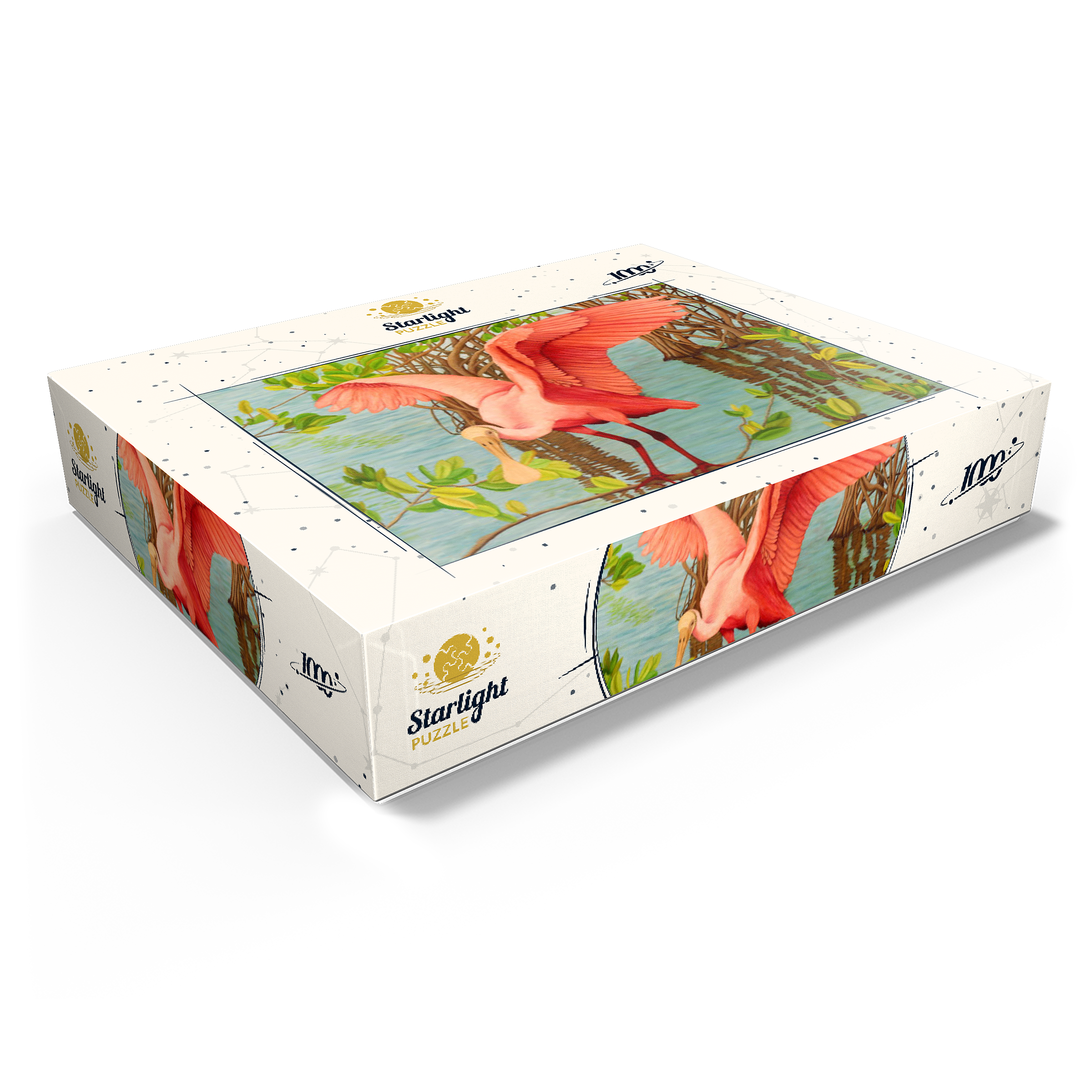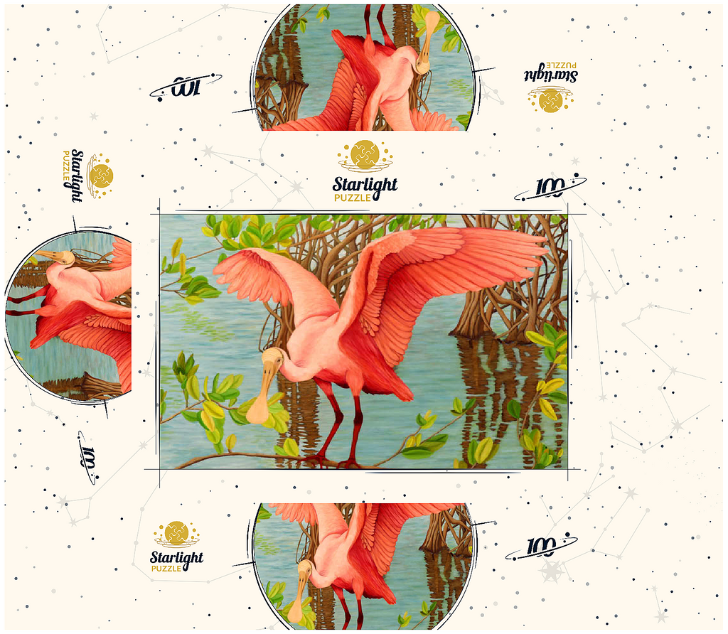 A stunning depiction of a roseate spoonbill gracefully perched among vibrant green mangrove branches in a serene wetland setting. The bird's bright pink plumage contrasts beautifully with the lush greenery and reflective water below. Its unique spoon-shaped bill and outstretched wings add elegance to the composition, highlighting the intricate relationship between this wading bird and its natural habitat. The artwork captures the tranquil beauty of mangrove ecosystems and the charm of this iconic species found in coastal wetlands.