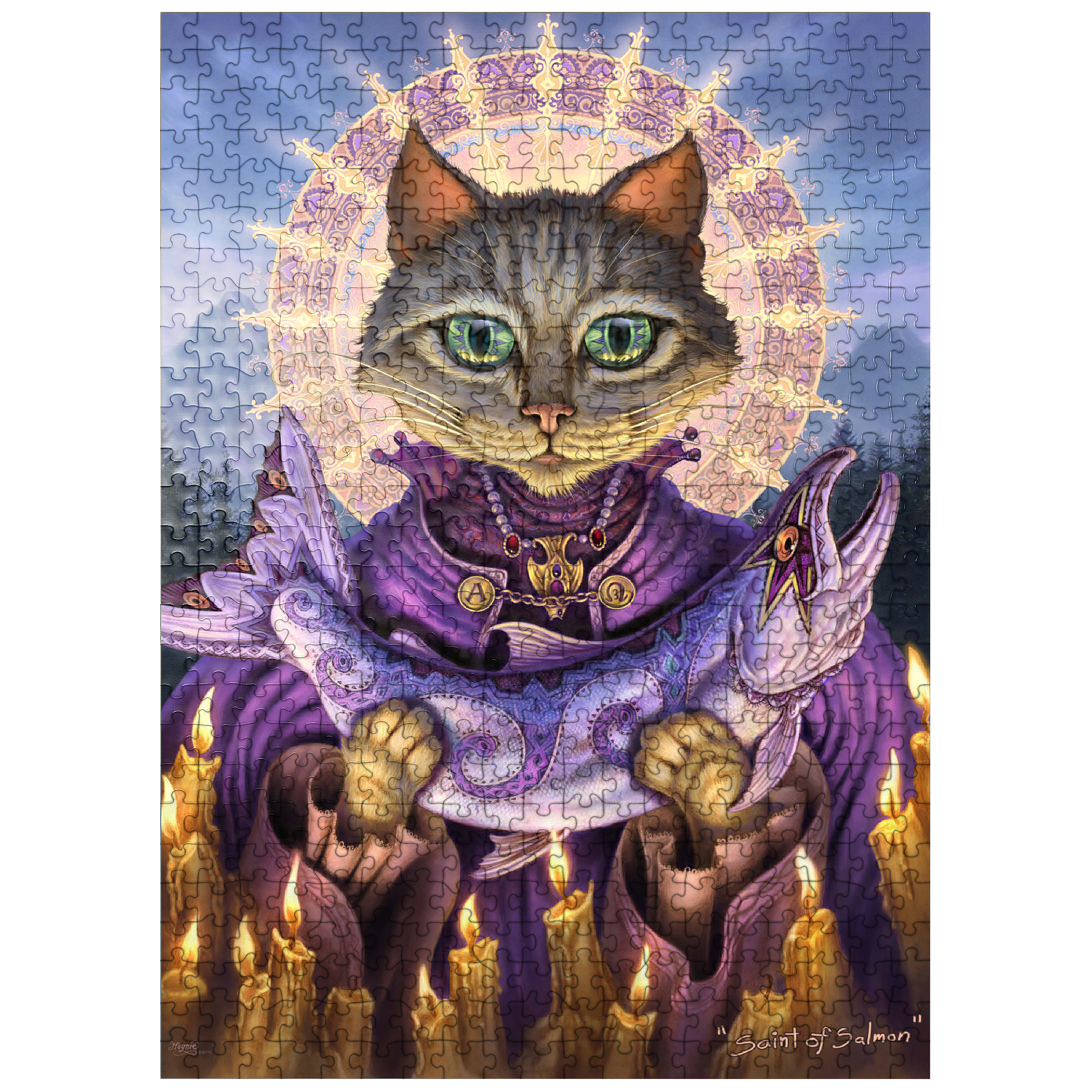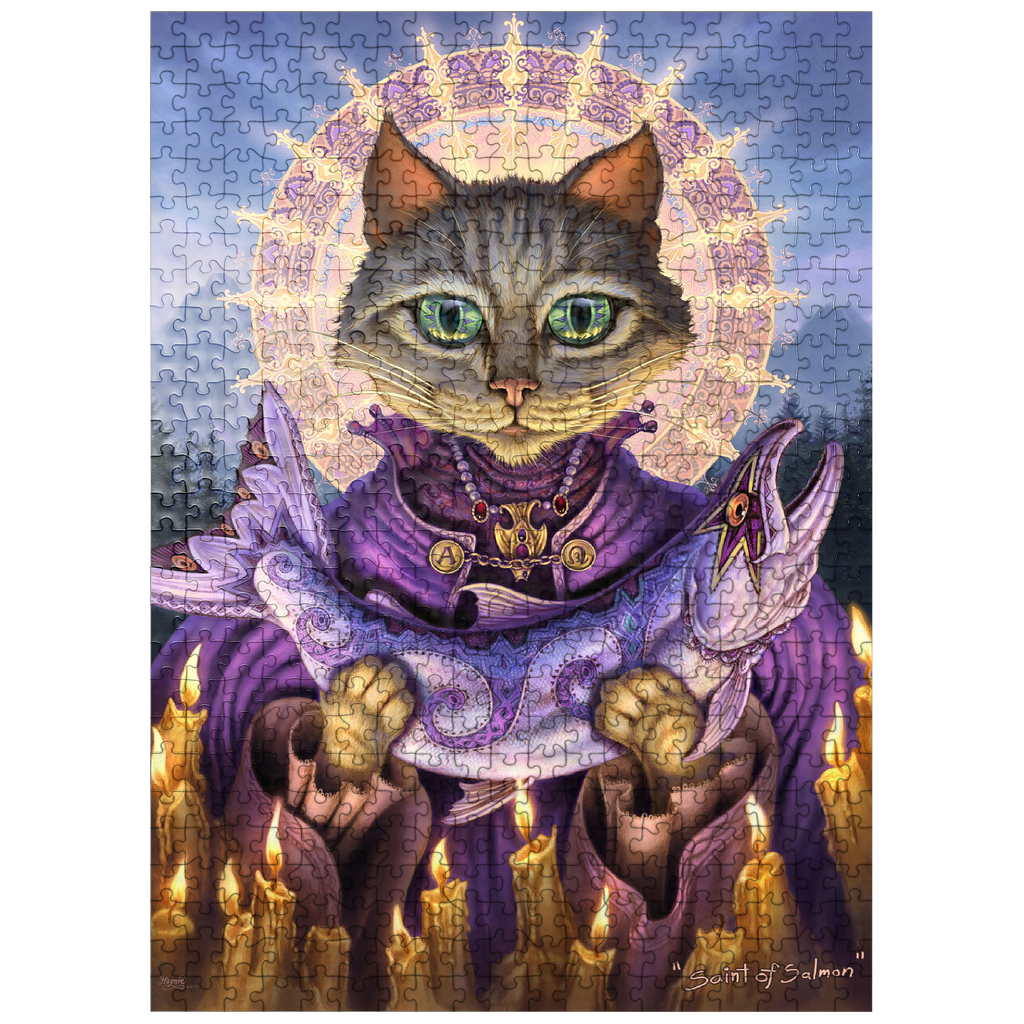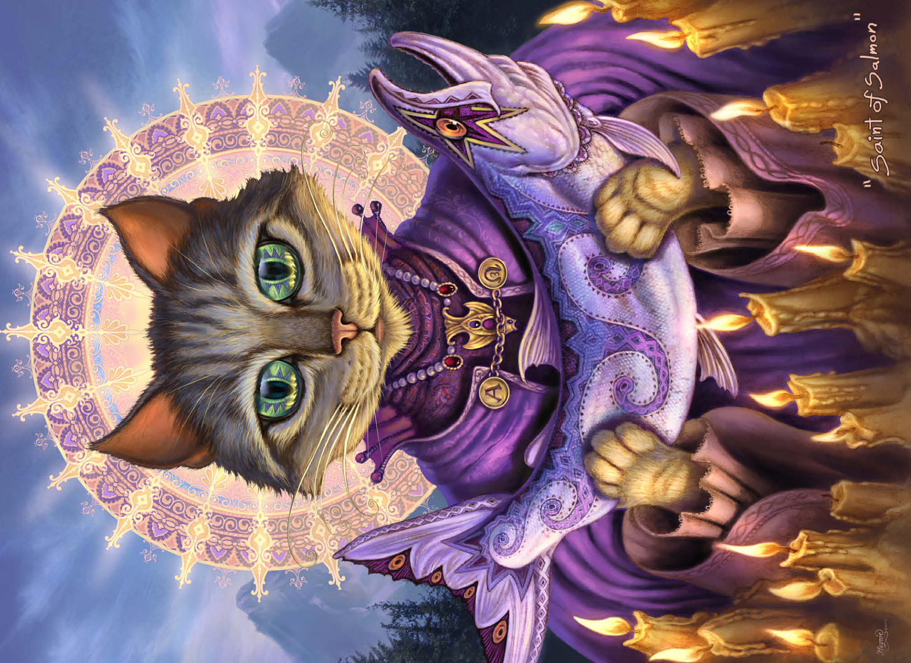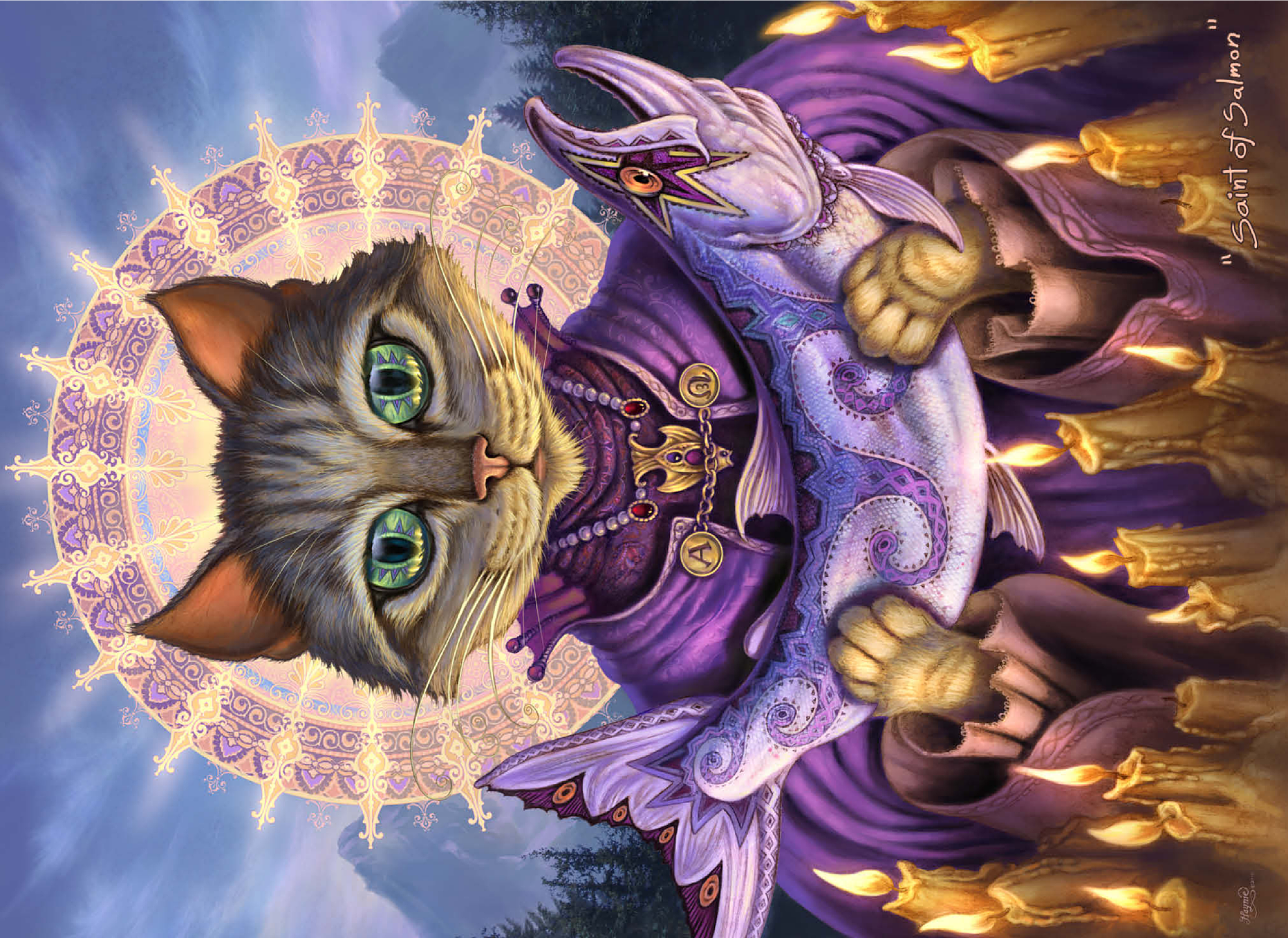 Jeff Haynie's painting, titled -Saint of Salmon,- portrays a regal cat as a divine figure, holding a fish in a reverent pose. The image features a tabby cat dressed in a purple robe, holding a stylized salmon with intricate patterns. A golden halo adorns the cat's head, set against a backdrop of mountains and a serene sky. The lower part is filled with lit candles, creating a warm, glowing atmosphere, juxtaposing reverence with a touch of whimsy. The overall mood is sacred yet accessible.