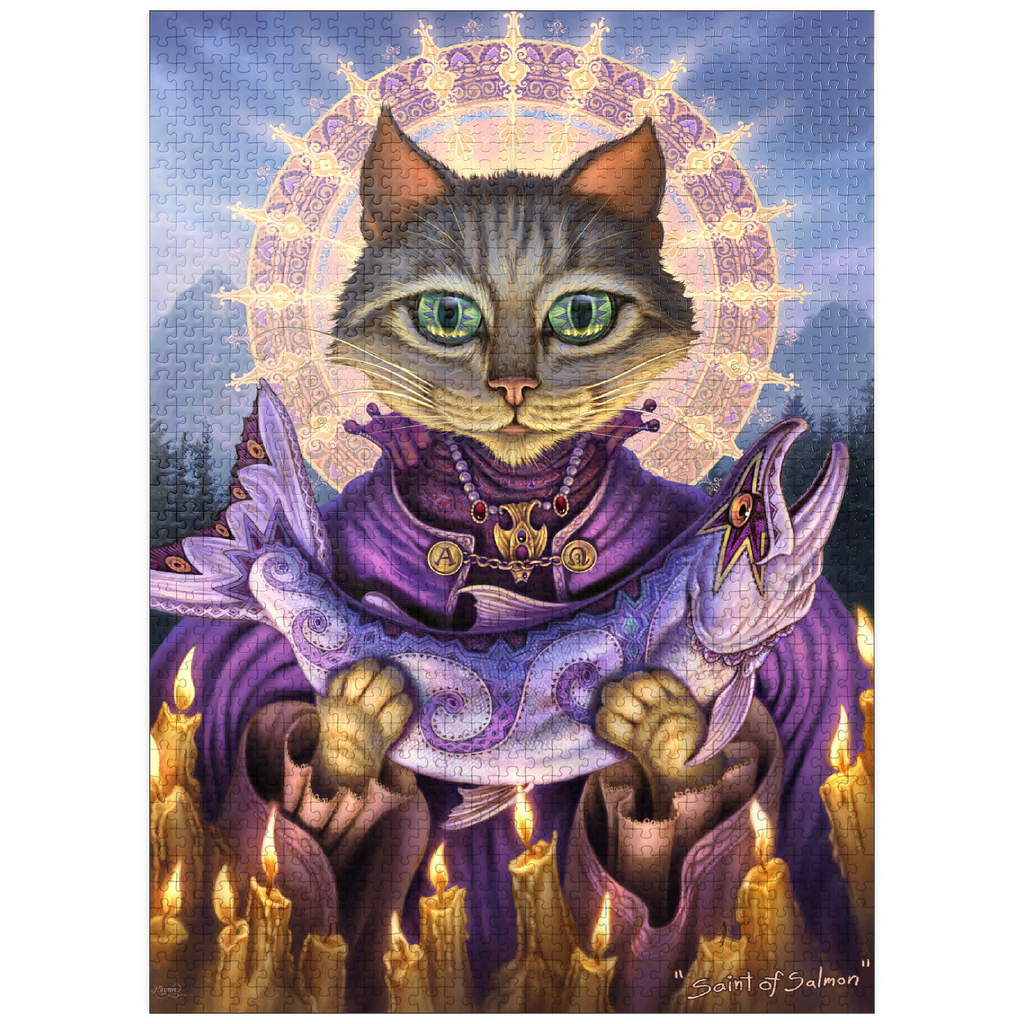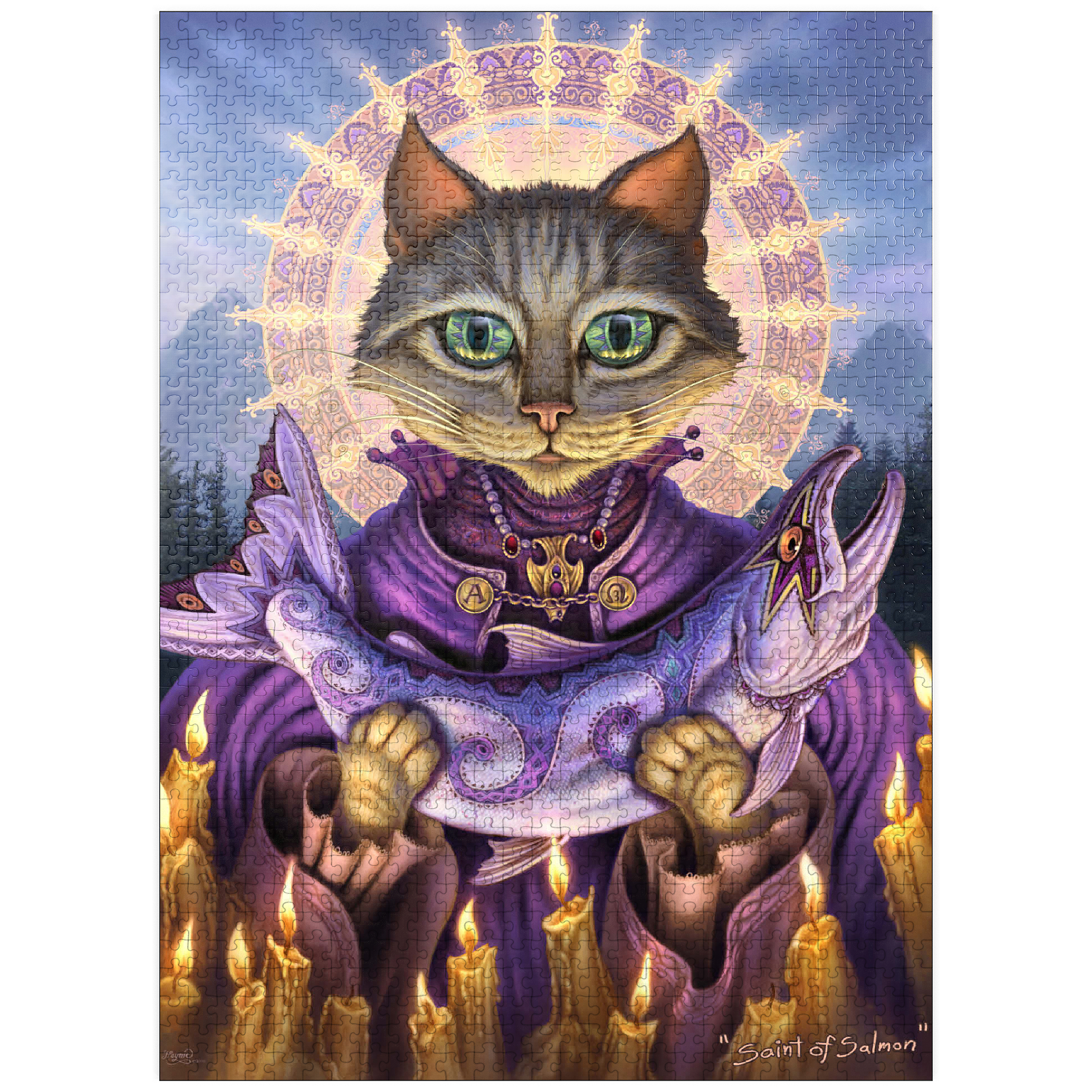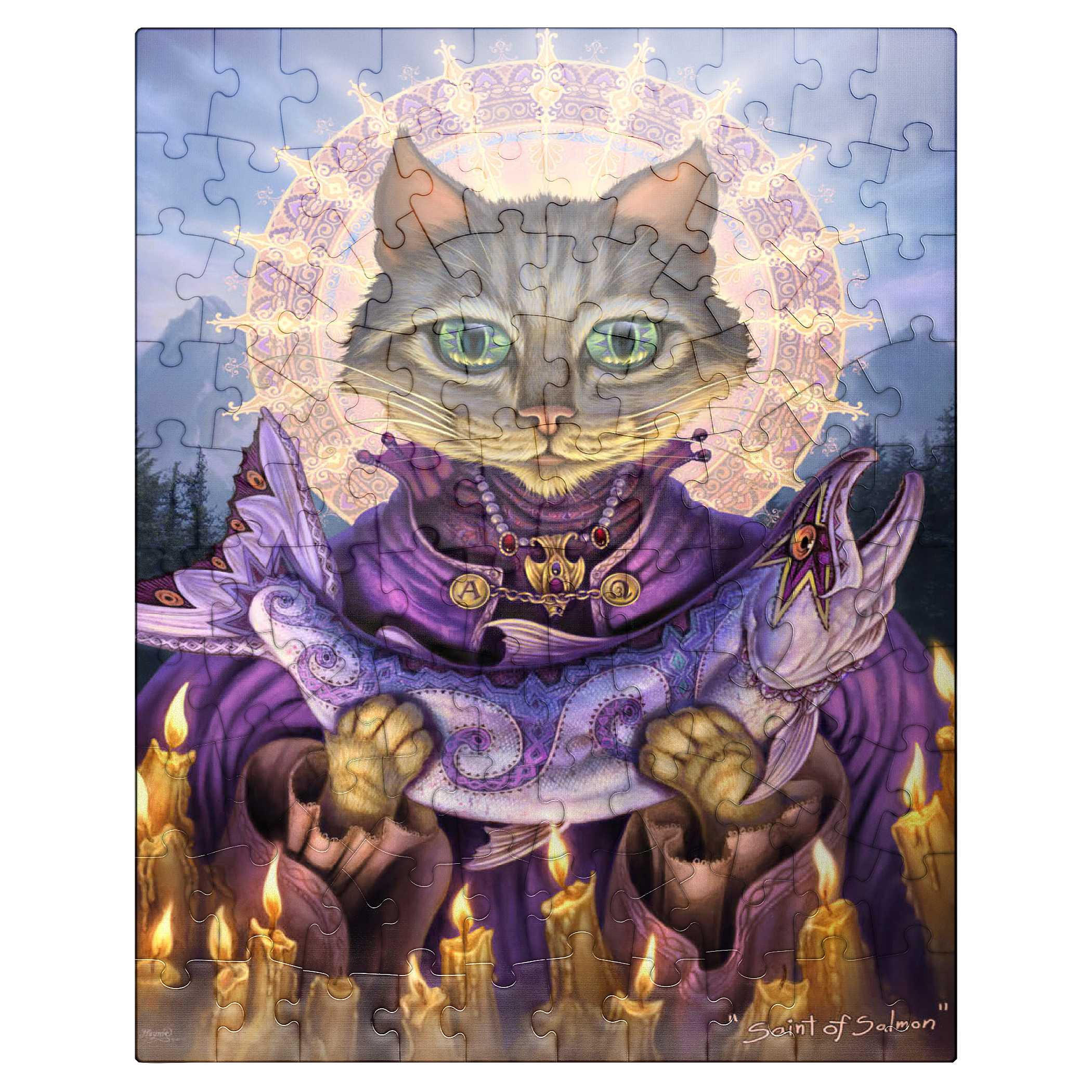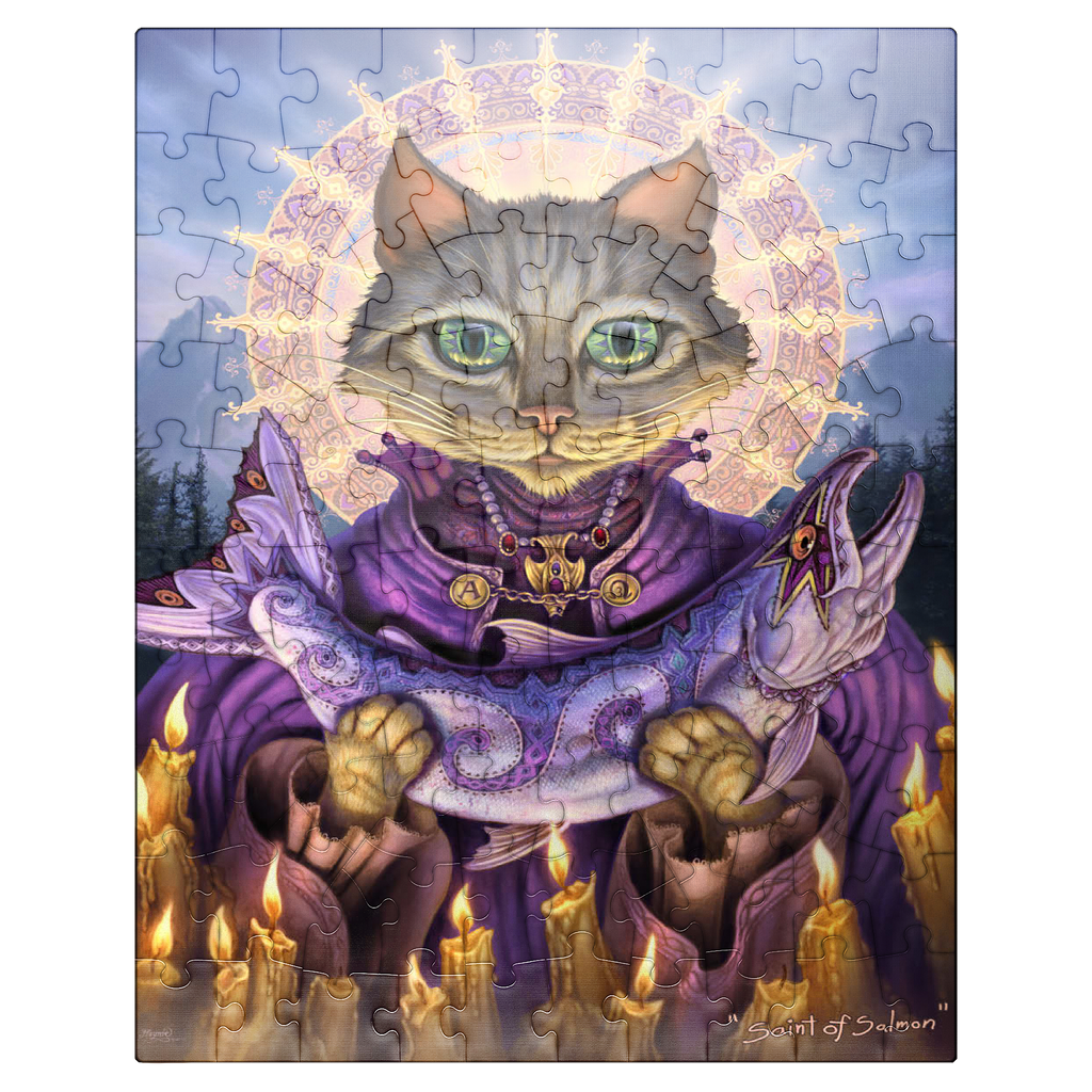 Jeff Haynie's painting, titled -Saint of Salmon,- portrays a regal cat as a divine figure, holding a fish in a reverent pose. The image features a tabby cat dressed in a purple robe, holding a stylized salmon with intricate patterns. A golden halo adorns the cat's head, set against a backdrop of mountains and a serene sky. The lower part is filled with lit candles, creating a warm, glowing atmosphere, juxtaposing reverence with a touch of whimsy. The overall mood is sacred yet accessible.