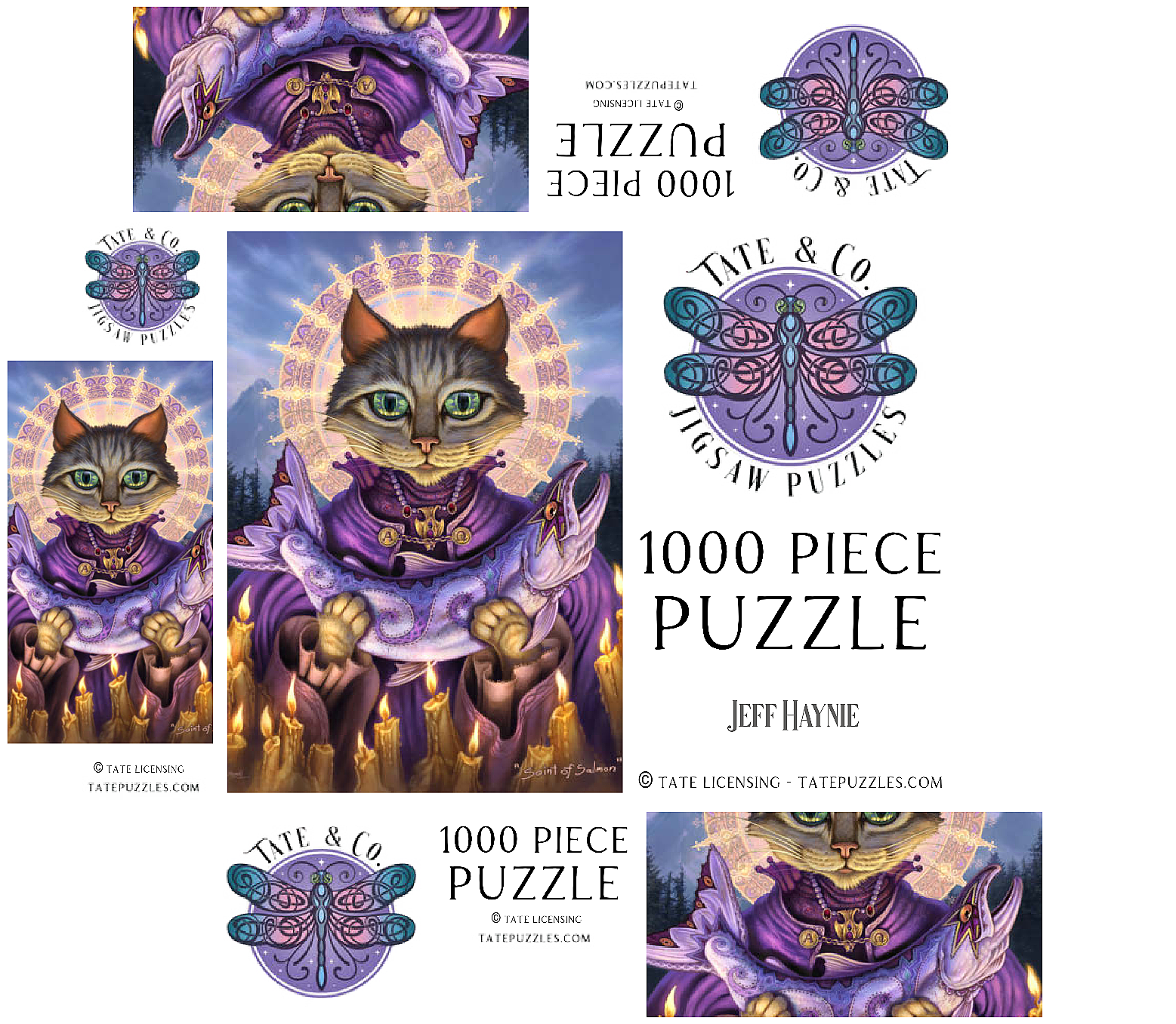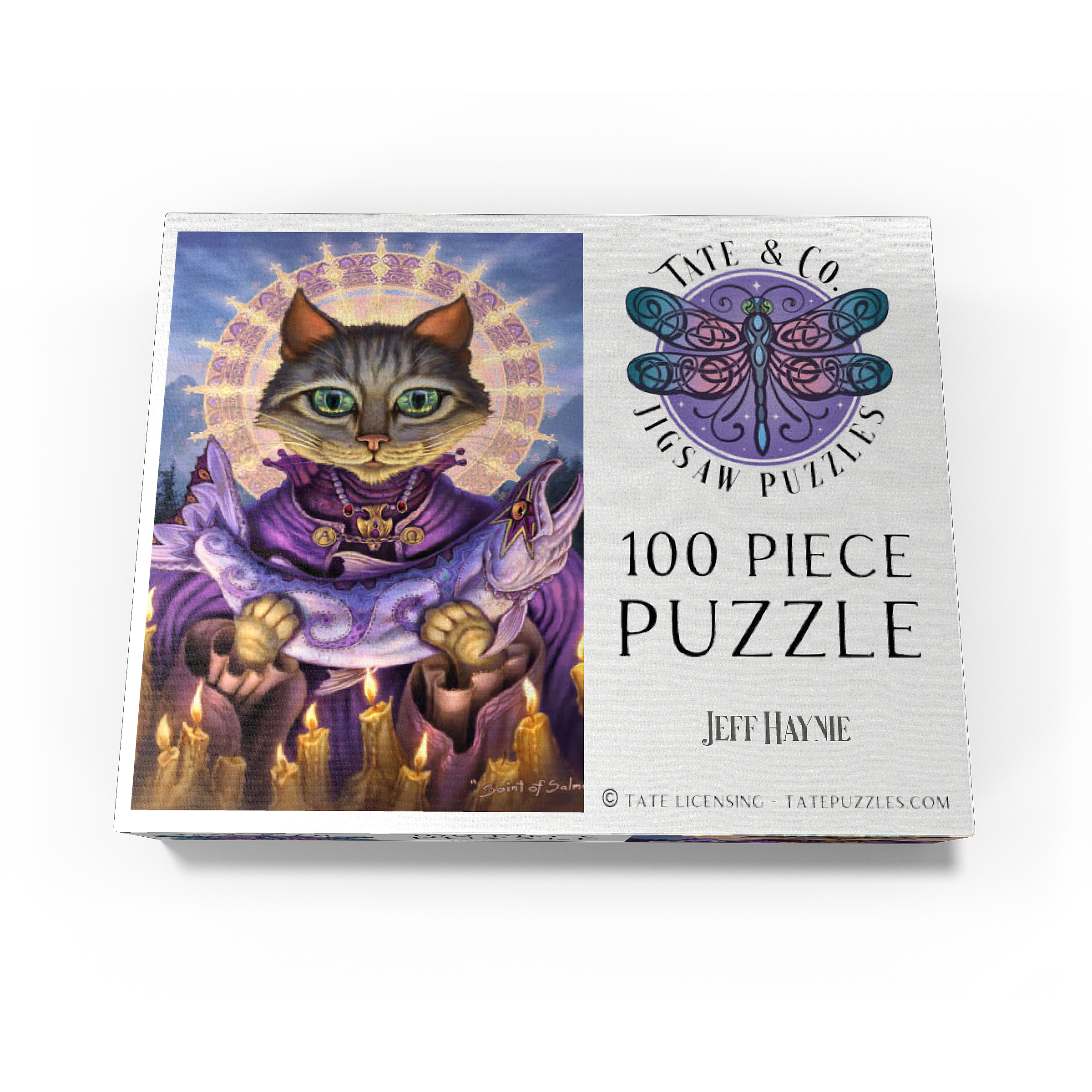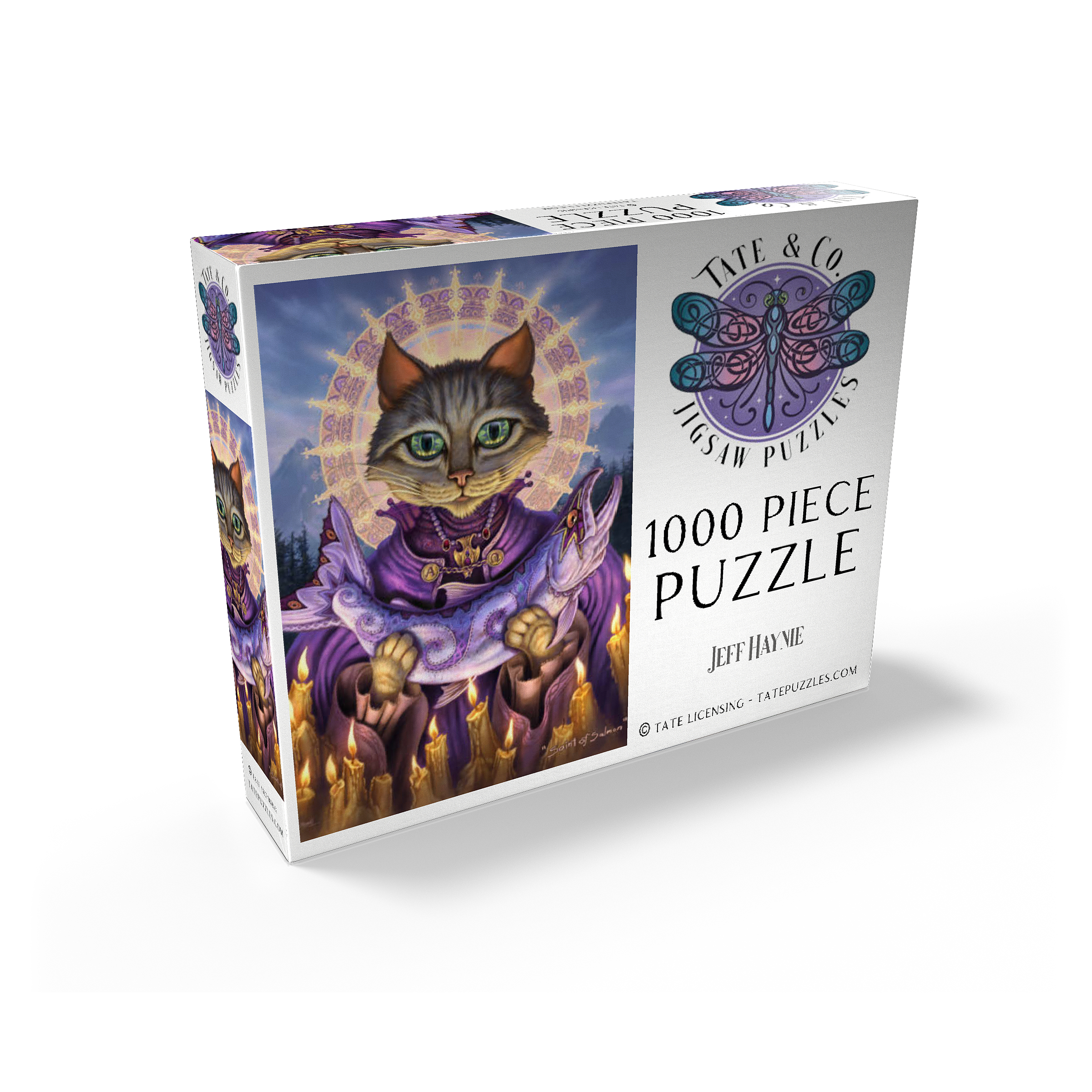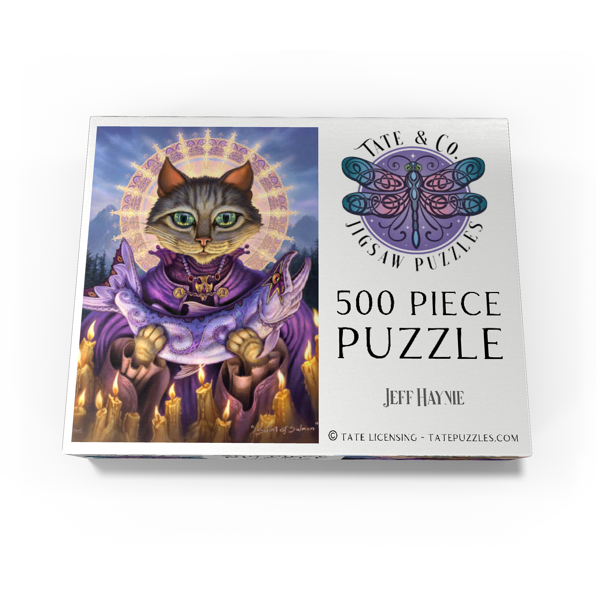 Jeff Haynie's painting, titled -Saint of Salmon,- portrays a regal cat as a divine figure, holding a fish in a reverent pose. The image features a tabby cat dressed in a purple robe, holding a stylized salmon with intricate patterns. A golden halo adorns the cat's head, set against a backdrop of mountains and a serene sky. The lower part is filled with lit candles, creating a warm, glowing atmosphere, juxtaposing reverence with a touch of whimsy. The overall mood is sacred yet accessible.