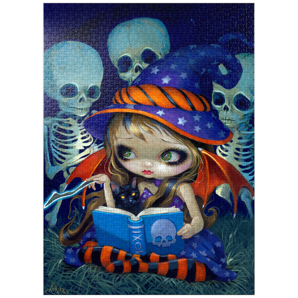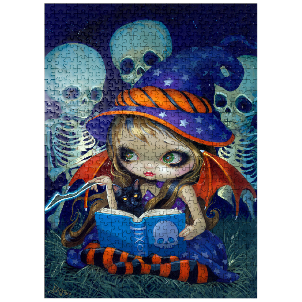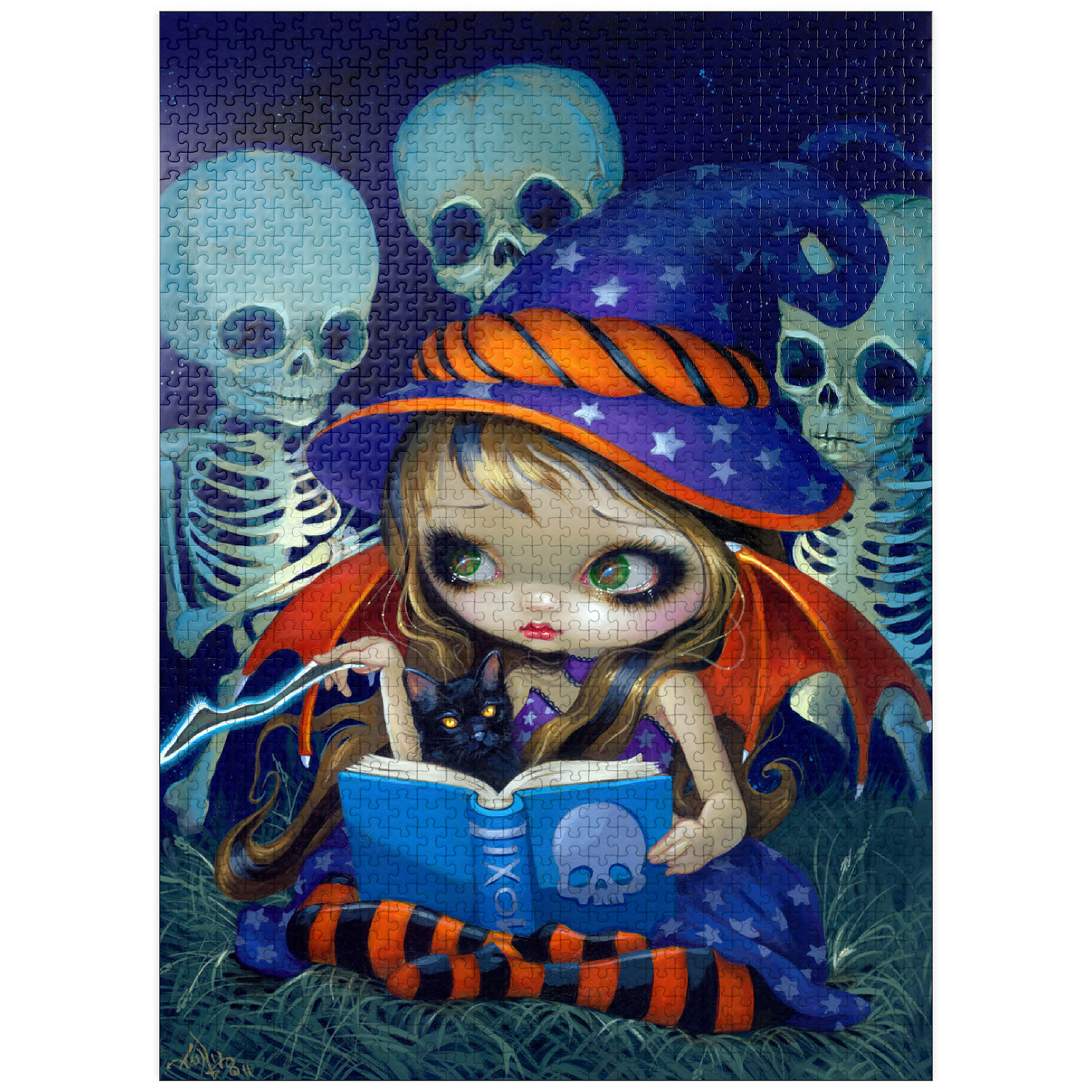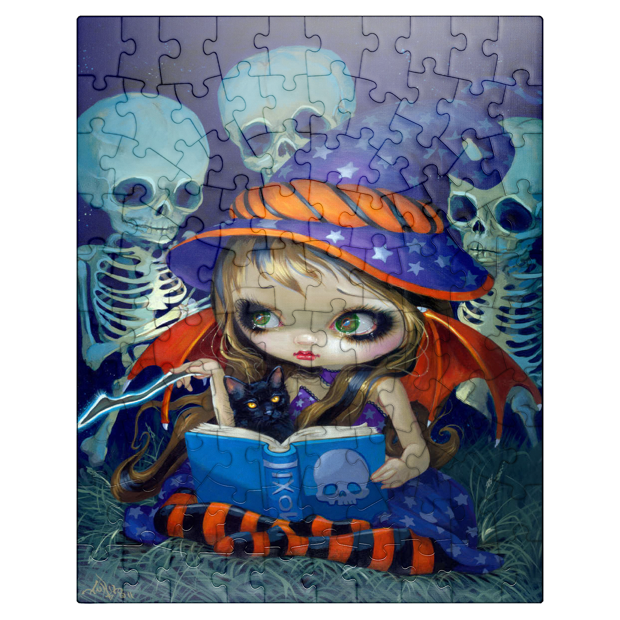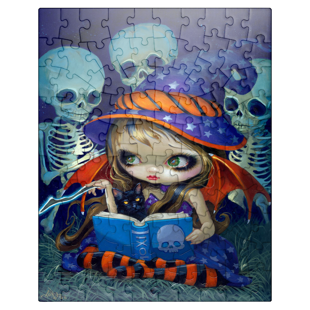 Conjure up some puzzling fun with -Skeleton Magic-! Assemble this enchanting scene of a little witch and her black cat familiar as she casts a skeleton summoning spell from her book. Piece together the magic and mystery in this whimsical and slightly spooky puzzle!