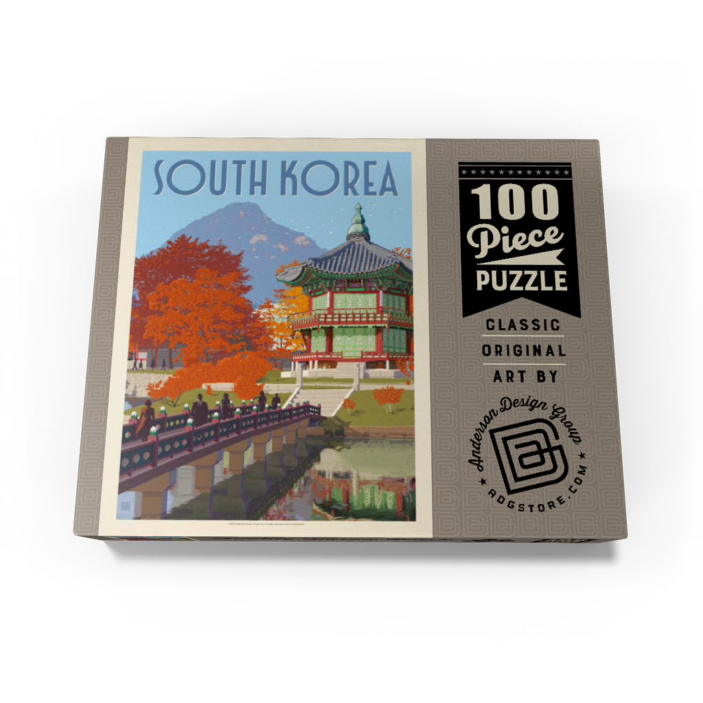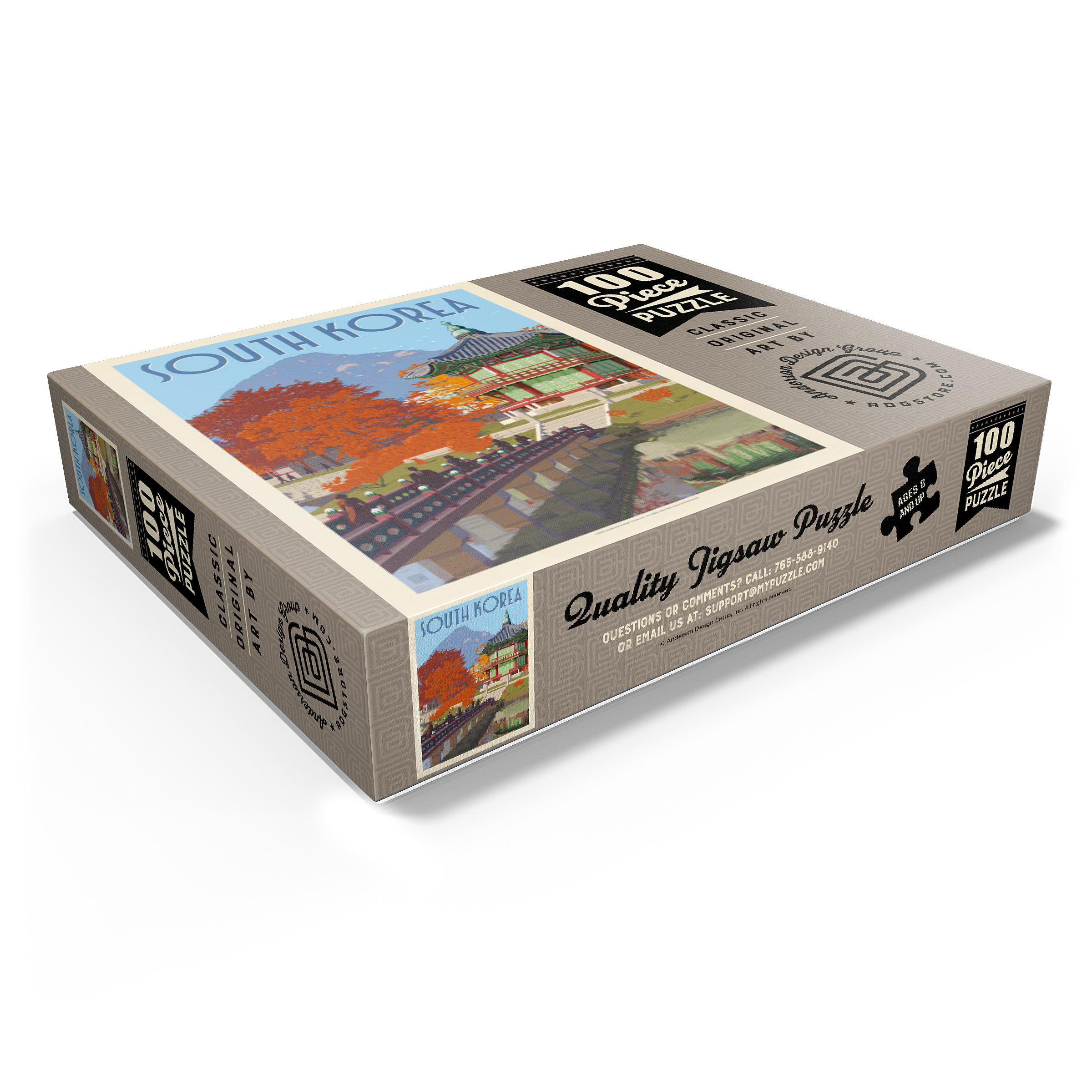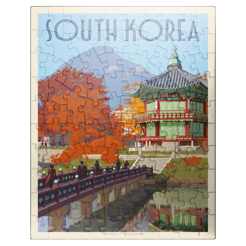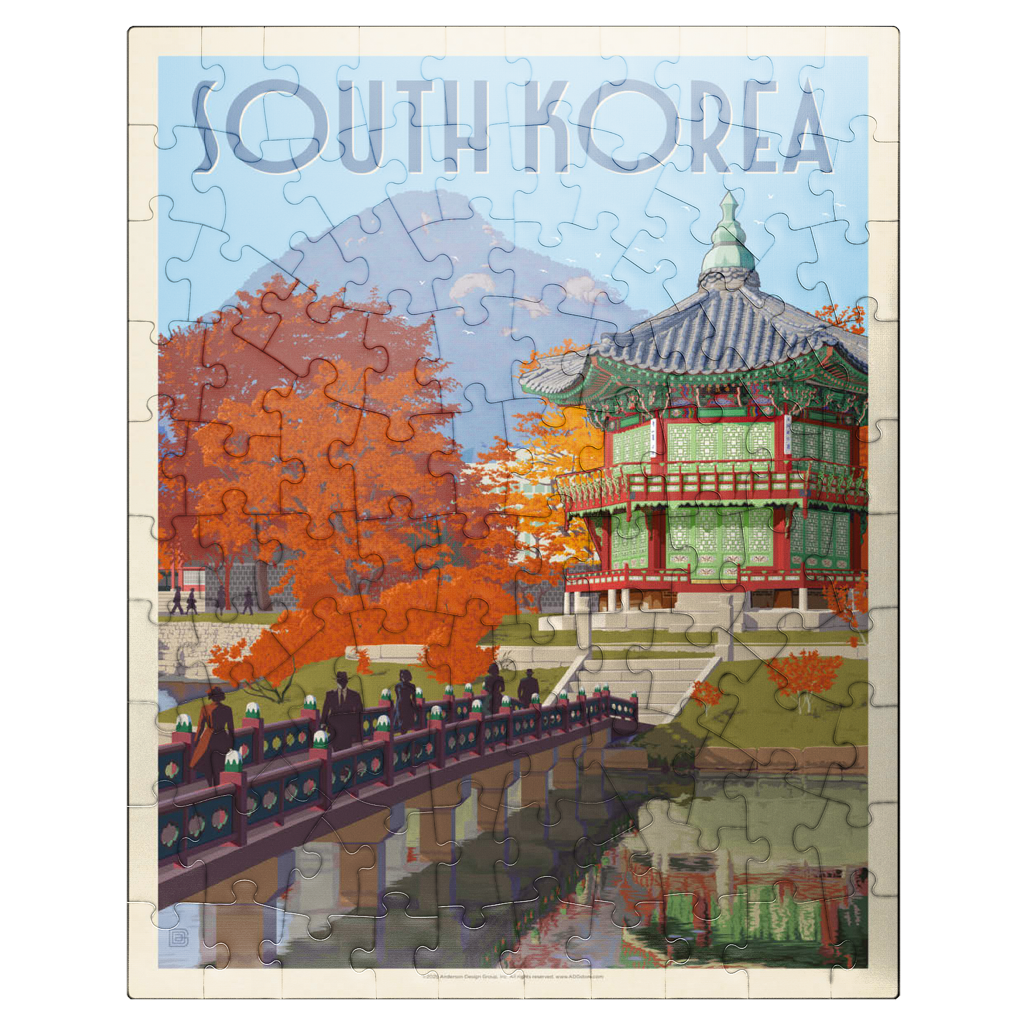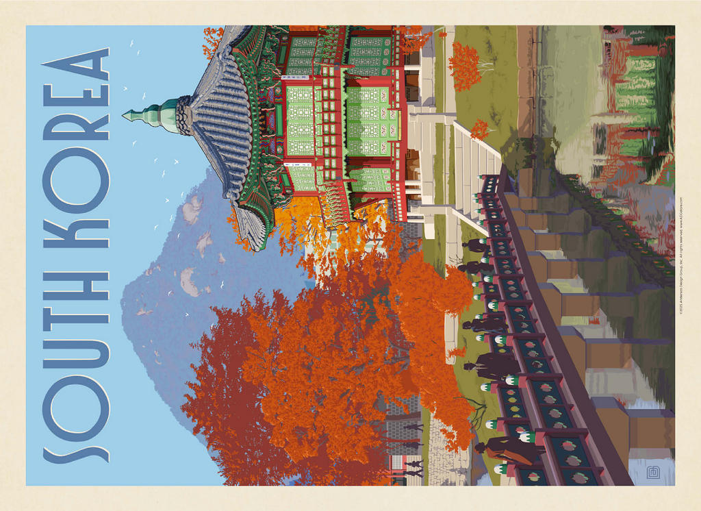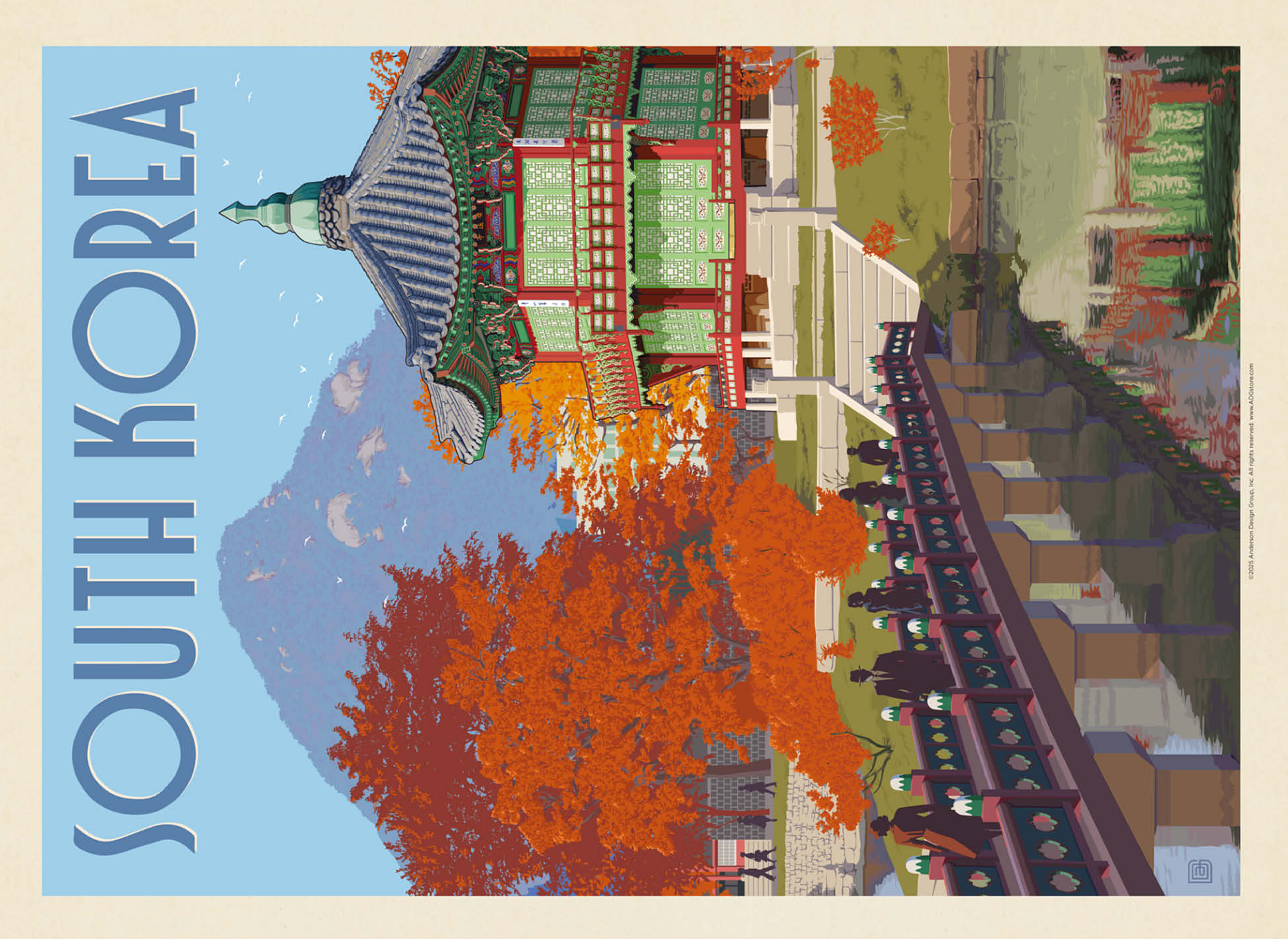 This beautifully styled travel artwork showcases the iconic Gyeongbokgung Palace in Seoul, South Korea, during the peak of autumn. The vibrant red and orange foliage frames the historic Hyangwonjeong Pavilion, a graceful two-story hexagonal structure built in the 19th century and one of the palace’s most picturesque highlights. Set against the backdrop of Bugaksan Mountain, the pavilion sits elegantly on an island in a tranquil pond, connected by a charming wooden bridge adorned with traditional Korean patterns. The reflection of the pavilion and trees in the still water enhances the serene beauty of the scene, capturing both cultural heritage and natural harmony. Gyeongbokgung Palace, originally constructed in 1395, is the largest of Seoul’s Five Grand Palaces and a treasured symbol of Korea’s Joseon Dynasty. The depiction emphasizes the blending of architectural sophistication with seasonal landscapes, making it a timeless representation of Korean history, art, and tradition.